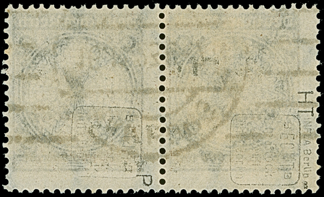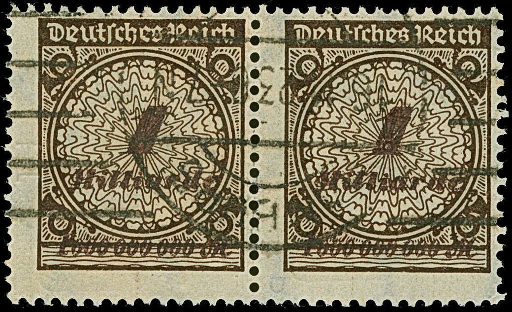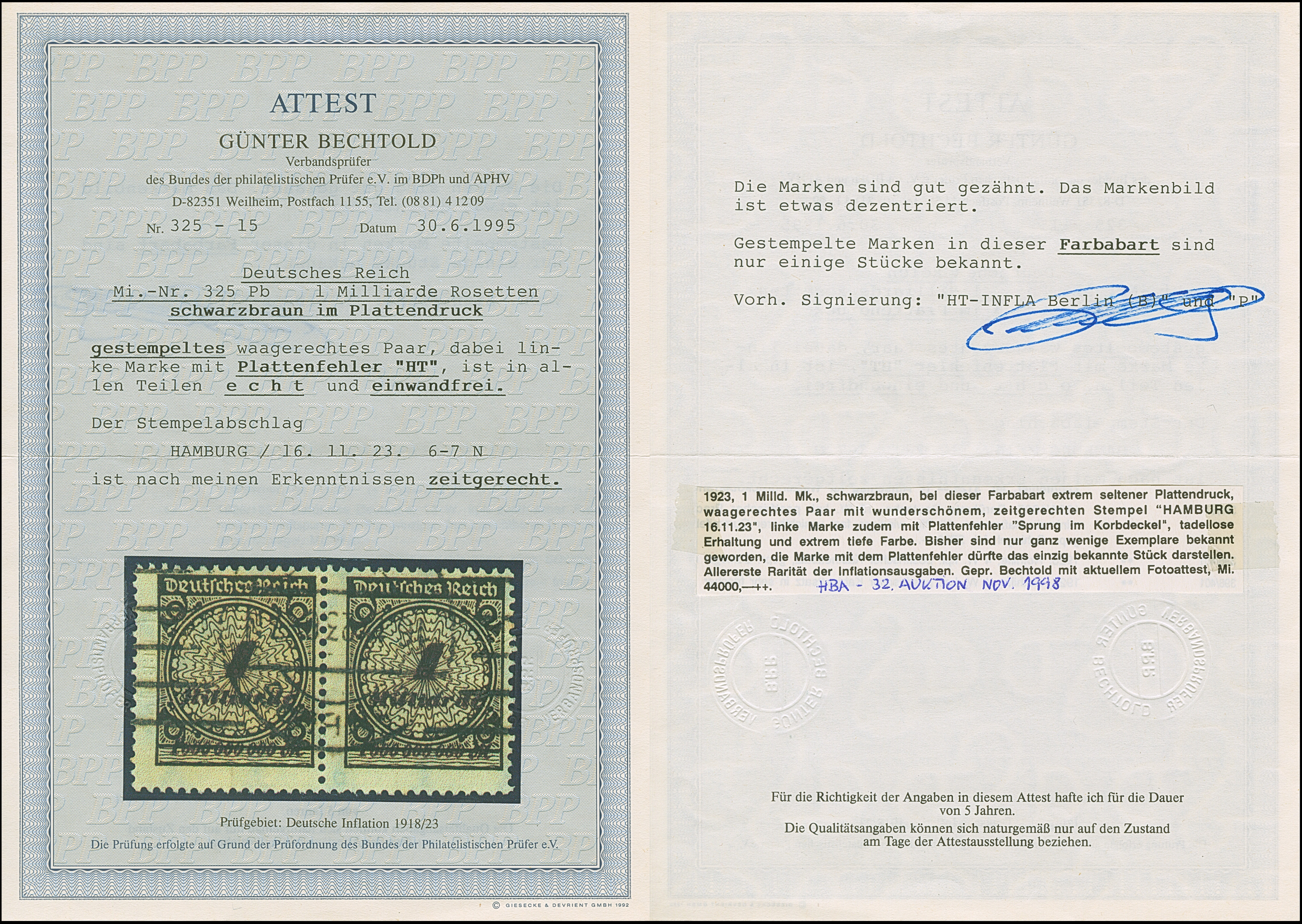 Korbdeckel 1 Mrd. M. schwarzbraun im Plattendruck im waagerechten Paar, linke Marke mit Plattenfehler “Sprung im Korbdeckel” (HT), mit gut lesbaren Maschinenstempel “HAMBURG 16.11.23”, in einwandfreier Erhaltung. Gestempelte Marken dieser Farbvariante sind sehr selten, als waagerechtes Paar in Verbindung mit dem Plattenfehler vermutlich einmalig und eine ganz große Seltenheit der Inflationszeit. ProFi hat kein weiteres Paar in dieser Kombination registriert, sign. Infla Berlin und Fotoattest Bechtold BPP (1995)