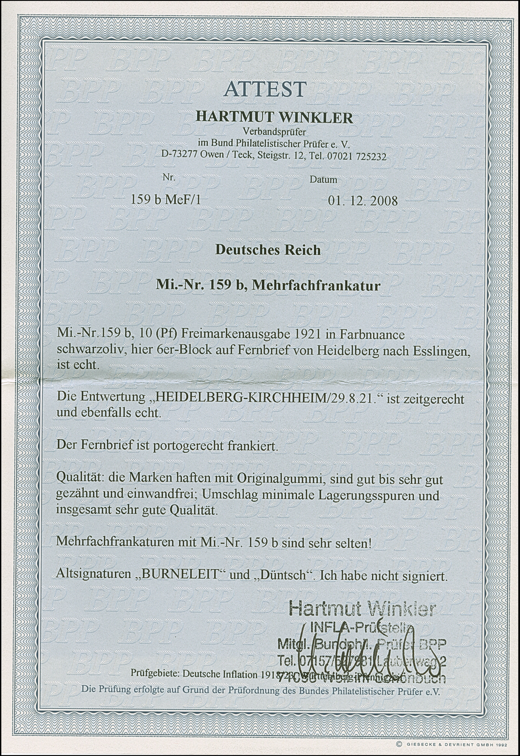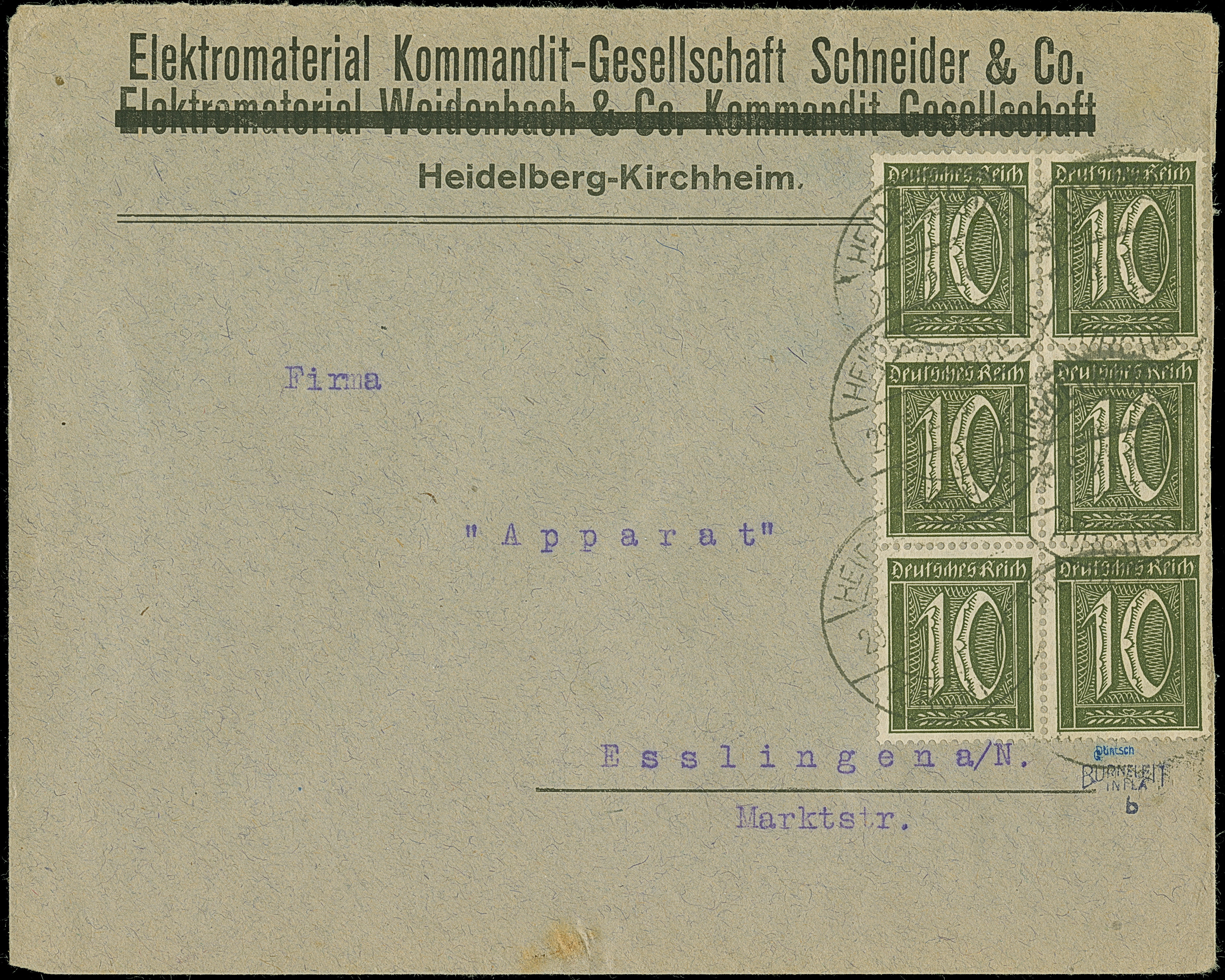 1921, Ziffern 10 Pfg. schwarzoliv, 6er-Block, farbfrisch und gut gezähnt, sauber mit Stempel “HEIDELBERG-KIRCHHEIM 29.8.21” auf portogerechtem Fernbrief nach Esslingen, leichte Beförderungsspuren, tadellos, sign. Burneleit und Düntsch sowie Fotoattest Winkler BPP (2008)