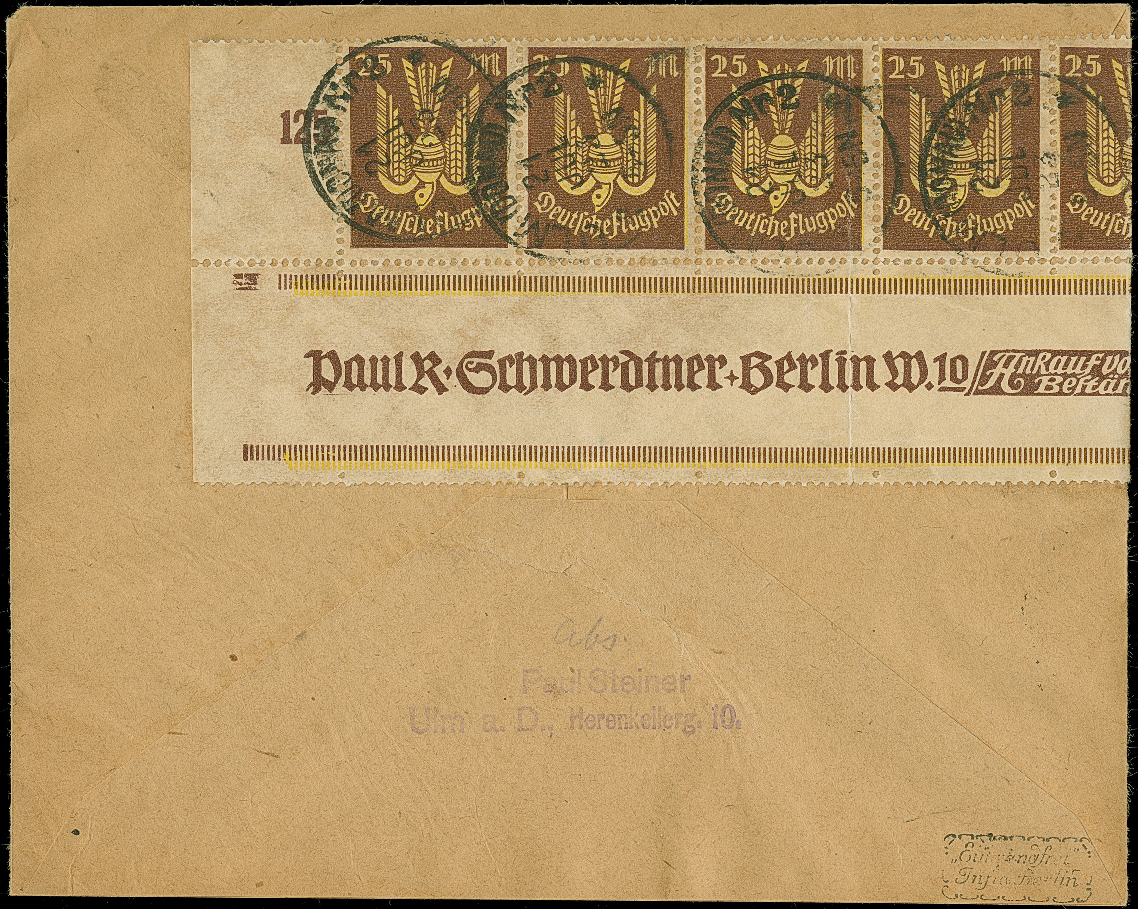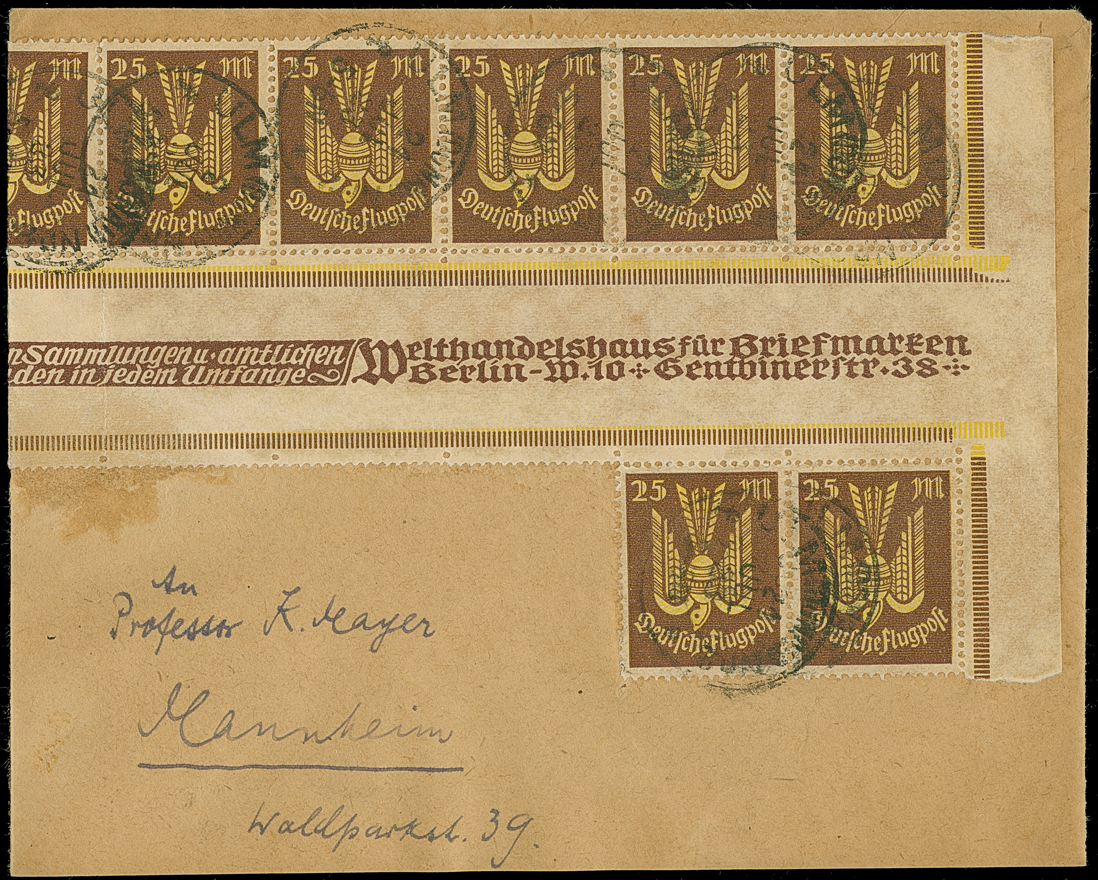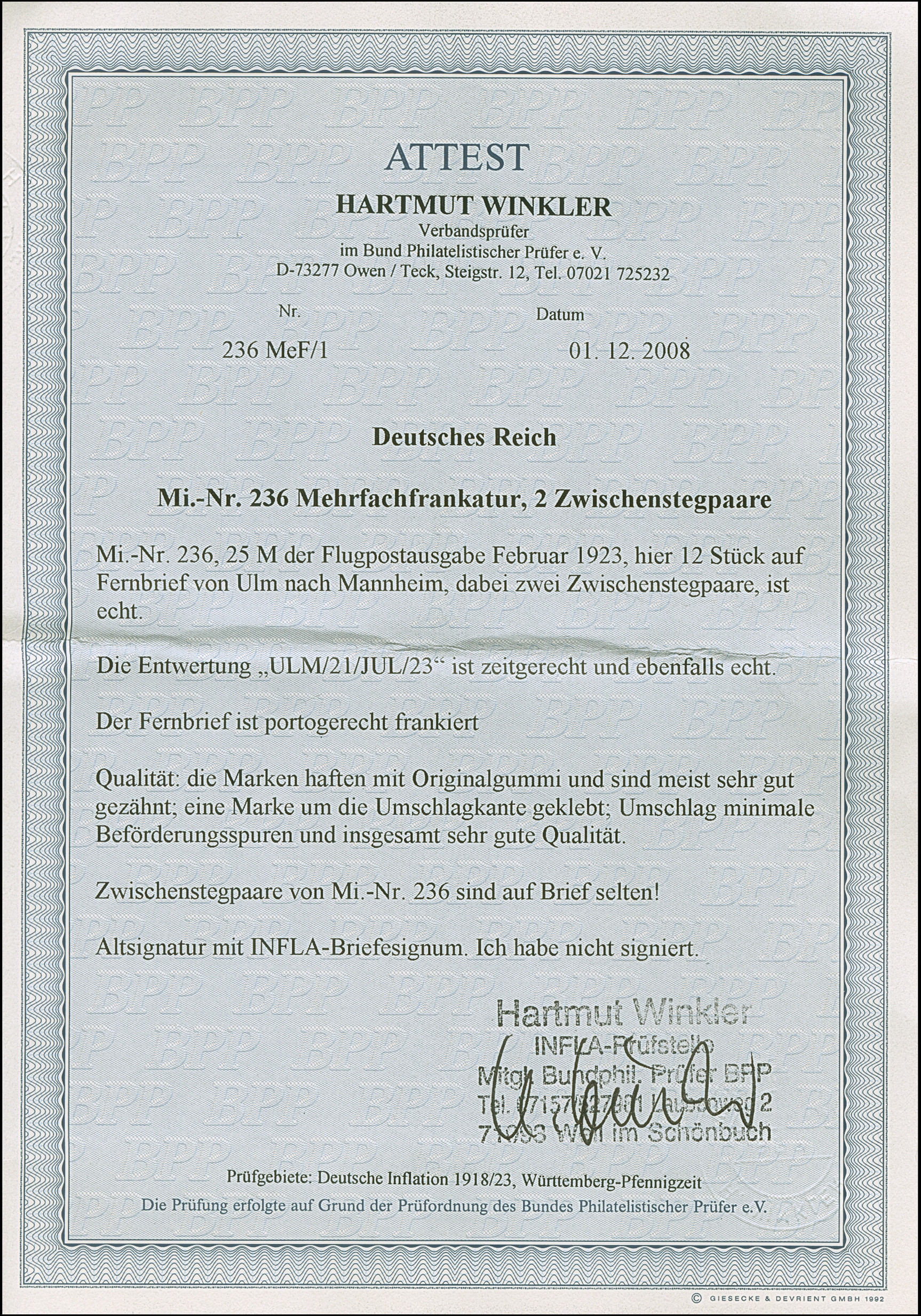 1923, Holztaube 25 M., unregelmäßiger 12er-Block mit zwei kompletten Zwischenstegpaaren, farbfrisch und meist gut gezähnt, sauber mit Stempel “ULM 21.7.23”, mittig um den Brief geklebt, vorder- und rückseitig auf porogerechtem Brief nach Mannheim, übliche Beförderungsspuren, tadellos, eine sehr dekorative Frankatur, sign. Infla sowie Fotoattest Winkler BPP (2008)