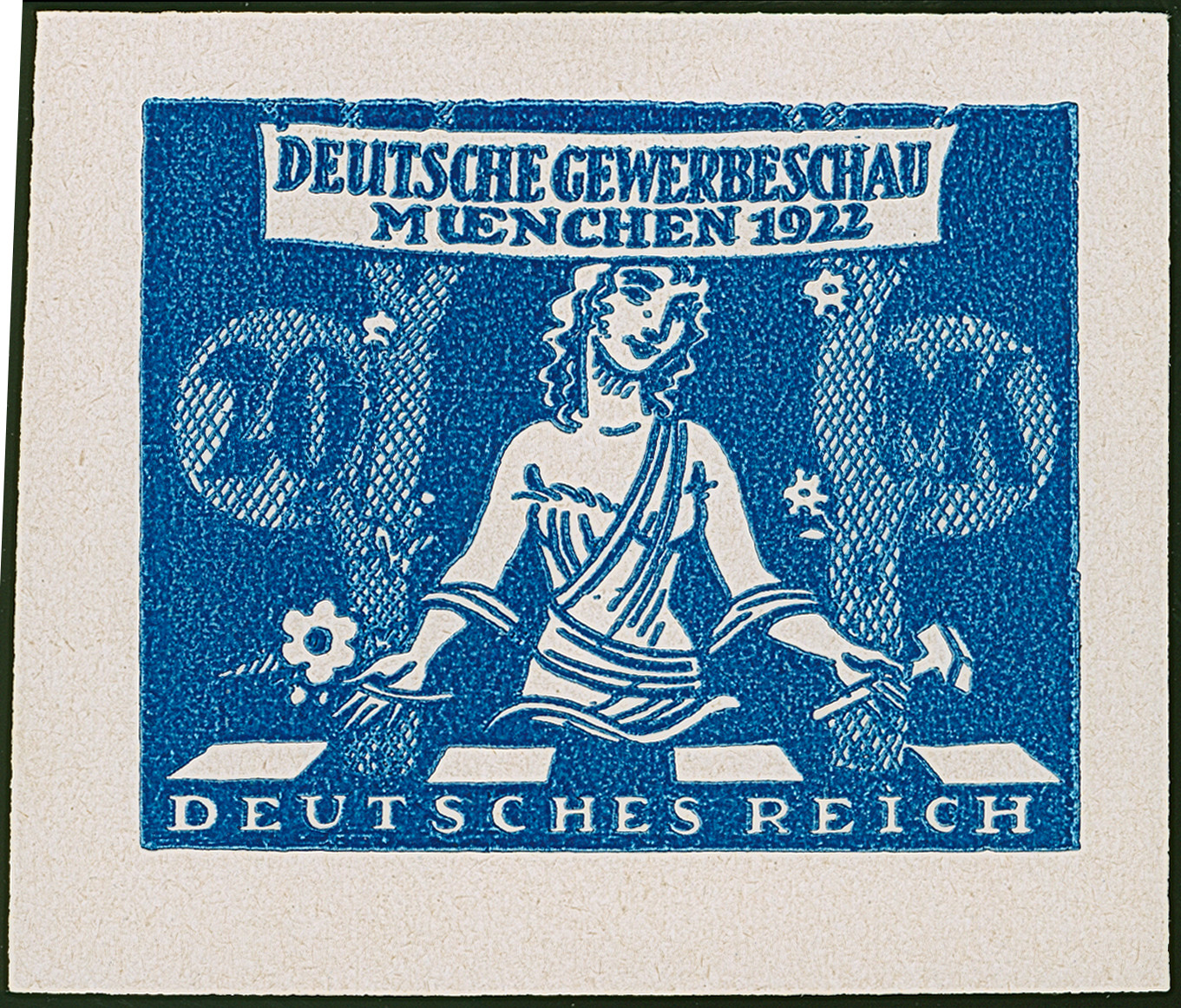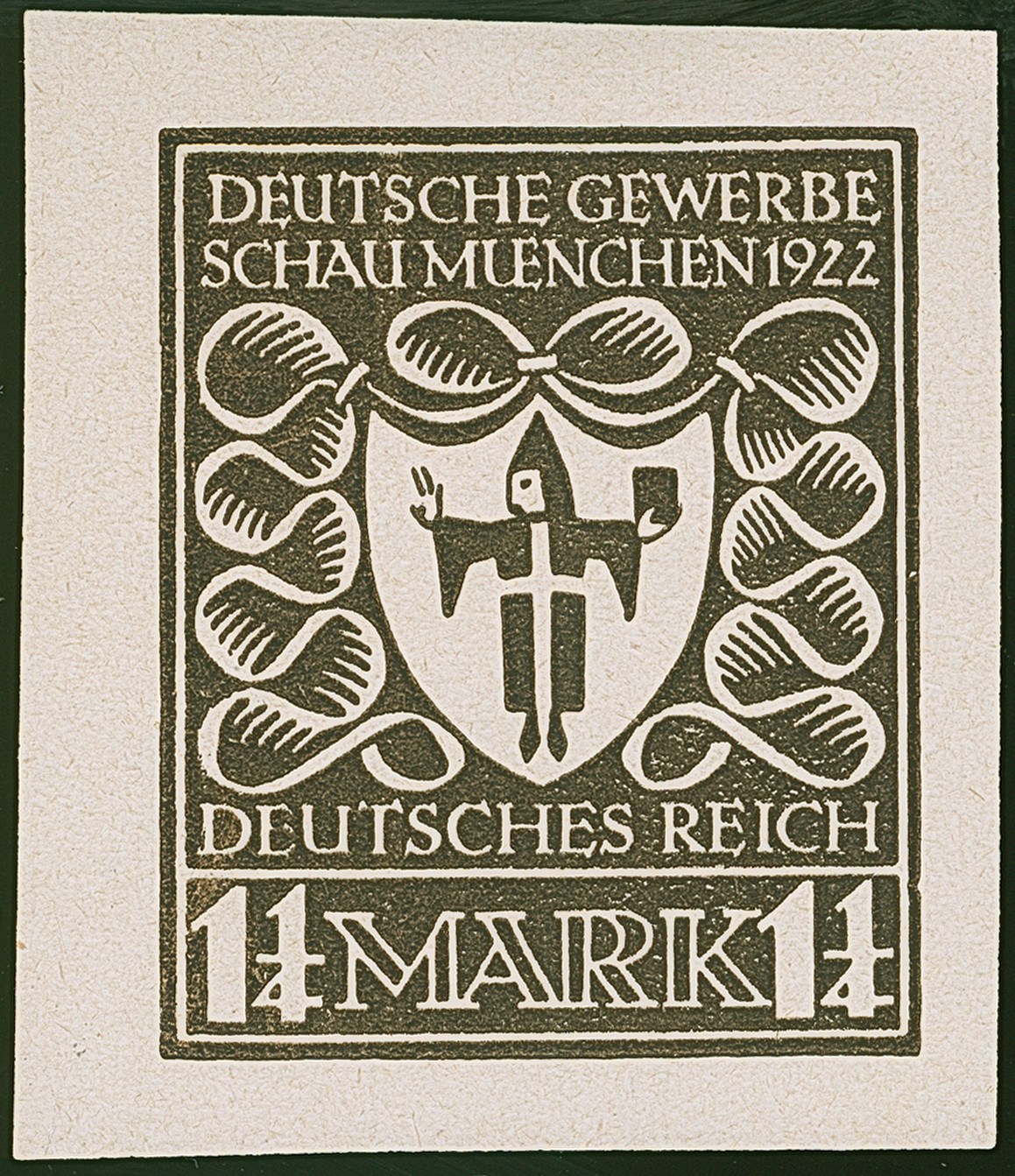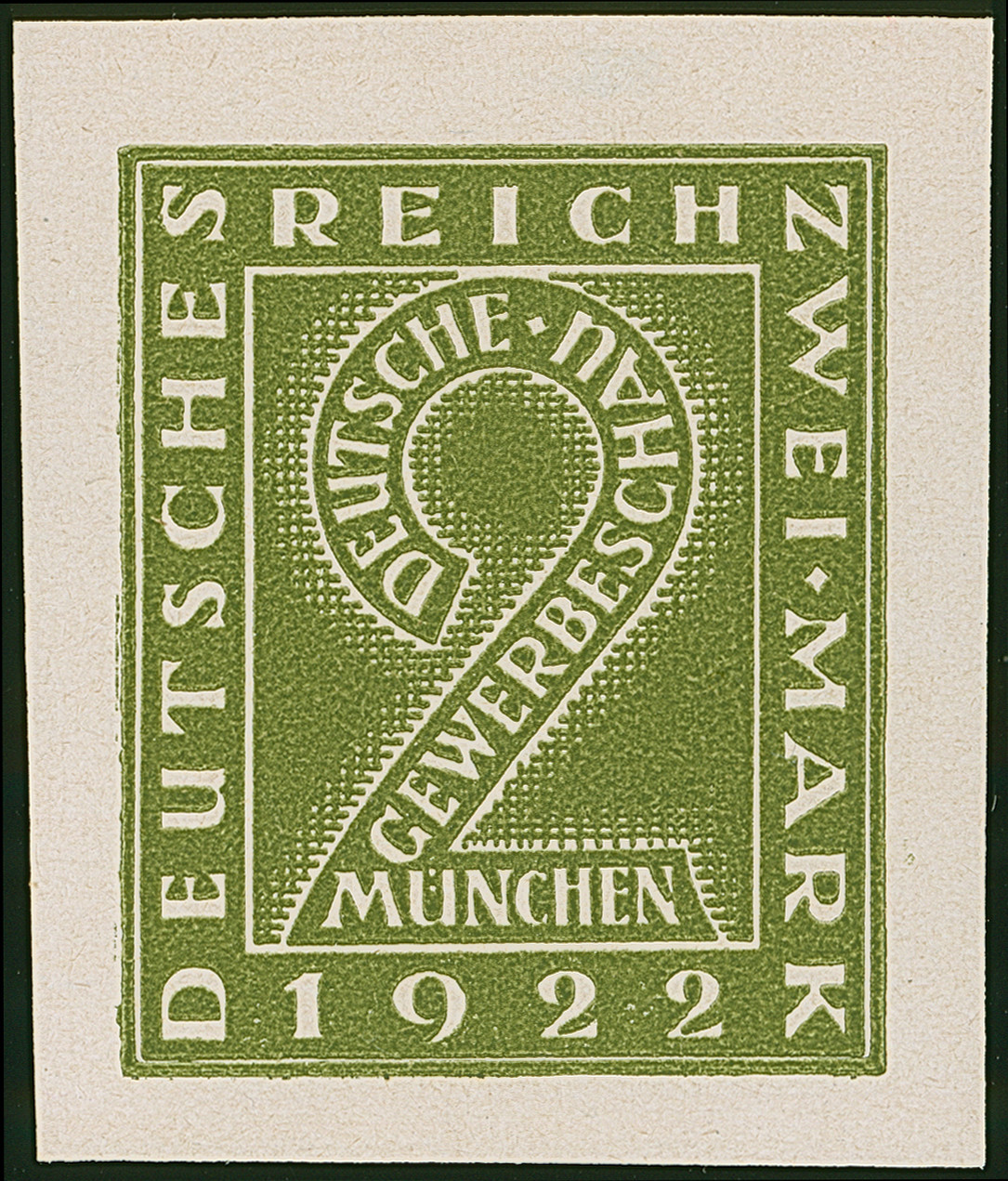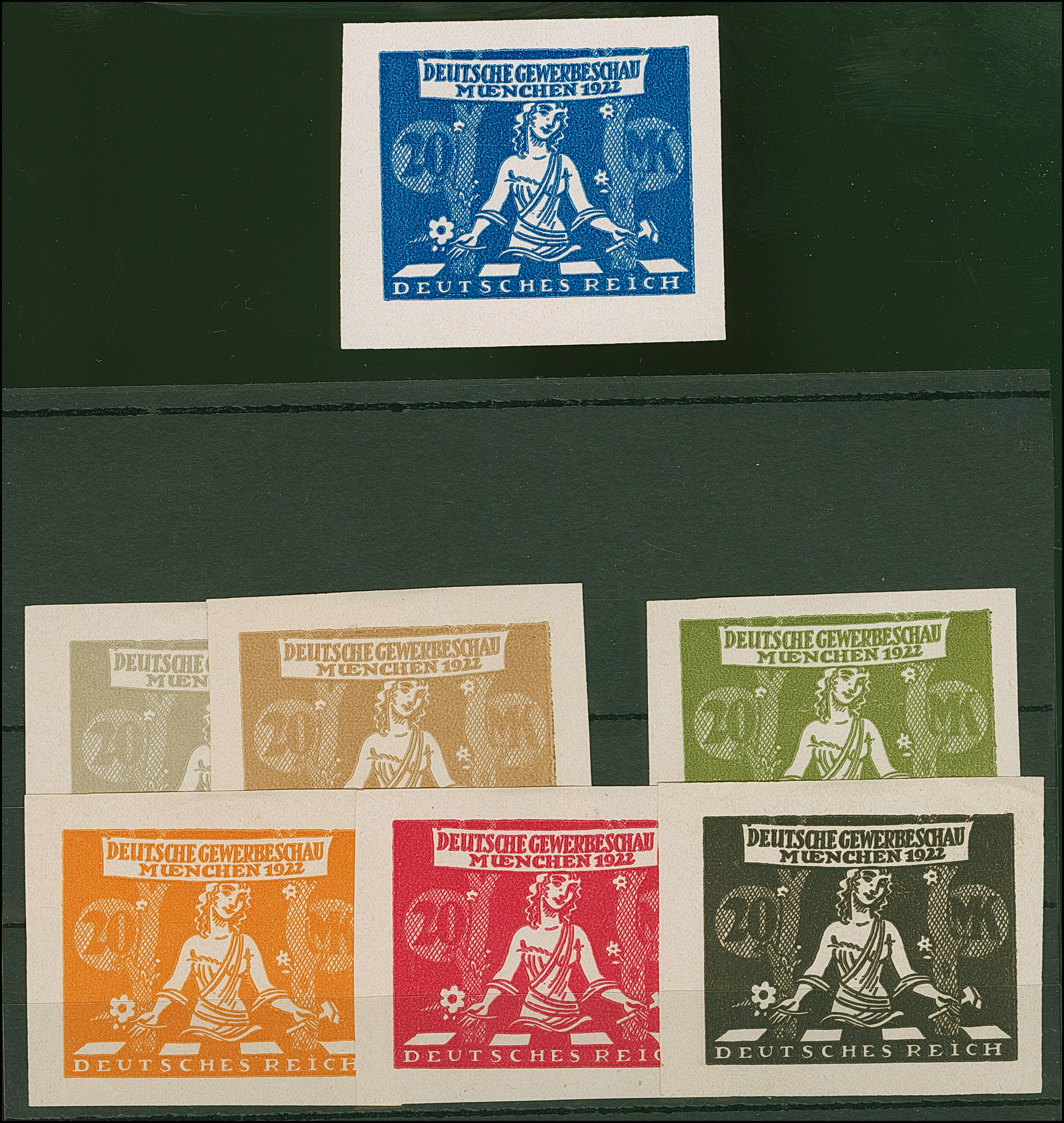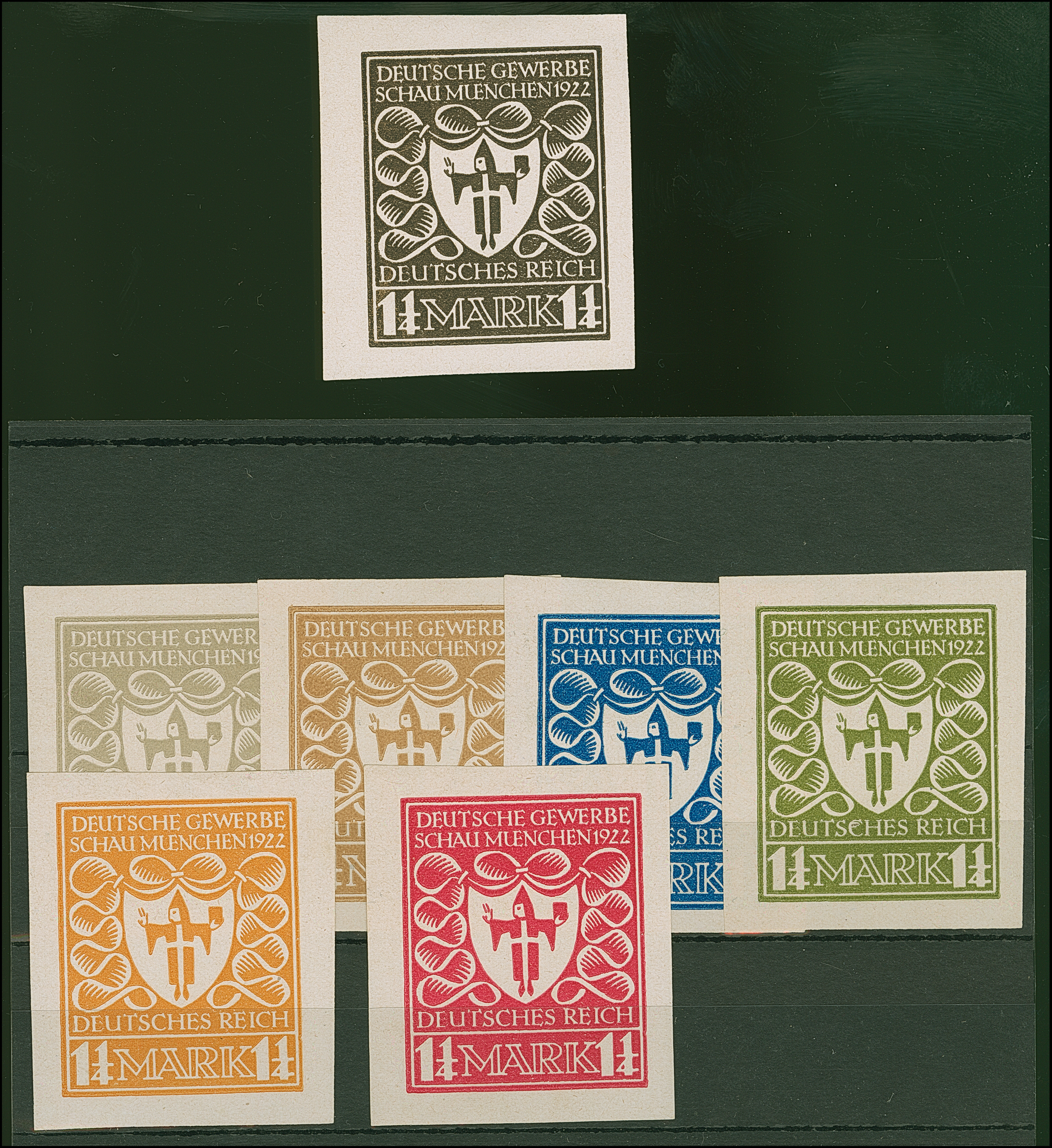 1922, Gewerbeschau München 1 ¼ Mark, sieben verschiedenfarbige ungezähnte Essays im Großformat auf Kunstdruckpapier ohne Gummierung, Falzrest, nach einem Entwurf von S. von Weech, in tadelloser Erhaltung