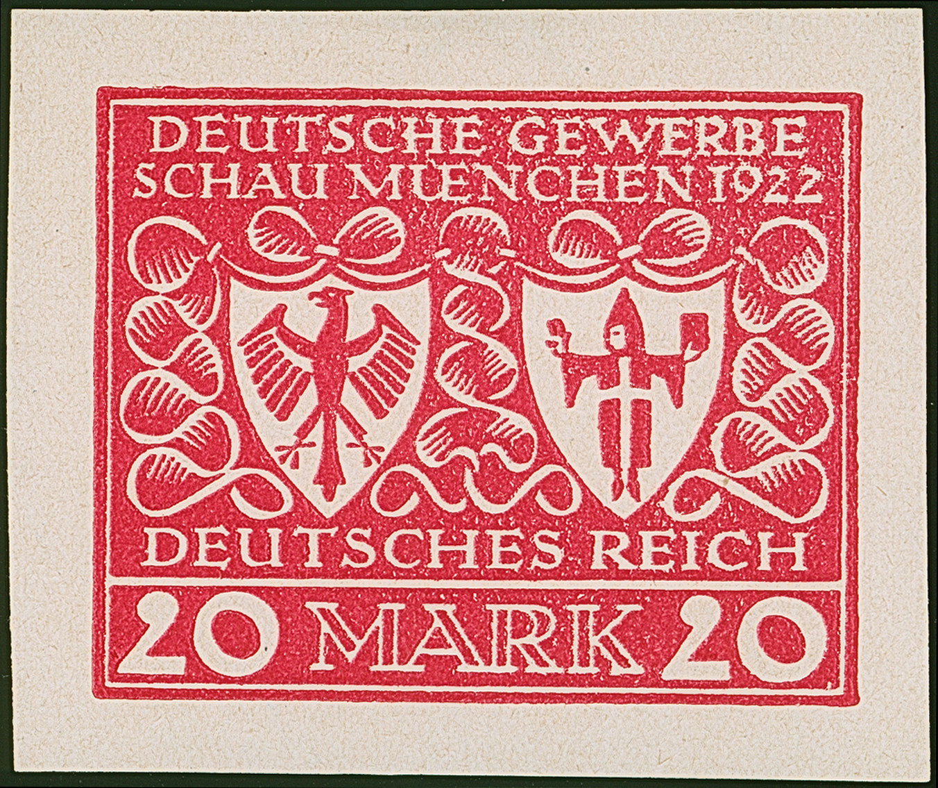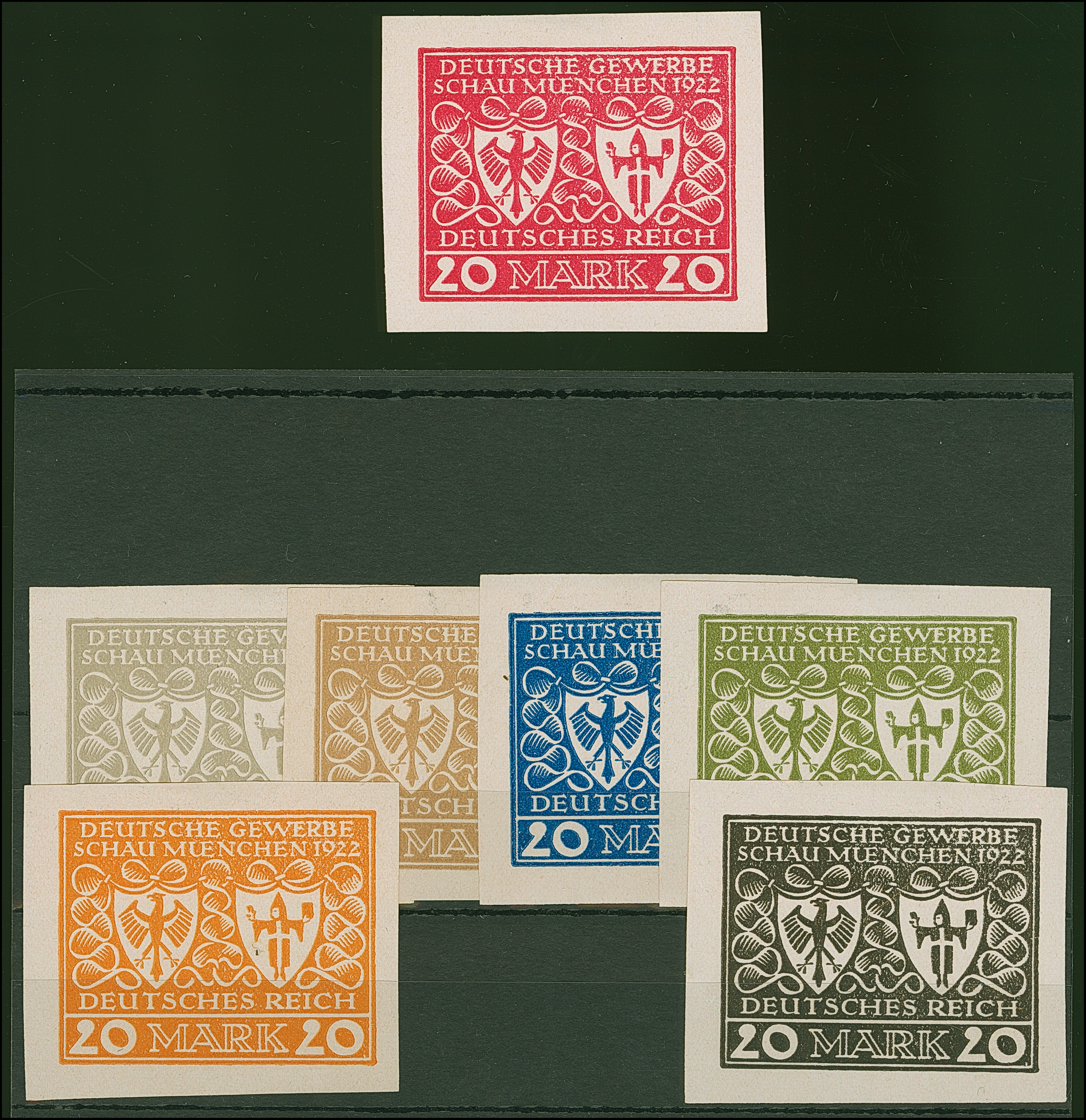 1922, Gewerbeschau München 20 Mark, sieben verschiedenfarbige ungezähnte Essays im Großformat auf Kunstdruckpapier ohne Gummierung, Falzrest, nach einem Entwurf von Prof. Ehmcke, in tadelloser Erhaltung