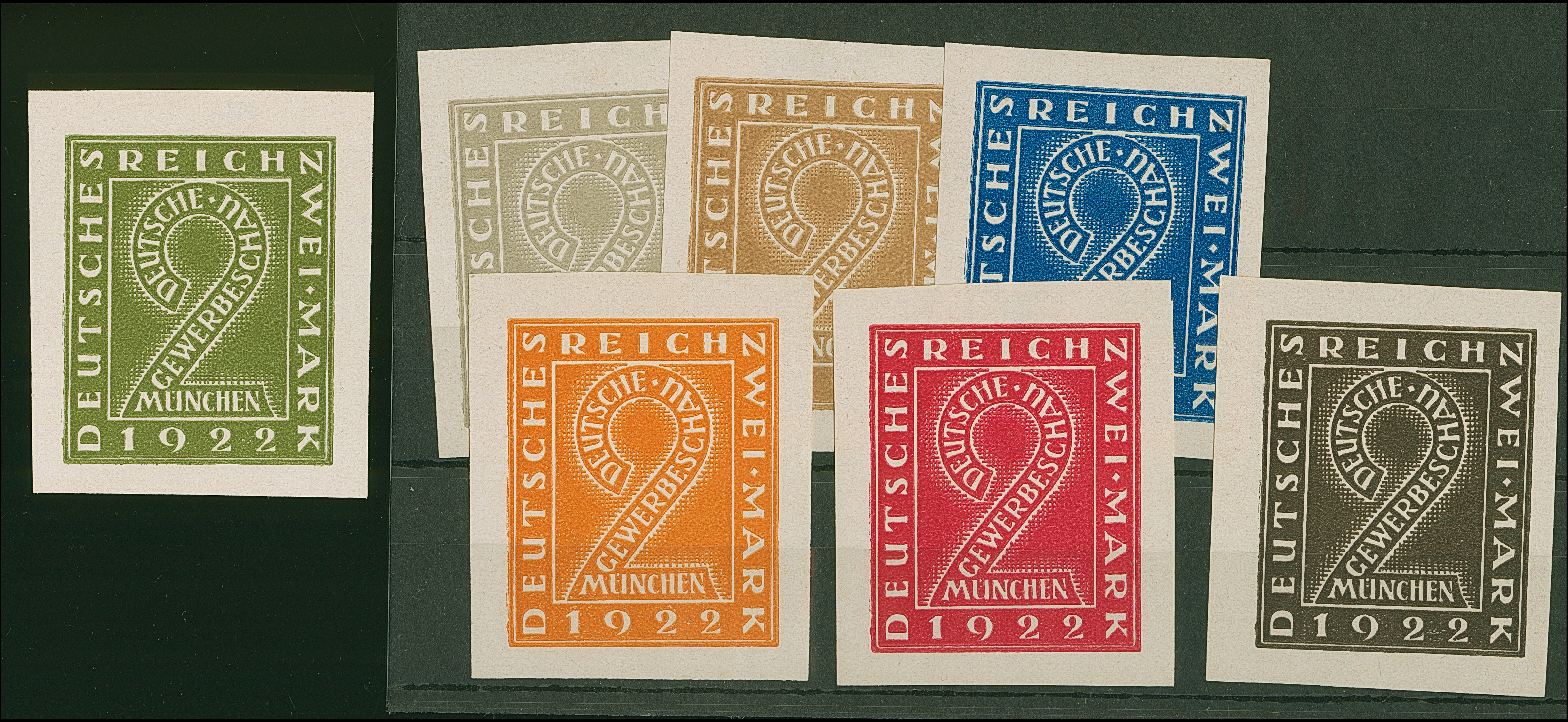 1922, Gewerbeschau München 2 Mark, sieben verschiedenfarbige ungezähnte Essays im Großformat auf Kunstdruckpapier ohne Gummierung, Falzrest, nach einem Entwurf von S. von Weech, in tadelloser Erhaltung
