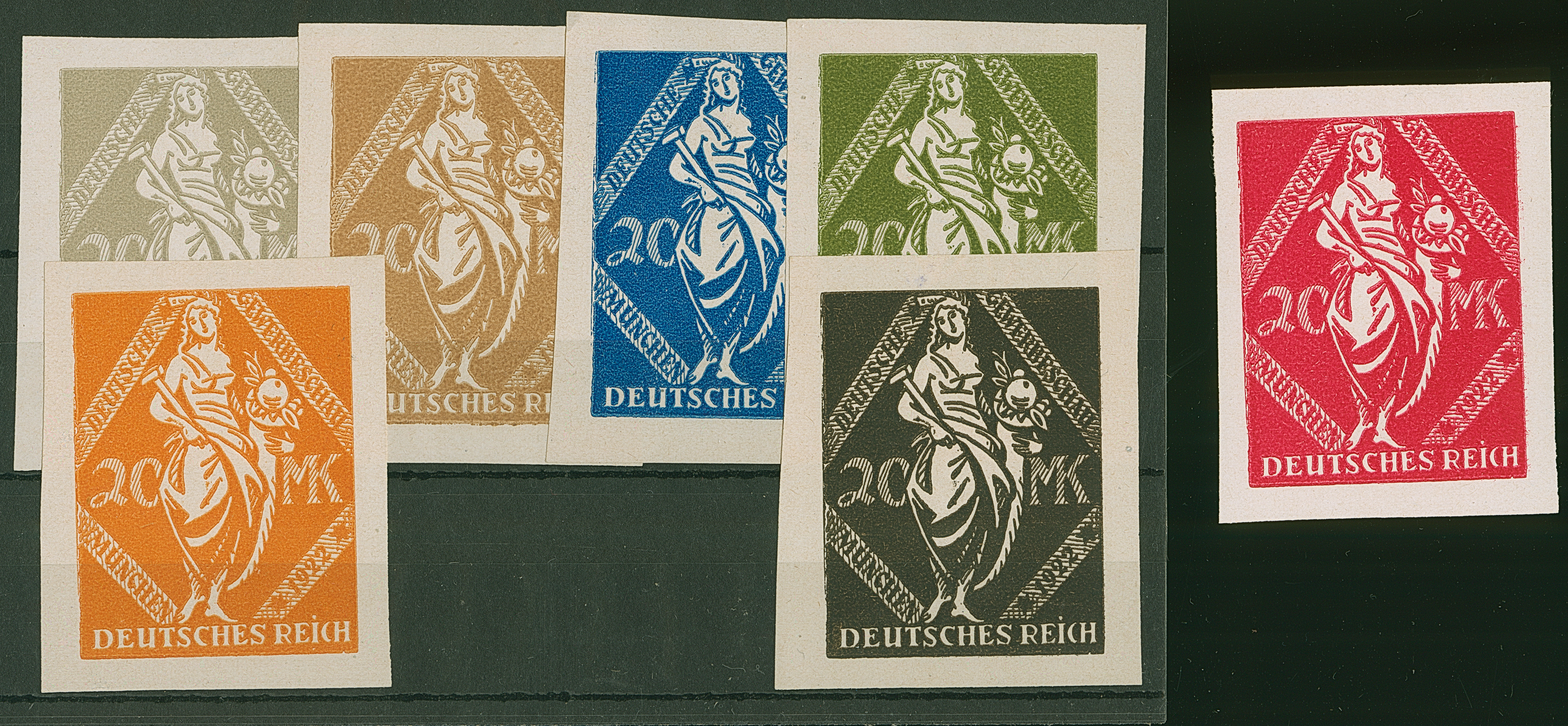 1922, Gewerbeschau München 20 Mark, sieben verschiedenfarbige ungezähnte Essays im Großformat auf Kunstdruckpapier ohne Gummierung, Falzrest, nach einem Entwurf von F. P. Glass, in tadelloser Erhaltung