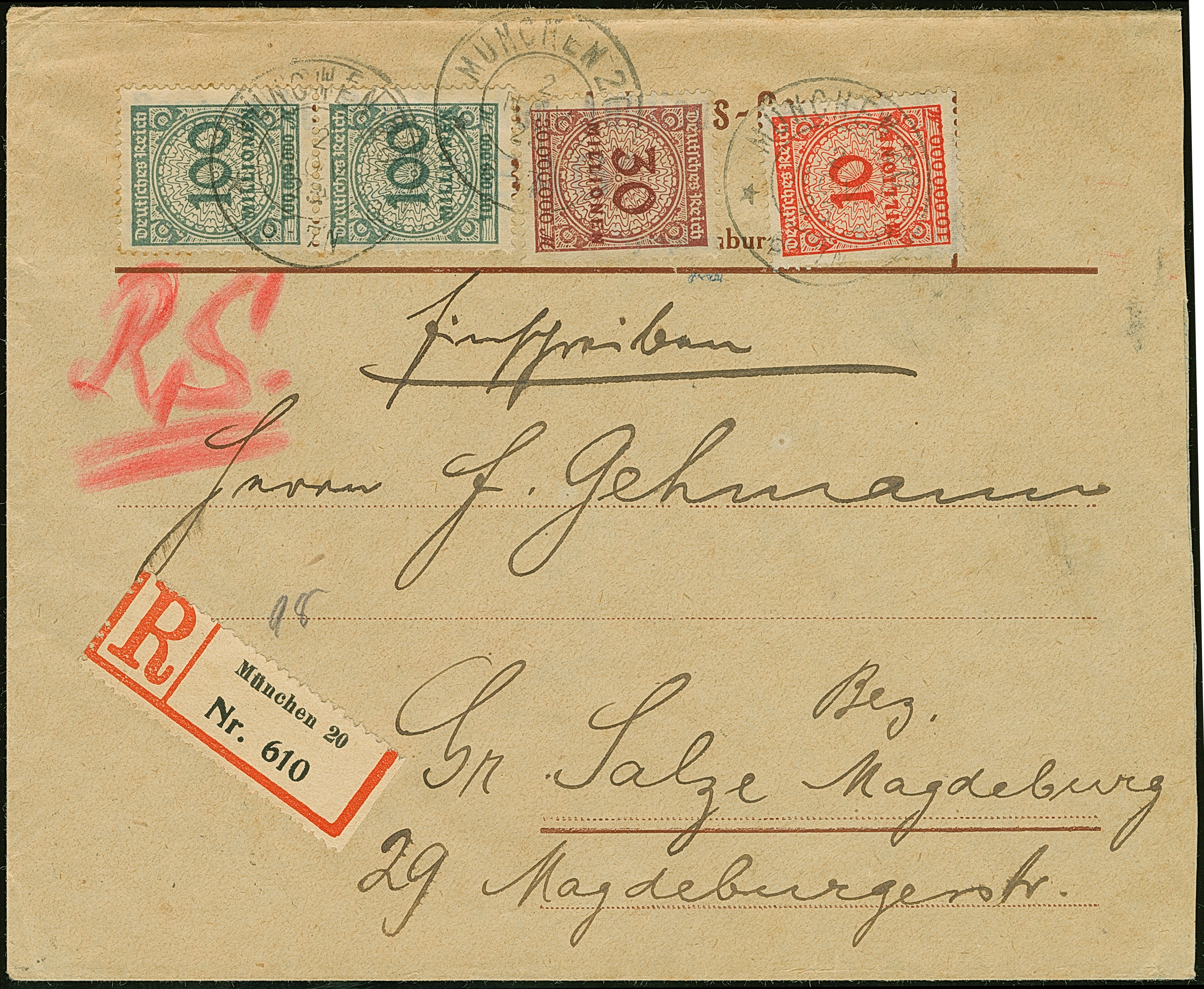 Korbedeckel 100 Mio. M. im senkrechten Paar sowie Einzelmarken 30 und 10 Mio. M. gezähnt je mit Stempel “MÜNCHEN 20 2.11.23” als tarifgerechte Frankatur auf R-Rückschein-Brief der 2. Gewichtsstufe nach Großsalze mit Ankunftsstempel. Der Umschlag mit kleinen Randspuren, ansonsten in guter Erhaltung. Eine nicht häufige Verwendung aus dieser kurzen Portoperiode, sign. Peschl und Infla Berlin