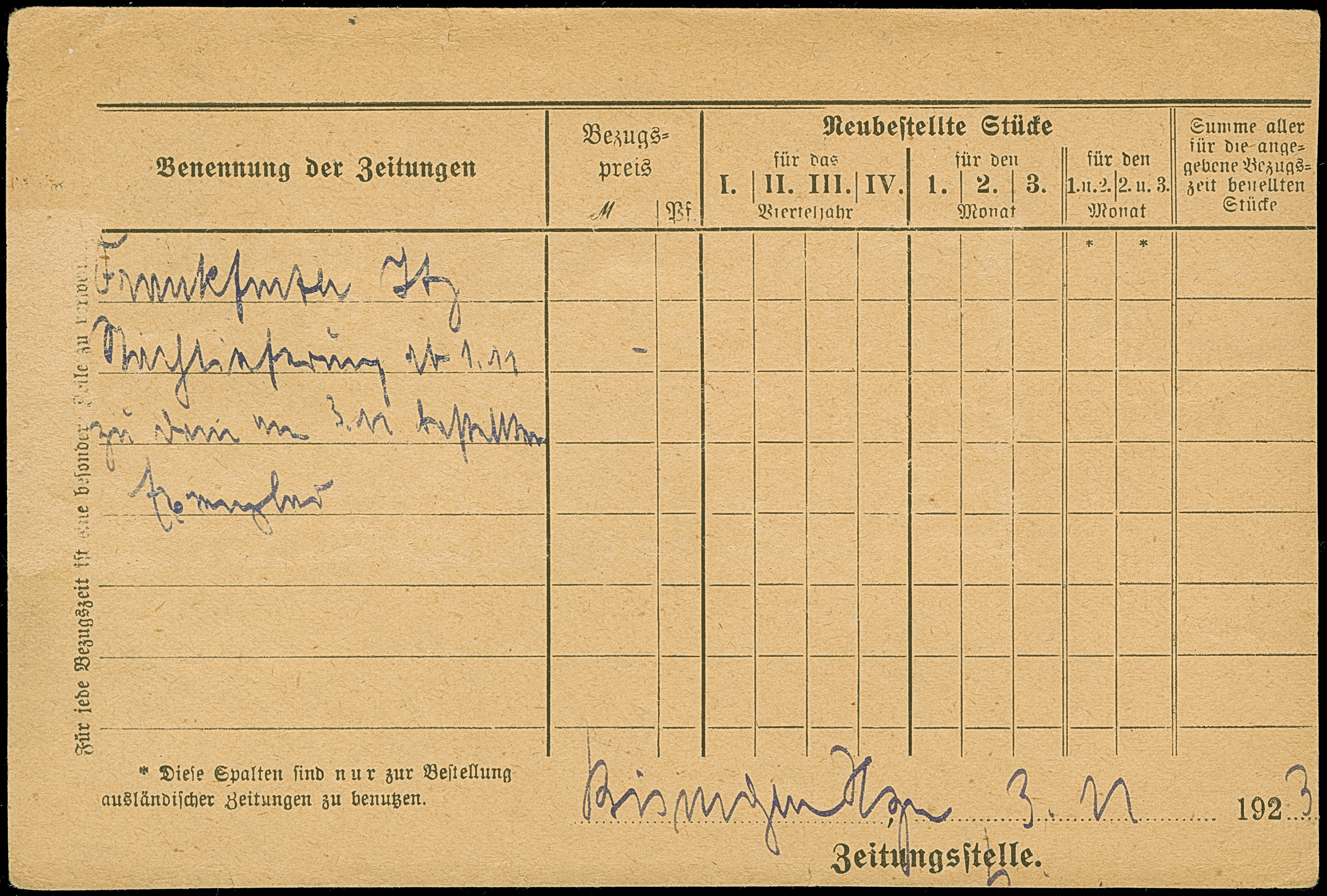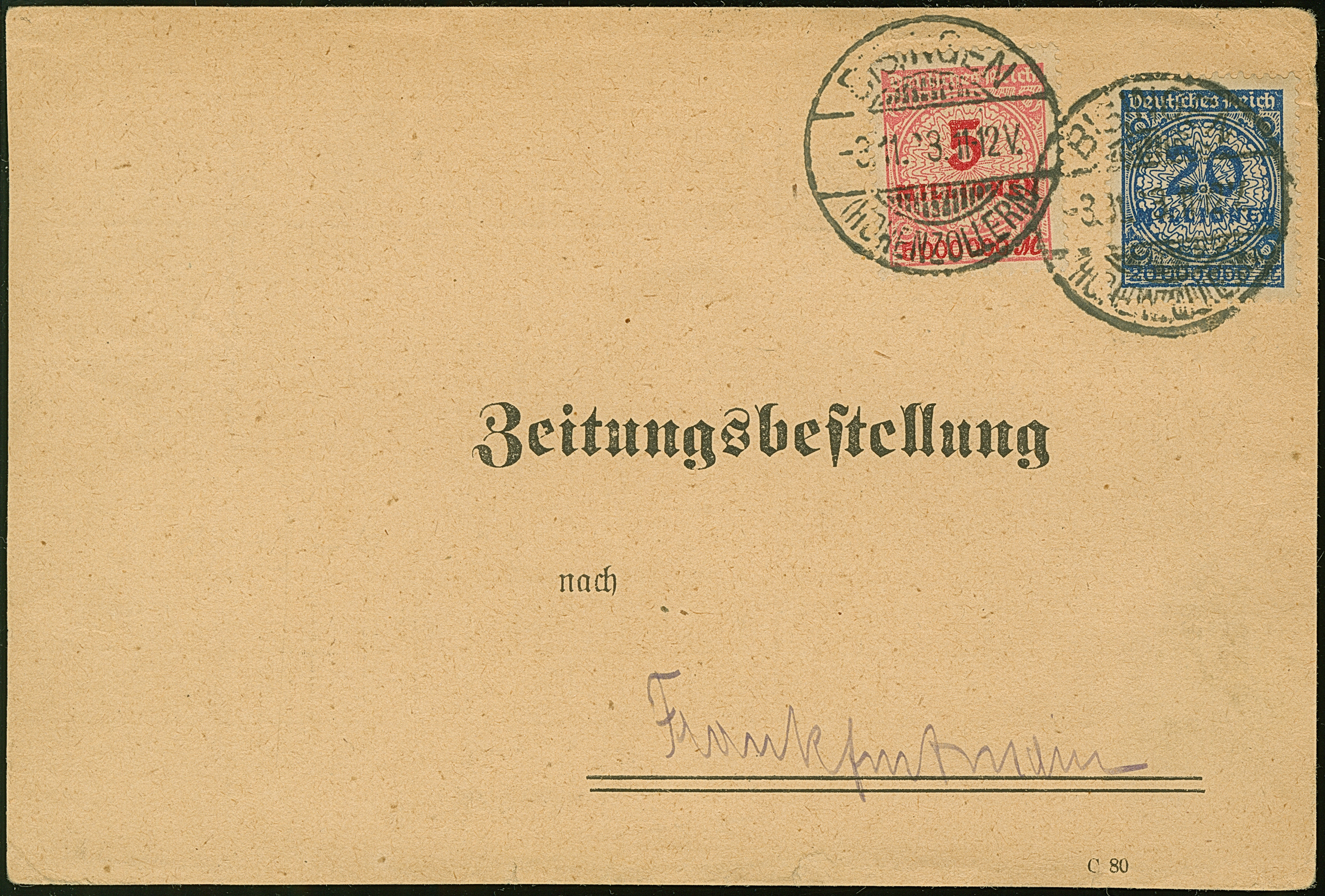 Korbedeckel 5 und 20 Mio. M. gezähnt je mit Stempel “BISINGEN 3.11.23” als tarifgerechte Frankatur auf Postsachen-Vordruckkarte “Zeitungsbestellung” für eine Zeitung nach Frankfurt. Die Karte mit kleinen Randspuren und die linke Marke mit verkürztem Eckzahn, ansonsten in guter Erhaltung. Eine sehr seltene Verwendung aus der Hochinflationszeit, hier aus der kurzen Portoperiode vom 1.11.-4.11.1923