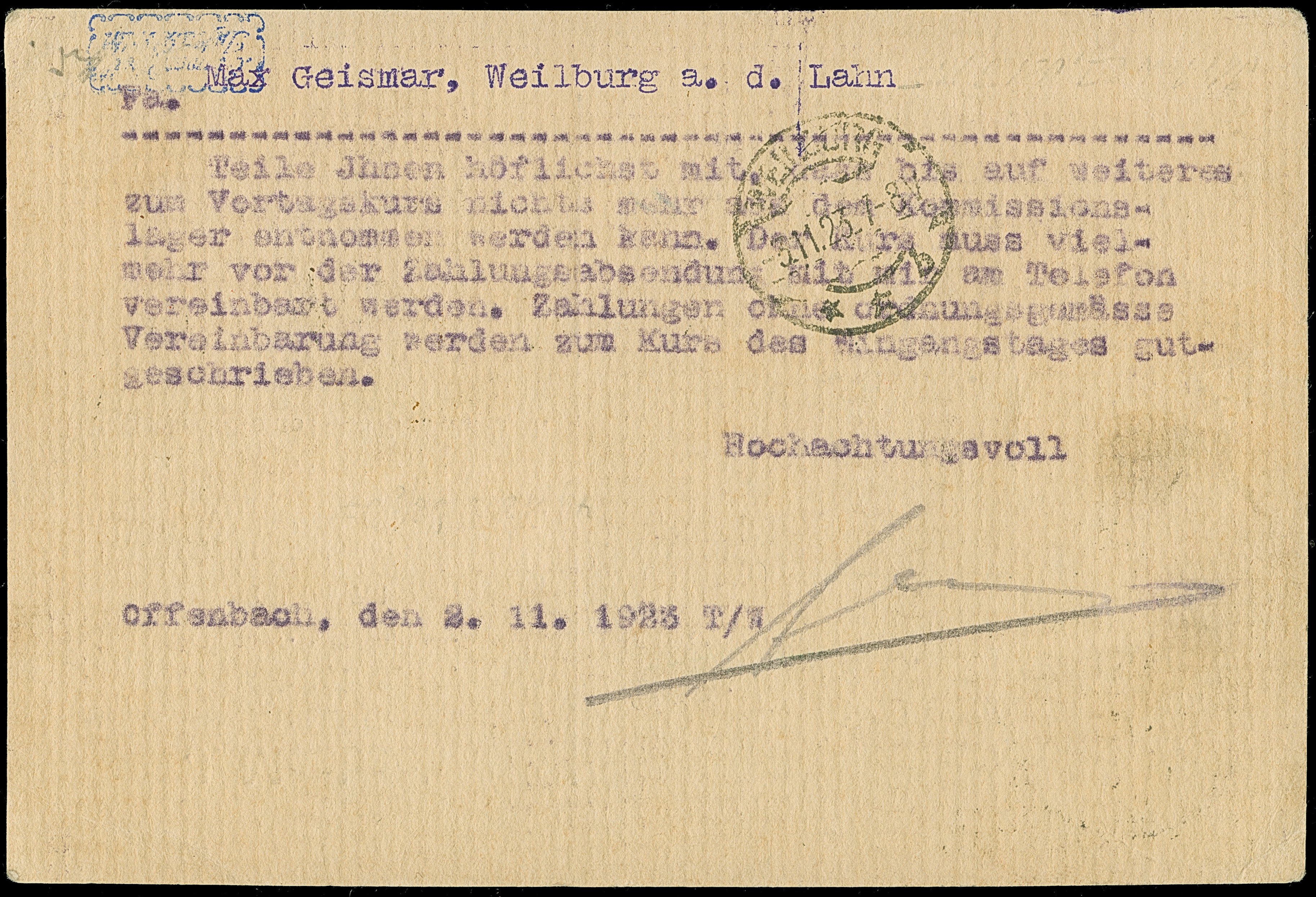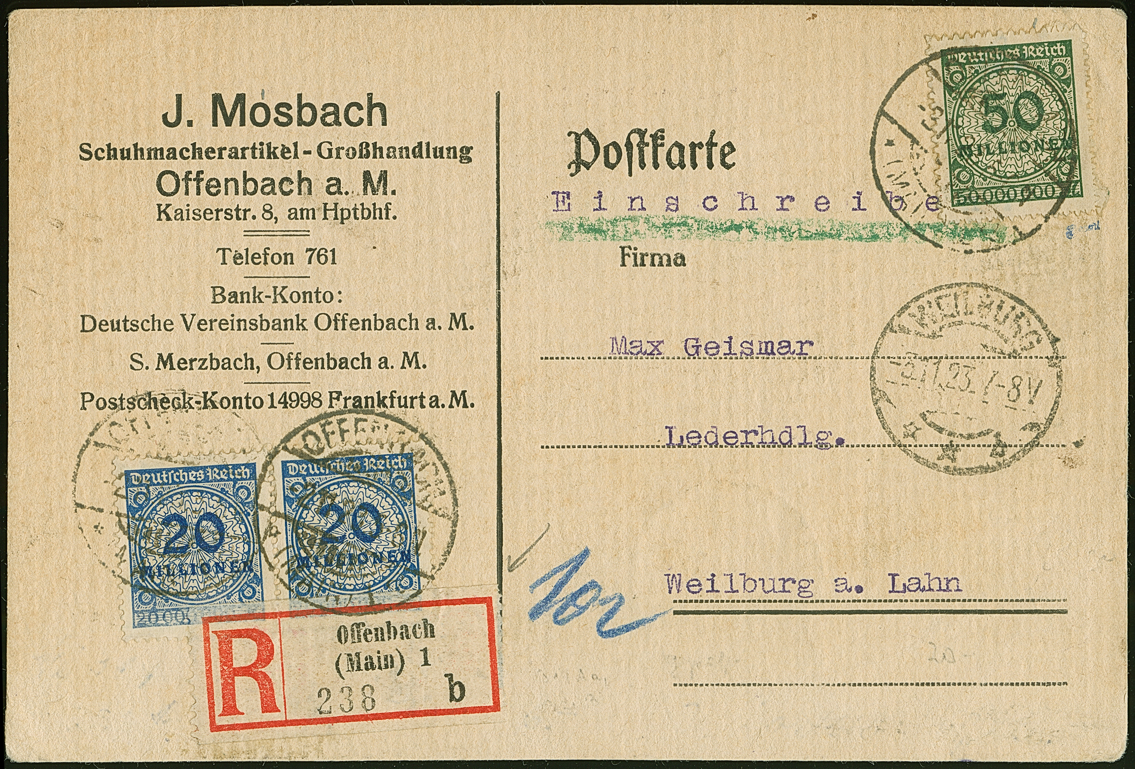 Korbdeckel 20 Mio. M. gezähnt im senkrechten Paar und Einzelmarke 50 Mio. M. durchstochen je mit Stempel “OFFENBACH 3.11.23” als tarifgerechte Frankatur auf R-Firmenpostkarte nach Weilburg mit Ankunftsstempel. Die Karte mit leichten Randspuren, ansonsten in einwandfreier Erhaltung, sign. Infla Berlin