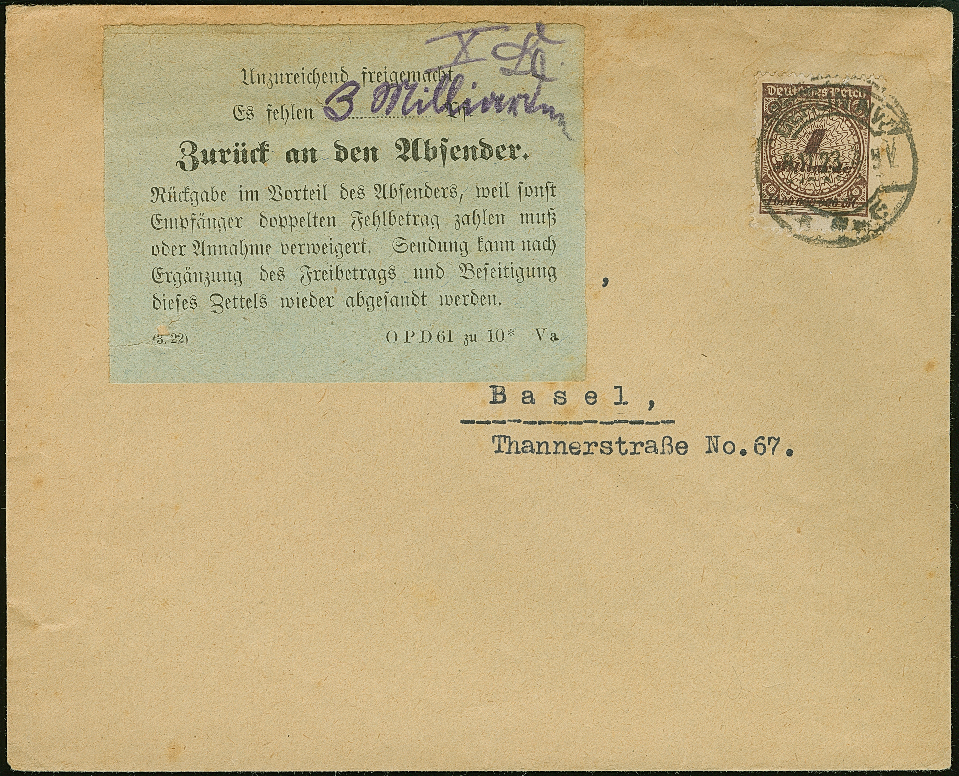 Korbedeckel 1 Mrd. M. durchstochen mit Stempel “BERLIN 14.11.23” auf unterfrankiertem Drucksachen-Umschlag nach Basel mit grünem Aufkleber “Unzureichend freigemacht. Es fehlen…(3 Milliarden) Pf. Zurück an den Absender….”. Der Umschlag mit leichten Flecken, in dieser Kombination mit amtlichen Hinweiszettel aus der Hochinflation selten