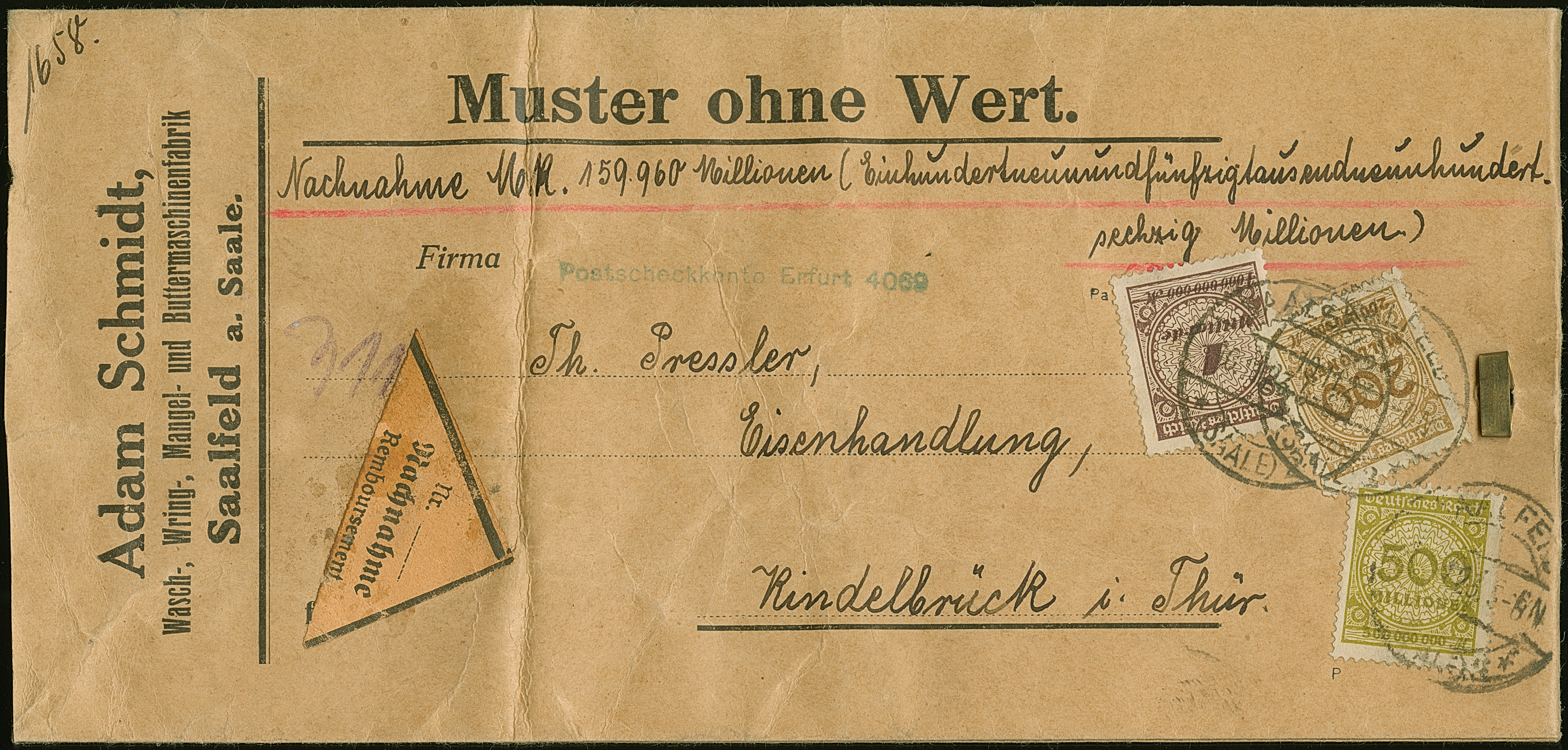 Korbdeckel 200 Mio. M., 500 Mio. M. und 1 Mrd. M. gezähnt jeweils mit Stempel “SAALFELD 10.11.23” auf Nachnahme-Muster ohne Wert"-Versandumschlag bis 500 g nach Kindelbrück mit Ankunftsstempel. Eine Marke mit Druckstelle und Versandumschlag mit Falt- und Beförderungsspuren, in guter Gesamterhaltung. Eine dekorative und nicht häufige Verwendung mit 1,7 Mrd. M.-Porto