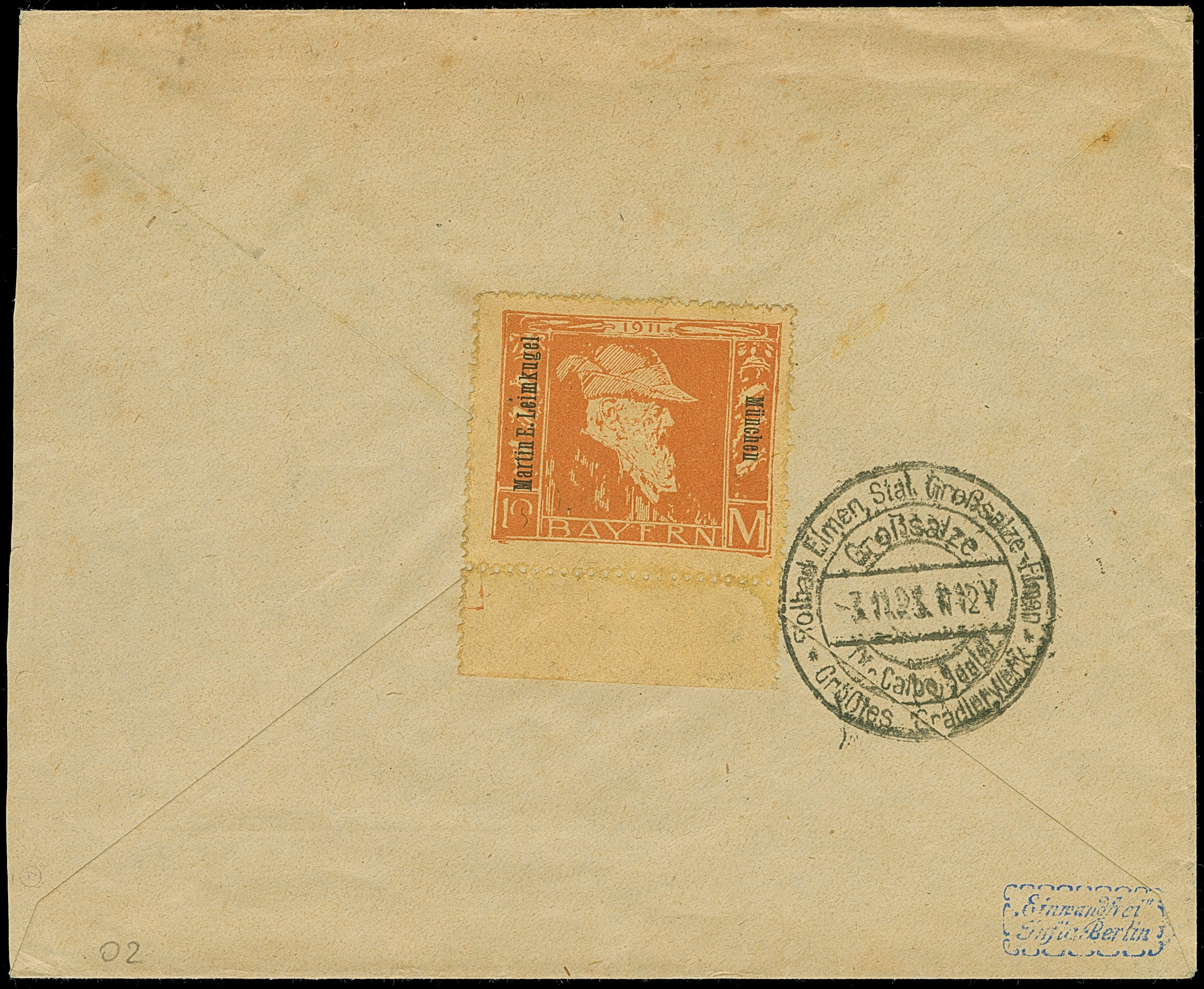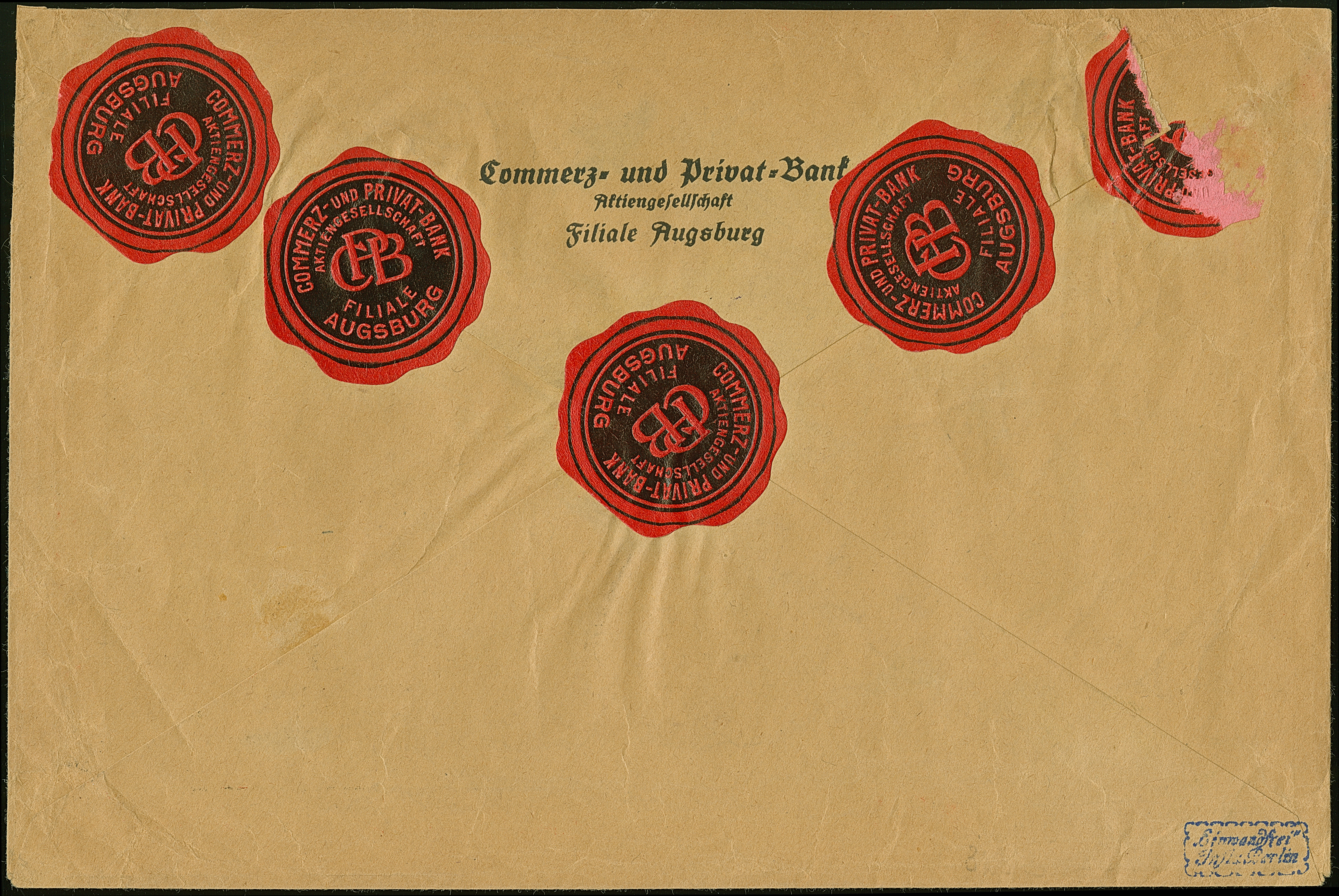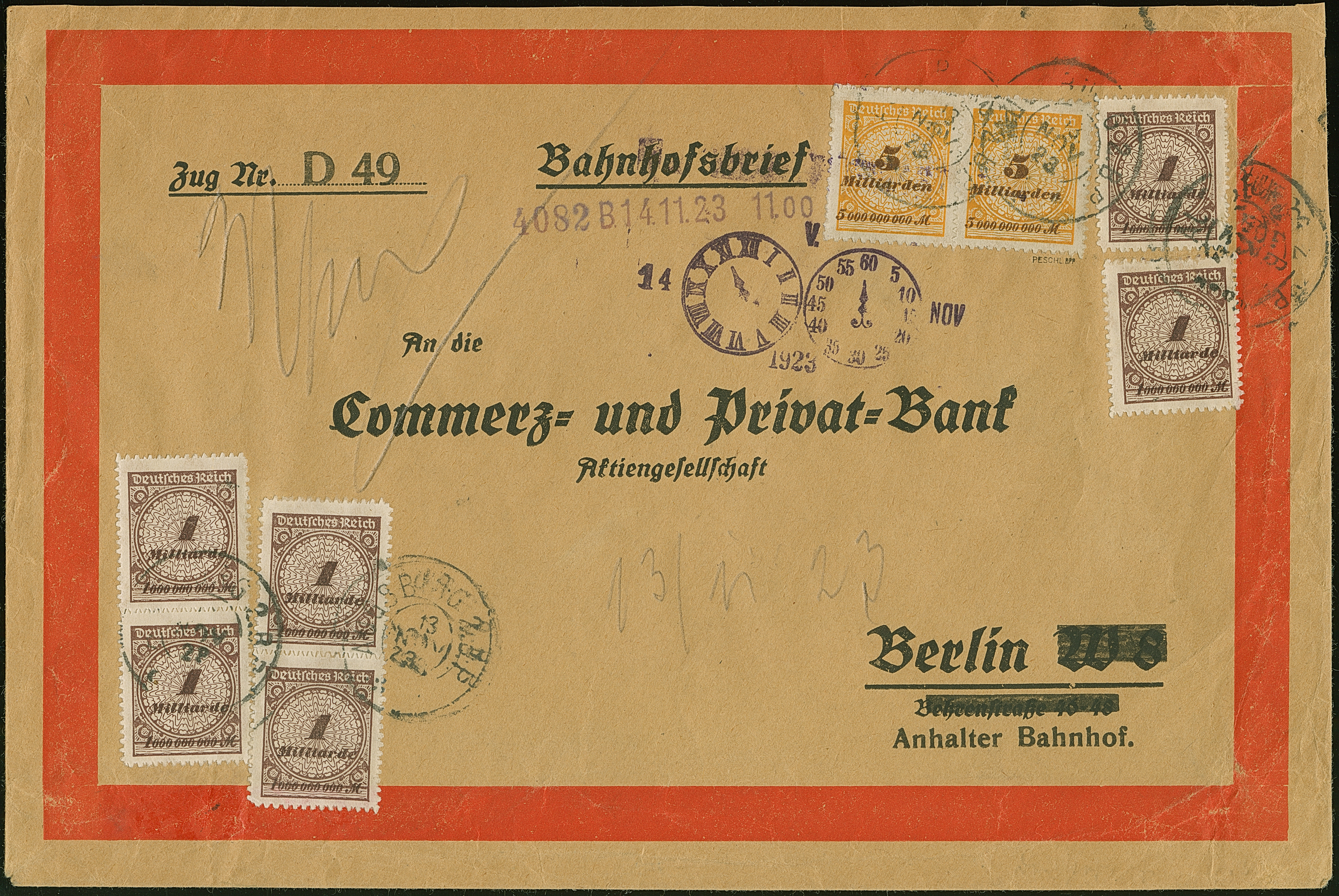 Korbdeckel 1 Mrd. M. durchstochen, zwei senkrechte Paare und Einzelmarke sowie waagerechtes Paar 5 Mrd. M. durchstochen je mit Stempel “AUGSBURG 2 B.P. 14.NOV.23” als tarifgerechte Frankatur auf Bahnhofsbrief bis 250 g im etwas größeren Format nach Berlin. Der Umschlag mit Beförderungsspuren im Rand, ansonsten in guter Gesamterhaltung, sign. Infla Berlin