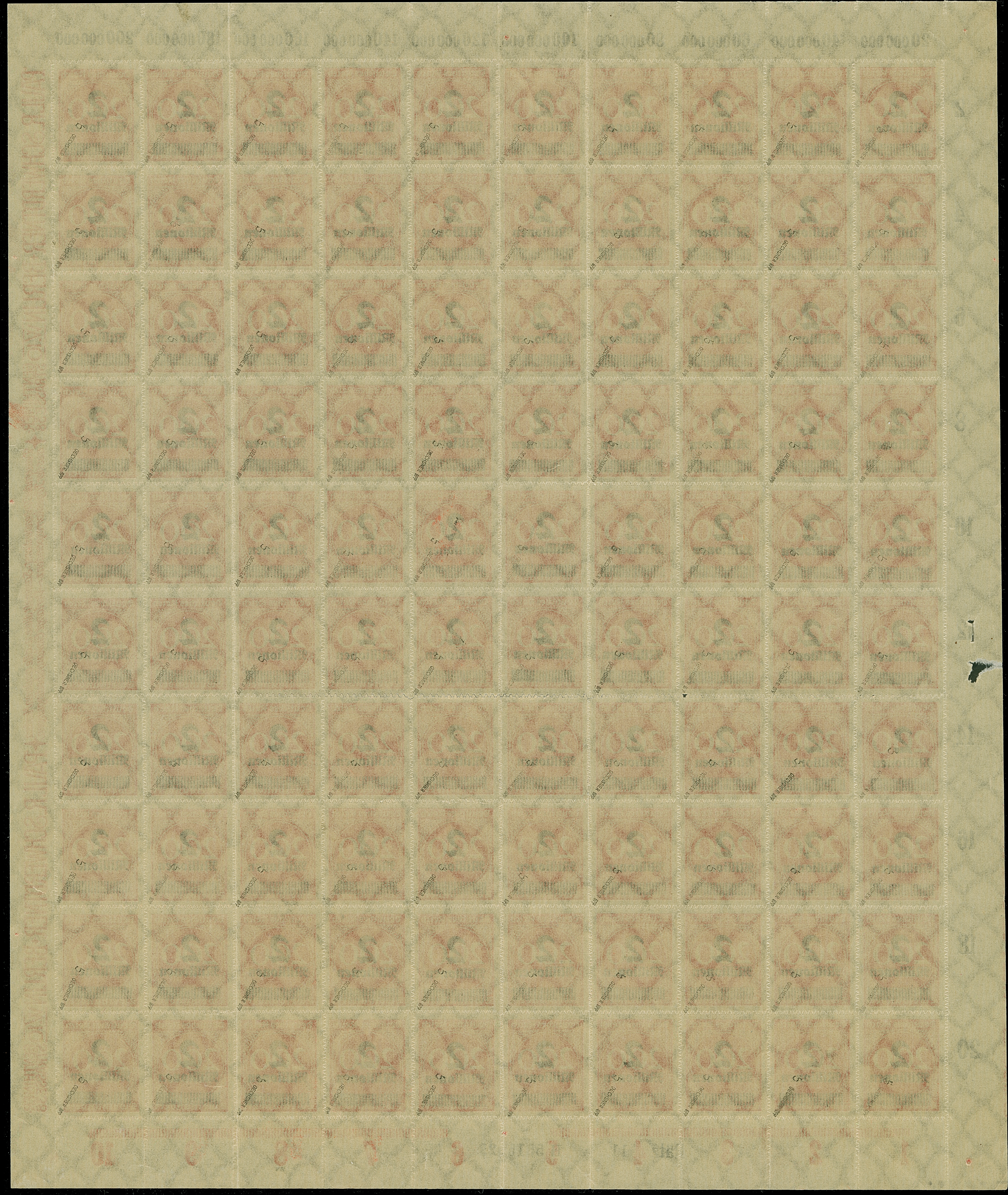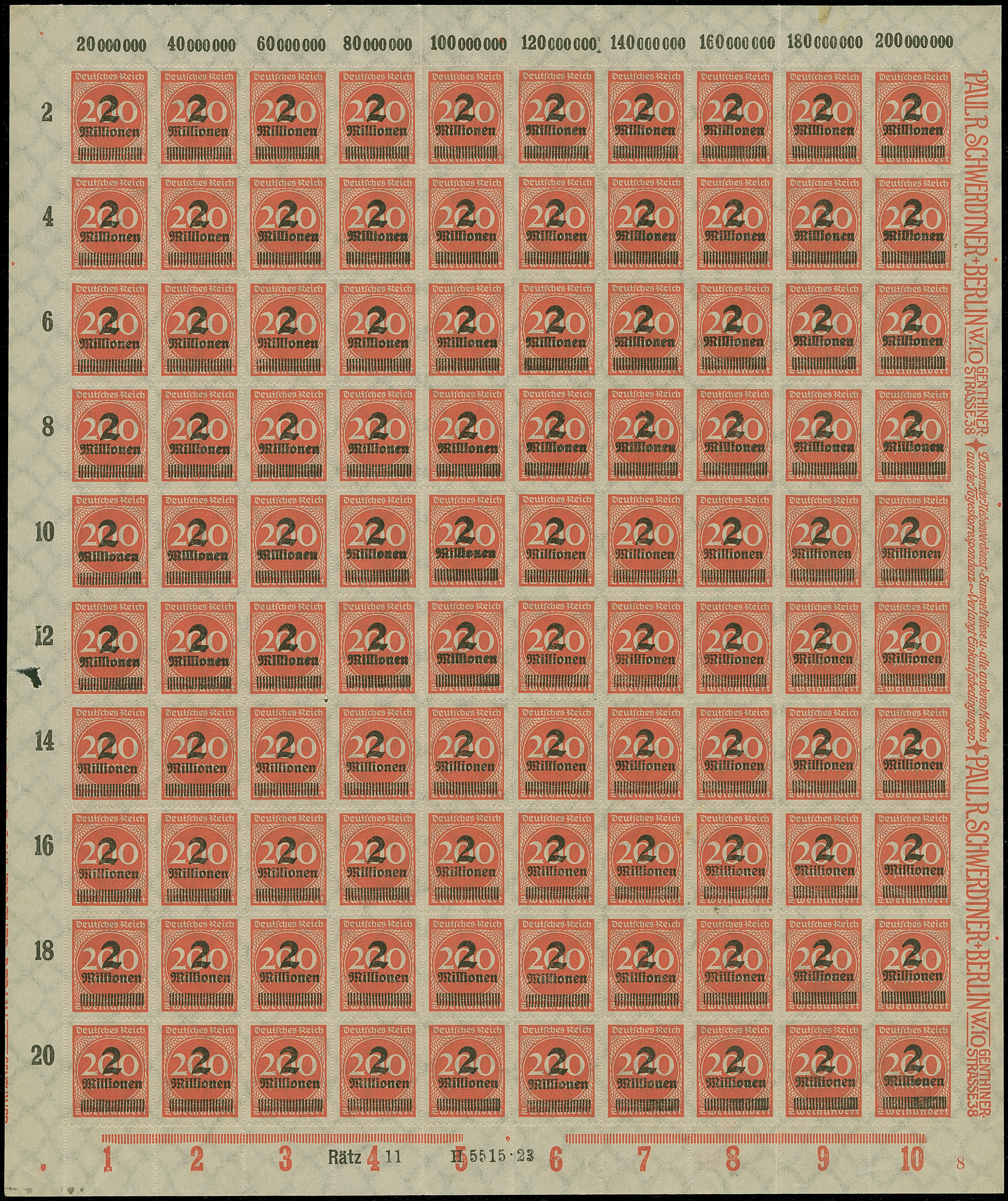 2 Mio auf 200 M. bräunlichrot, durchstochen, kpl. Bogen mit HAN "5515.23" und Druckerzeichen "Rätz", mittig zwischen der 6. und 7. Reihe angetrennt, postfrisch, jede Marke sign. Oechsner BPP