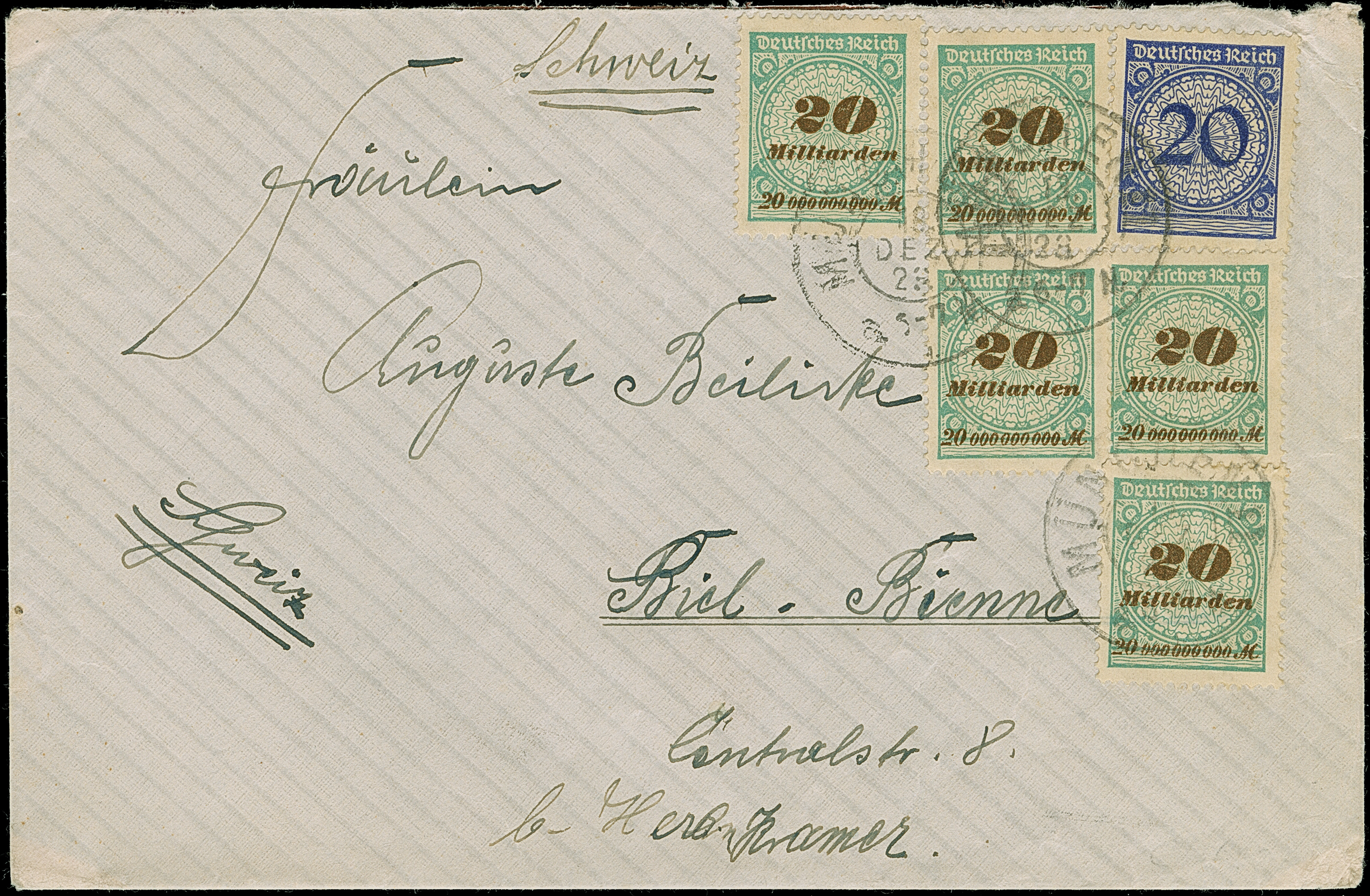 1923, Korbdeckel 20 Mrd. M. gezähnt, fünf Einzelmarken in Mischfrankatur mit Rentenpfennig 20 Pfg. je mit Stempel “MÜNCHEN 18.DEZ.23” als tarifgerechte Frankatur auf Brief nach Biel, Schweiz. Der Umschlag mit kleinen Randspuren, ansonsten in einwandfreier Erhaltung, sign. Infla Berlin