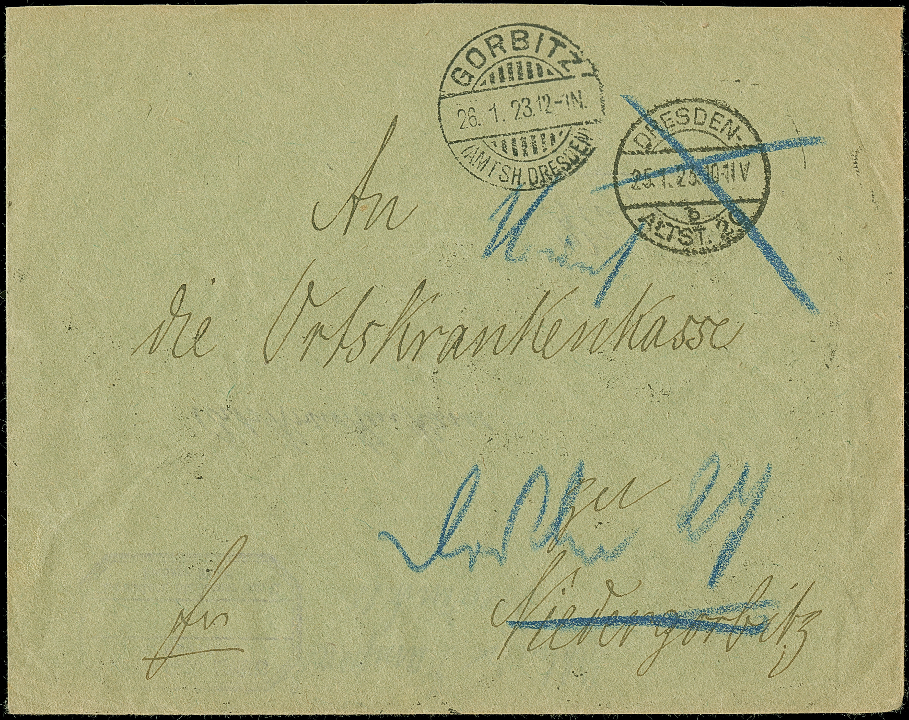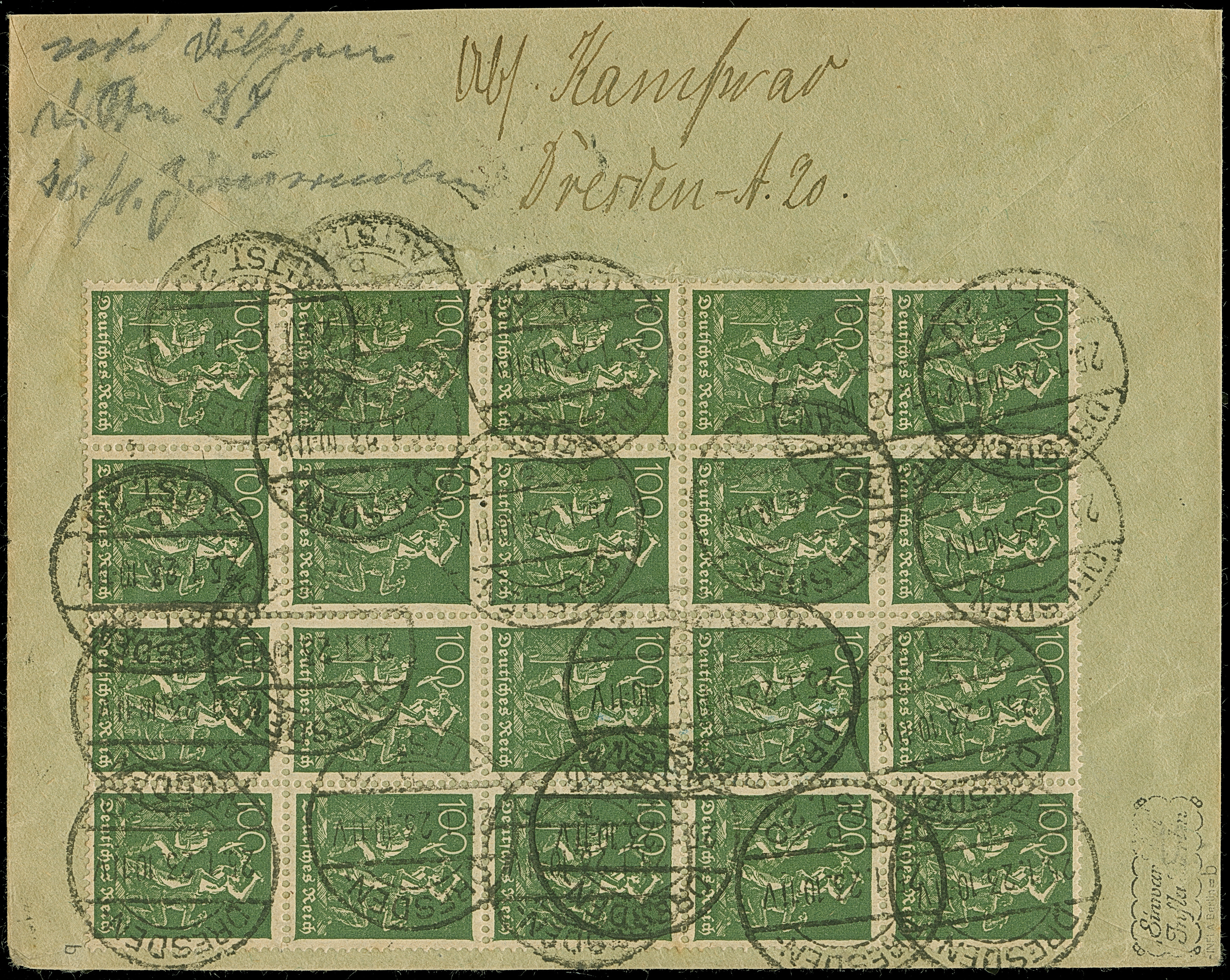 1921, Arbeiter 100 Pfg. schwarzgrün, 20er-Block, farbfrisch und gut gezähnt, sauber mit Stempel “DRESDEN 25.1.23” rückseitig auf portogerechtem Brief nach Gorbitz mit vorderseitigem Ankunftsstempel, tadellos, sign. Infla