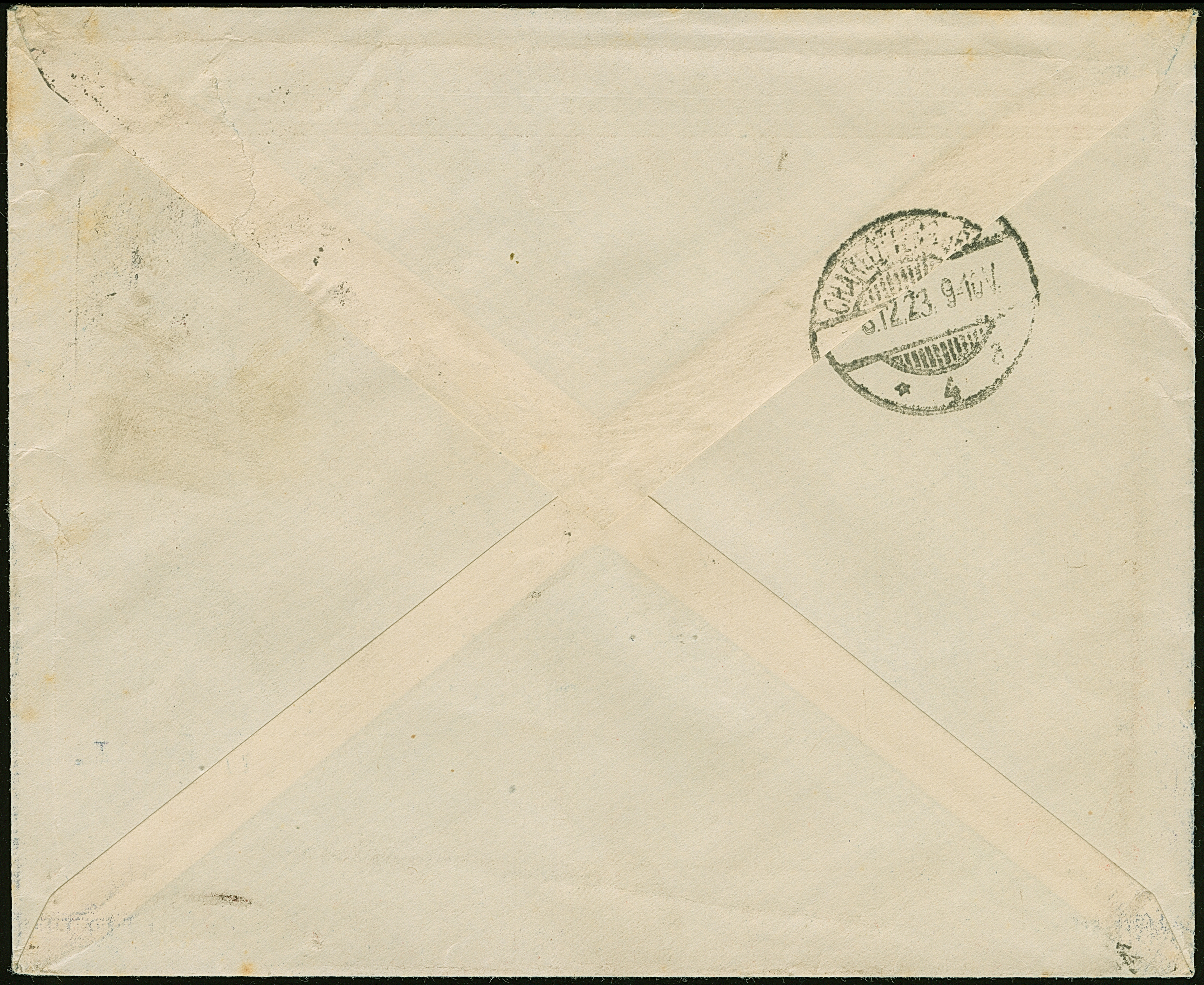 Korbedeckel 5 Mrd. M. durchstochen im Viererblock mit Unterrand und HAN “H 6308.23 24” in Mischfrankatur mit Rentenpfennig 3-20 Pfg. je mit Stempel “BORNA 7.12.23” als tarifgerechte Frankatur auf R-Brief der 2. Gewichtsstufe nach Charlottenburg mit Ankunftsstempel. Die Marken und der Umschlag sind in einwandfreier Erhaltung. Eine ungewöhnliche Frankatur-Kombination, Kurzbefund Oechsner BPP (2005)