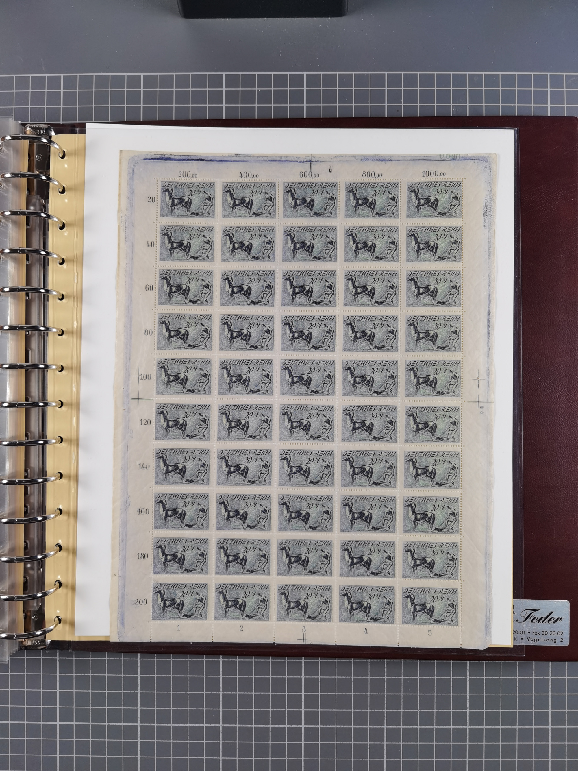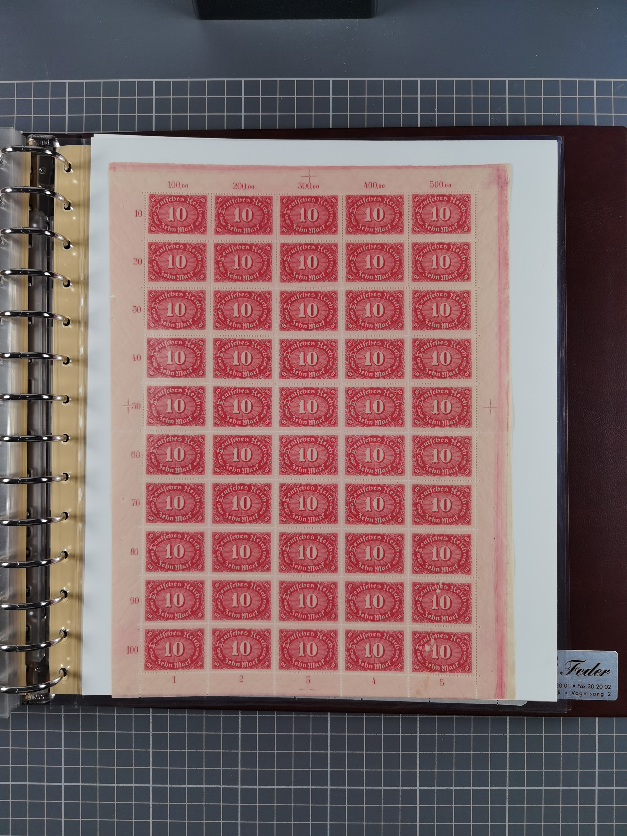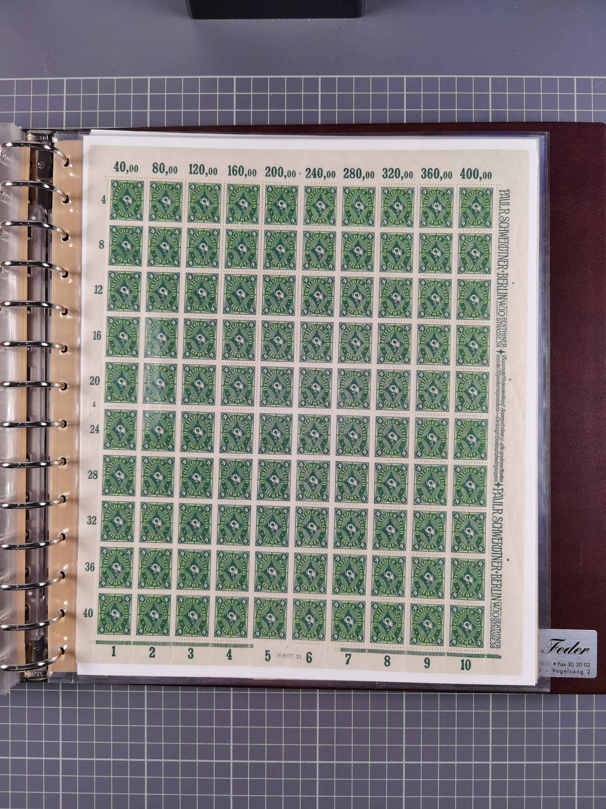 1922, Posthorn 4 M. dunkelgrün, kompletter ungezähnter Druckbogen zu 400 Werten, mit 4 Schalterbogen zu 100 Werten, an allen Seiten vollständige Seitenränder. Mit senkrechten sowie waagerechten Zwischenstegpaaren, dem Herzstück, vier HANs sowie dem Druckerzeichen “Ahlert”, postfrisch, zwischen den Bögen übliche Faltung, tadellos. Eine der großen Seltenheiten, ProFi hat kein weiteres derartiges Stück registriert, das Herzstück damit ebenfalls Unikat