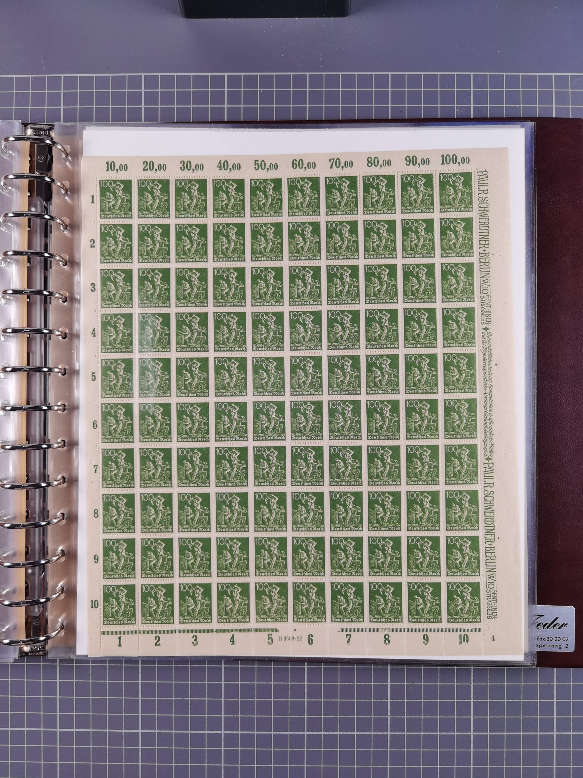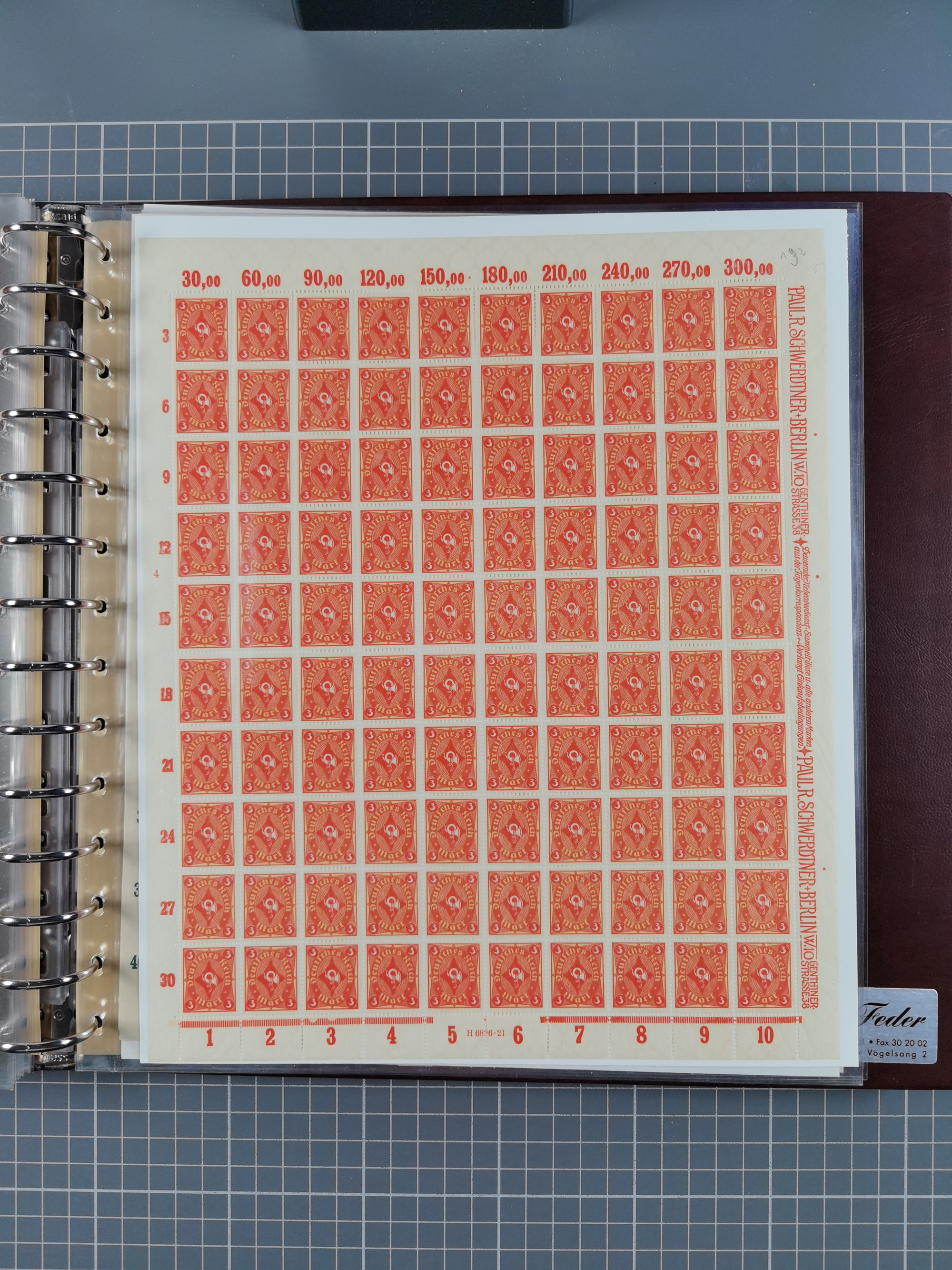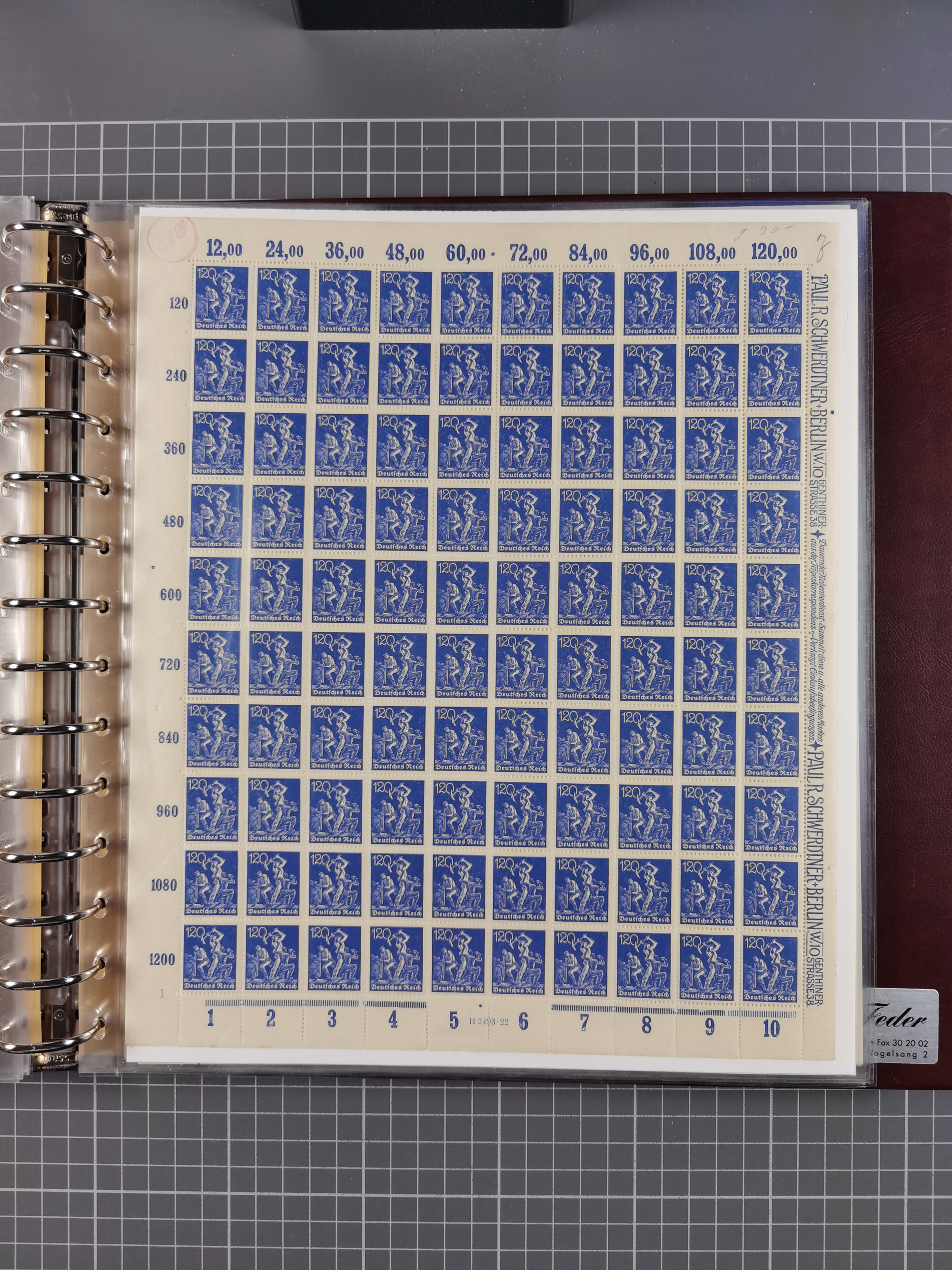 1922, Posthorn 4 M. dunkelgrün, kompletter ungezähnter Druckbogen zu 400 Werten, mit 4 Schalterbogen zu 100 Werten, an allen Seiten vollständige Seitenränder. Mit senkrechten sowie waagerechten Zwischenstegpaaren, dem Herzstück, vier HANs sowie dem Druckerzeichen “Ahlert”, postfrisch, zwischen den Bögen übliche Faltung, tadellos. Eine der großen Seltenheiten, ProFi hat kein weiteres derartiges Stück registriert, das Herzstück damit ebenfalls Unikat