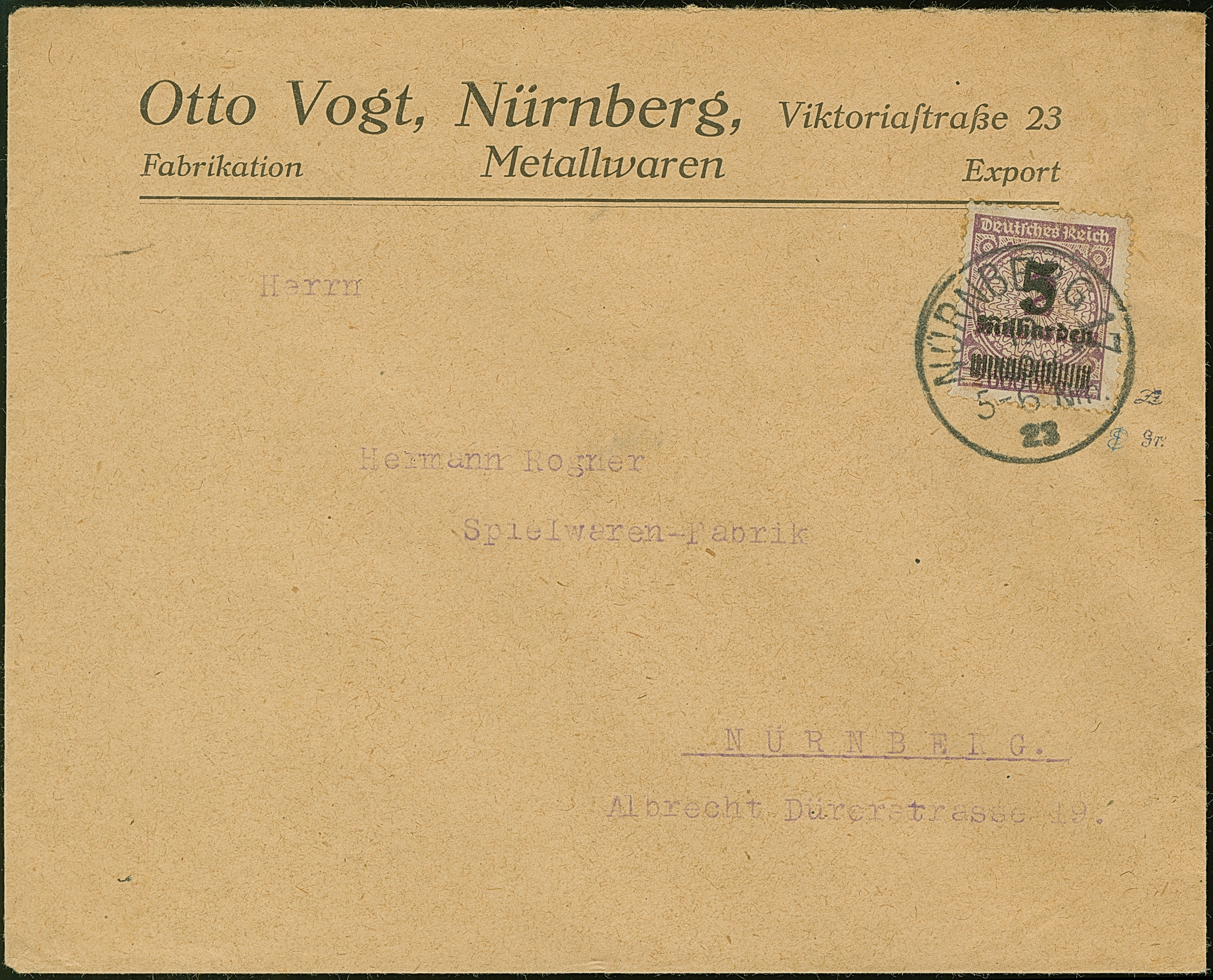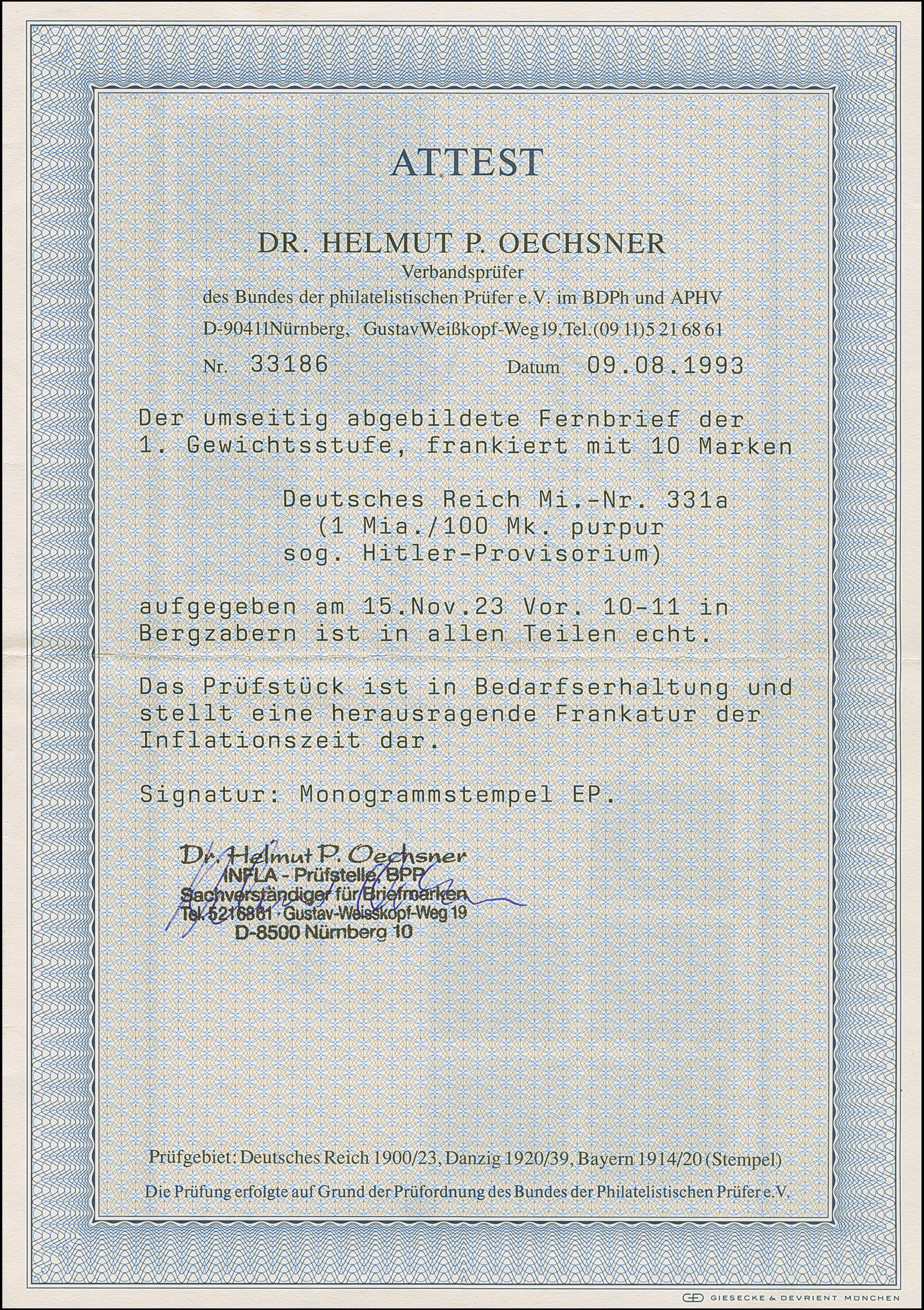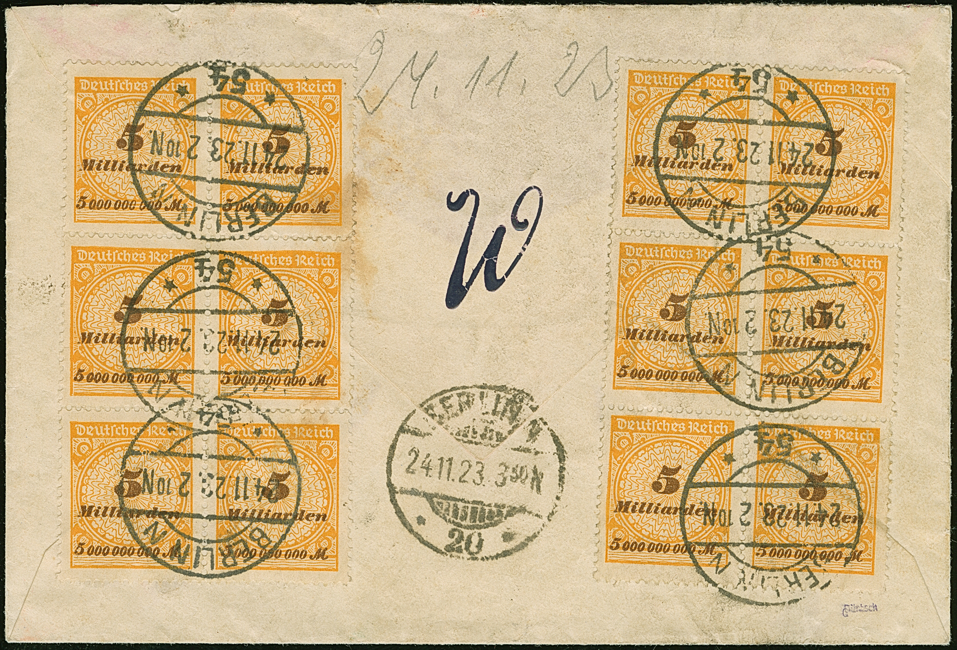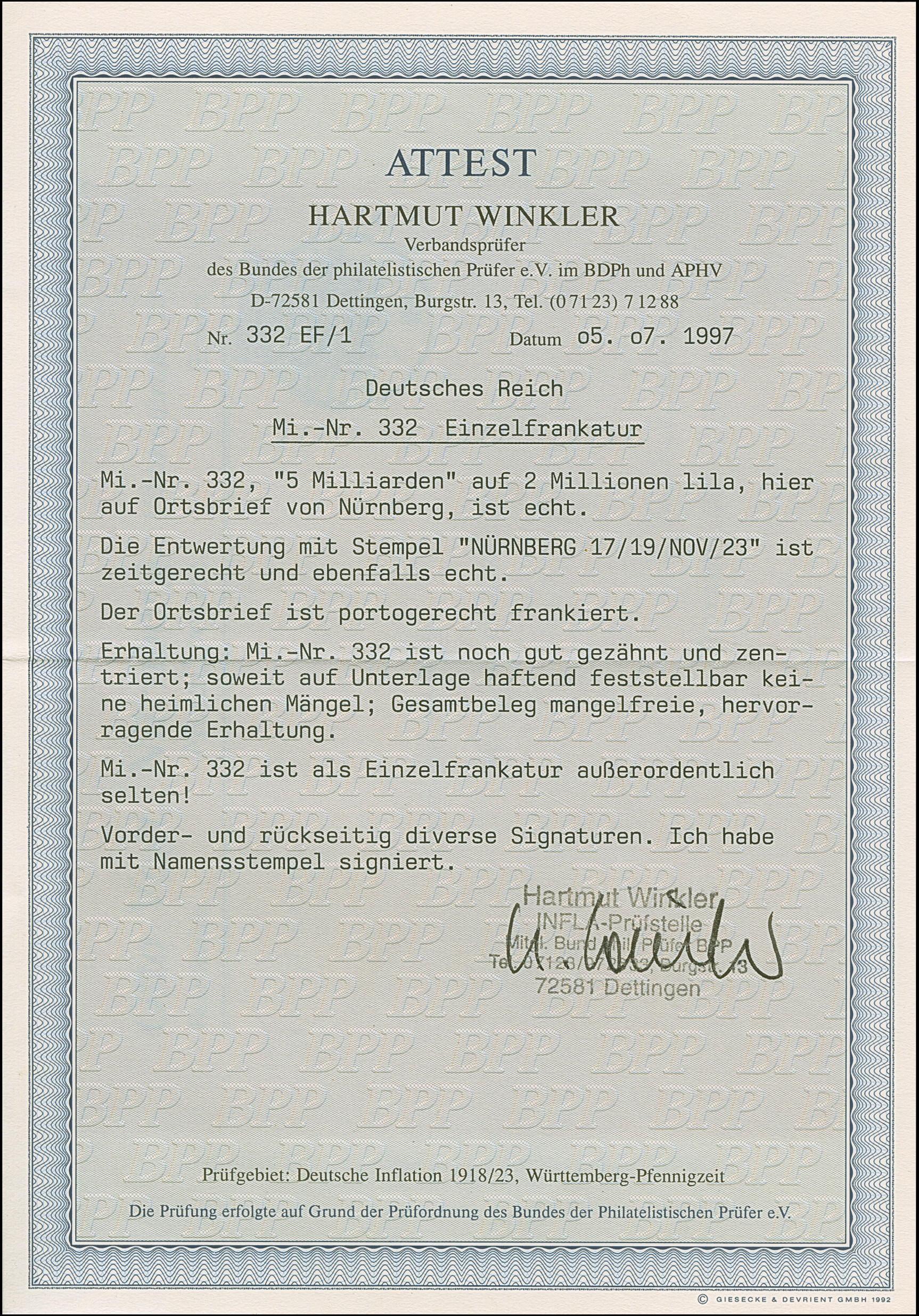 5 Mrd. auf 2 Mio. M. lila mit Stempel “NÜRNBERG 17 19.NOV.23” als tarifgerechte Einzelfrankatur auf Firmenvordruckbrief bis 20 g im Ortsverkehr. Die Marke ist üblich gezähnt, der Umschlag ist in einwandfreier Erhaltung. Eine außerordentlich seltene Einzelfrankatur vom letzten Tag der Portoperiode, signiert Infla Berlin mit drei Monogrammen und signiert Winkler BPP mit Fotoattest (1997)