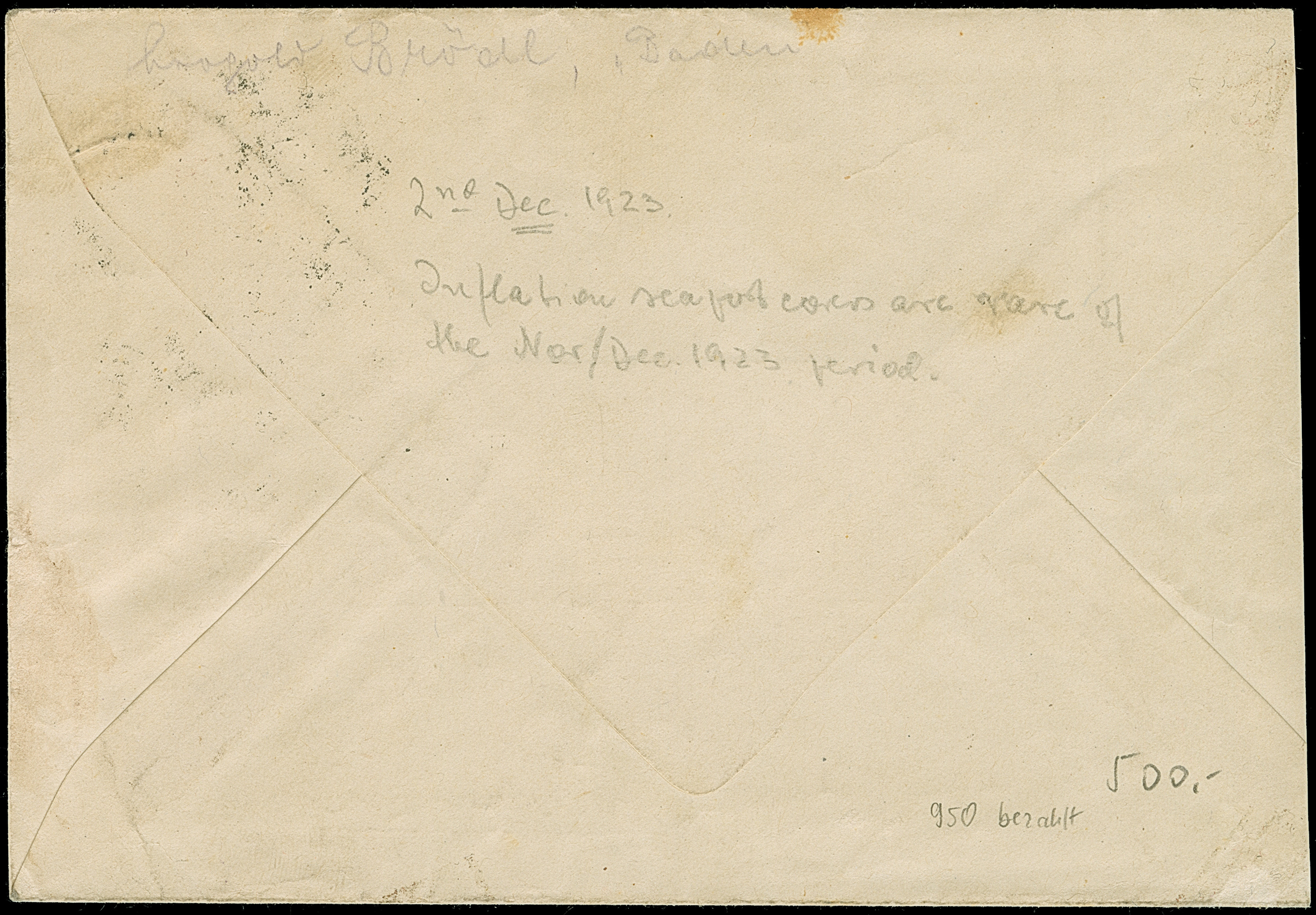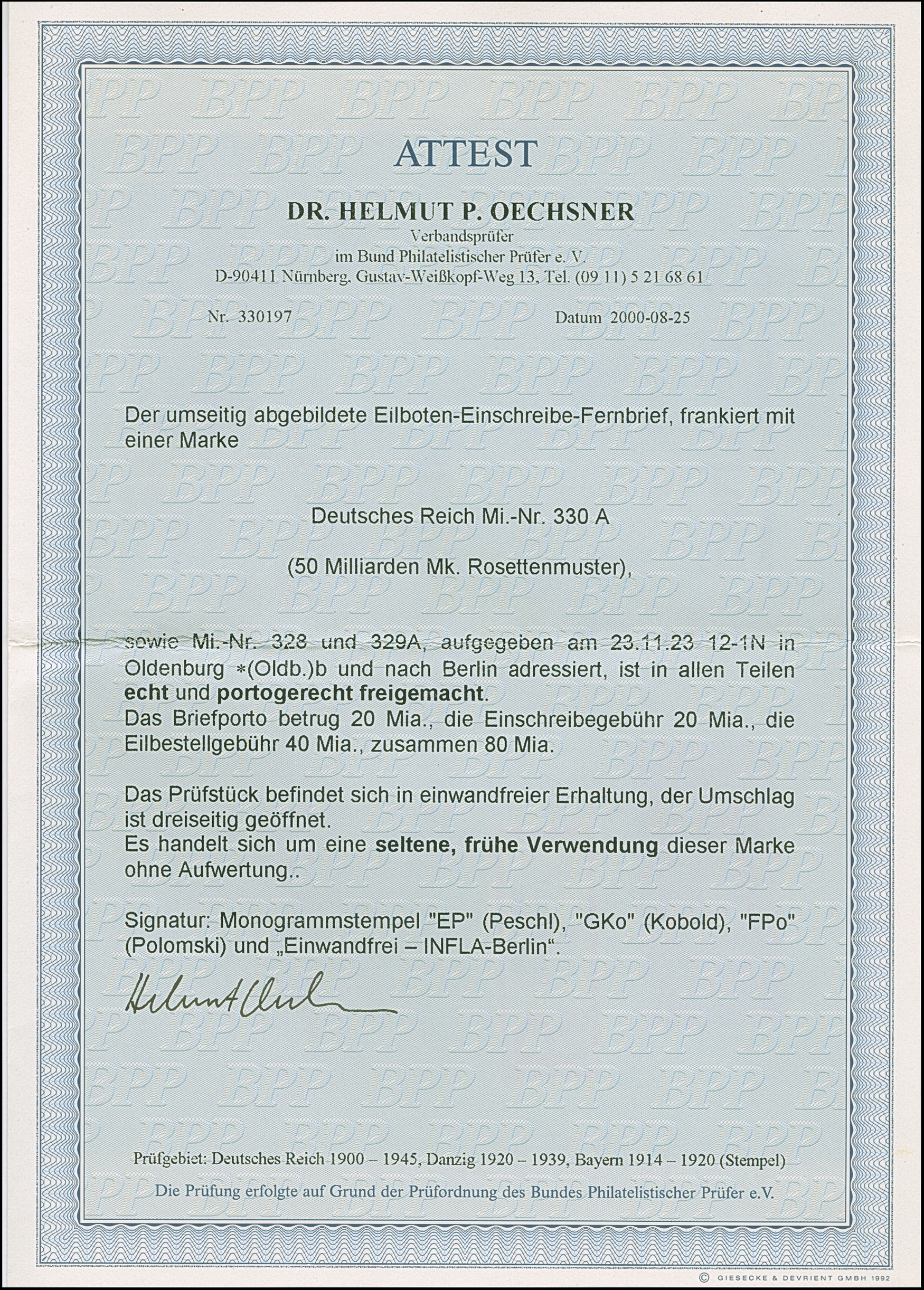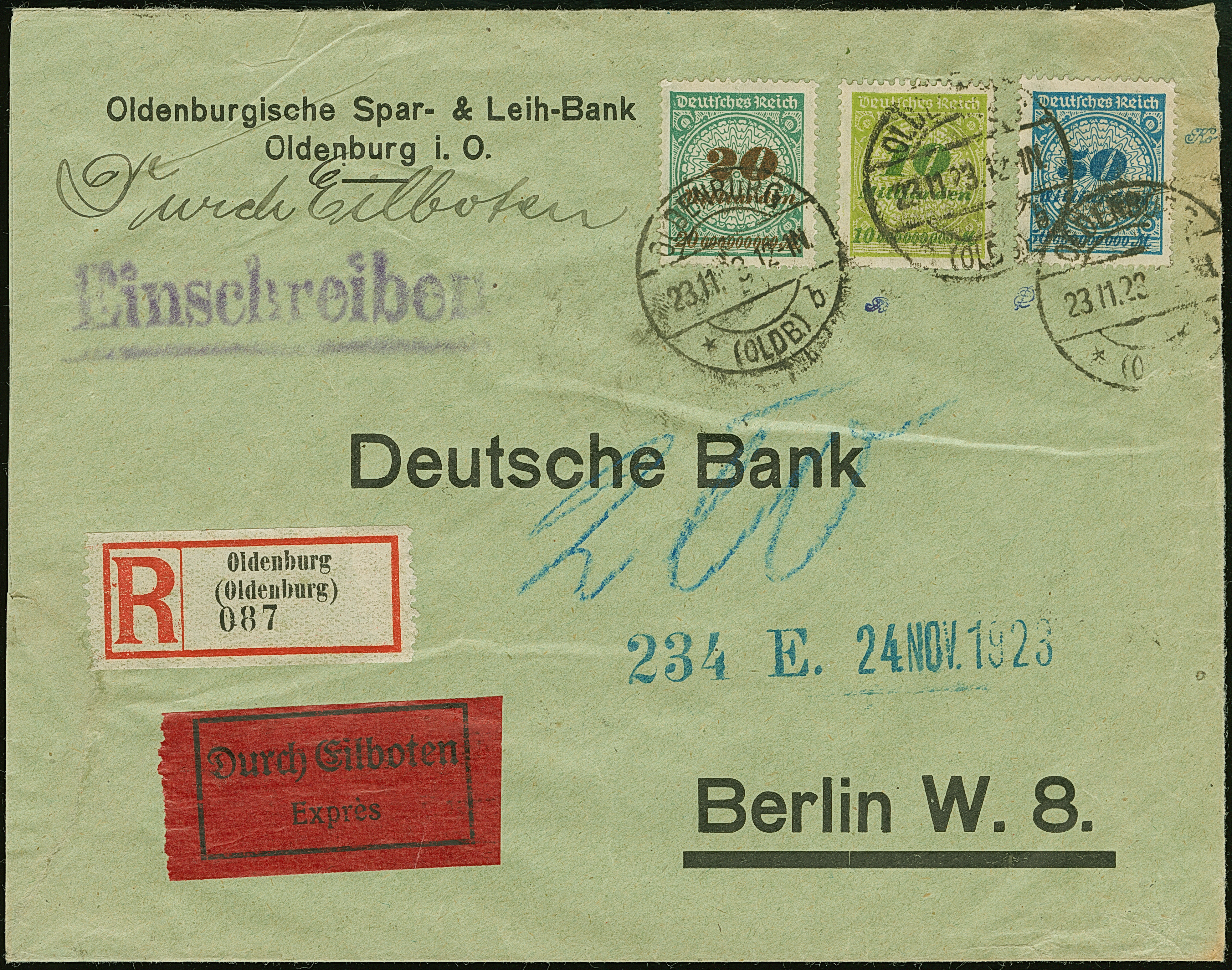 Korbdeckel 50 Mrd. M., 20 Mrd. M. und 10 Mrd. M. gezähnt je mit Stempel “OLDENBURG 23.11.23” als tarifgerechte Frankatur auf R-Eilboten-Bankenbrief nach Berlin mit Ankunftsstempel. Der Umschlag ist dreiseitig geöffnet und hat Beförderungsspuren, die Marken sind in einwandfreier Erhaltung. Eine dekorative und frühe Verwendung der 50 Mrd. M. gezähnt, sign. Infla Berlin mit zwei Monogrammen sowie Fotoattest Oechsner BPP (2000)