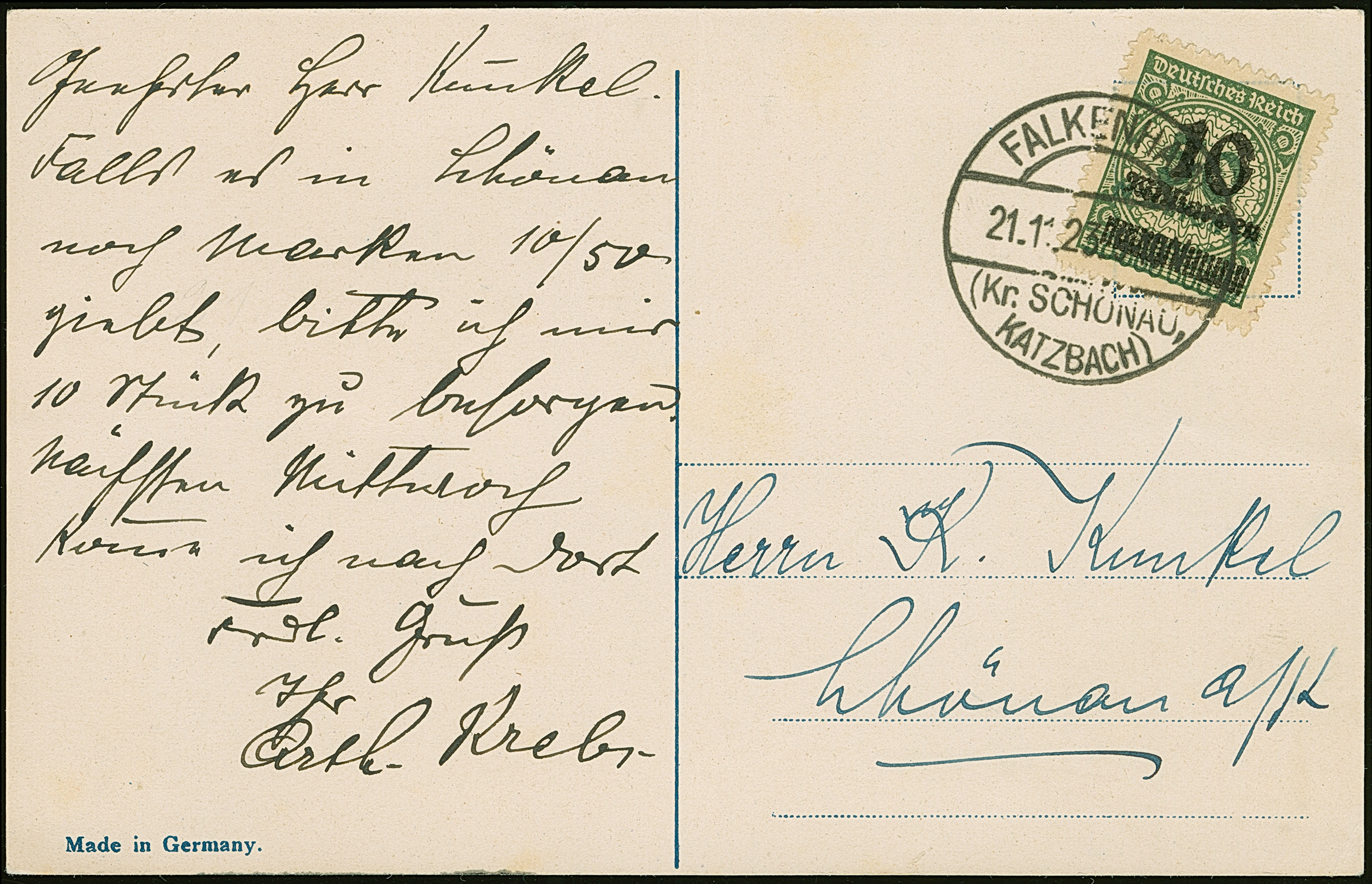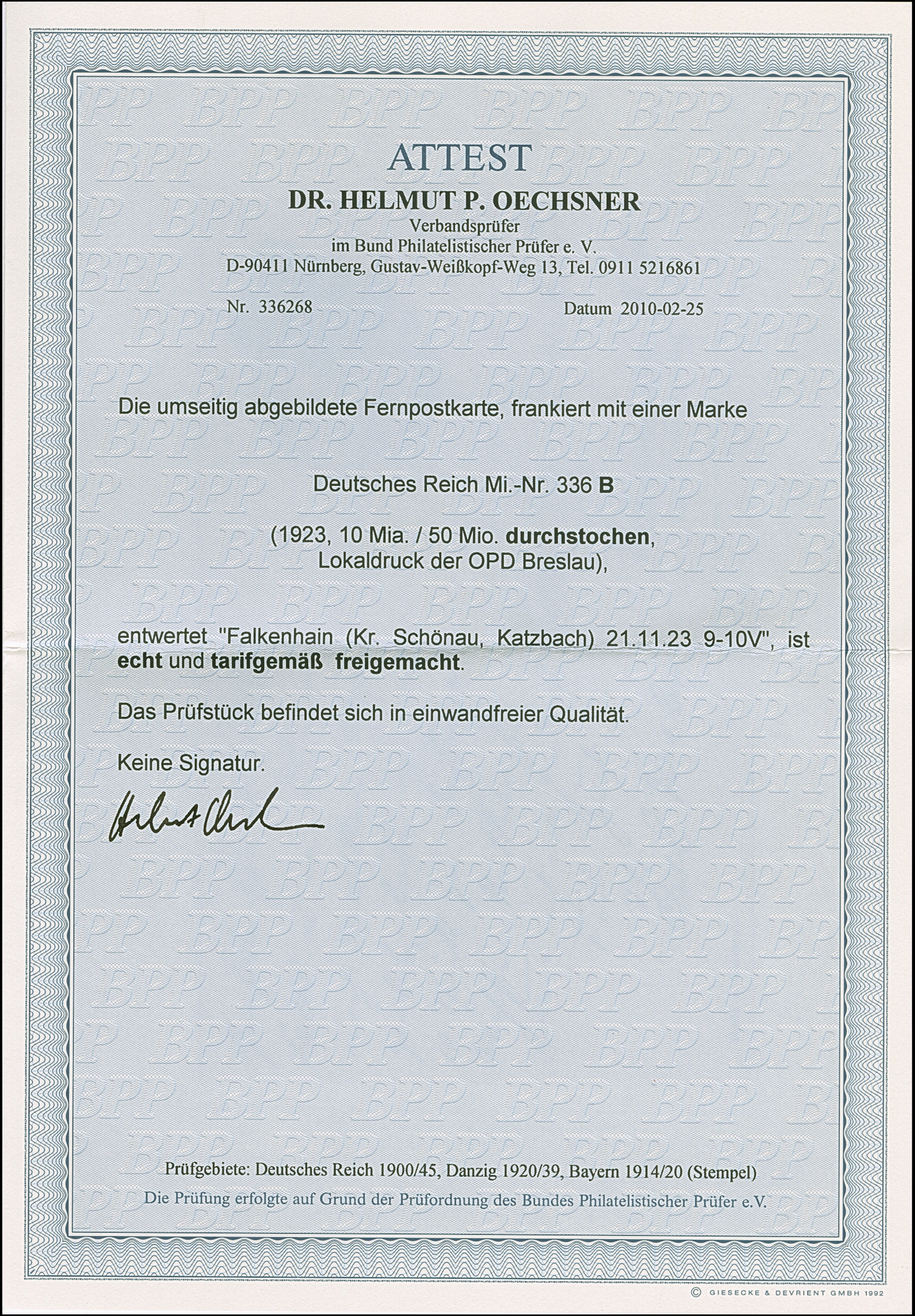 10 Mrd. auf 50 Mio. M. durchstochen mit Stempel “FALKENSTEIN (Kr. Schönau, Katzbach) 21.11.23” als tarifgerechte Einzelfrankatur auf Postkarte nach Schönau, in einwandfreier Erhaltung. Eine seltene Einzelfrankatur aus der OPD Breslau, Fotoattest Oechsner BPP (2010)