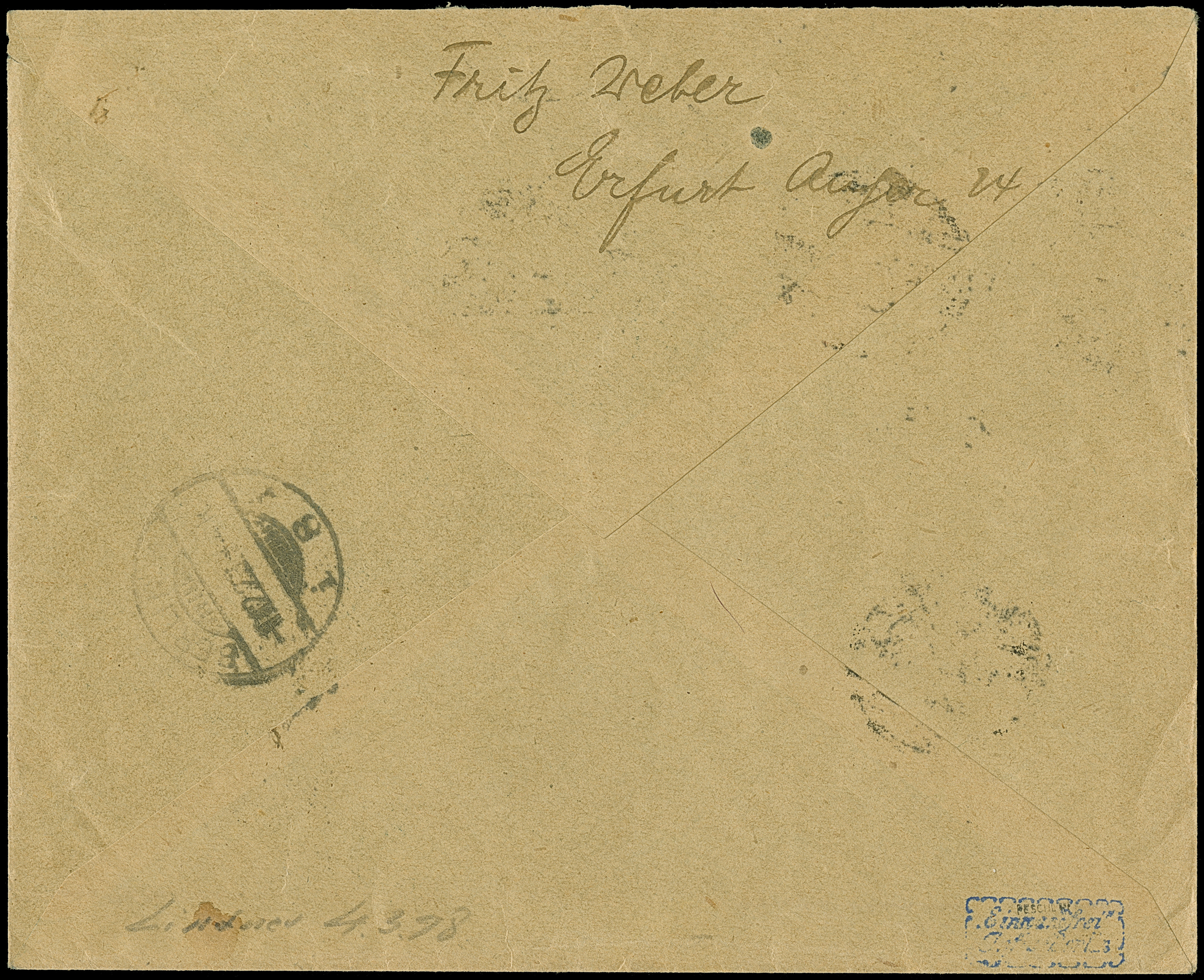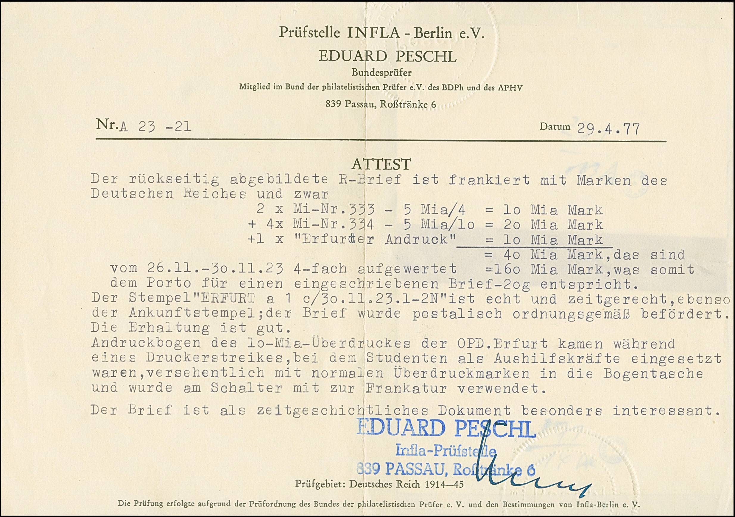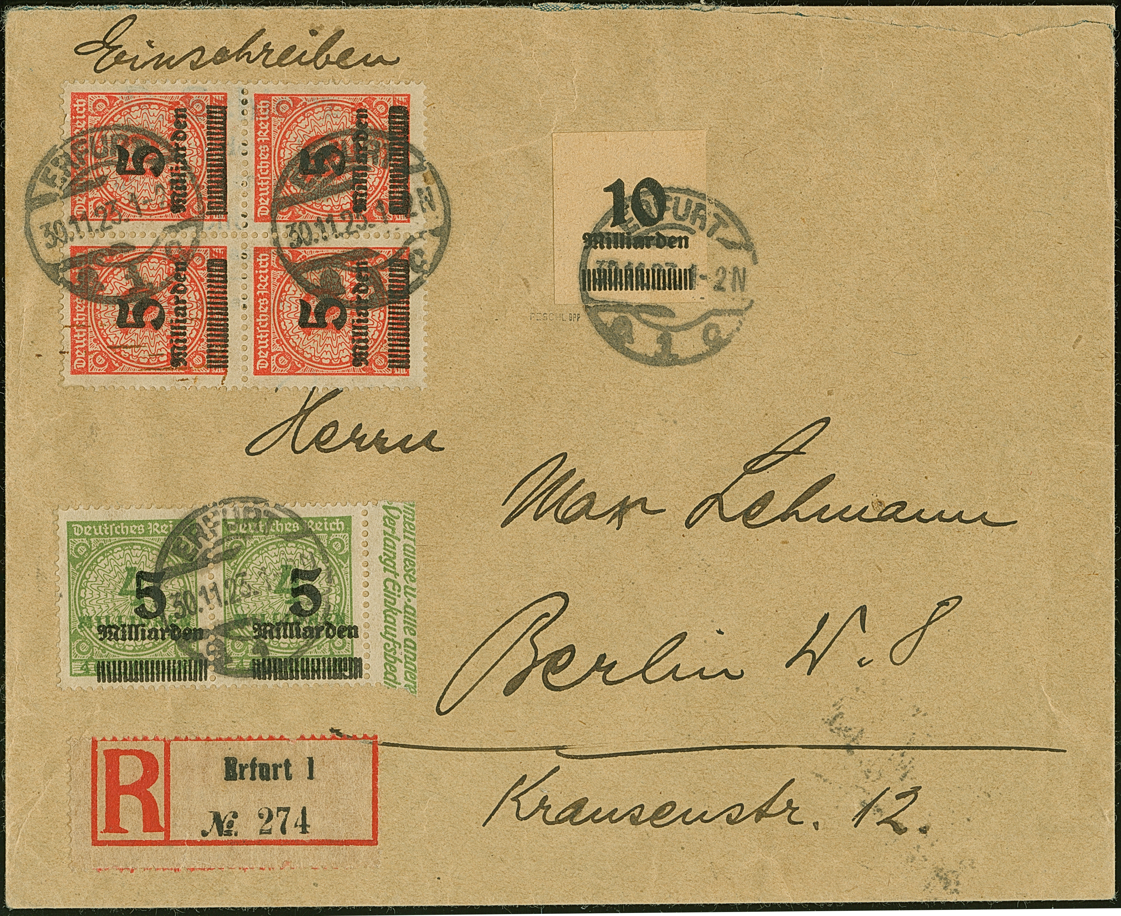 “Erfurter Andruck” 10 Mrd., waagerechtes Randpaar 5 Mrd. auf 4 Mio. M. und Viererblock 5 Mrd. auf 10 Mio. M. gezähnt je mit Stempel “ERFURT 30.11.23” als tarifgerechte Frankatur auf R-Brief nach Berlin mit Ankunftsstempel, in einwandfreier Erhaltung. Die Verwendung des “Erfurter Andrucks” auf Brief ist sehr selten, sign. Infla Berlin und Peschl BPP mit Fotoattest (1977)