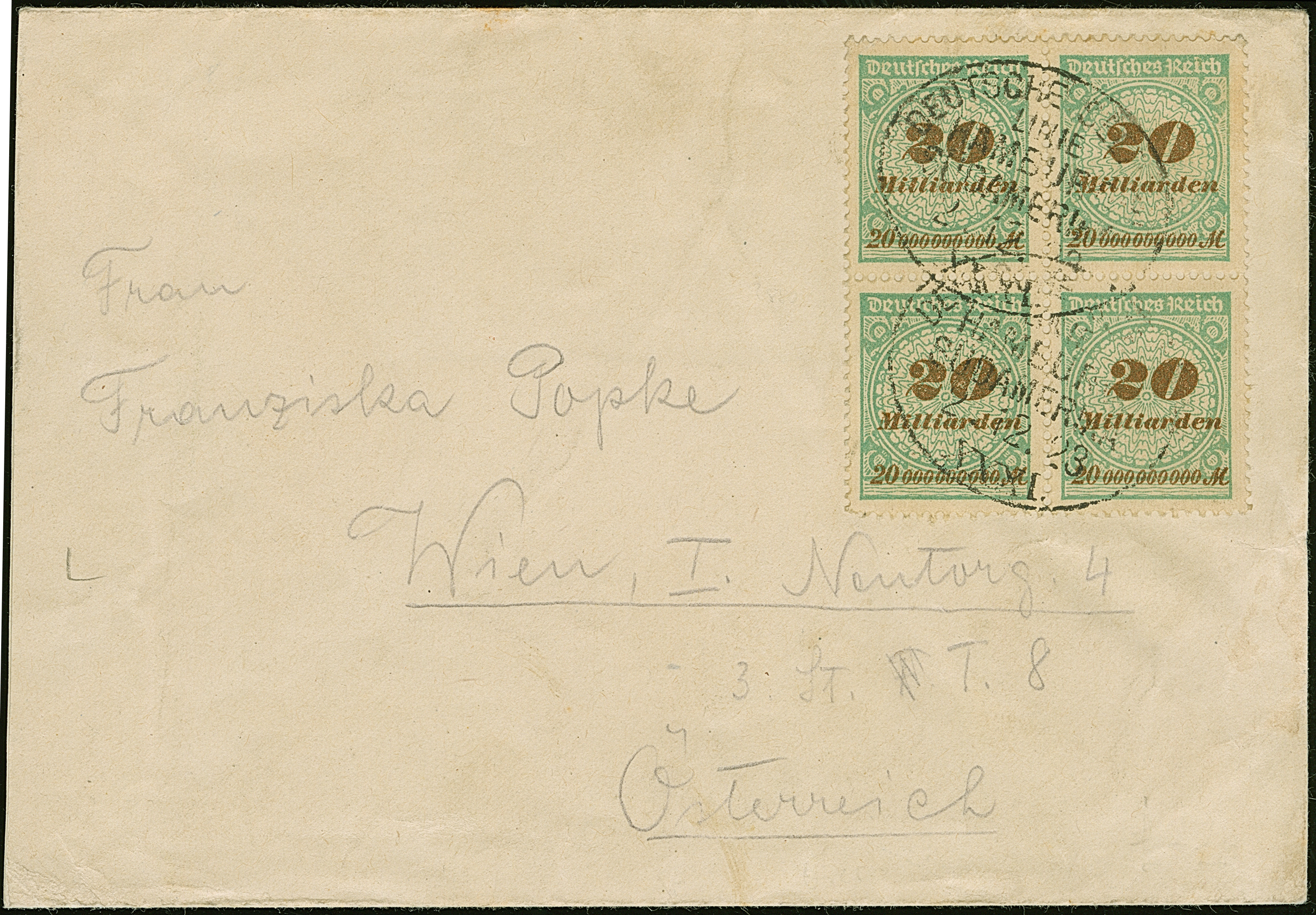 Korbdeckel 20 Mrd. M. gezähnt im Viererblock mit Schiffspost-Stempel “DSP LINIE HAMBURG-SÜDAMERIKA XXXI 2.12.23” auf Brief im Wechselverkehr nach Wien. Noch zum alten November-Tarif tarifgerecht freigemacht. Eine seltene Verwendung im Dezember 1923, der Umschlag mit Beförderungsspuren und Patina