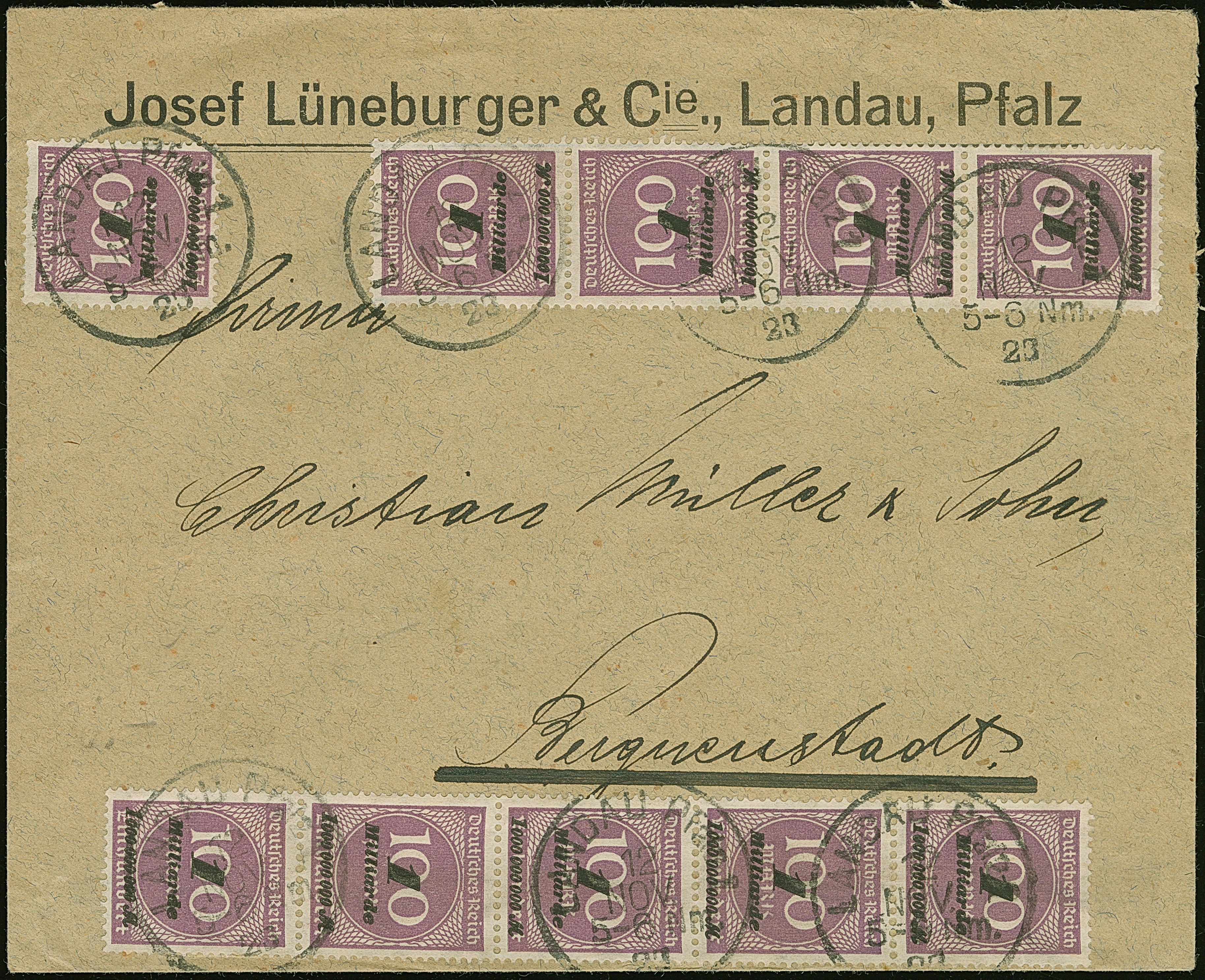 1 Mrd. auf 100 M. grauviolett im senkrechten 5er- und 4er-Streifen sowie Einzelmarke je mit Stempel “LANDAU 12.NOV.23” als tarifgerechte Mehrfachfrankatur auf Firmenvordruckbrief bis 20 g nach Burgneustadt, in einwandfreier Erhaltung. Interessante Mehrfachfrankatur vom Ersttag der neuen Portoperiode