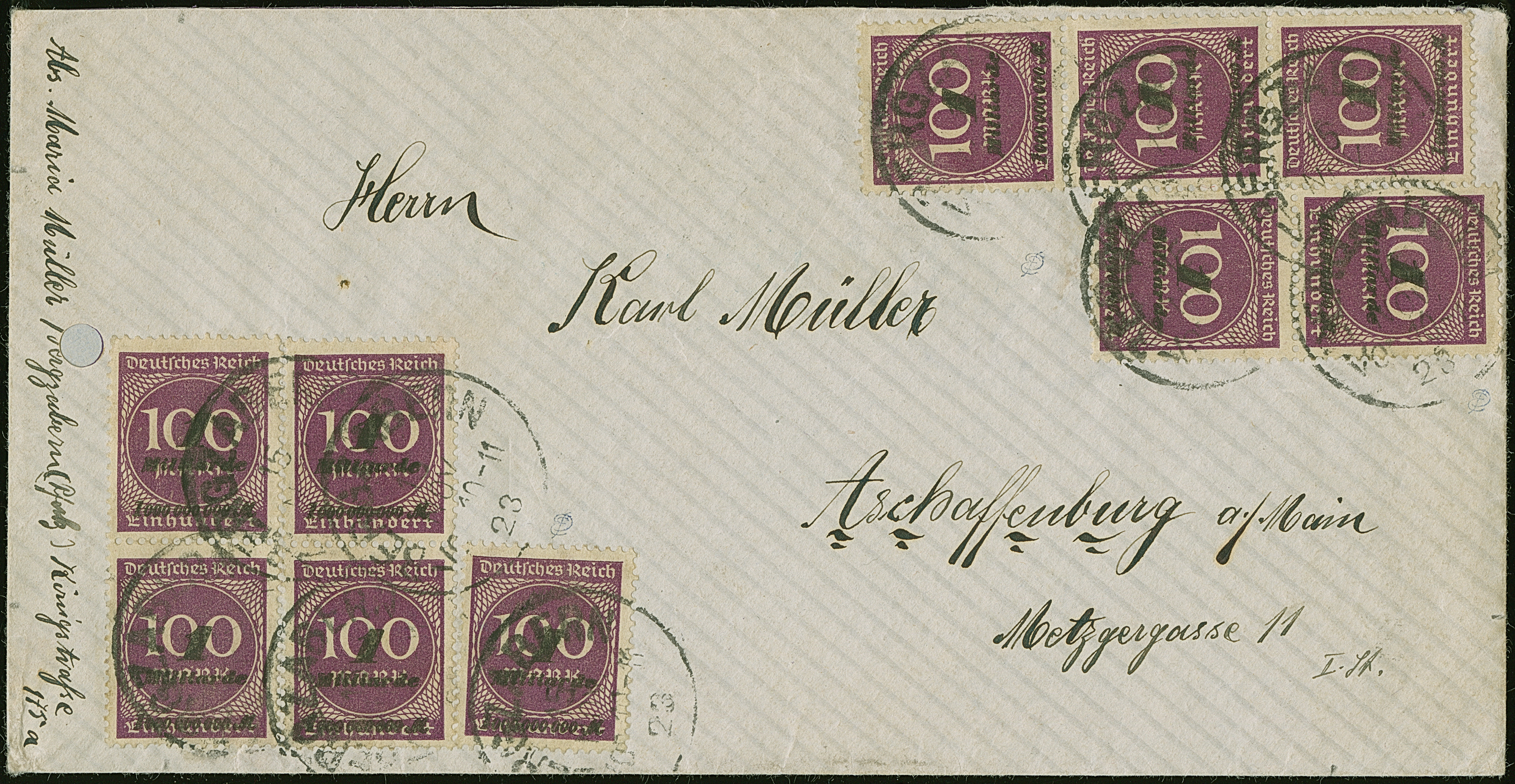 1 Mrd. auf 100 M. violettpurpur im Viererblock, senkrechten Dreierstreifen und Paar sowie Einzelmarke je mit Stempel “BERGZABERN 15.NOV.23” als tarifgerechte Mehrfachfrankatur auf Brief bis 20 g nach Aschaffenburg. Der Umschlag links mit einer Aktenlochung und zwei Marken mit verkürztem Eckzahn bzw. Eckzahnbug außerhalb des Markenbildes, ansonsten in einwandfreier Erhaltung. Bei dieser außergewöhnlichen Mehrfachfrankatur ohne Bedeutung, bisher sind nur ganz wenige Mehrfachfrankaturen mit dieser seltenen Farbe bekannt, eine der großen Seltenheiten der Inflation, Fotoattest Oechsner BPP (1993)