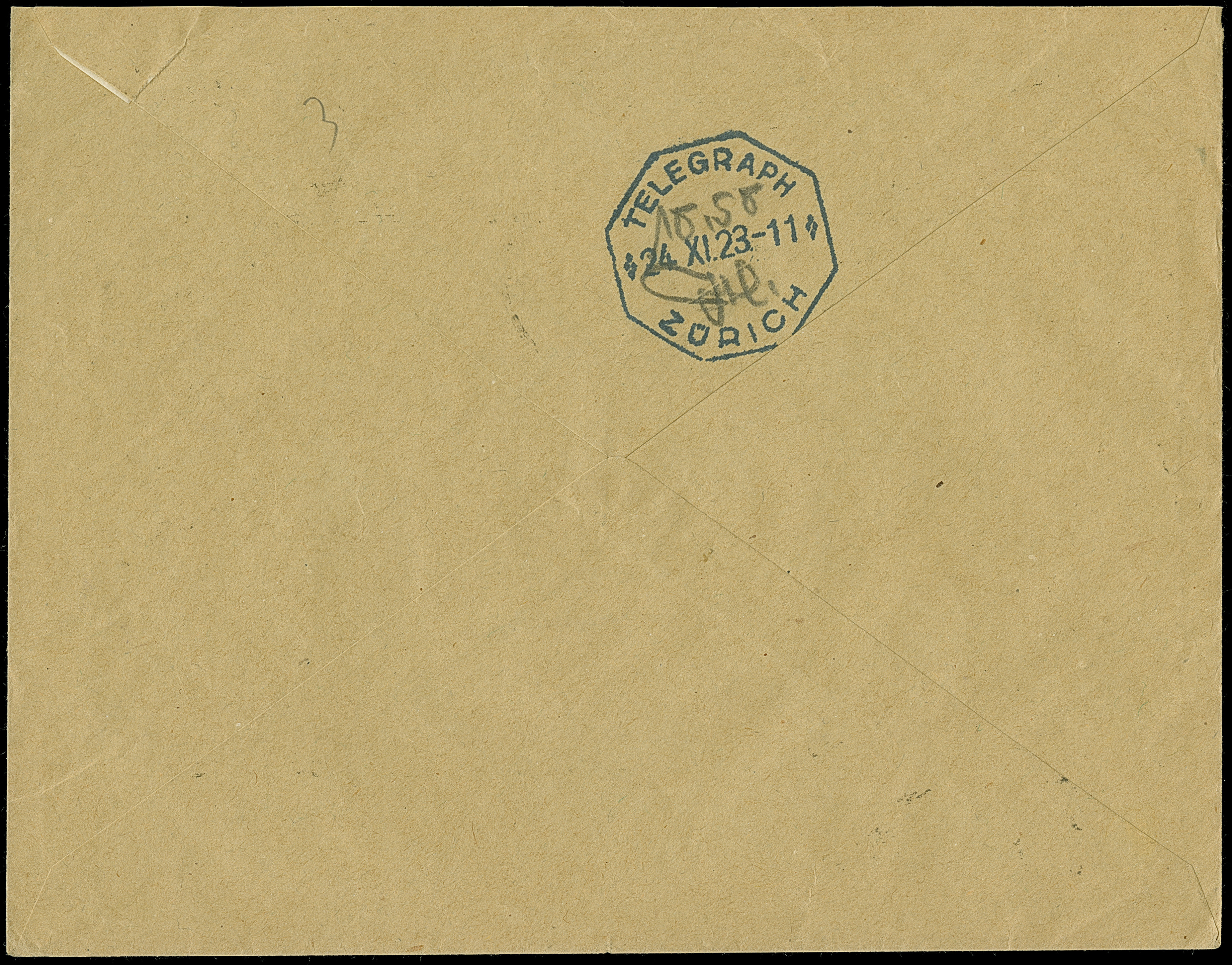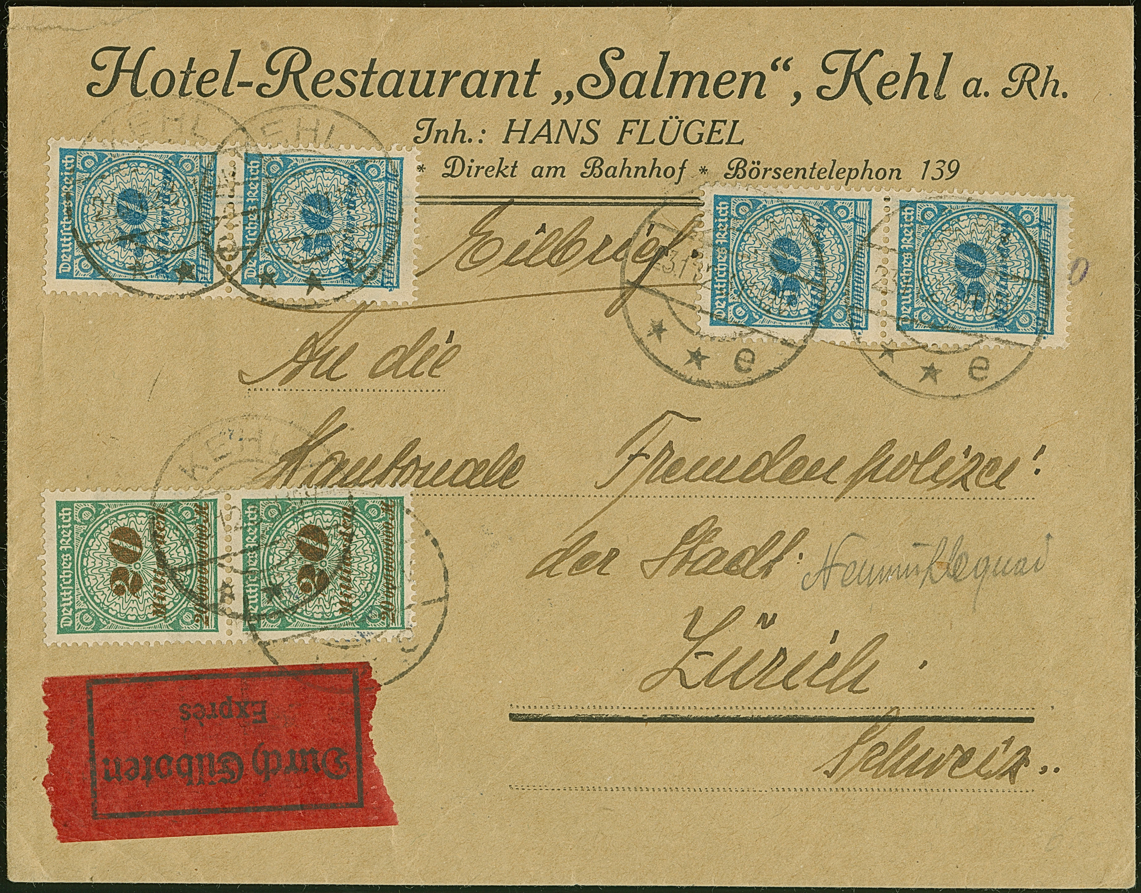 Korbdeckel 50 Mrd. M. gezähnt, zwei senkrechte Paare und senkrechtes Paar 20 Mrd. M. gezähnt je mit Stempel “KEHL 23.11.23” als tarifgerechte Frankatur auf Eilboten-Brief  bis 20 g nach Zürich mit Ankunftsstempel “TELEGRAPH ZÜRICH 24.XI.23”. Der Firmenvordruckbrief und die Marken sind in einwandfreier Erhaltung. Eine dekorative und sehr frühe Verwendung der 50 Mrd. M. gezähnt, in Verbindung mit der Portostufe sehr selten