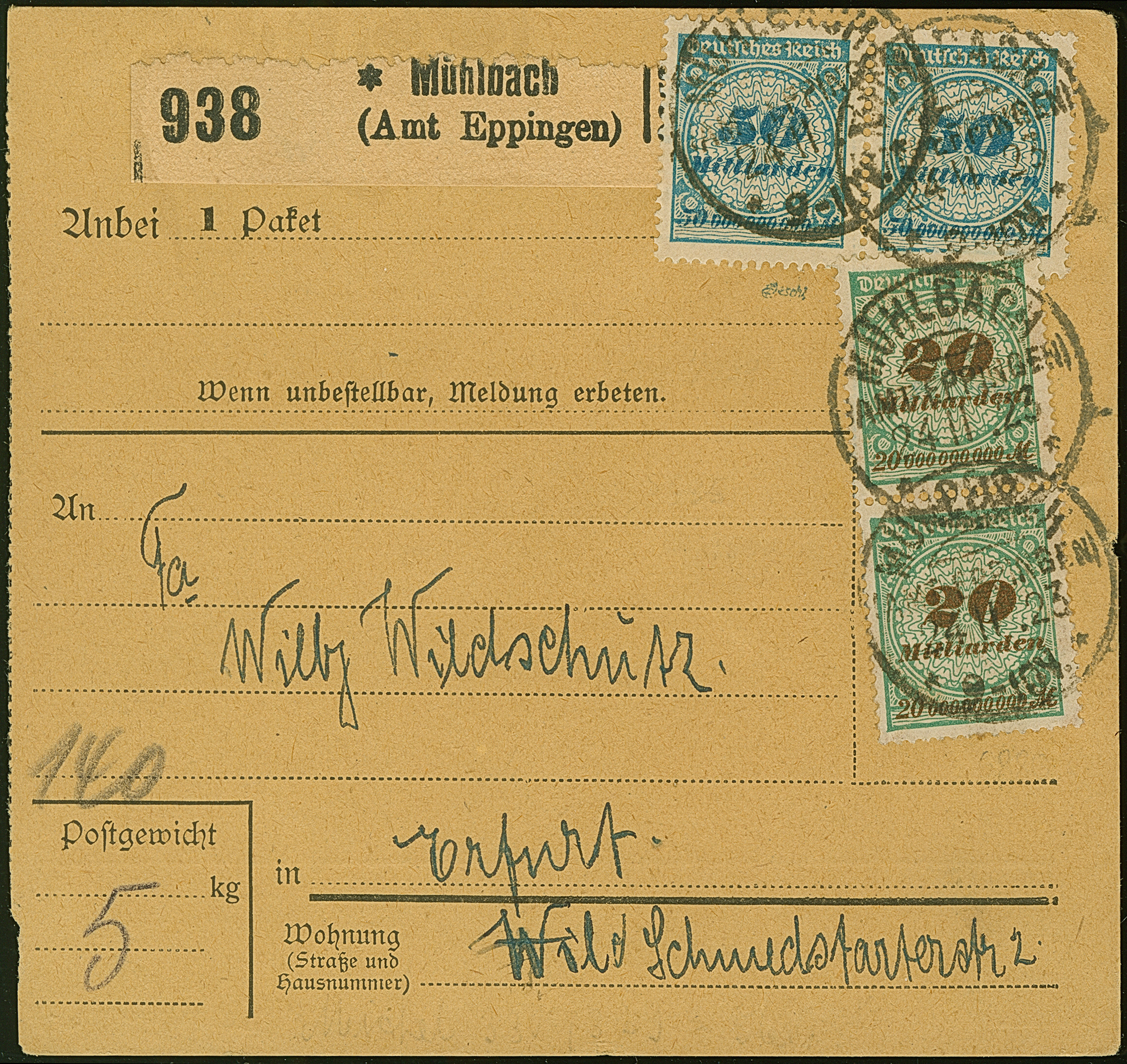 Korbdeckel 50 Mrd. M. gezähnt im waagerechten Paar und senkrechtes Paar 20 Mrd. M. gezähnt je mit Stempel “MÜHLBACH 24.11.23” als tarifgerechte Frankatur auf Paketkarte für ein 5 kg schweres Paket nach Erfurt. Die Paketkarte und die Marken sind in einwandfreier Erhaltung. Eine interessante und frühe Verwendung der 50 Mrd. M., sign. Infla Berlin und Peschl