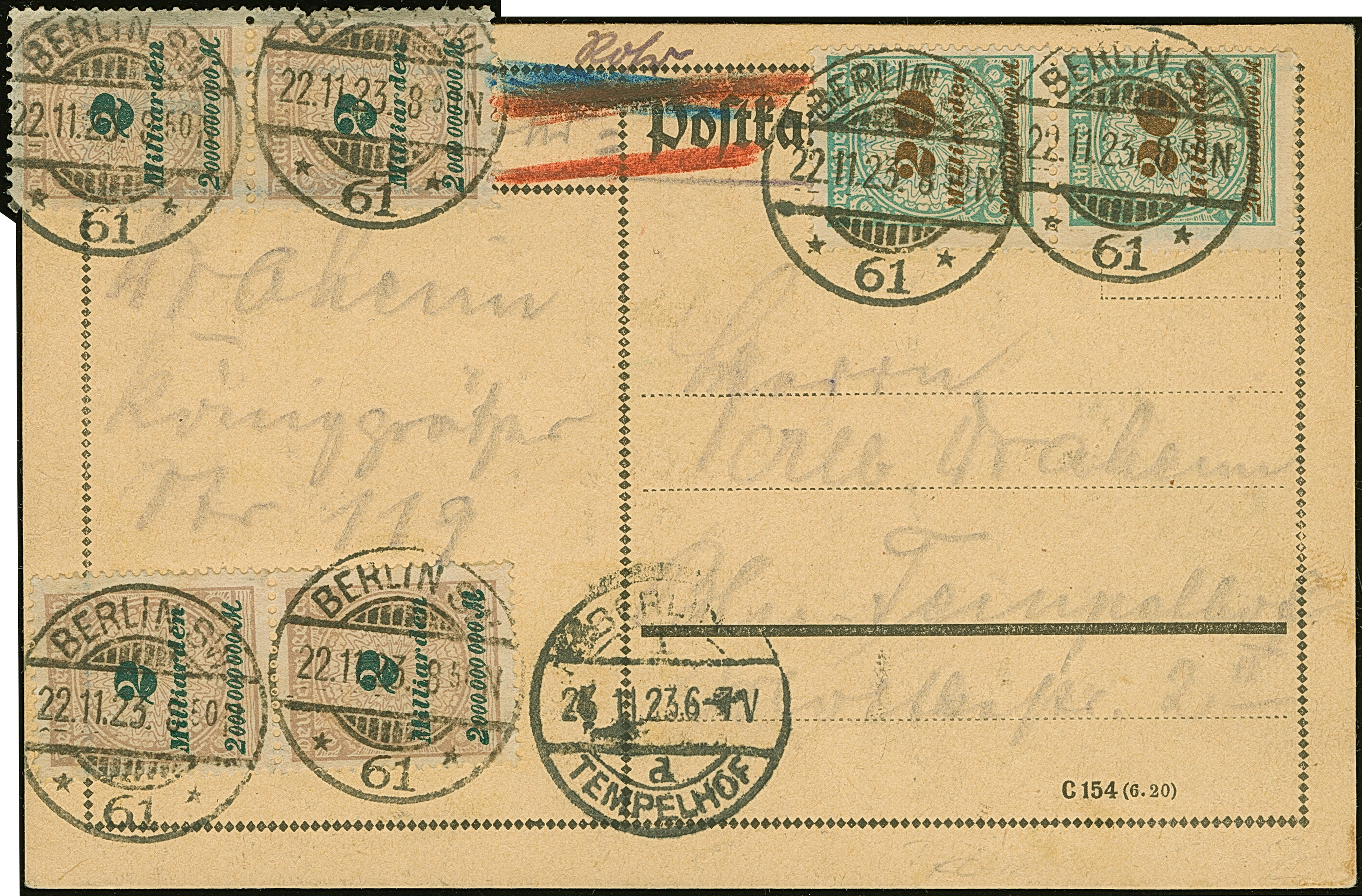 Korbdeckel 20 Mrd. gezähnt im senkrechten Paar und zwei senkrechte Paare 2 Mrd. M. gezähnt je mit Rohrpost-Stempel “BERLIN SW61 22.11.23. 8.50” als tarifgerechte Frankatur auf Rohrpostkarte nach Berlin-Tempelhof mit vorderseitigem Ankunftsstempel. Zwei Marken durch Randklebung mit Zahnfehlern, ansonsten in guter Erhaltung. Eine seltene Verwendung aus der Hochinflation, der 48 Milliarden-Tarif war nur 6 Tage möglich