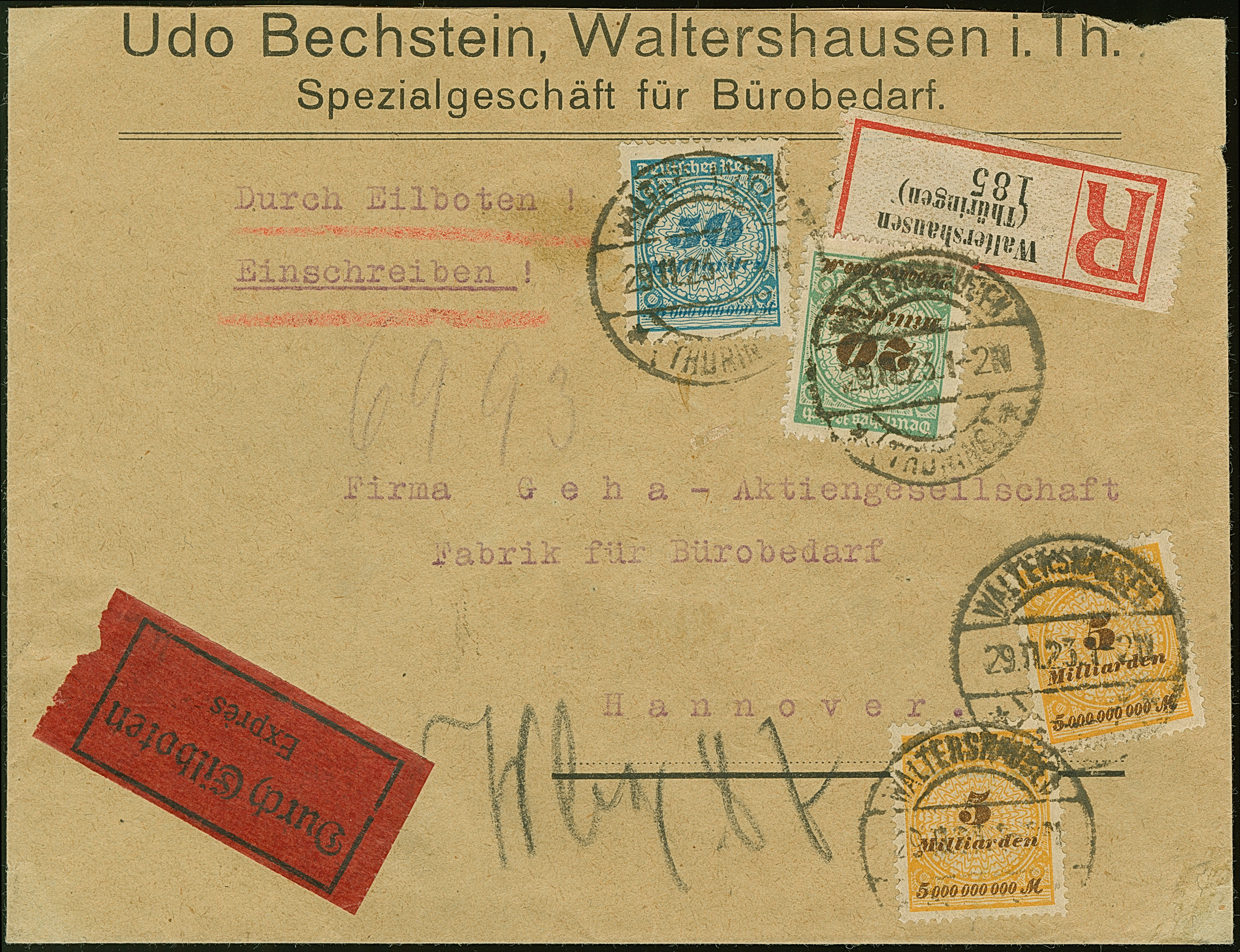 Korbdeckel 50 Mrd. M. gezähnt, 20 Mrd. M. durchstochen und zwei Einzelmarken 5 Mrd. M. gezähnt je mit Stempel “WALTERSHAUSEN 29.11.23” als tarifgerechte Frankatur auf R-Eilboten-Brief bis 20 g nach Hannover mit Ankunftsstempel. Der Umschlag ist oben leicht verkürzt, die Marken sind in einwandfreier Erhaltung, ein schöner Brief aus dem Bedarf. Interessante Verwendung der 50 Mrd.-Marke aus der letzten November-Portoperiode