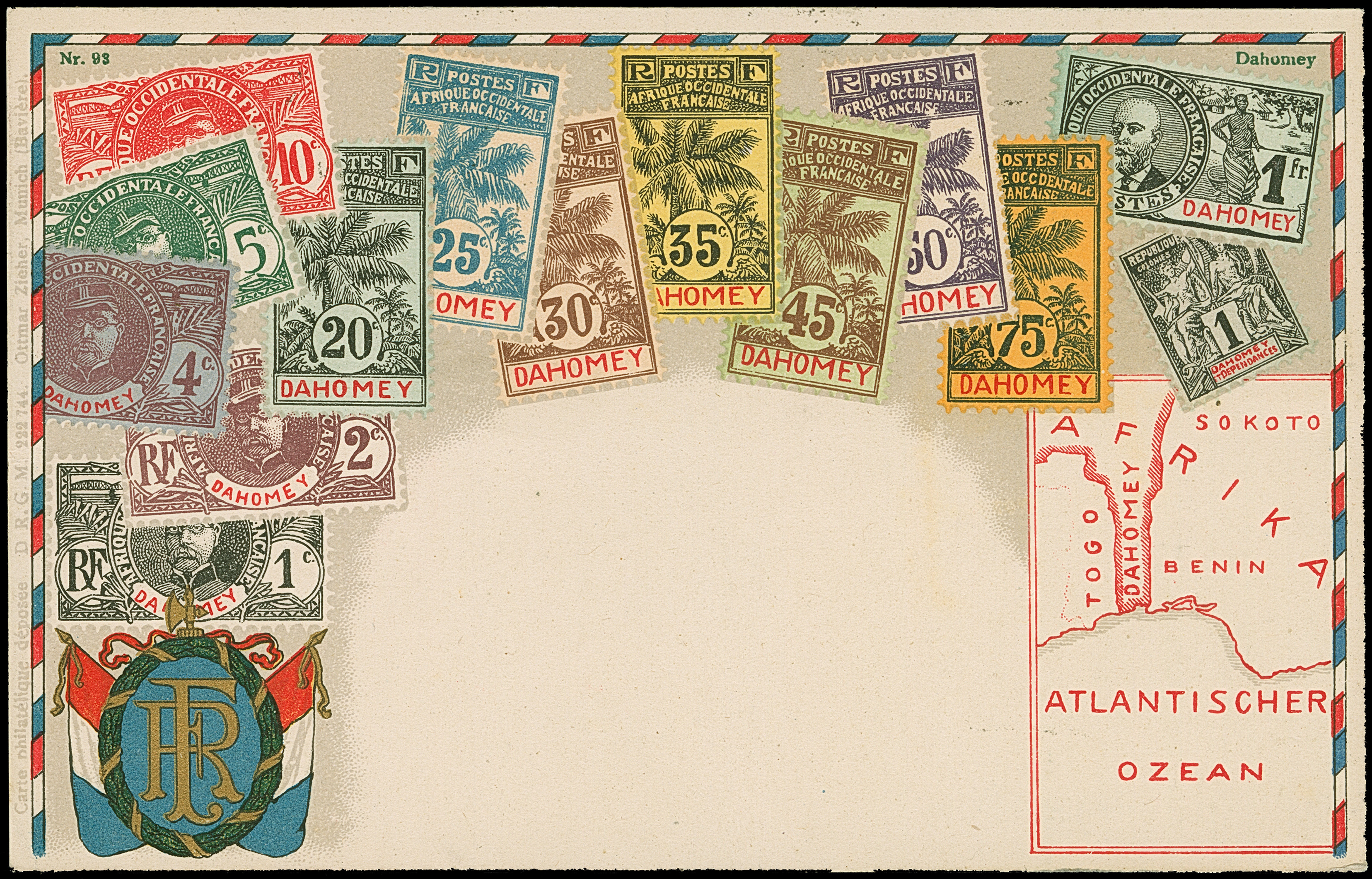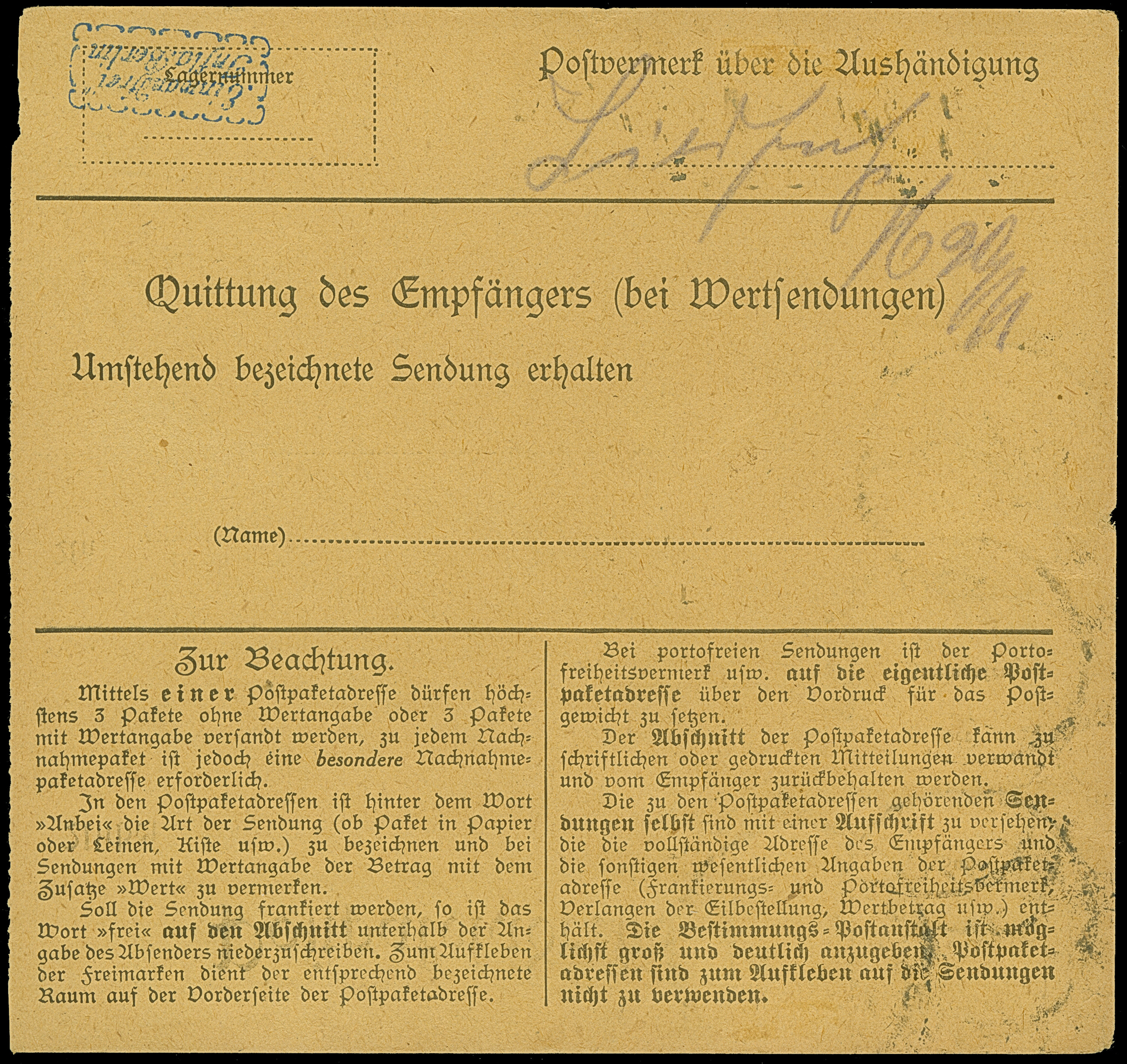 “DSP LINIE HAMBURG-WESTAFRIKA XX. 12.4.21” (D. Baltika) sehr klar auf zwei Einzelmarken Germania 30 Pfg. blau auf Schiffspostkarte mit Text und Aufgabestempel “WALVISBAY 12.APR.21” nach Erfurt, ein Nachgebühren-Vermerk wurde wieder gestrichen, in guter Erhaltung