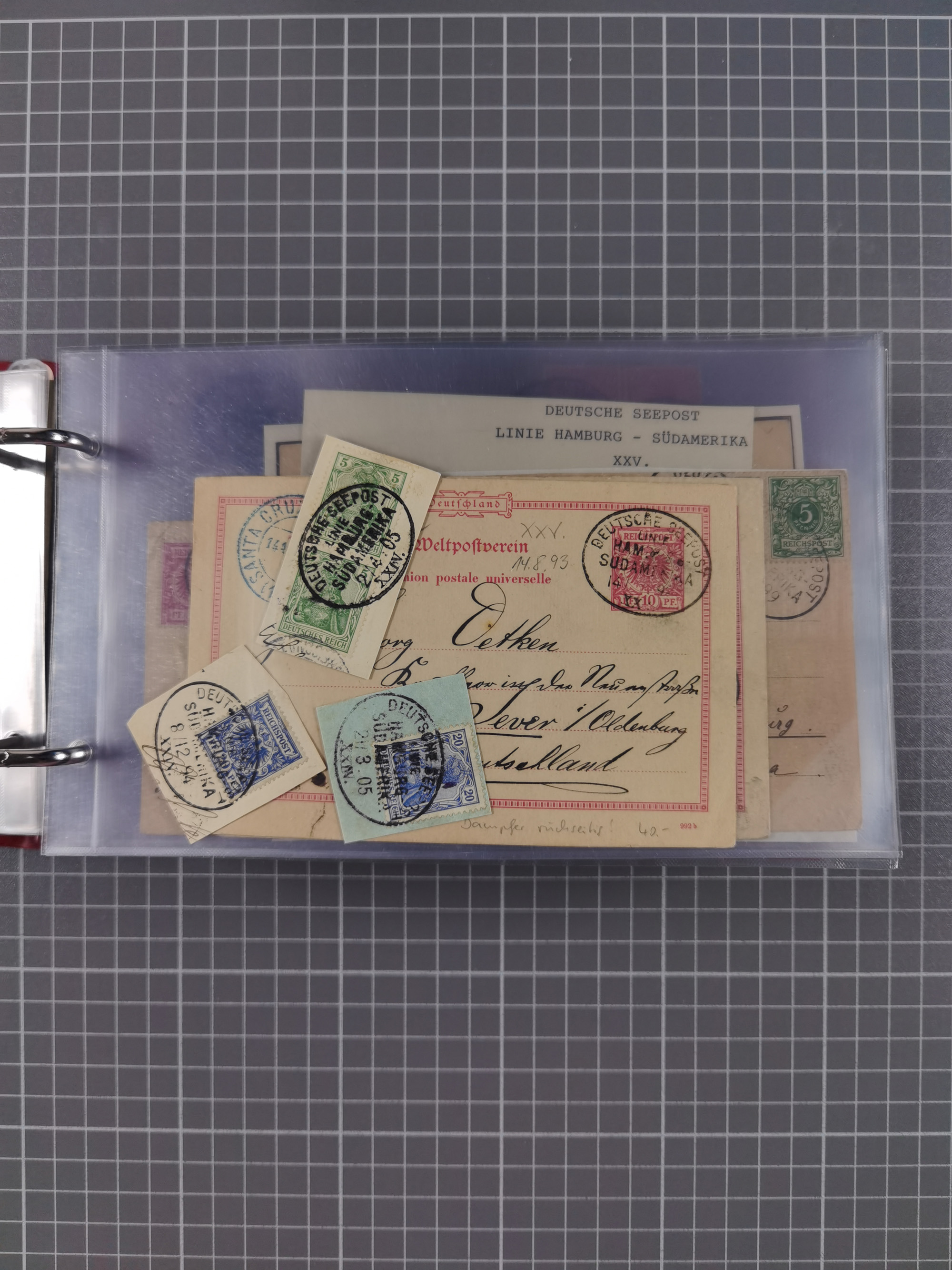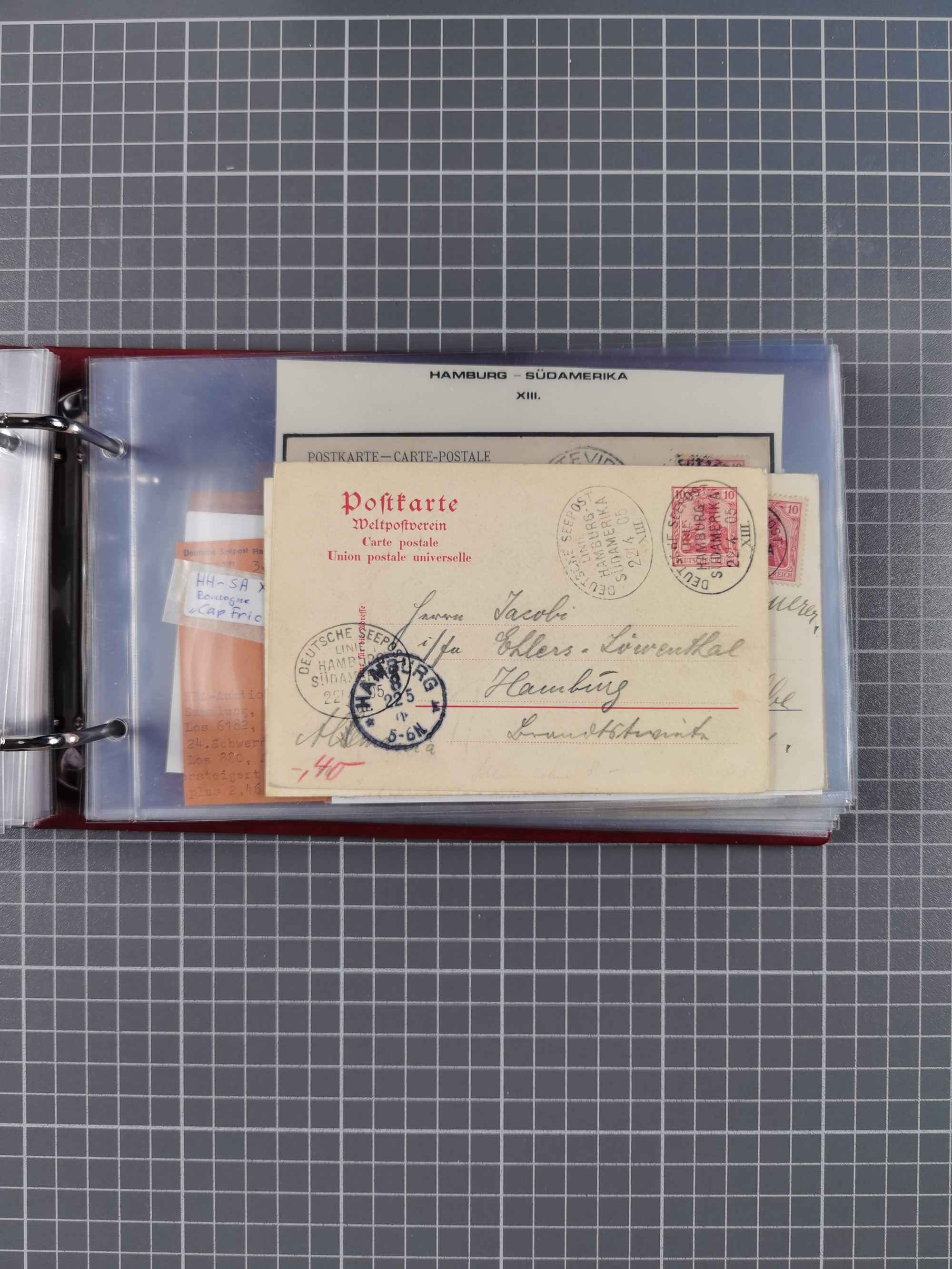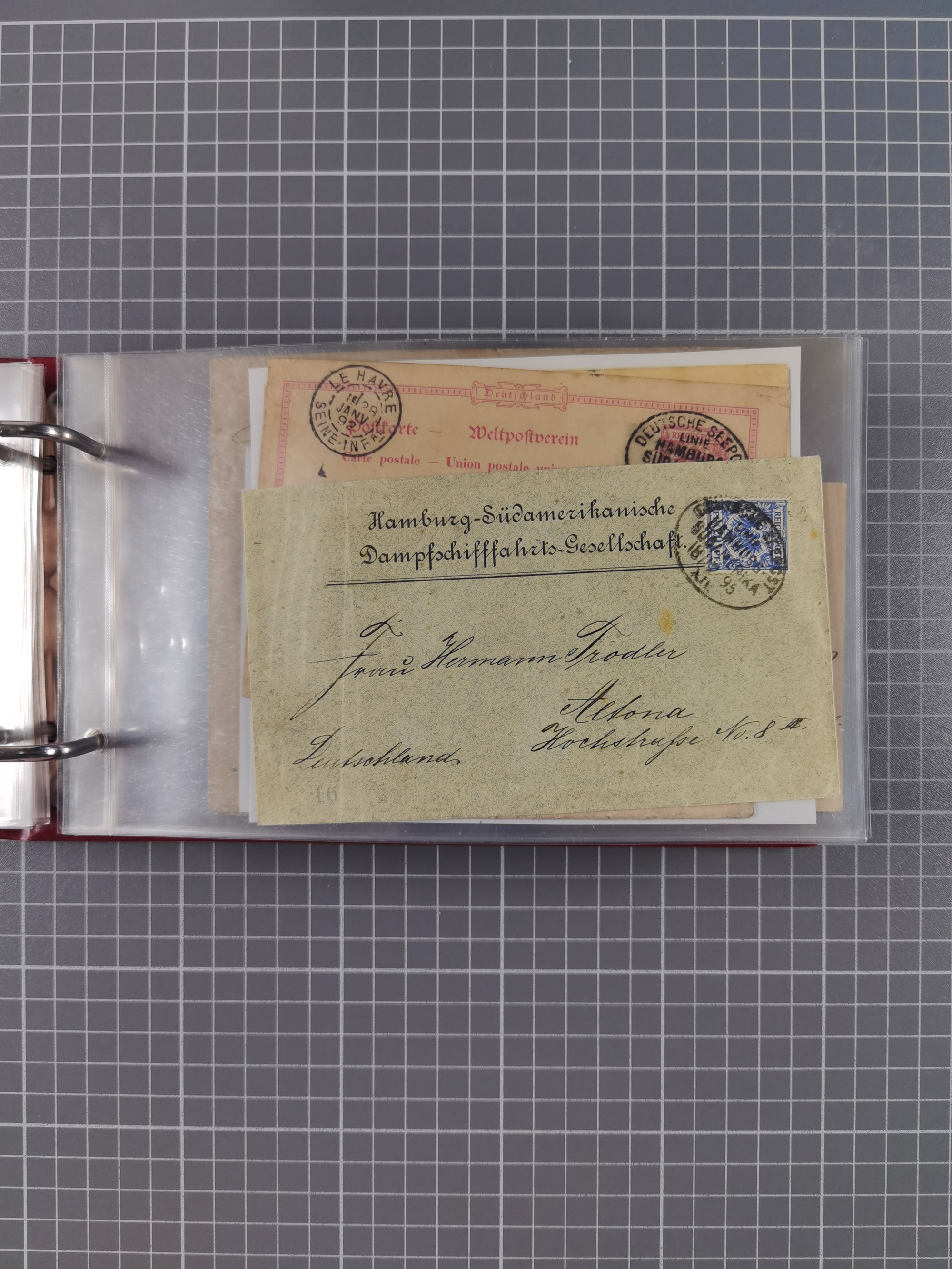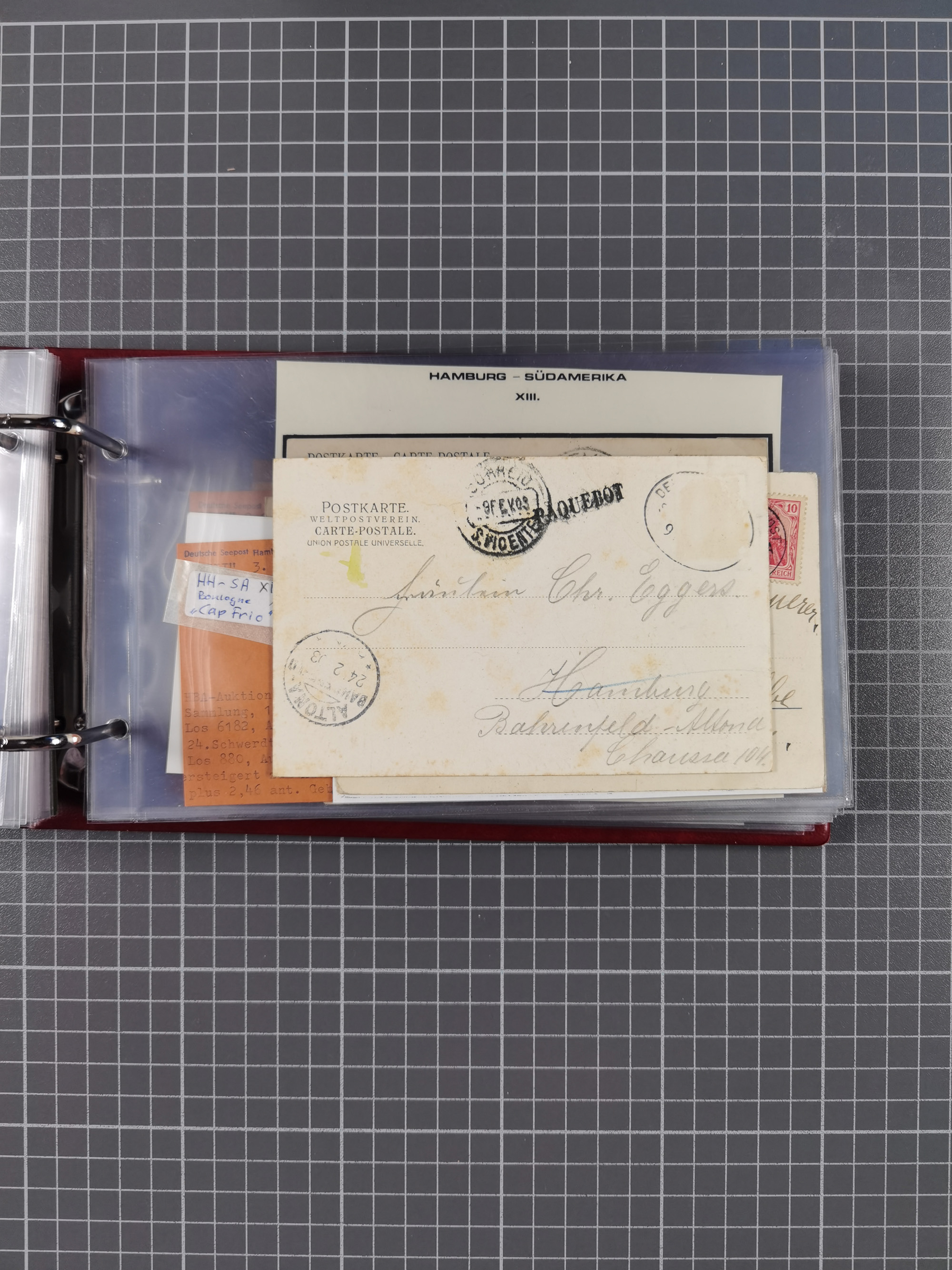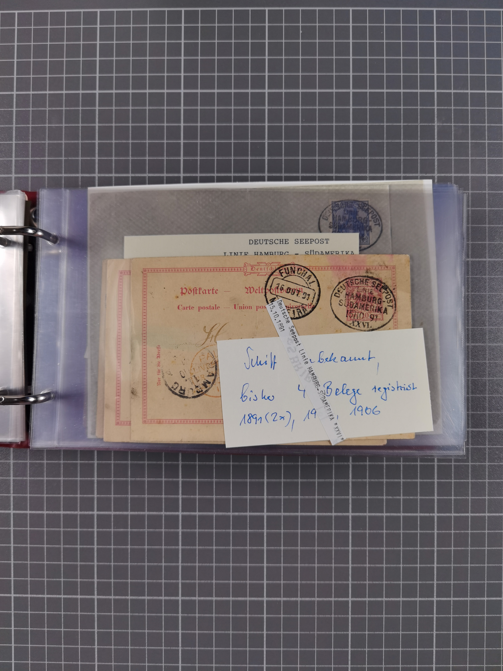 1891/1935 (ca.), umfangreiche Sammlung “DSP LINIE HAMBURG-SÜDAMERIKA I-LV” mit ca. 470 Briefen, Karten und GSK sowie wenigen Briefstücken mit Schwerpunkt vor 1914, dabei einige Belege mit “Paquebot”-Stempeln, Destinationen (u.a. 1895 nach Konstantinopel und GSK 1898 via Rottedam nach Jaluit), Bedarfspost aus der Infla-Zeit, Ozean-Brief 1913 und R-Ozean-Brief 1926. Die Erhaltung ist zum Teil etwas fehlerhaft, dafür fast nur klare Stempel, meist Bedarfspost, ex Steinmeyer