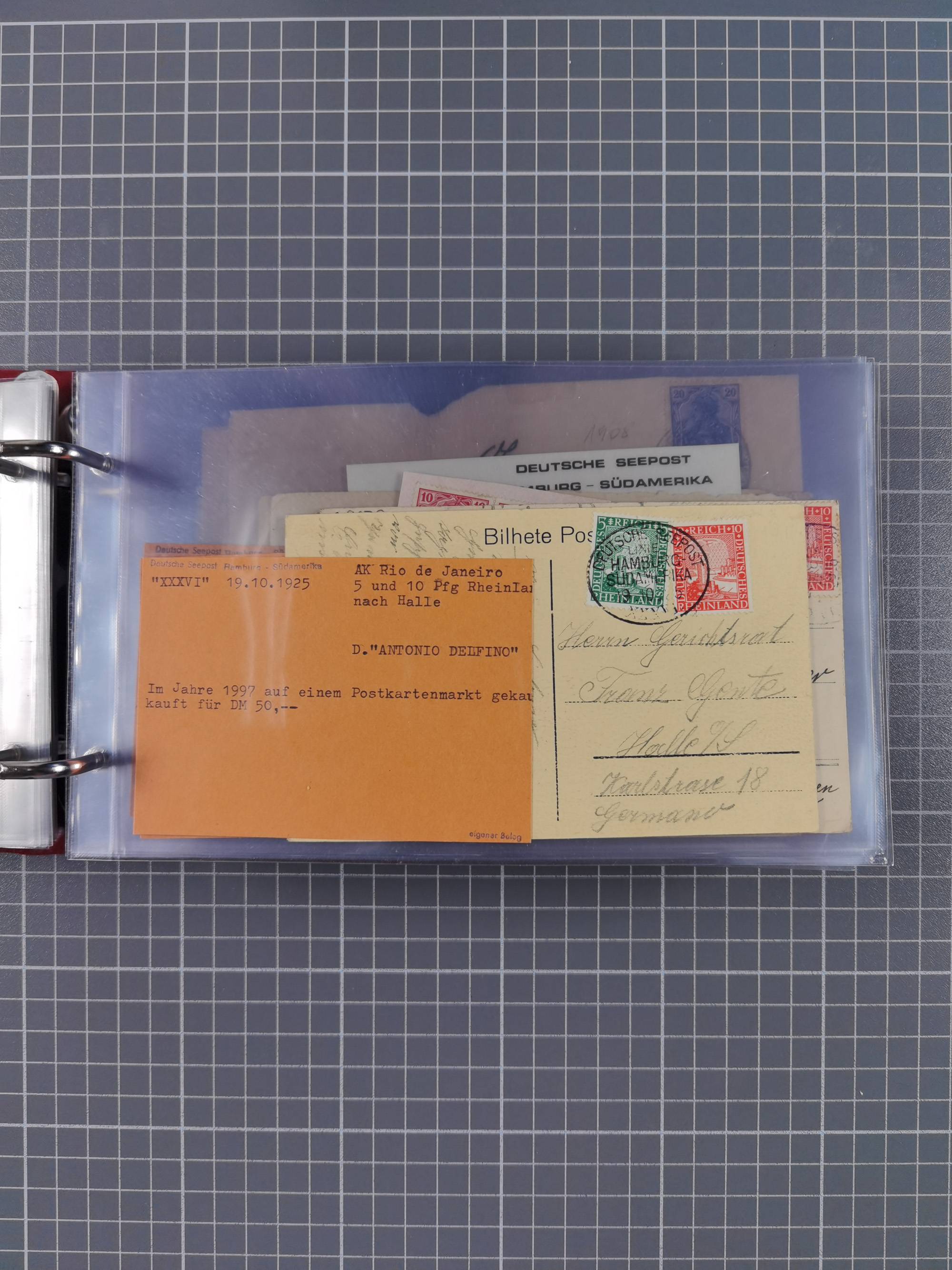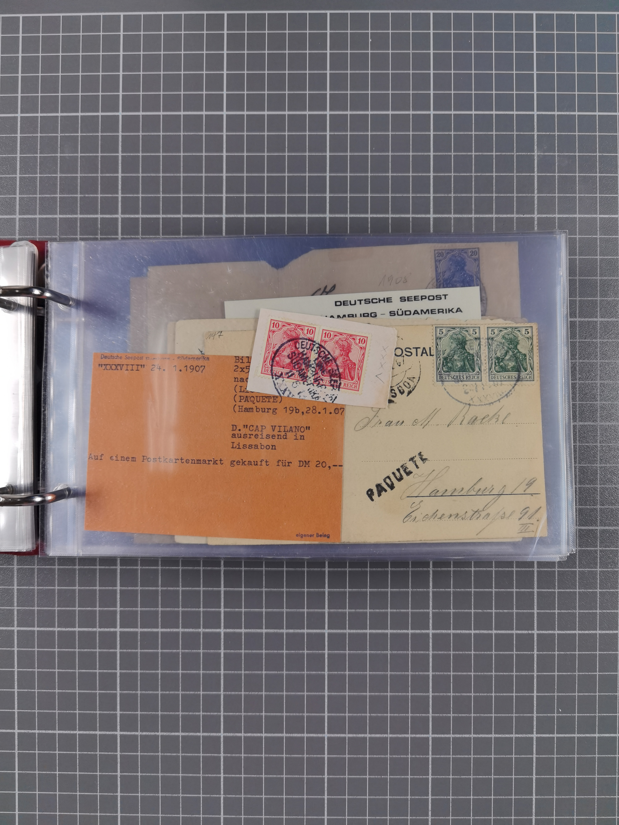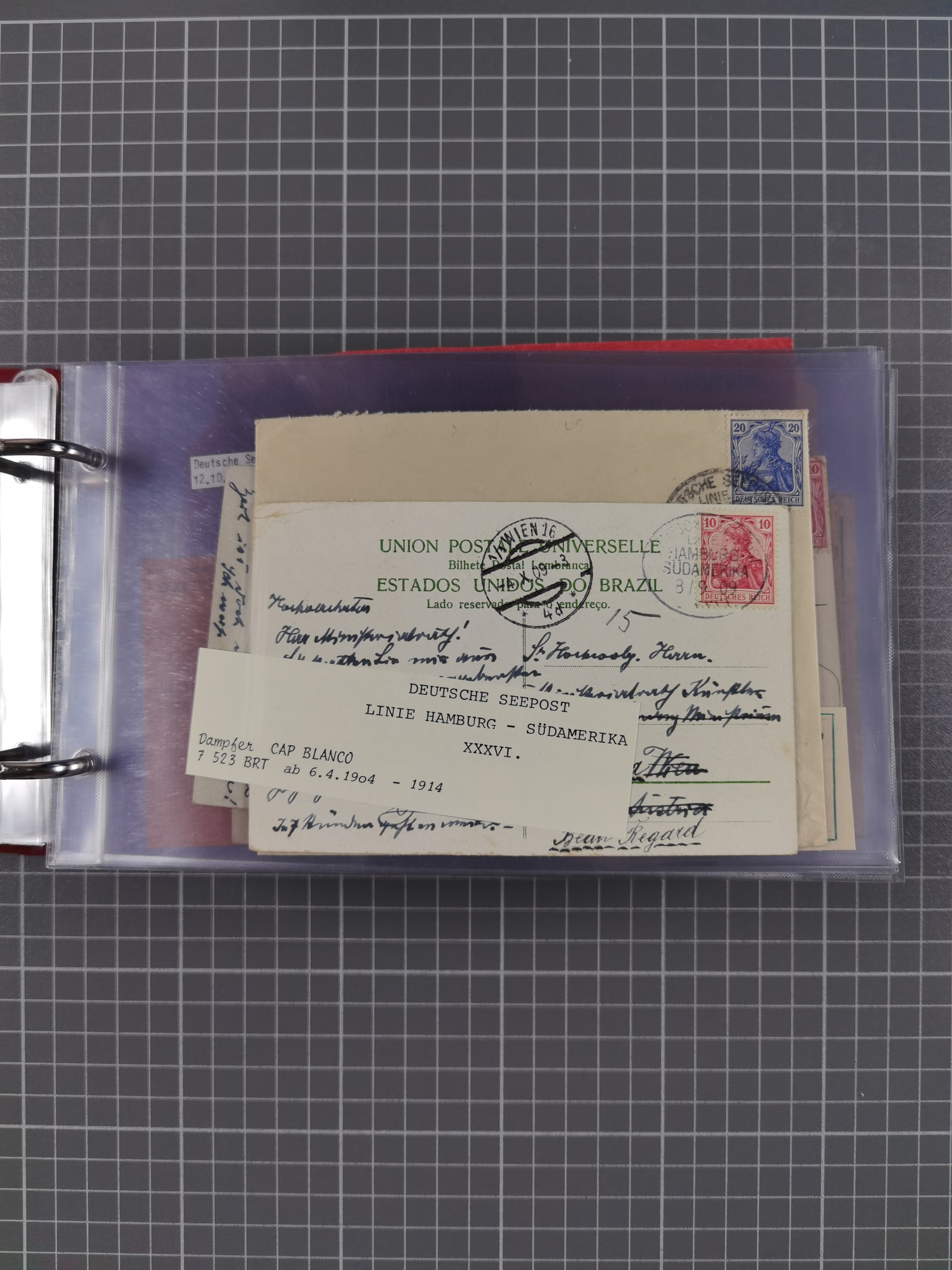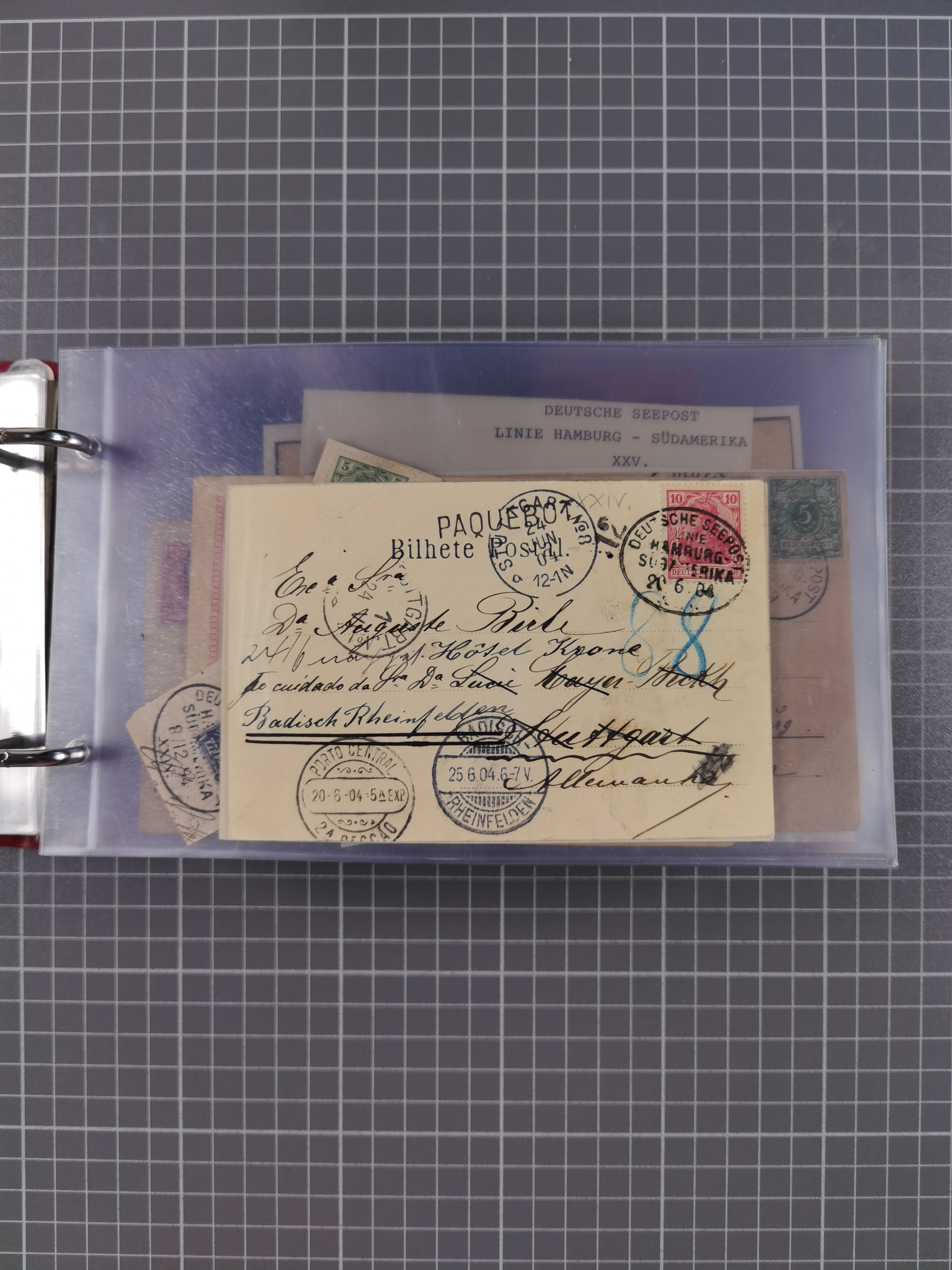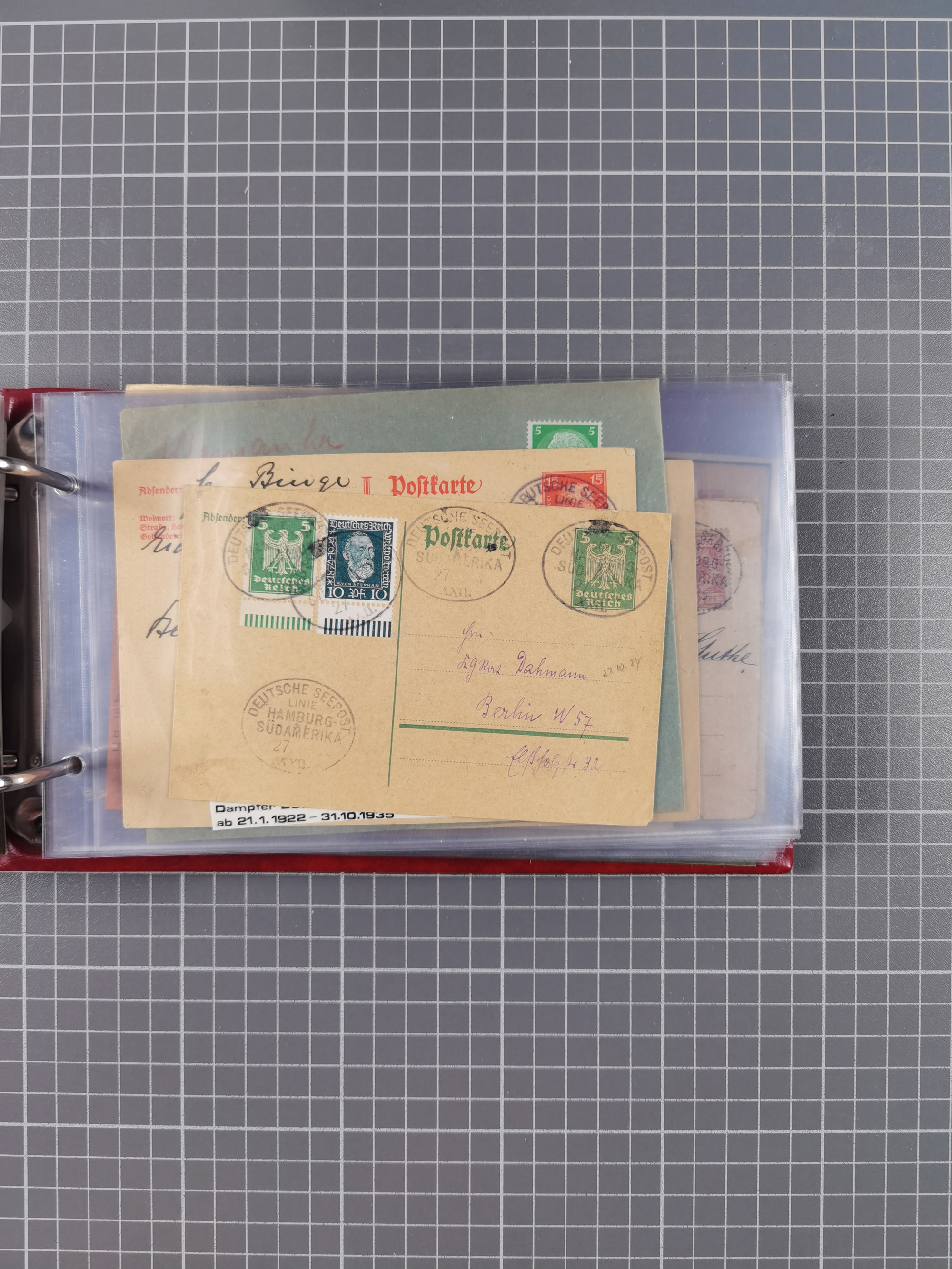 1891/1935 (ca.), umfangreiche Sammlung “DSP LINIE HAMBURG-SÜDAMERIKA I-LV” mit ca. 470 Briefen, Karten und GSK sowie wenigen Briefstücken mit Schwerpunkt vor 1914, dabei einige Belege mit “Paquebot”-Stempeln, Destinationen (u.a. 1895 nach Konstantinopel und GSK 1898 via Rottedam nach Jaluit), Bedarfspost aus der Infla-Zeit, Ozean-Brief 1913 und R-Ozean-Brief 1926. Die Erhaltung ist zum Teil etwas fehlerhaft, dafür fast nur klare Stempel, meist Bedarfspost, ex Steinmeyer