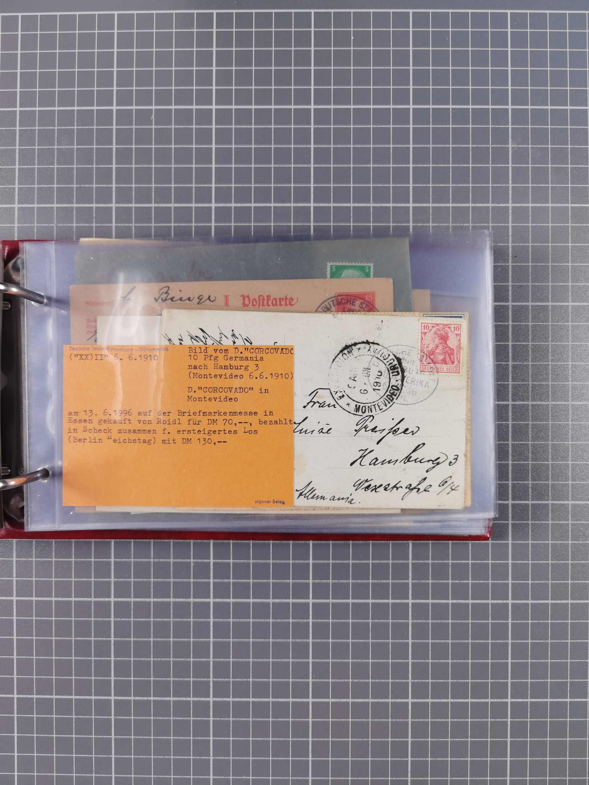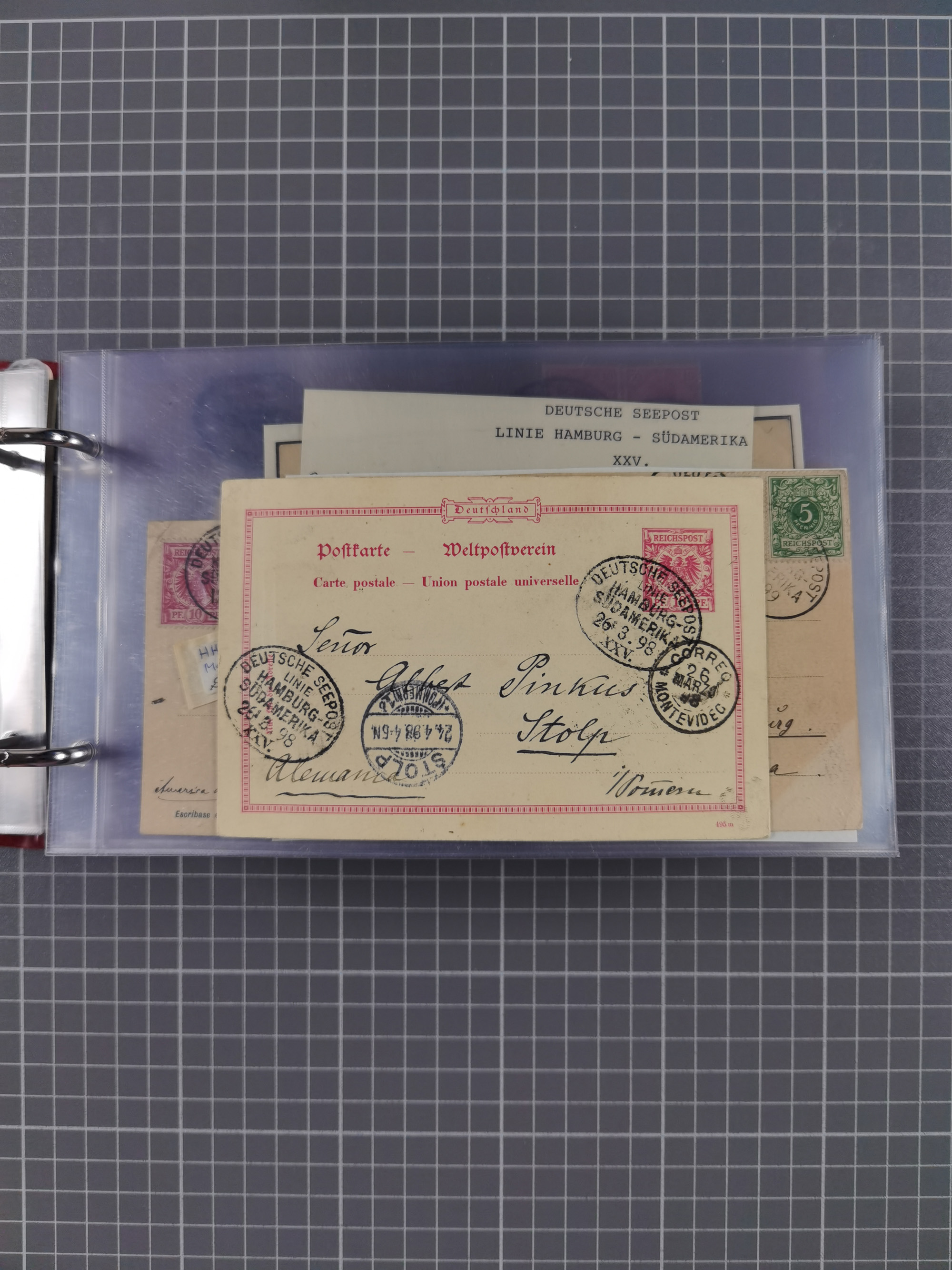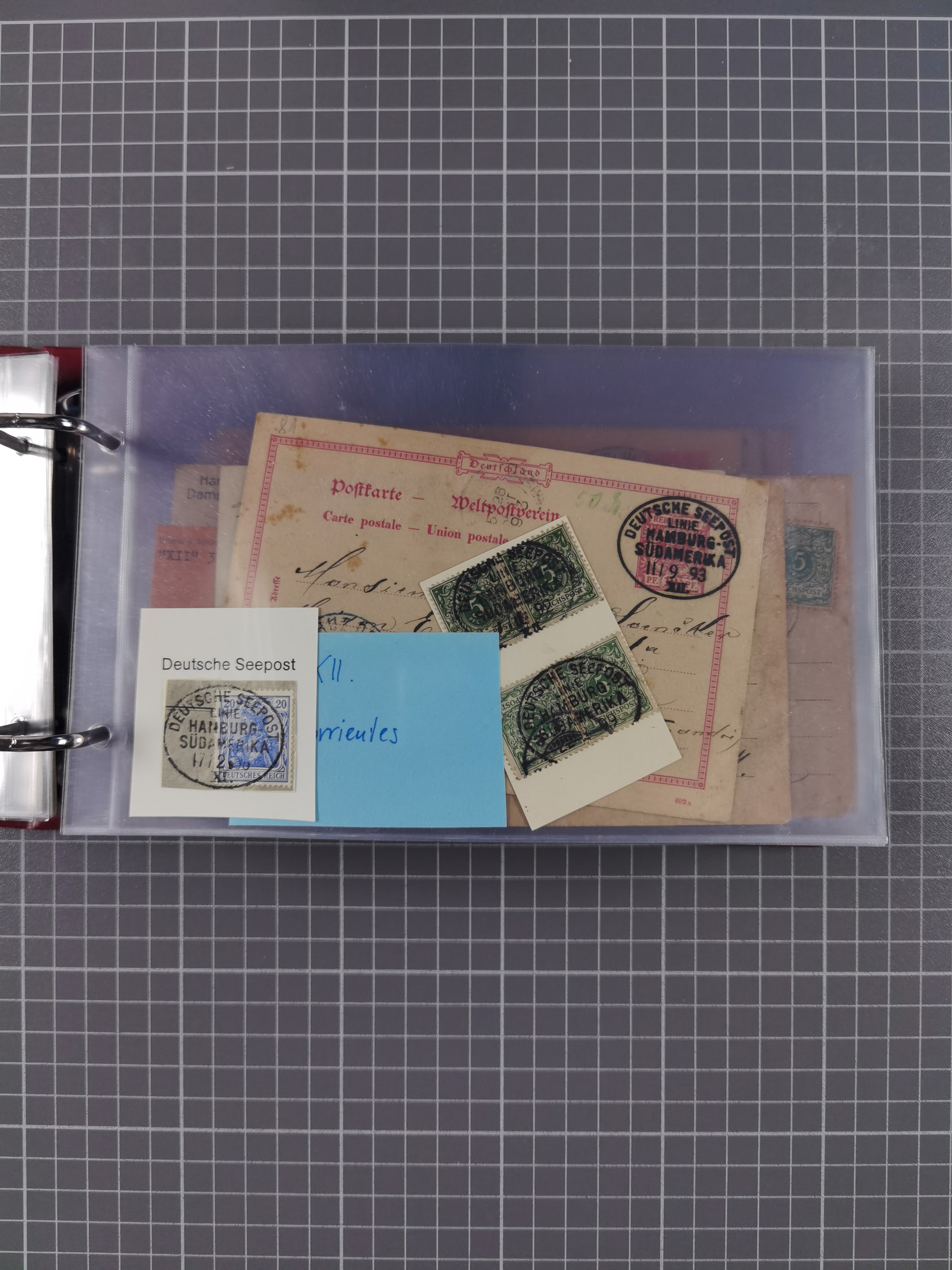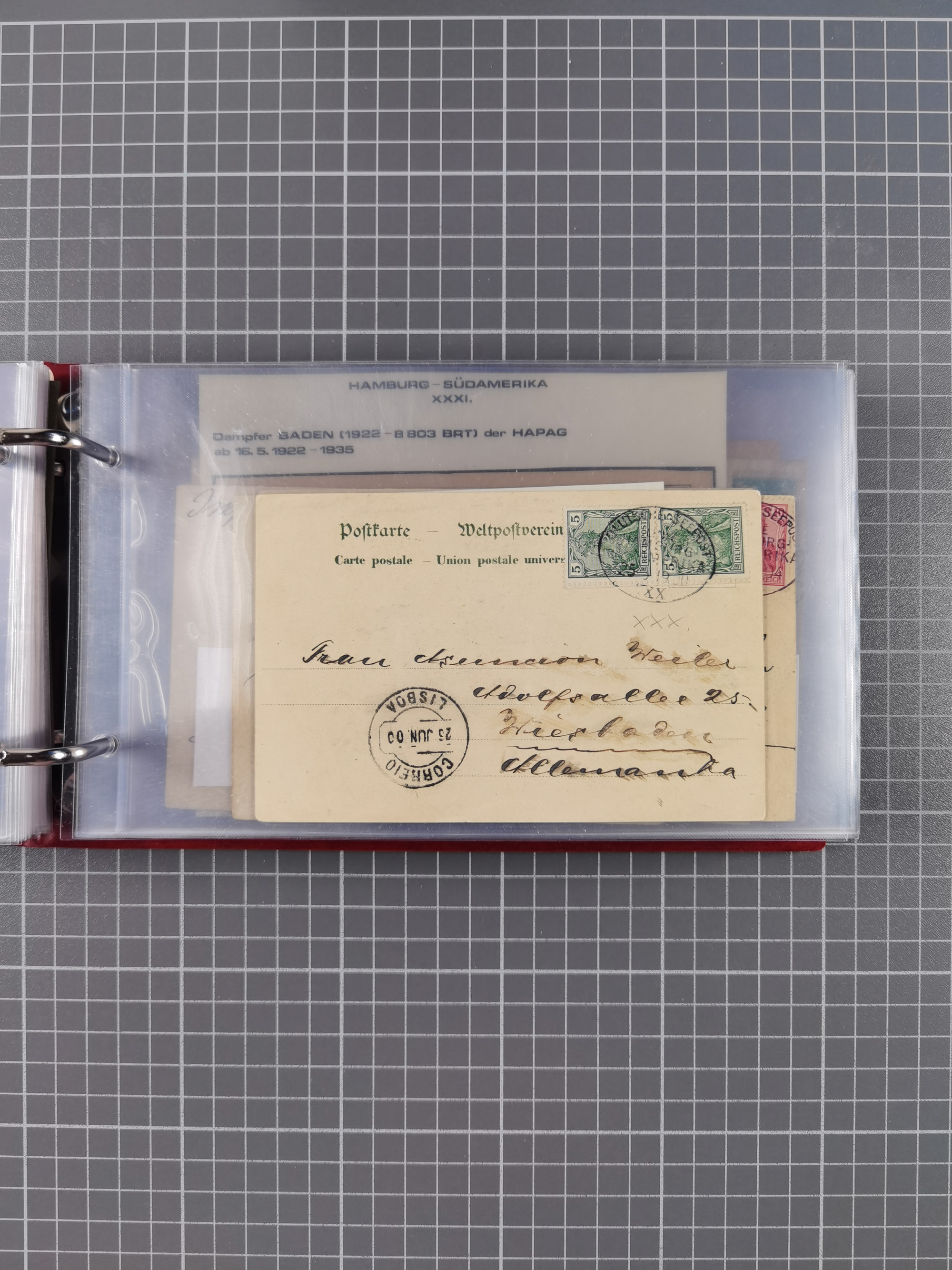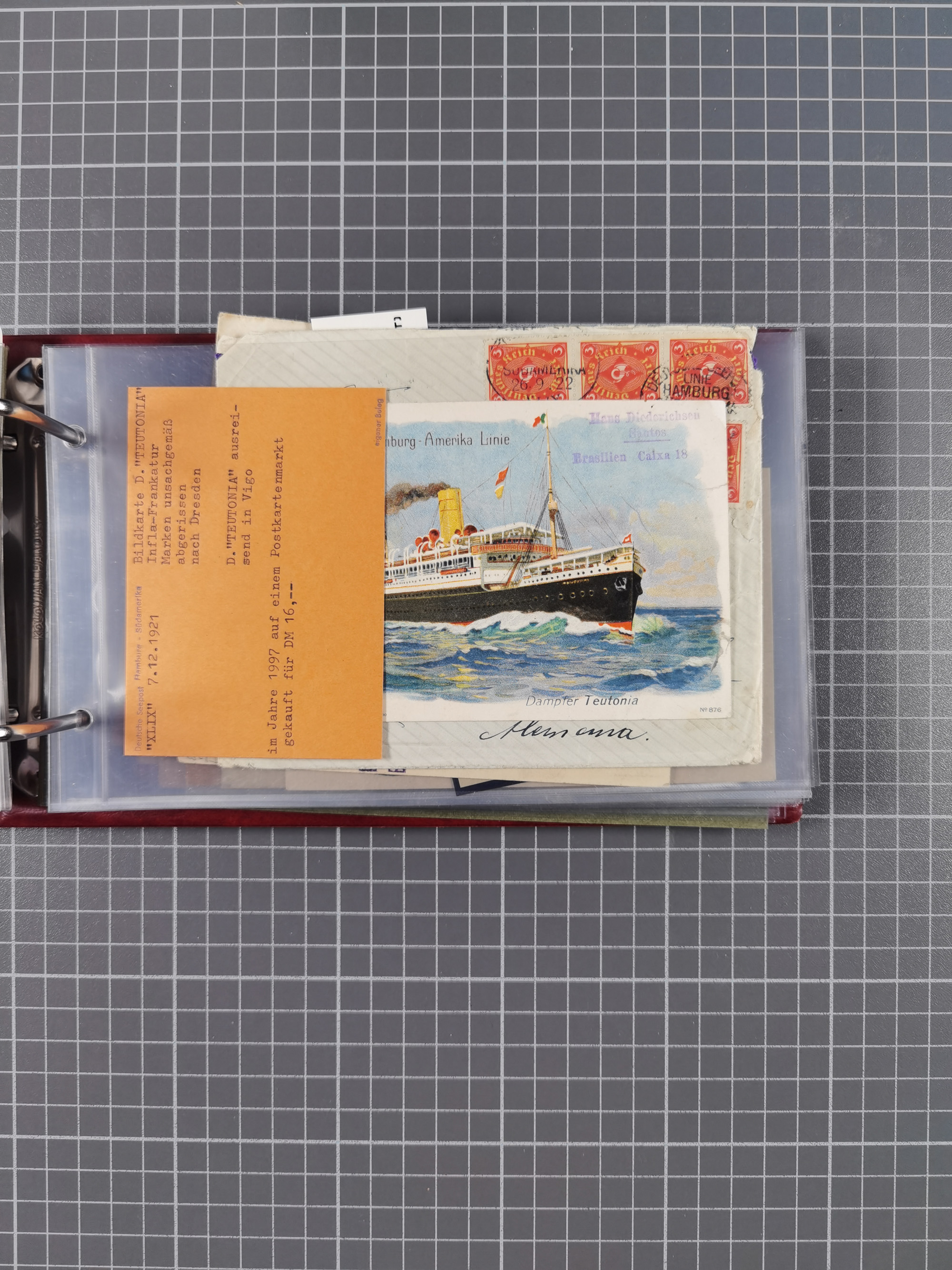 1891/1935 (ca.), umfangreiche Sammlung “DSP LINIE HAMBURG-SÜDAMERIKA I-LV” mit ca. 470 Briefen, Karten und GSK sowie wenigen Briefstücken mit Schwerpunkt vor 1914, dabei einige Belege mit “Paquebot”-Stempeln, Destinationen (u.a. 1895 nach Konstantinopel und GSK 1898 via Rottedam nach Jaluit), Bedarfspost aus der Infla-Zeit, Ozean-Brief 1913 und R-Ozean-Brief 1926. Die Erhaltung ist zum Teil etwas fehlerhaft, dafür fast nur klare Stempel, meist Bedarfspost, ex Steinmeyer