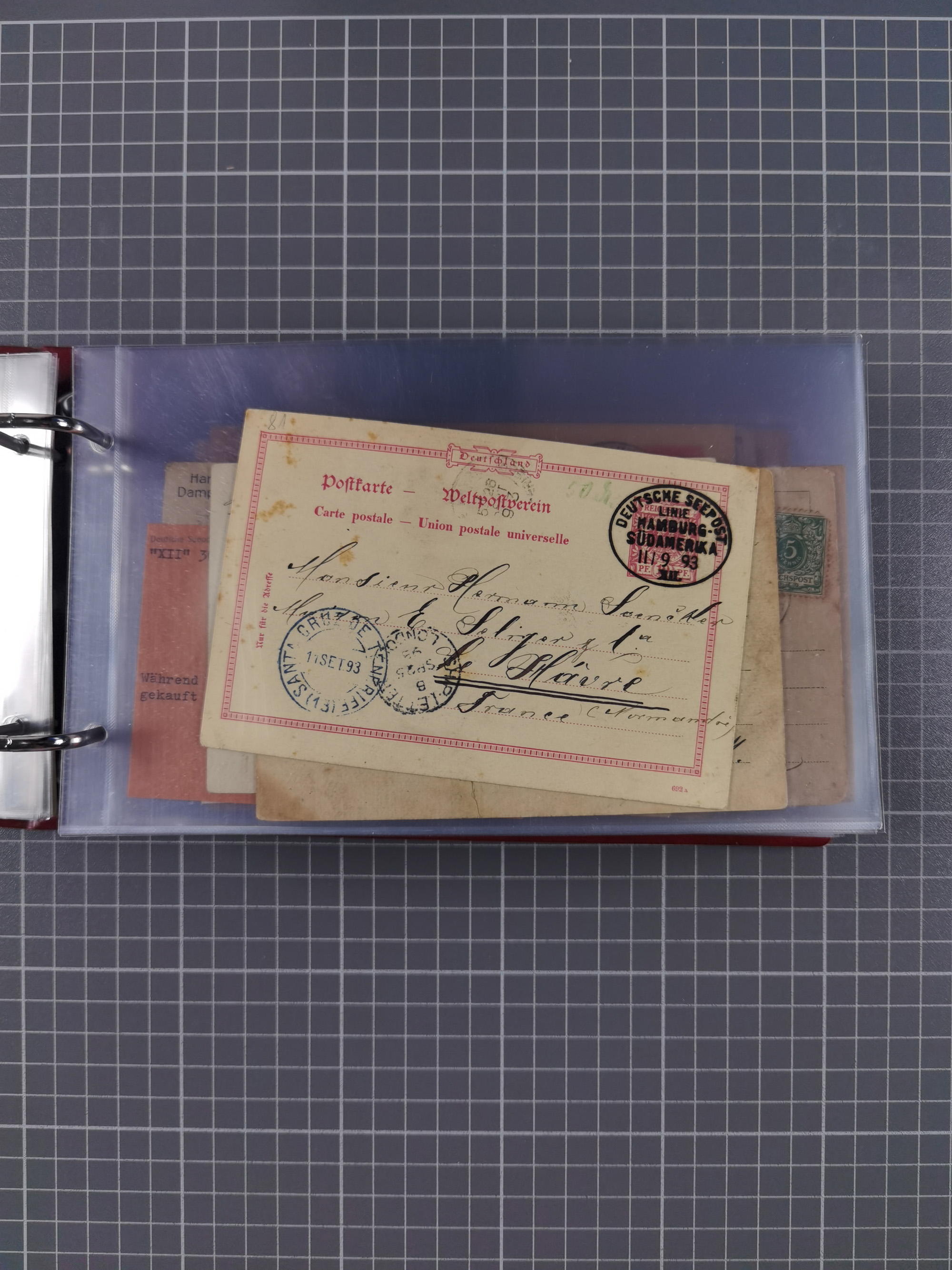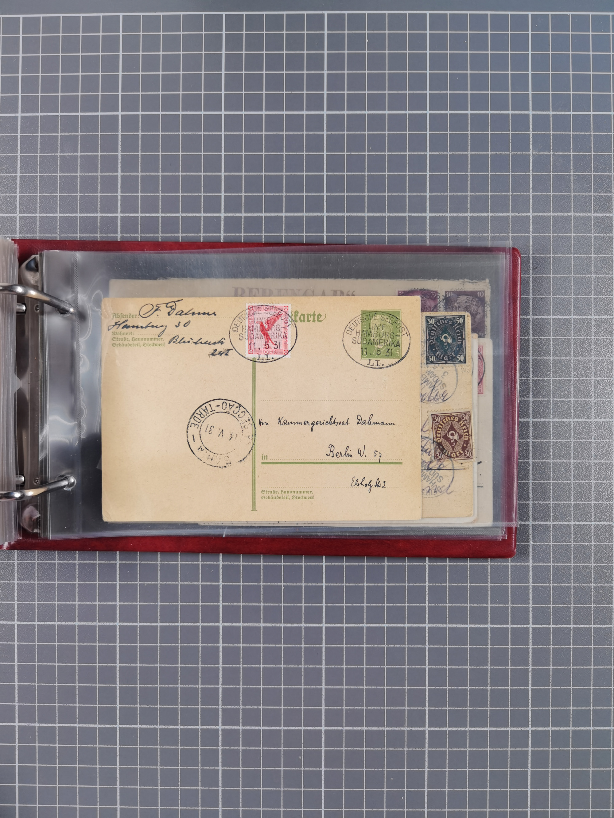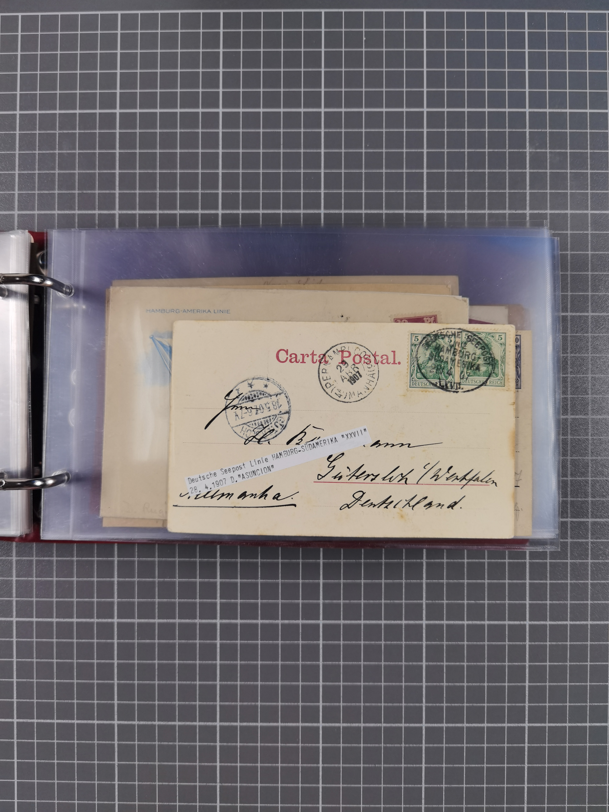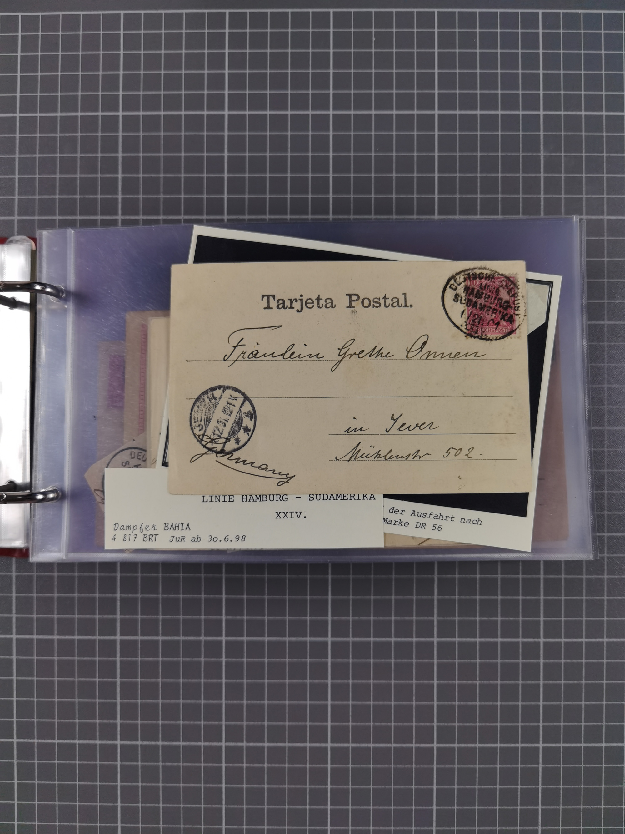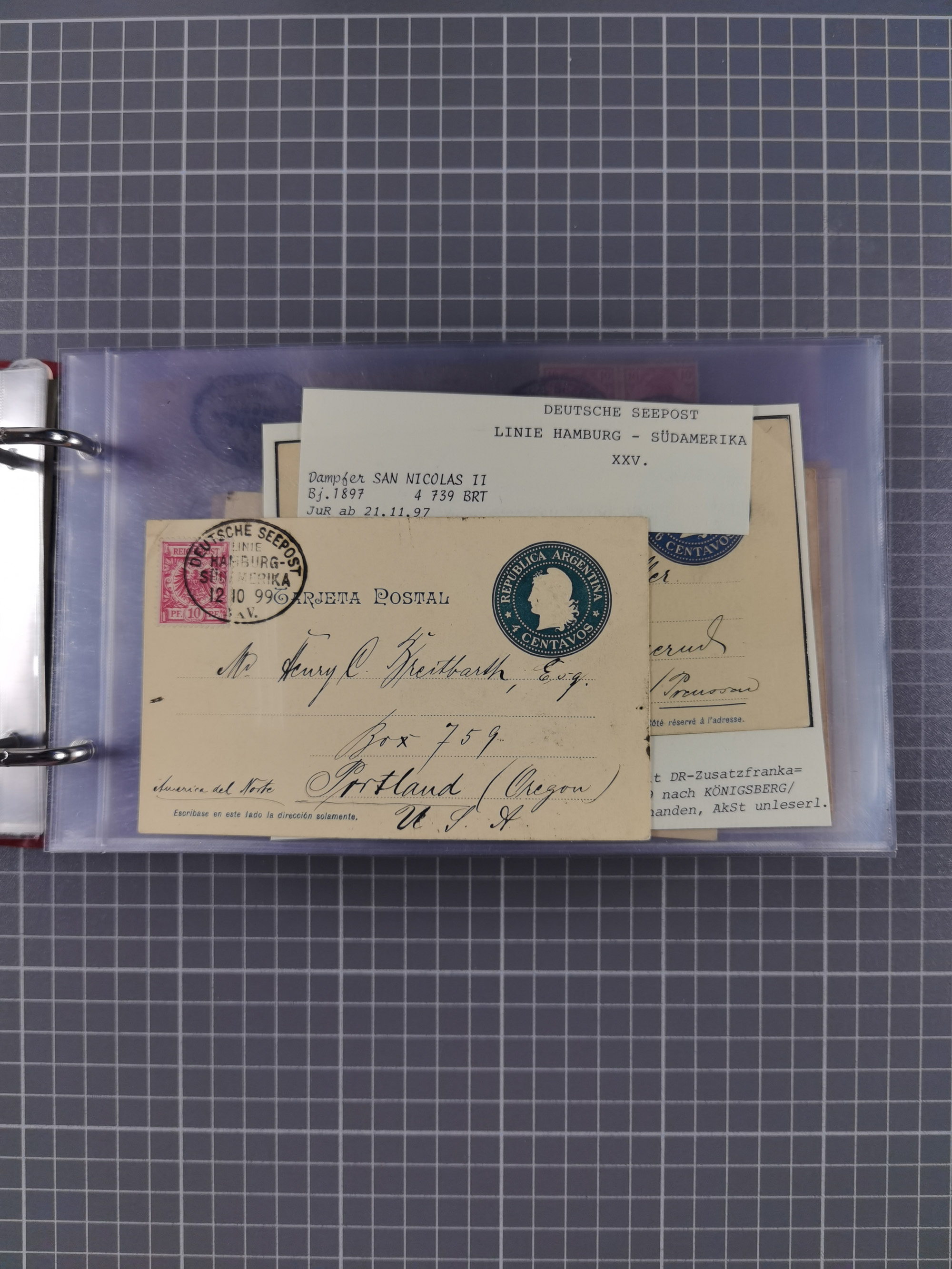 1891/1935 (ca.), umfangreiche Sammlung “DSP LINIE HAMBURG-SÜDAMERIKA I-LV” mit ca. 470 Briefen, Karten und GSK sowie wenigen Briefstücken mit Schwerpunkt vor 1914, dabei einige Belege mit “Paquebot”-Stempeln, Destinationen (u.a. 1895 nach Konstantinopel und GSK 1898 via Rottedam nach Jaluit), Bedarfspost aus der Infla-Zeit, Ozean-Brief 1913 und R-Ozean-Brief 1926. Die Erhaltung ist zum Teil etwas fehlerhaft, dafür fast nur klare Stempel, meist Bedarfspost, ex Steinmeyer