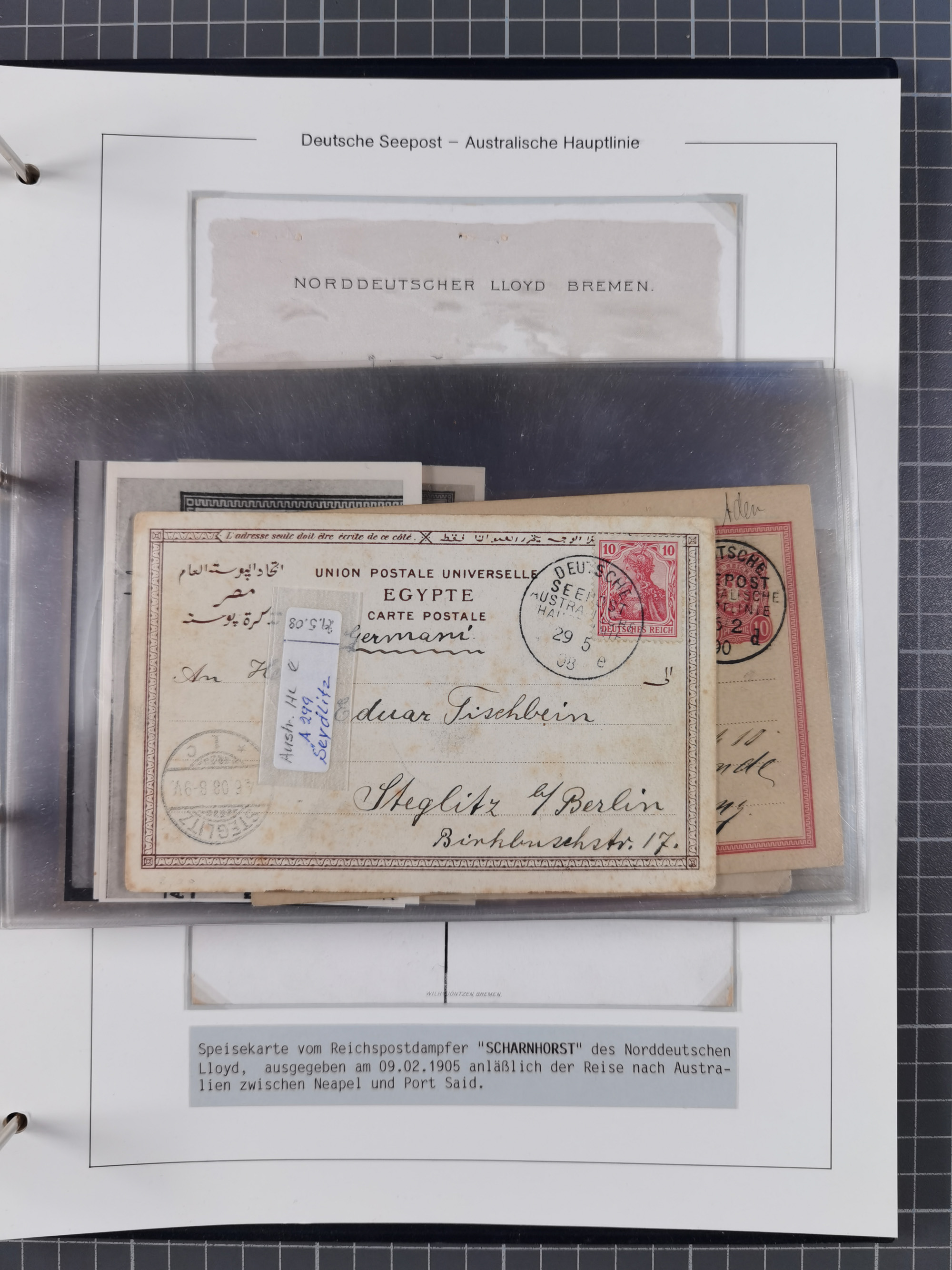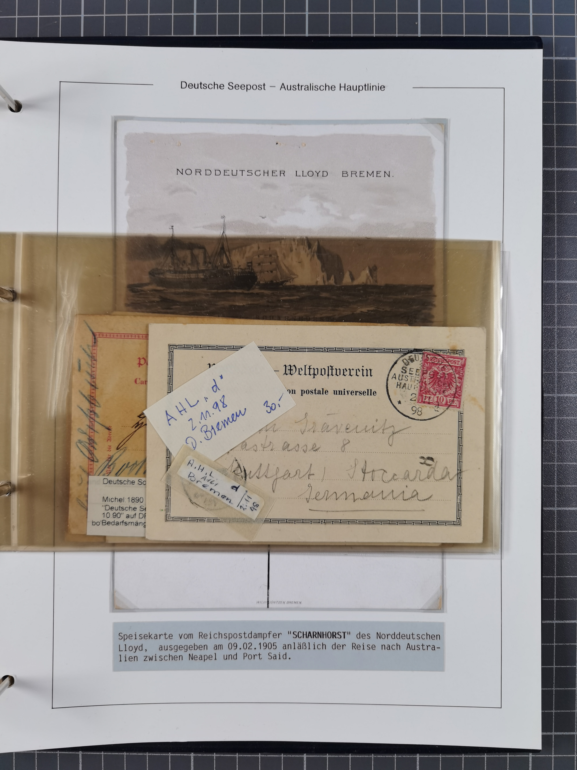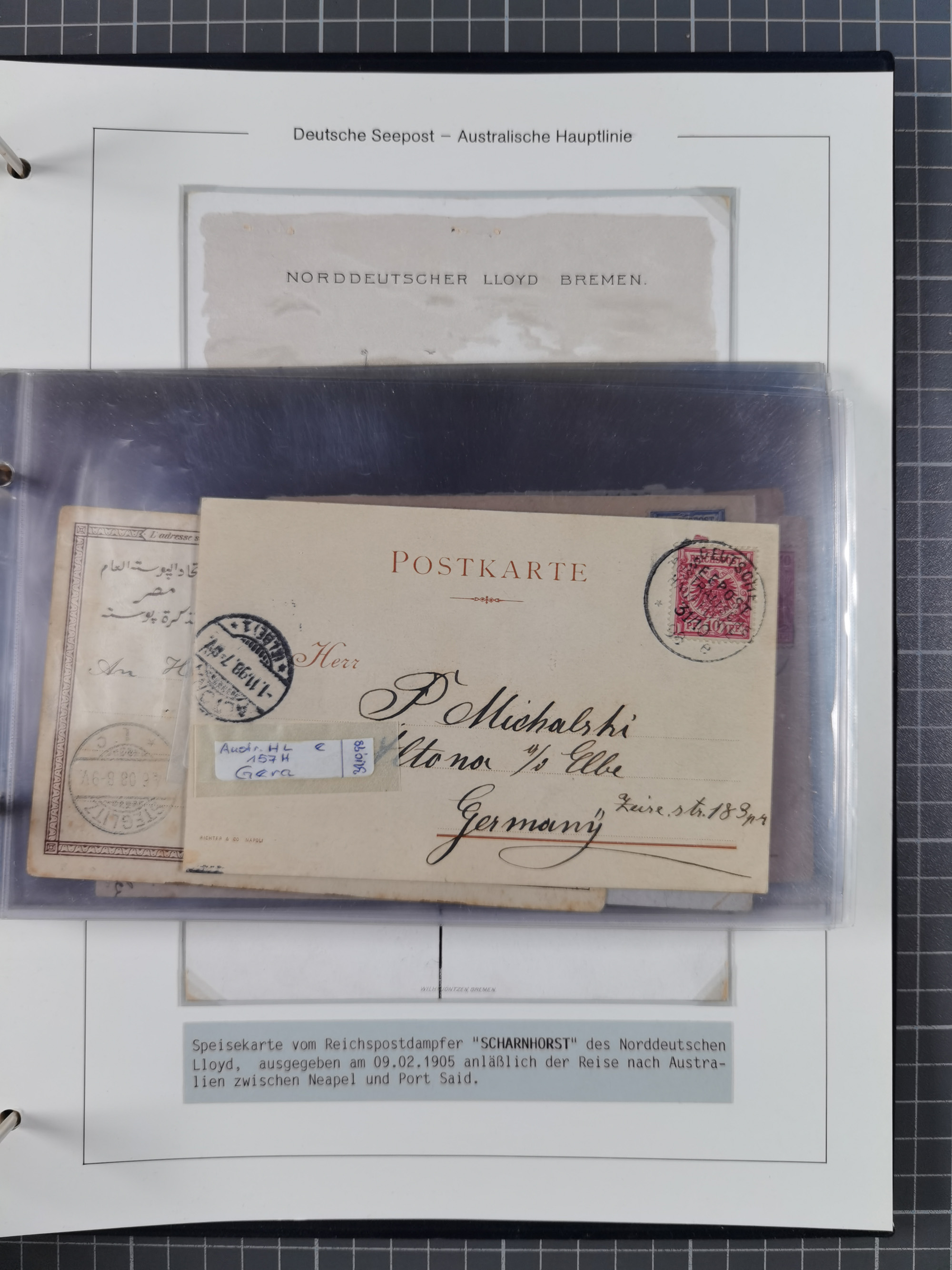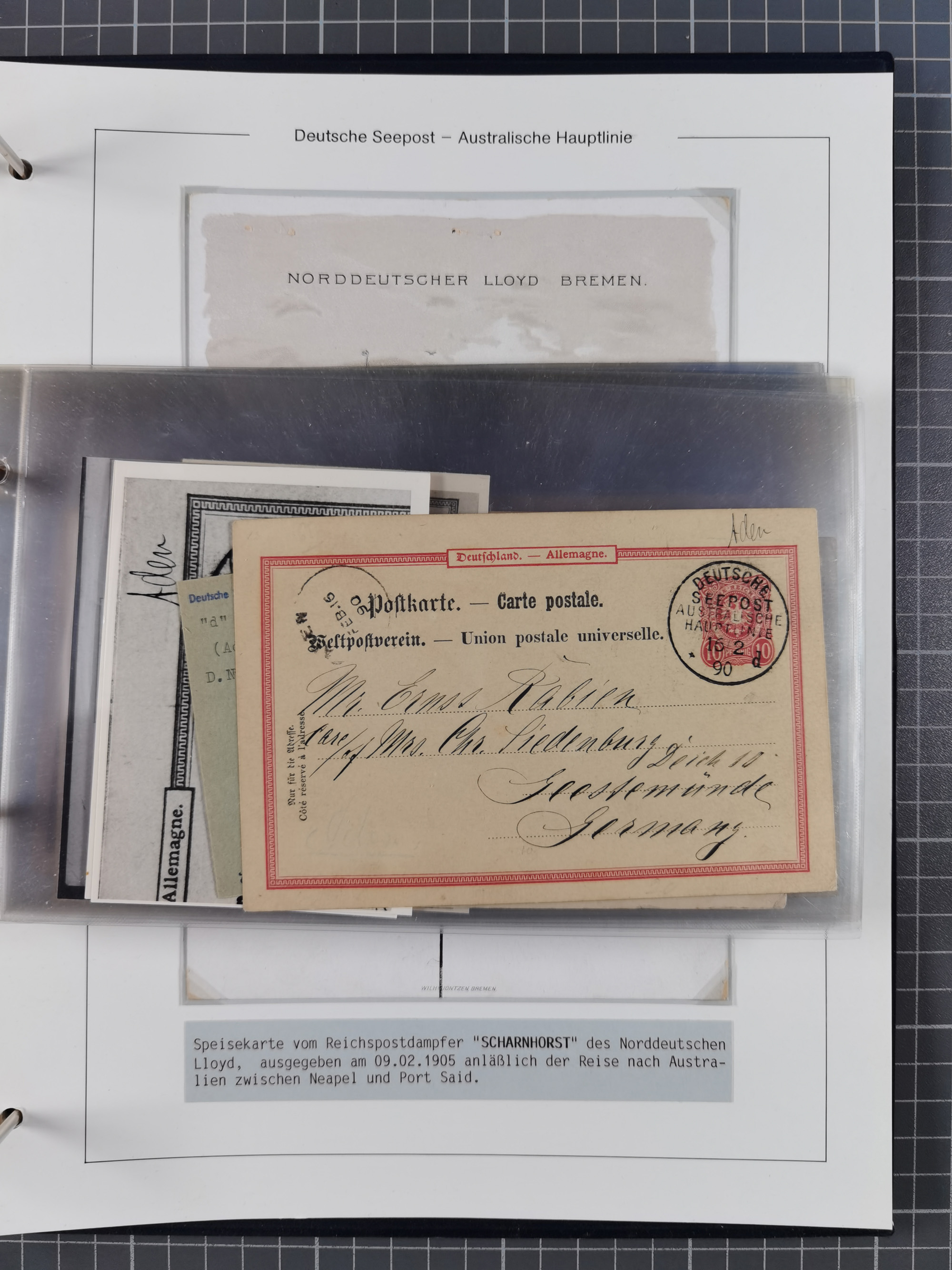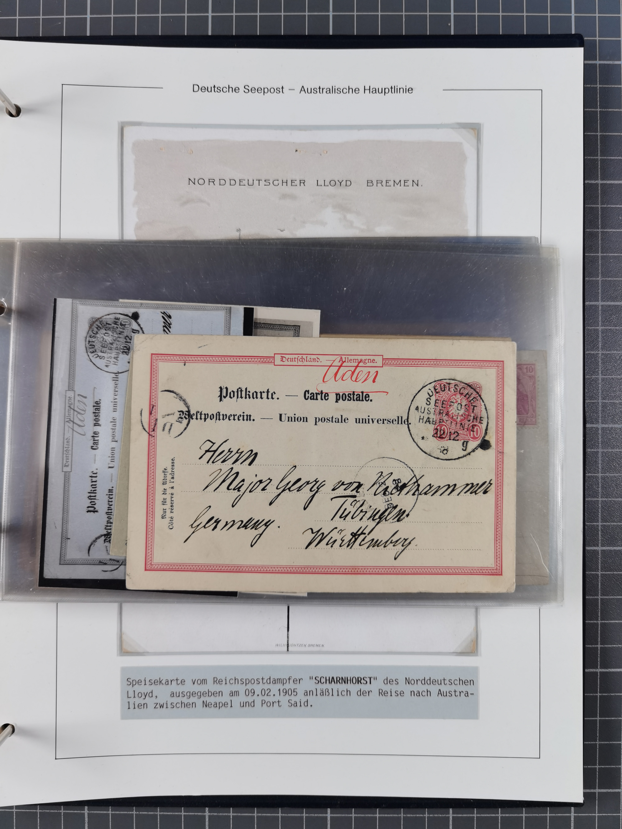 1887/1912, kleine Sammlung “DSP AUSTRALISCHE HAUPTLINIE” mit 35 Briefen, Karten und GSK, dabei frühe Post mit Aufgabe-Vermerken u.a. aus Aden, Port Sauíd und Suez, dazu eine Speisekarte vom Reichspostdampfer Scharnhorst 1905. Zum Teil kleine Spuren, meist in guter Erhaltung, ex Steinmeyer