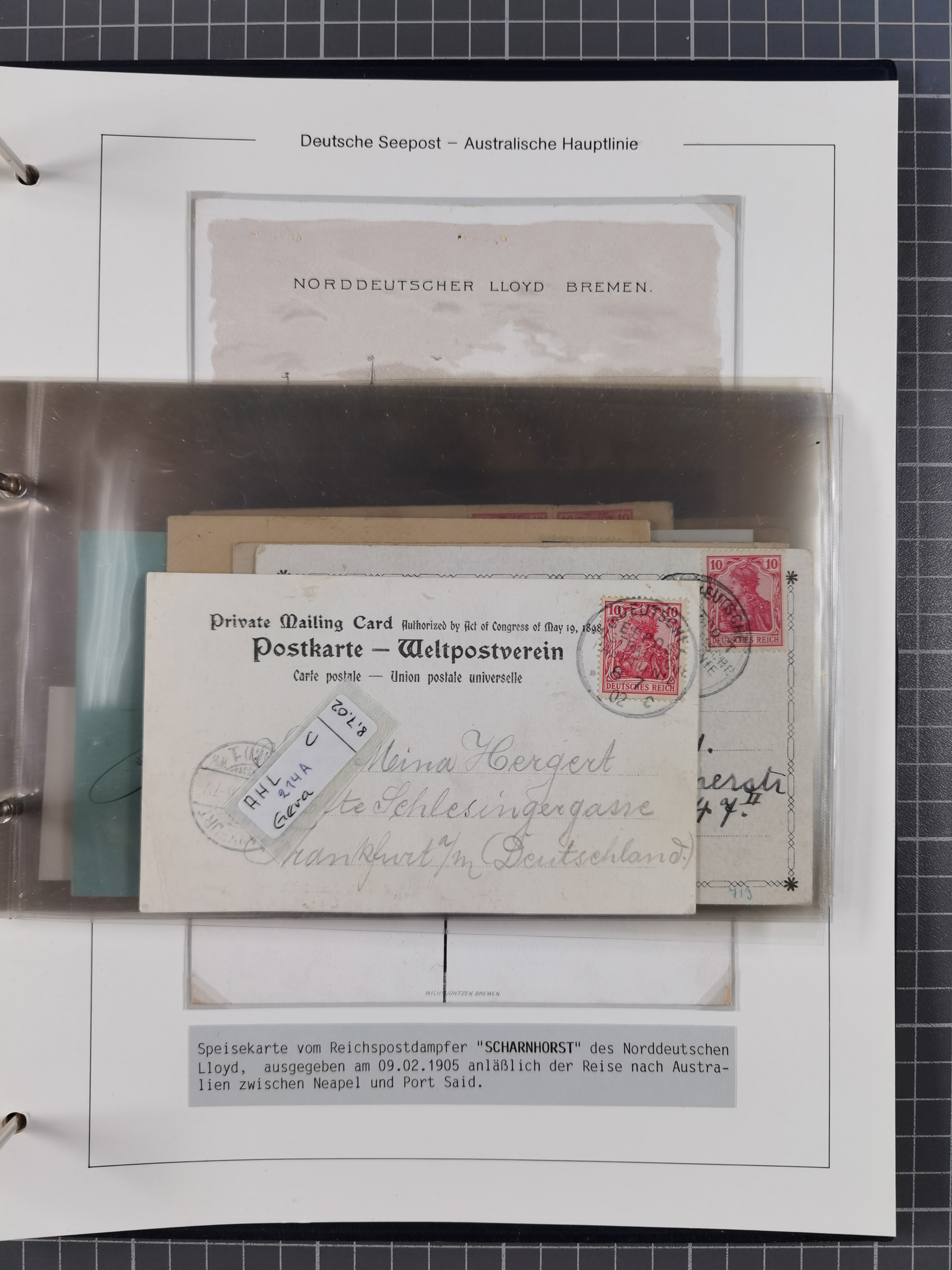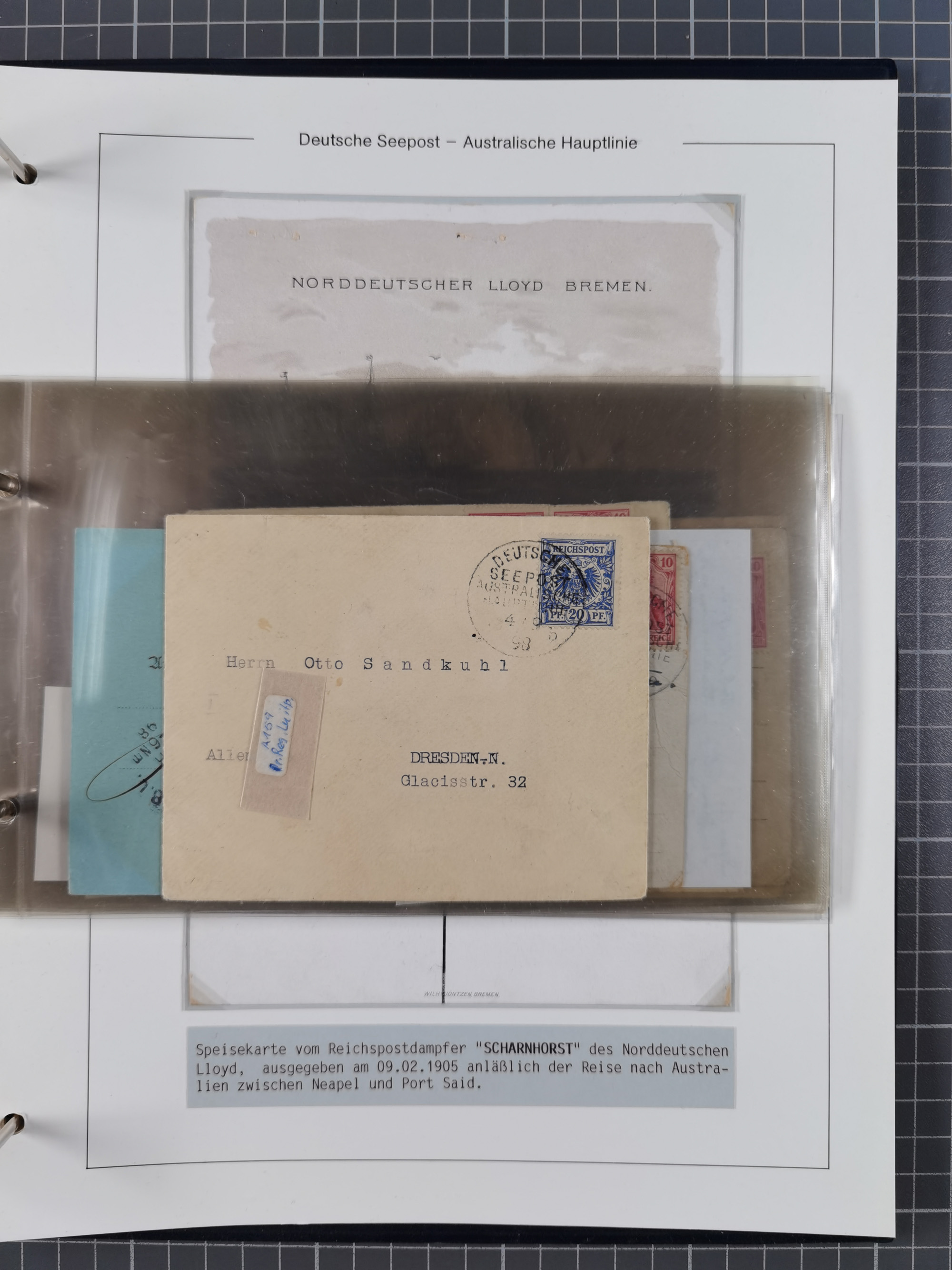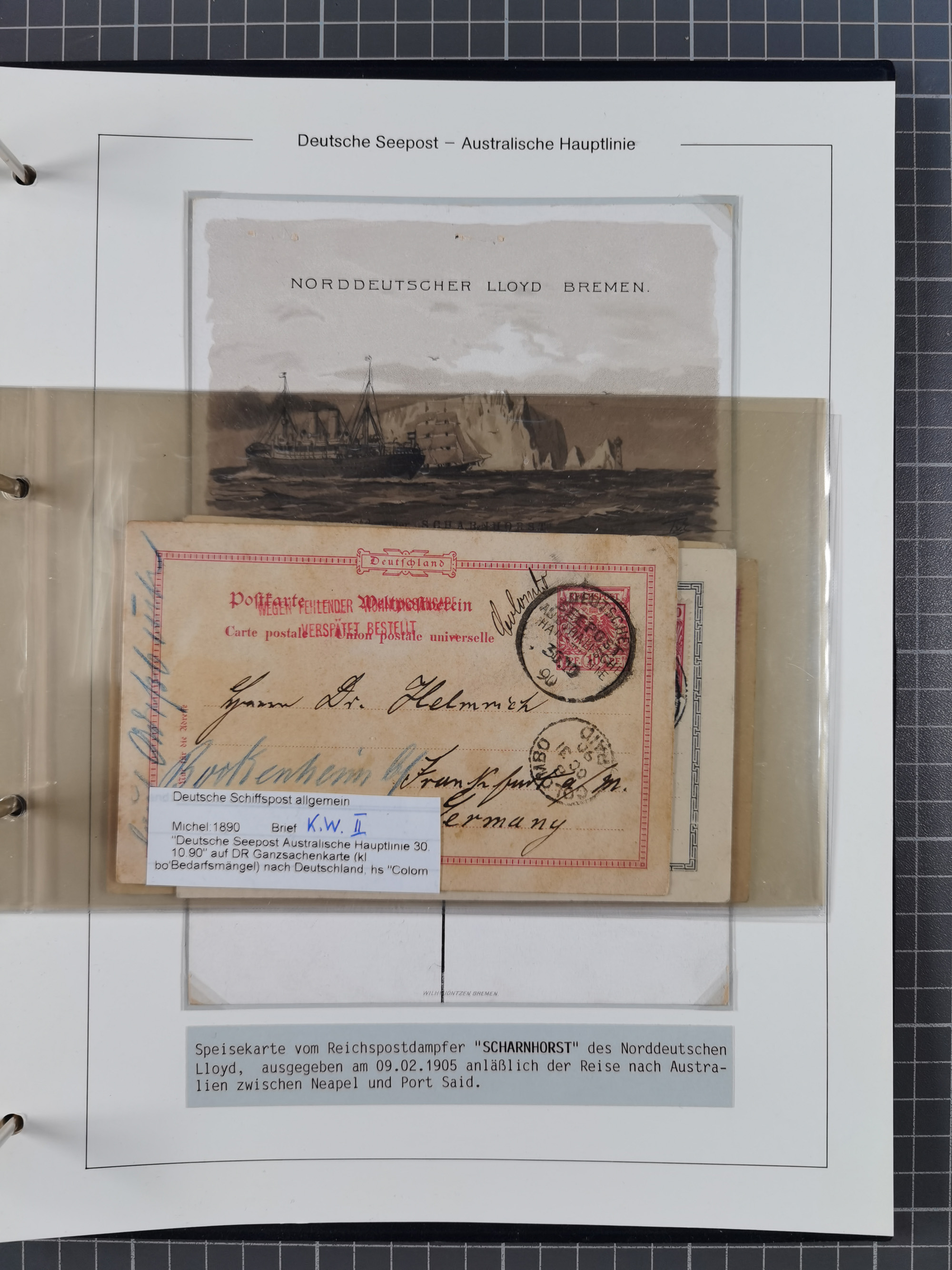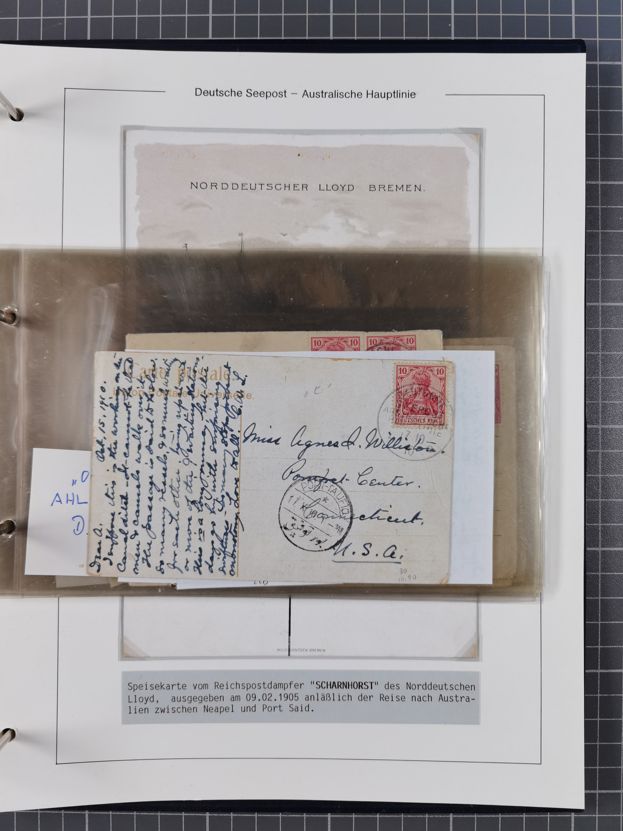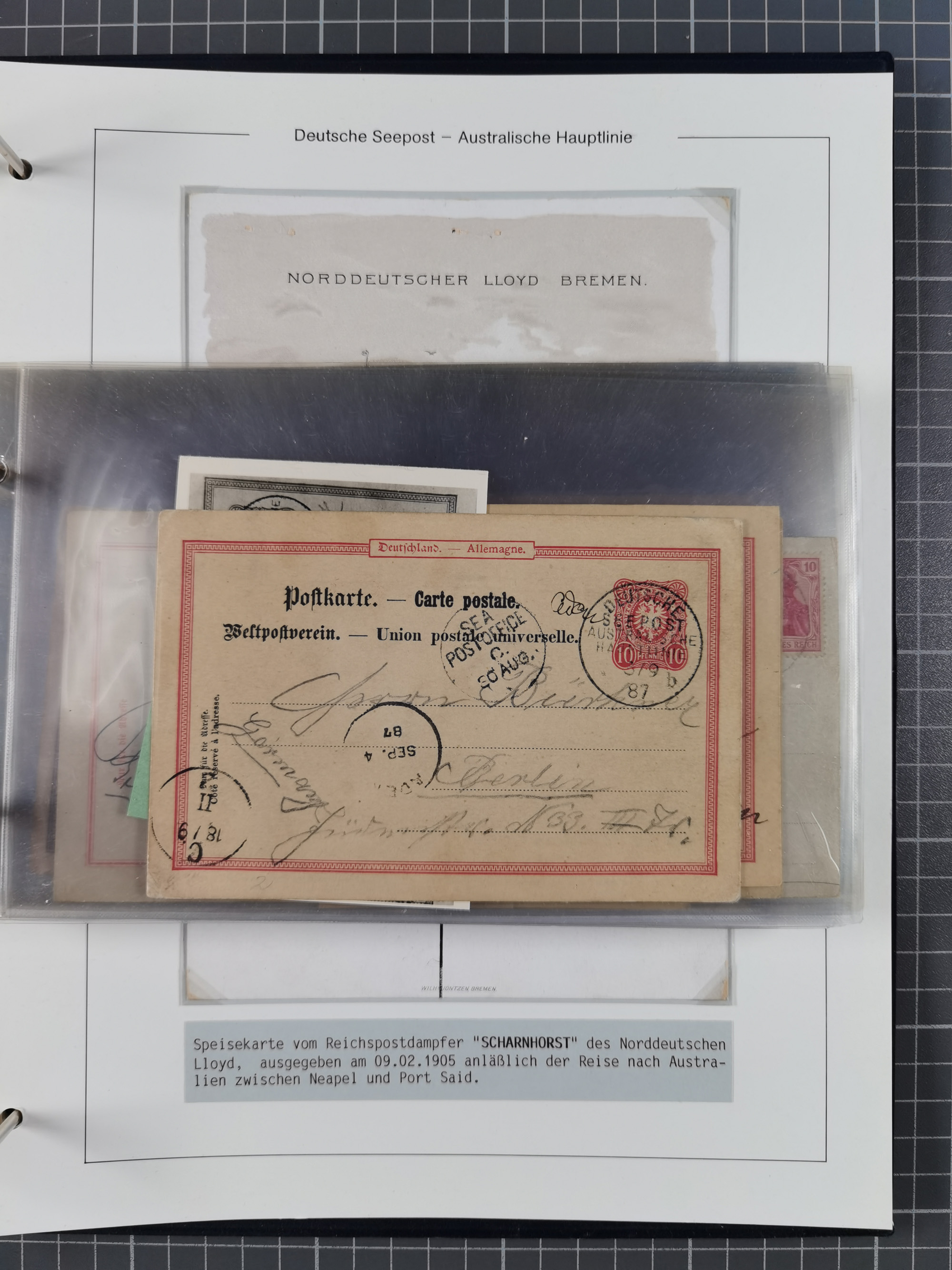 1887/1912, kleine Sammlung “DSP AUSTRALISCHE HAUPTLINIE” mit 35 Briefen, Karten und GSK, dabei frühe Post mit Aufgabe-Vermerken u.a. aus Aden, Port Sauíd und Suez, dazu eine Speisekarte vom Reichspostdampfer Scharnhorst 1905. Zum Teil kleine Spuren, meist in guter Erhaltung, ex Steinmeyer