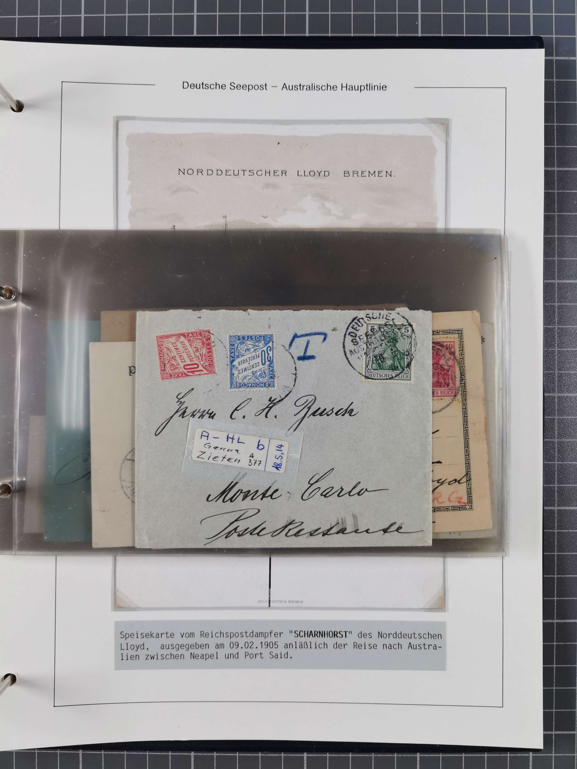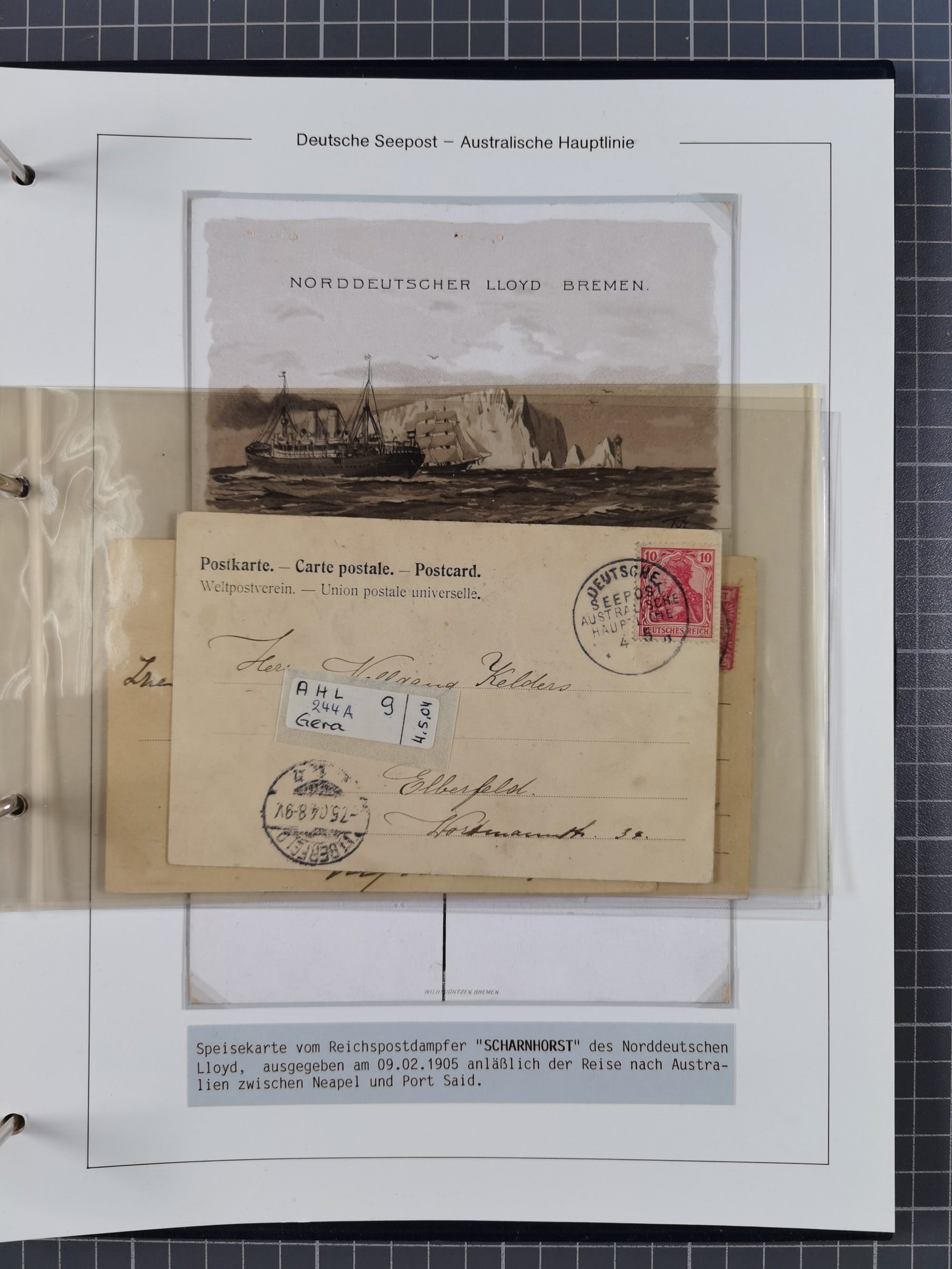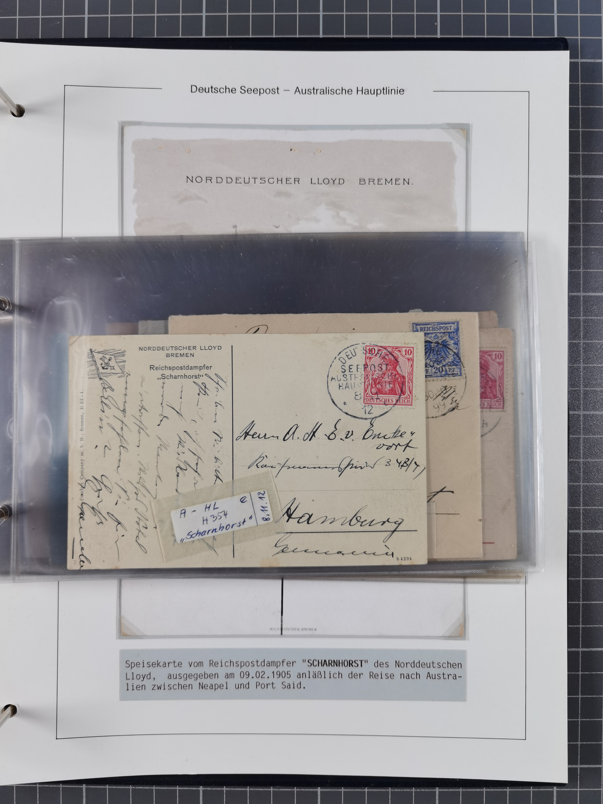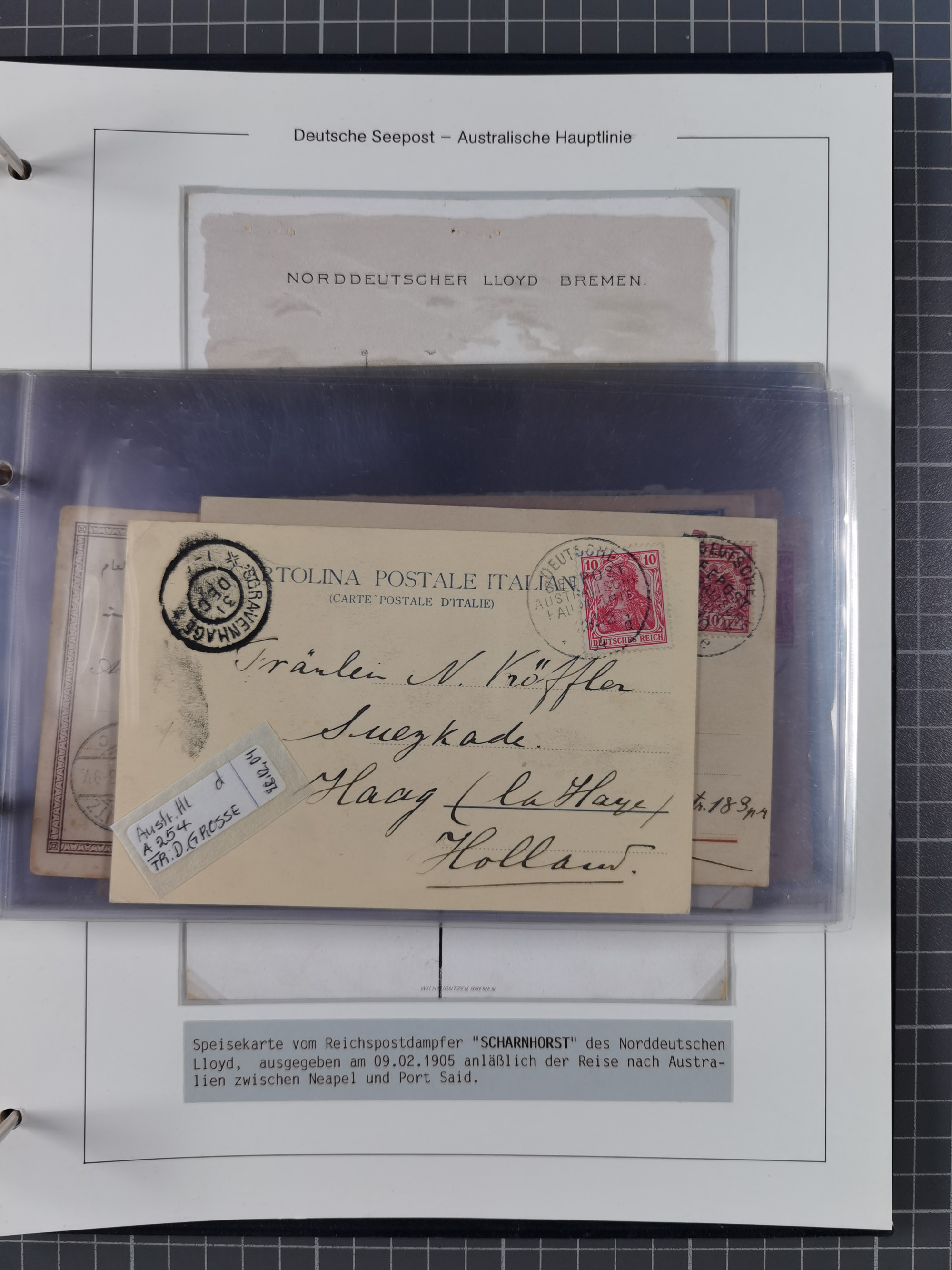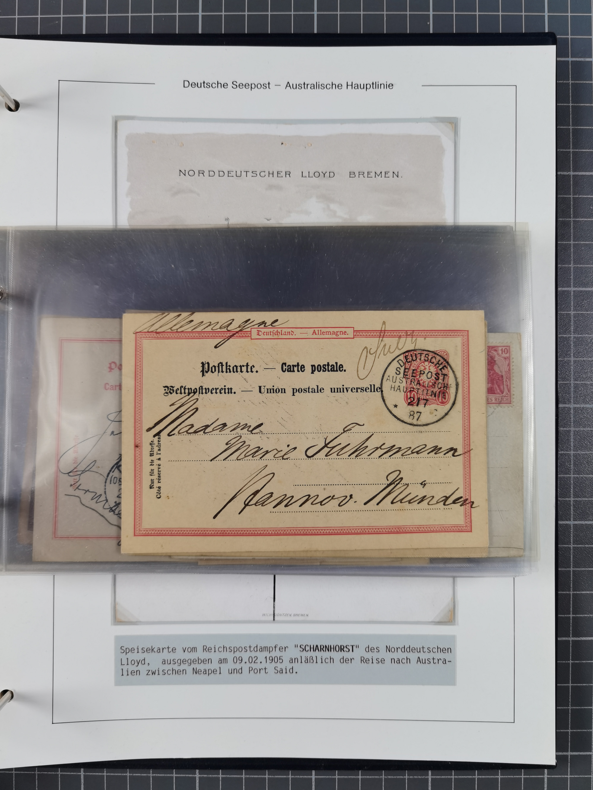 1887/1912, kleine Sammlung “DSP AUSTRALISCHE HAUPTLINIE” mit 35 Briefen, Karten und GSK, dabei frühe Post mit Aufgabe-Vermerken u.a. aus Aden, Port Sauíd und Suez, dazu eine Speisekarte vom Reichspostdampfer Scharnhorst 1905. Zum Teil kleine Spuren, meist in guter Erhaltung, ex Steinmeyer