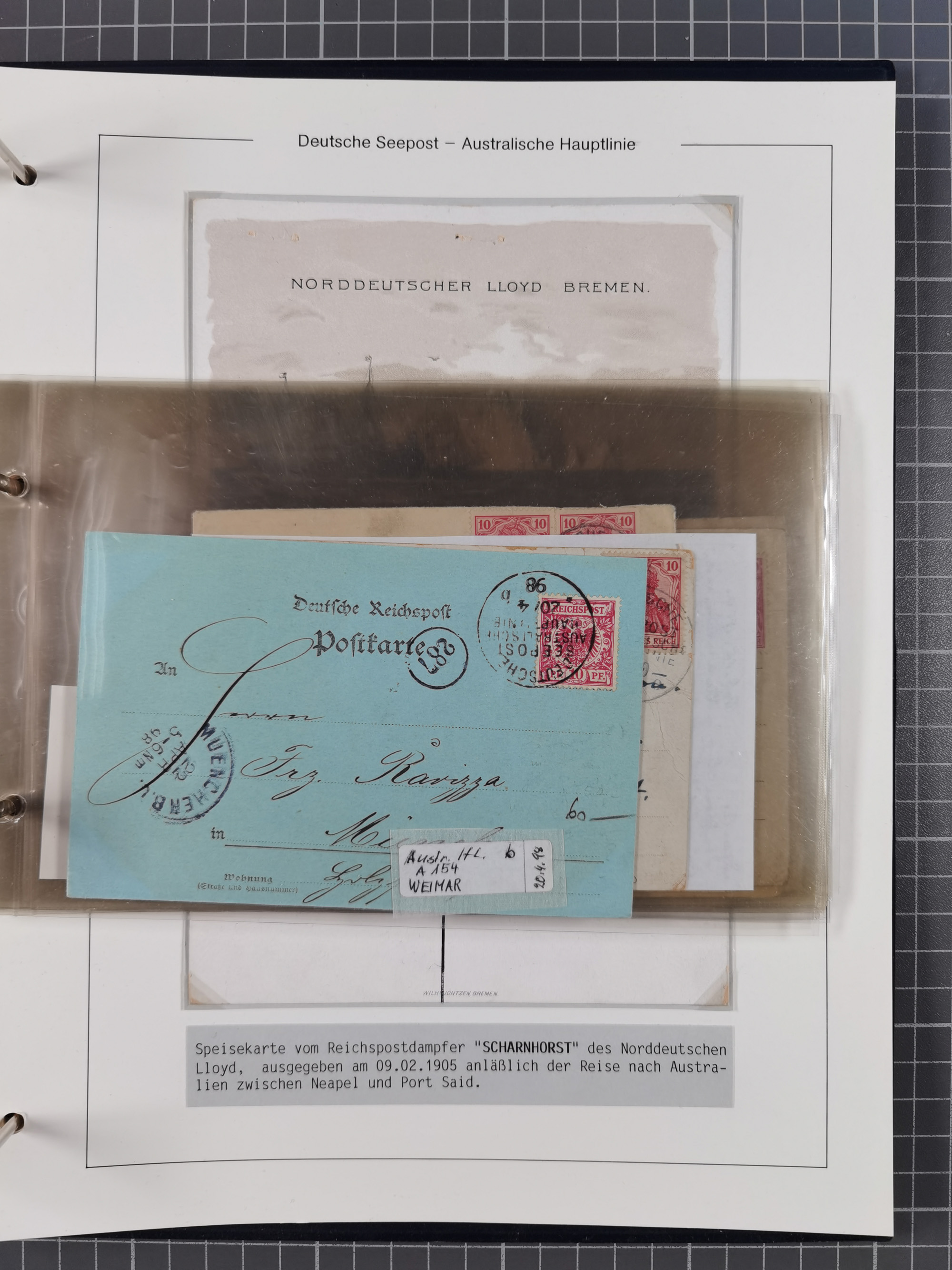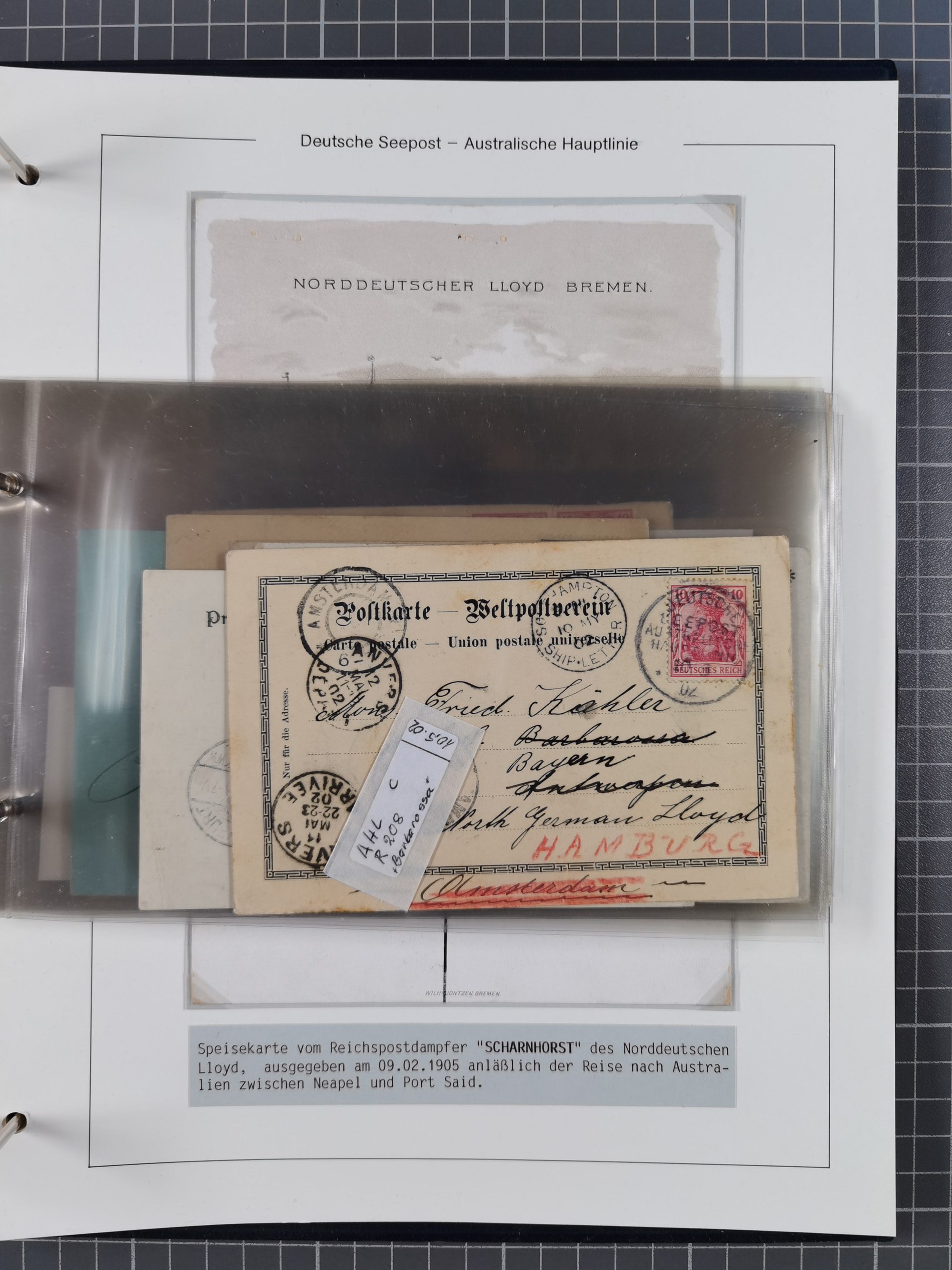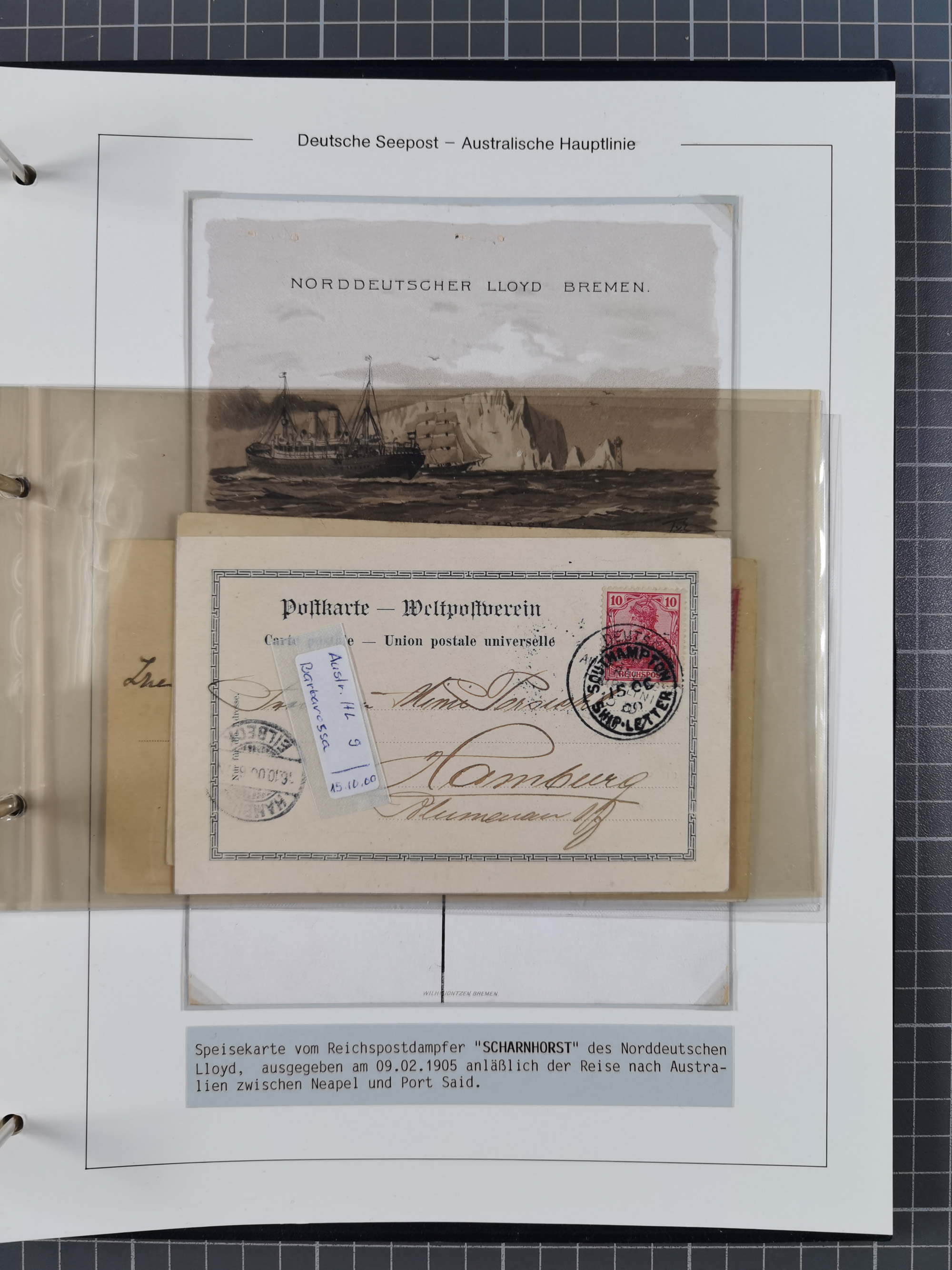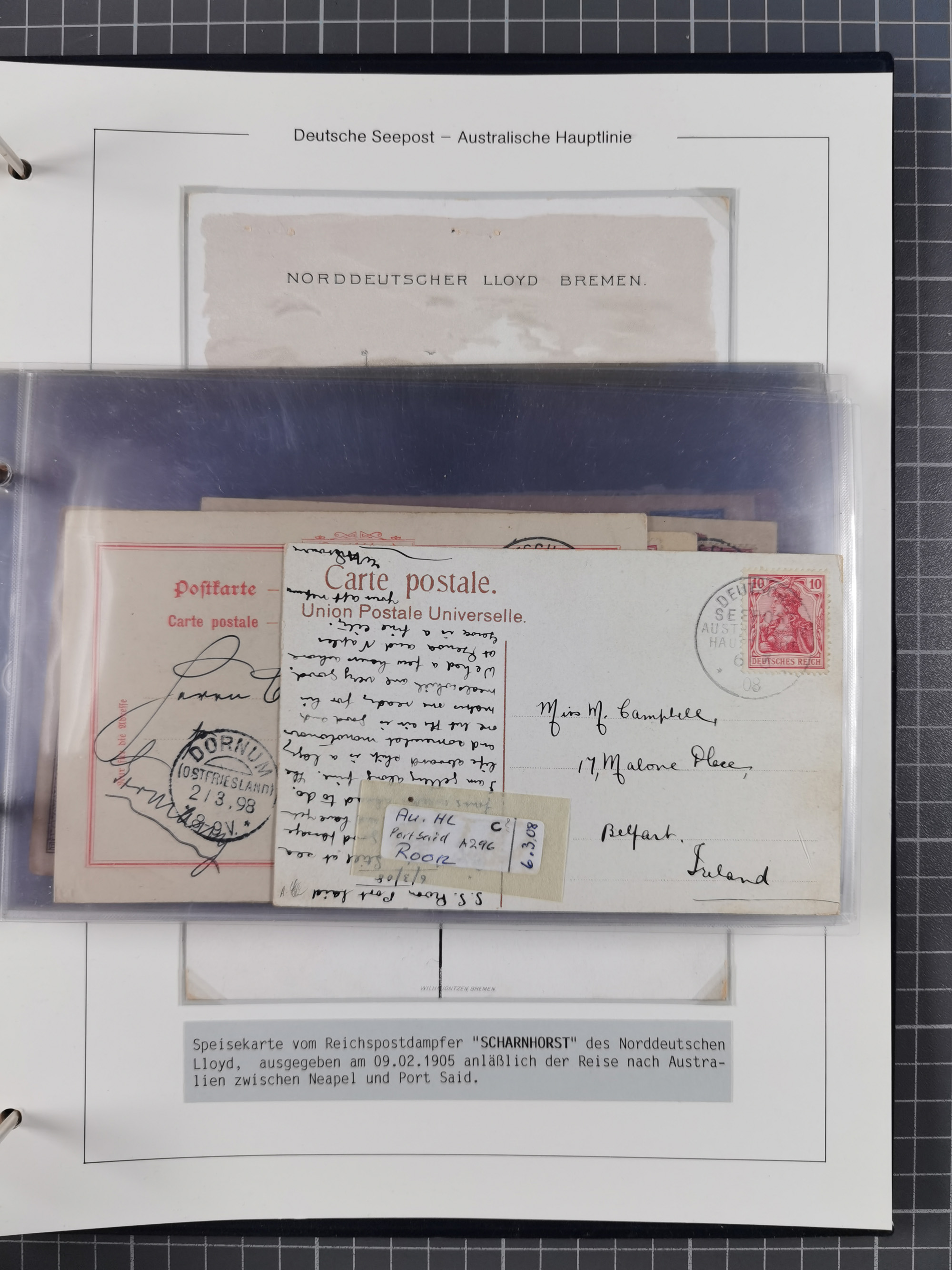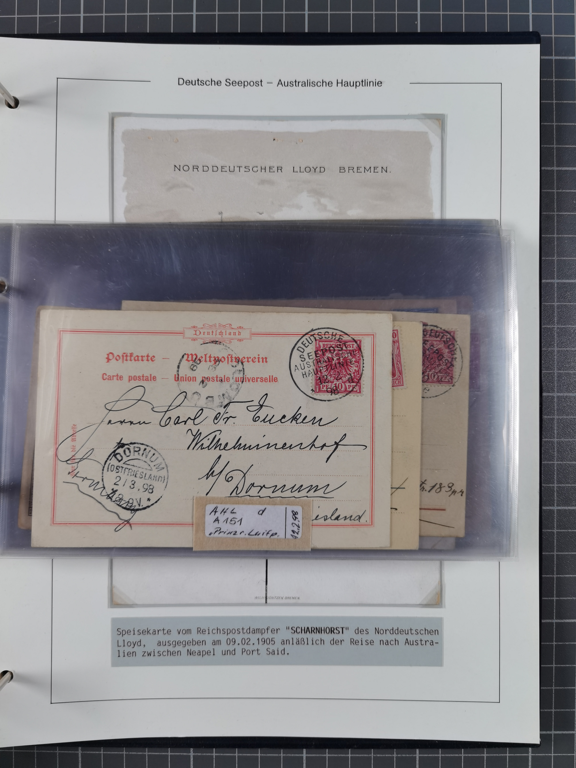 1887/1912, kleine Sammlung “DSP AUSTRALISCHE HAUPTLINIE” mit 35 Briefen, Karten und GSK, dabei frühe Post mit Aufgabe-Vermerken u.a. aus Aden, Port Sauíd und Suez, dazu eine Speisekarte vom Reichspostdampfer Scharnhorst 1905. Zum Teil kleine Spuren, meist in guter Erhaltung, ex Steinmeyer