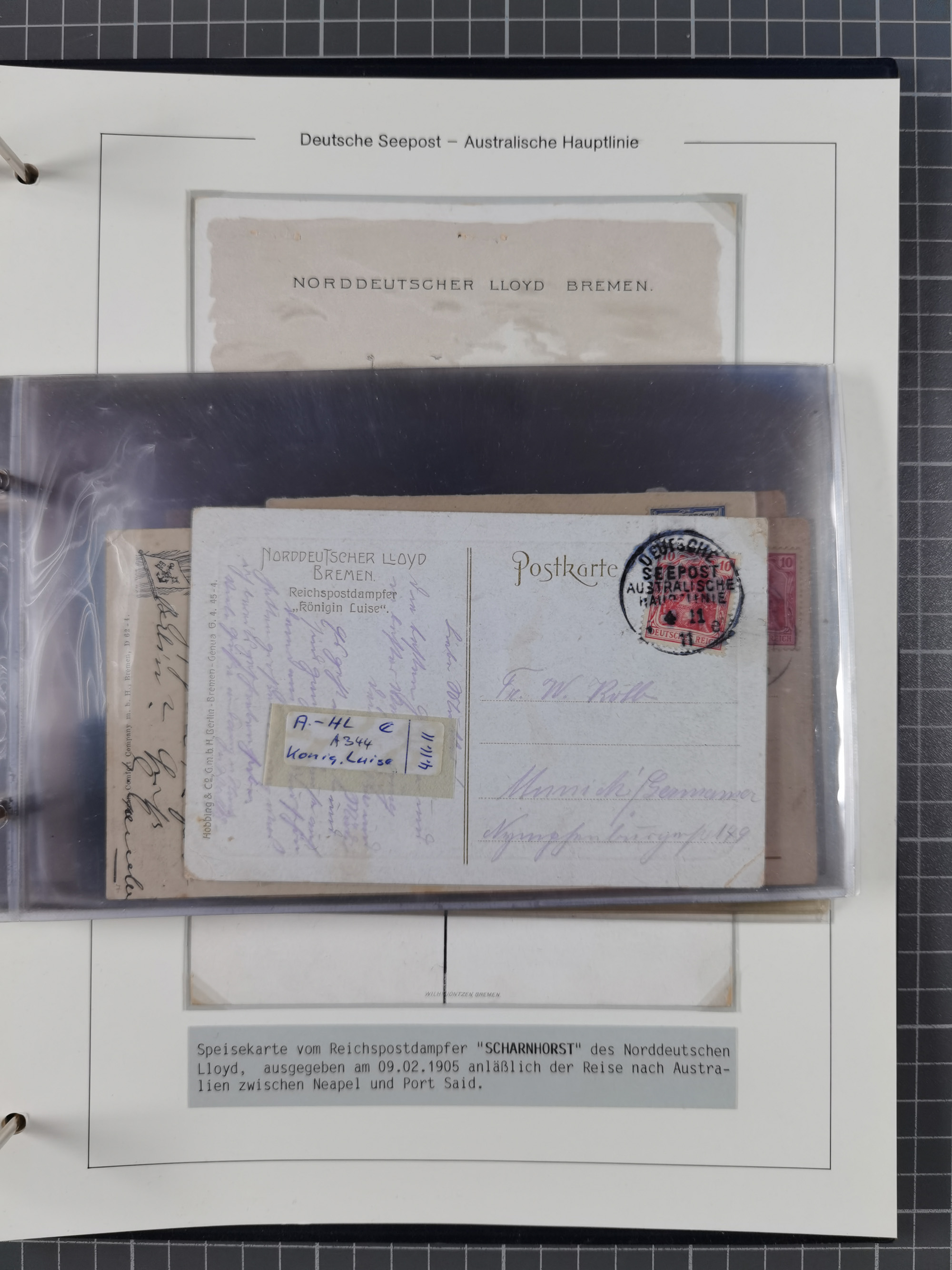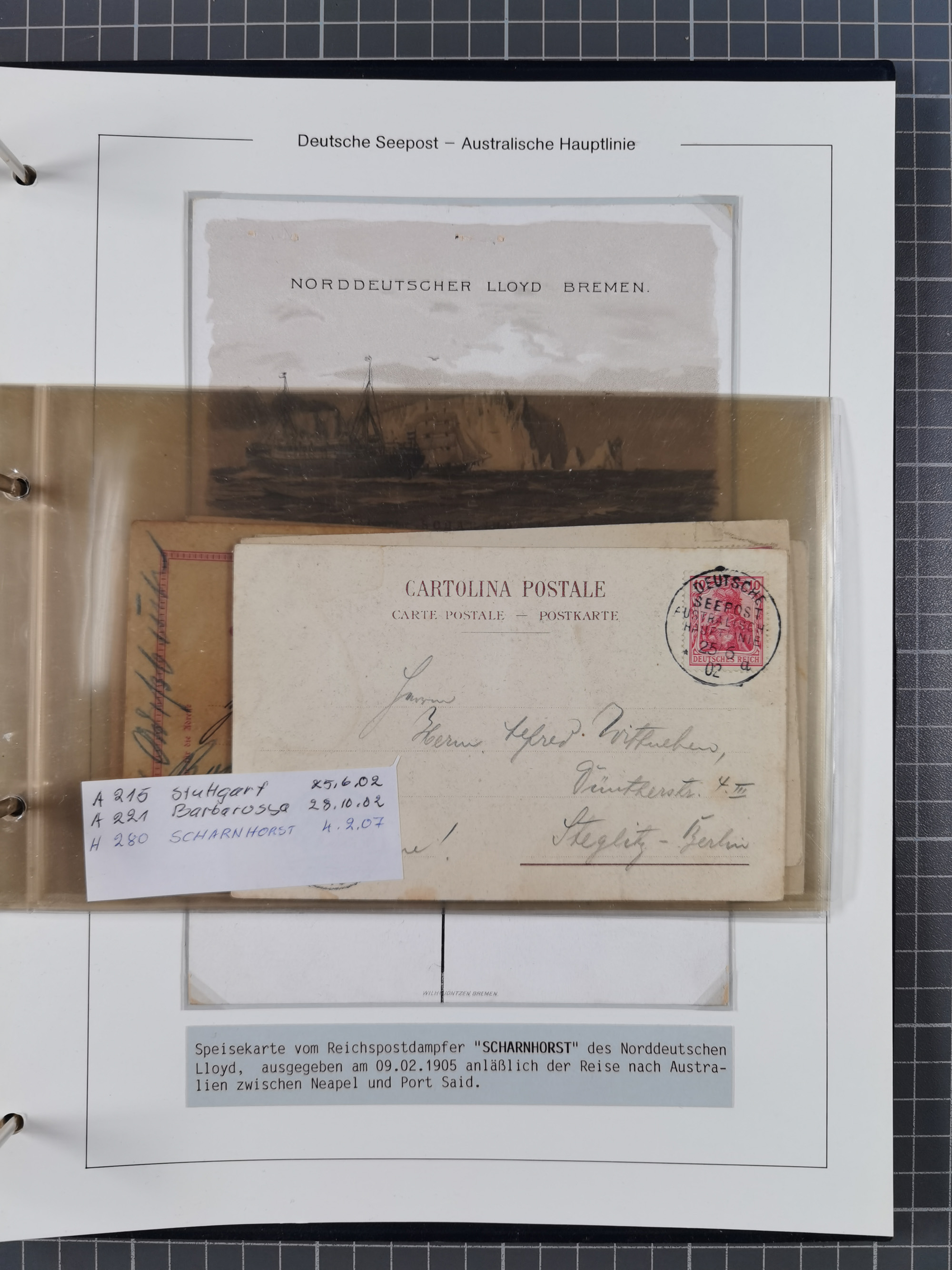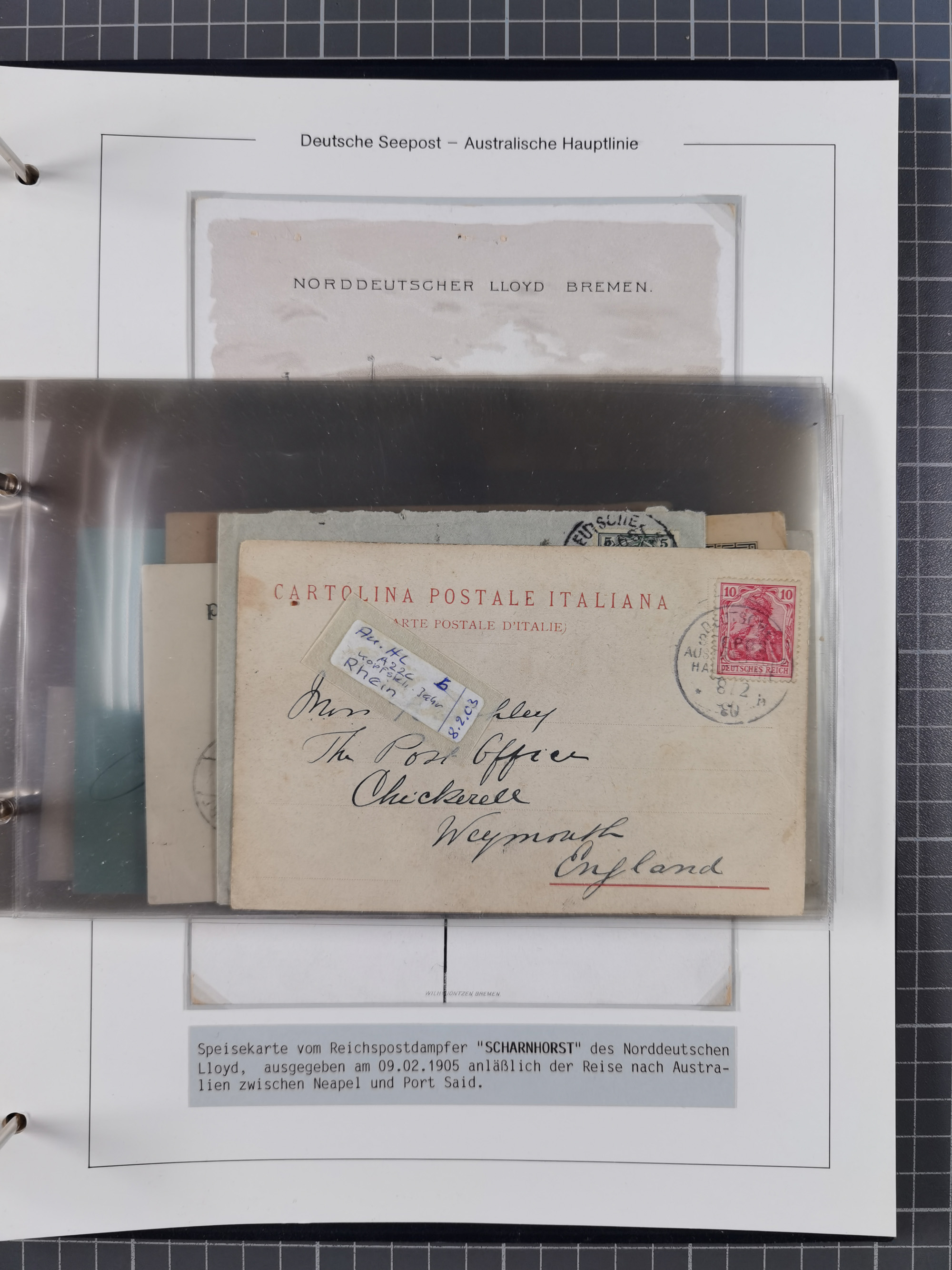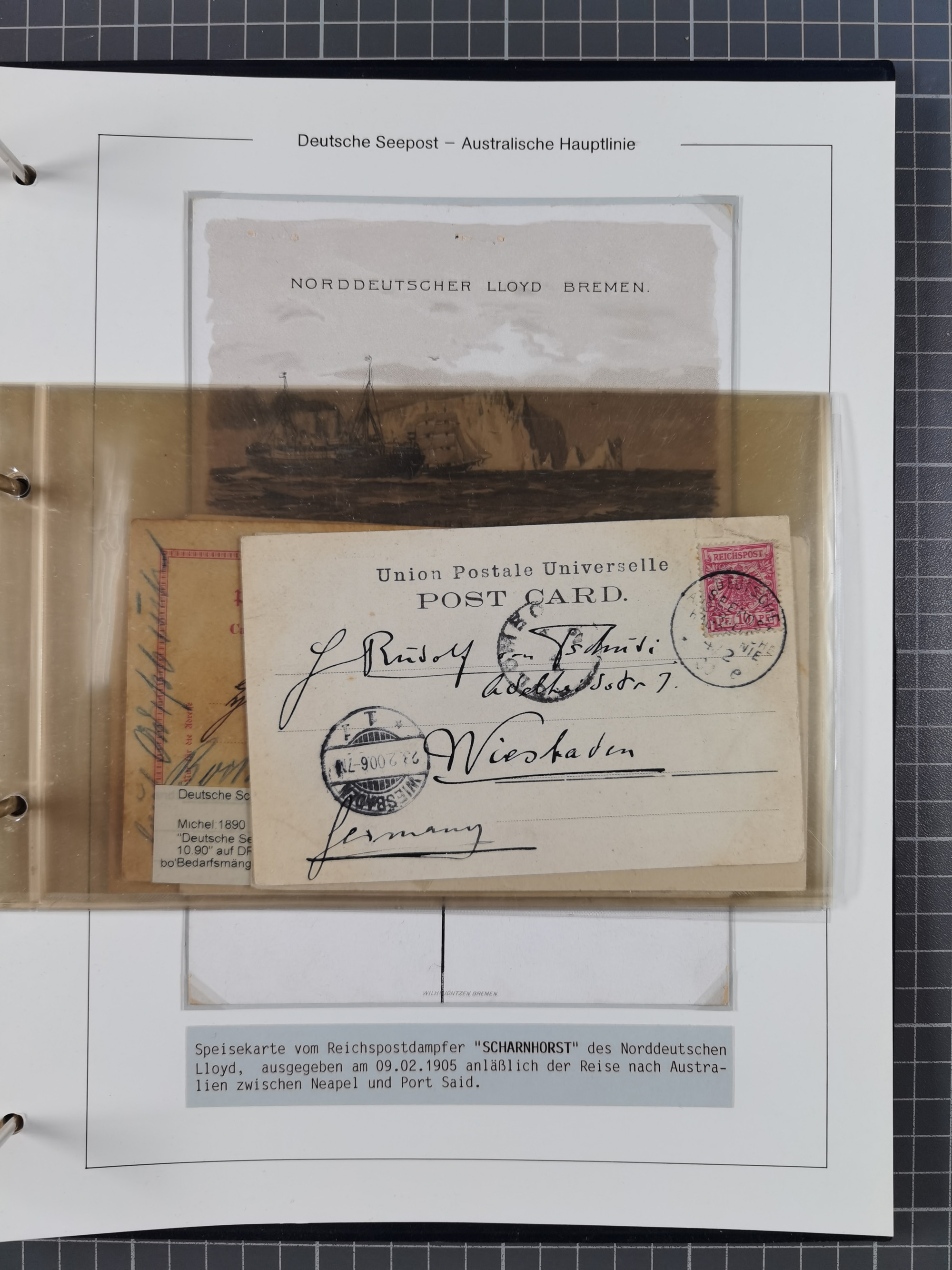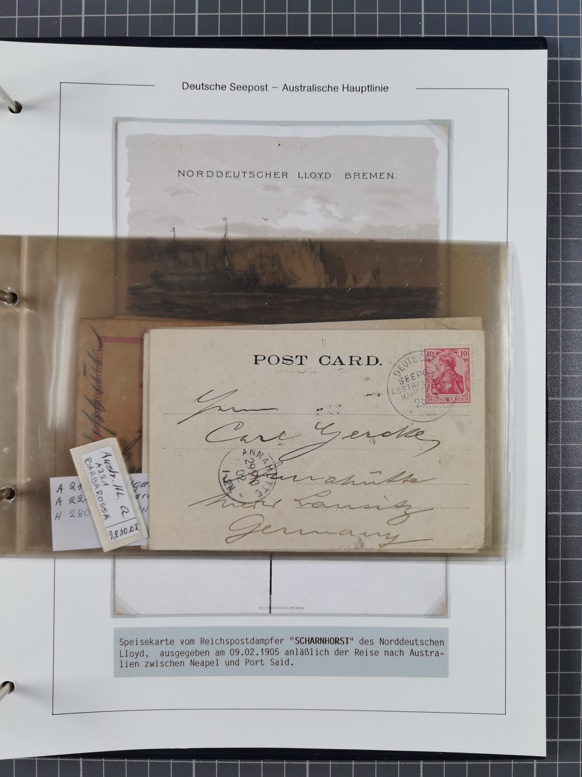 1887/1912, kleine Sammlung “DSP AUSTRALISCHE HAUPTLINIE” mit 35 Briefen, Karten und GSK, dabei frühe Post mit Aufgabe-Vermerken u.a. aus Aden, Port Sauíd und Suez, dazu eine Speisekarte vom Reichspostdampfer Scharnhorst 1905. Zum Teil kleine Spuren, meist in guter Erhaltung, ex Steinmeyer