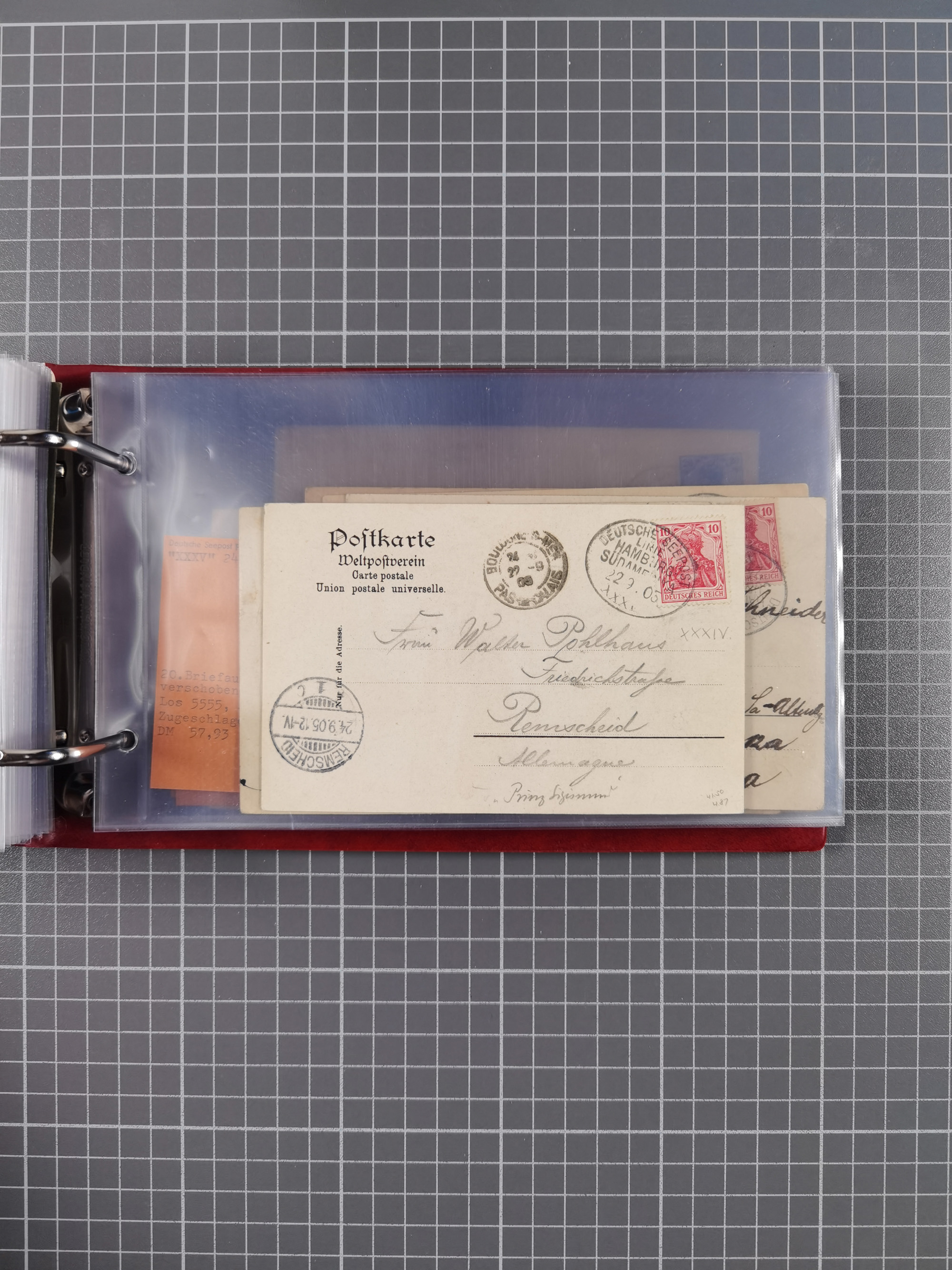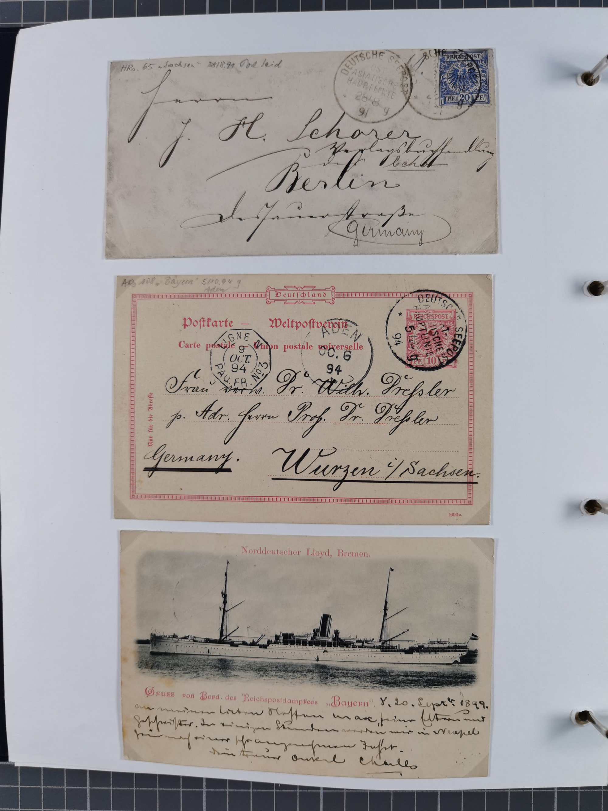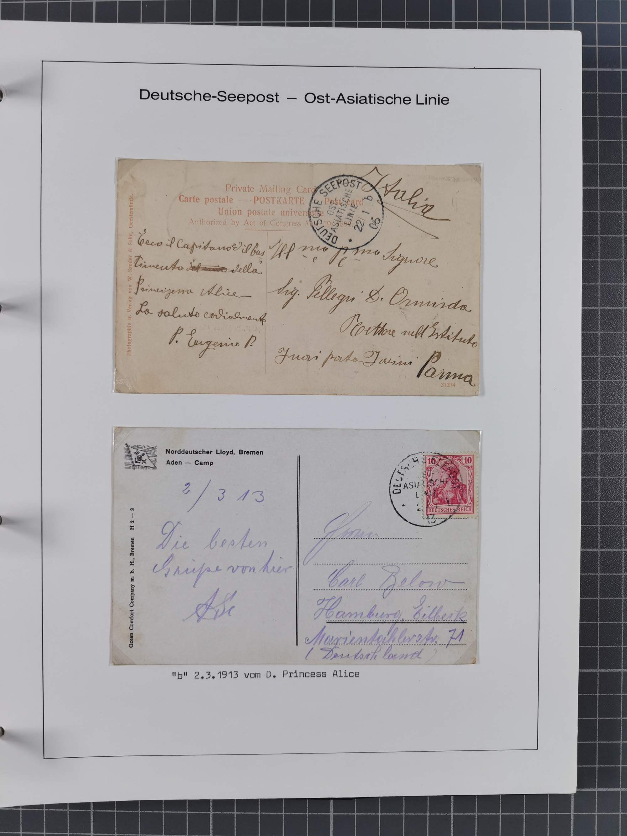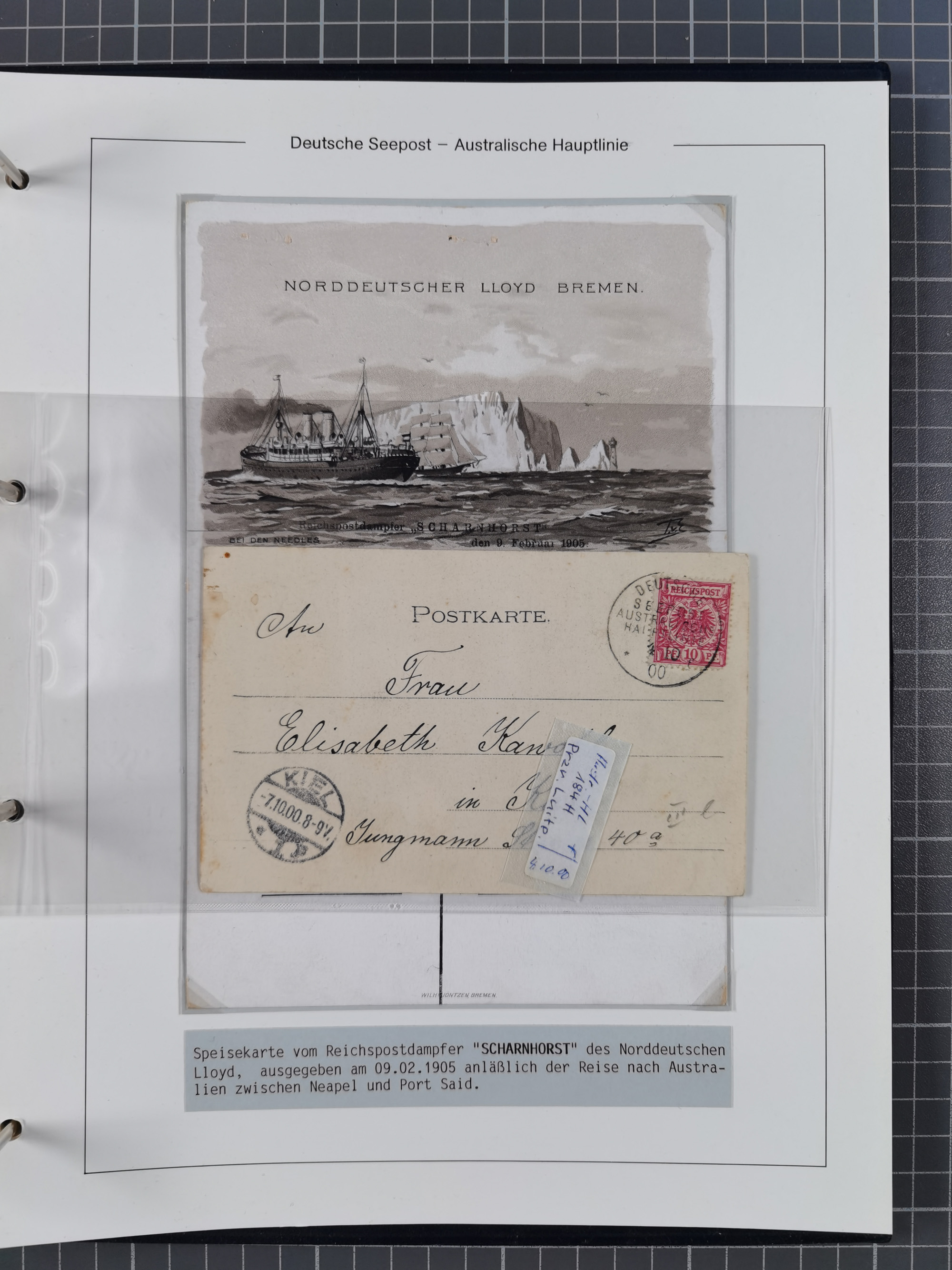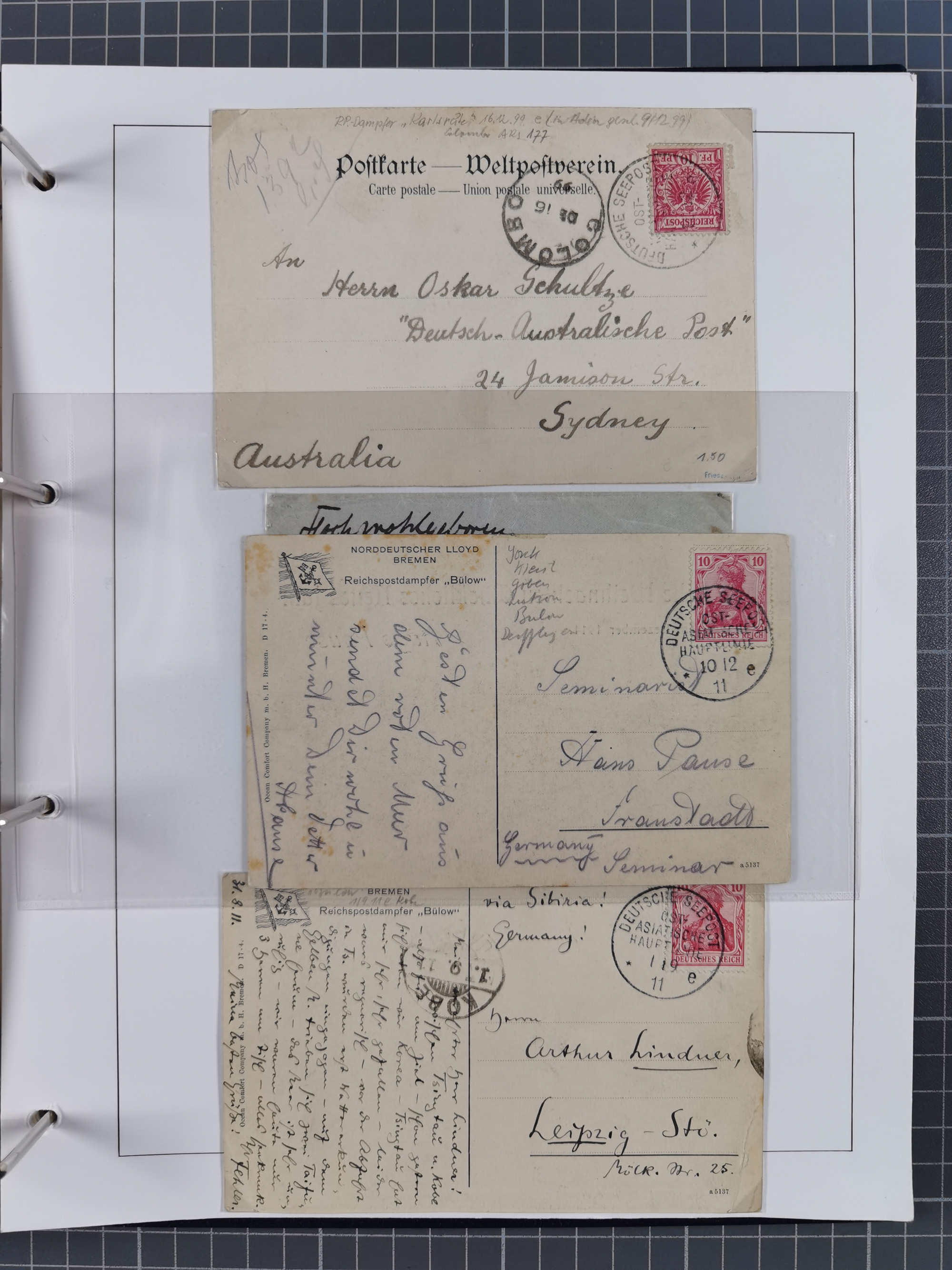1887/1912, kleine Sammlung “DSP AUSTRALISCHE HAUPTLINIE” mit 35 Briefen, Karten und GSK, dabei frühe Post mit Aufgabe-Vermerken u.a. aus Aden, Port Sauíd und Suez, dazu eine Speisekarte vom Reichspostdampfer Scharnhorst 1905. Zum Teil kleine Spuren, meist in guter Erhaltung, ex Steinmeyer