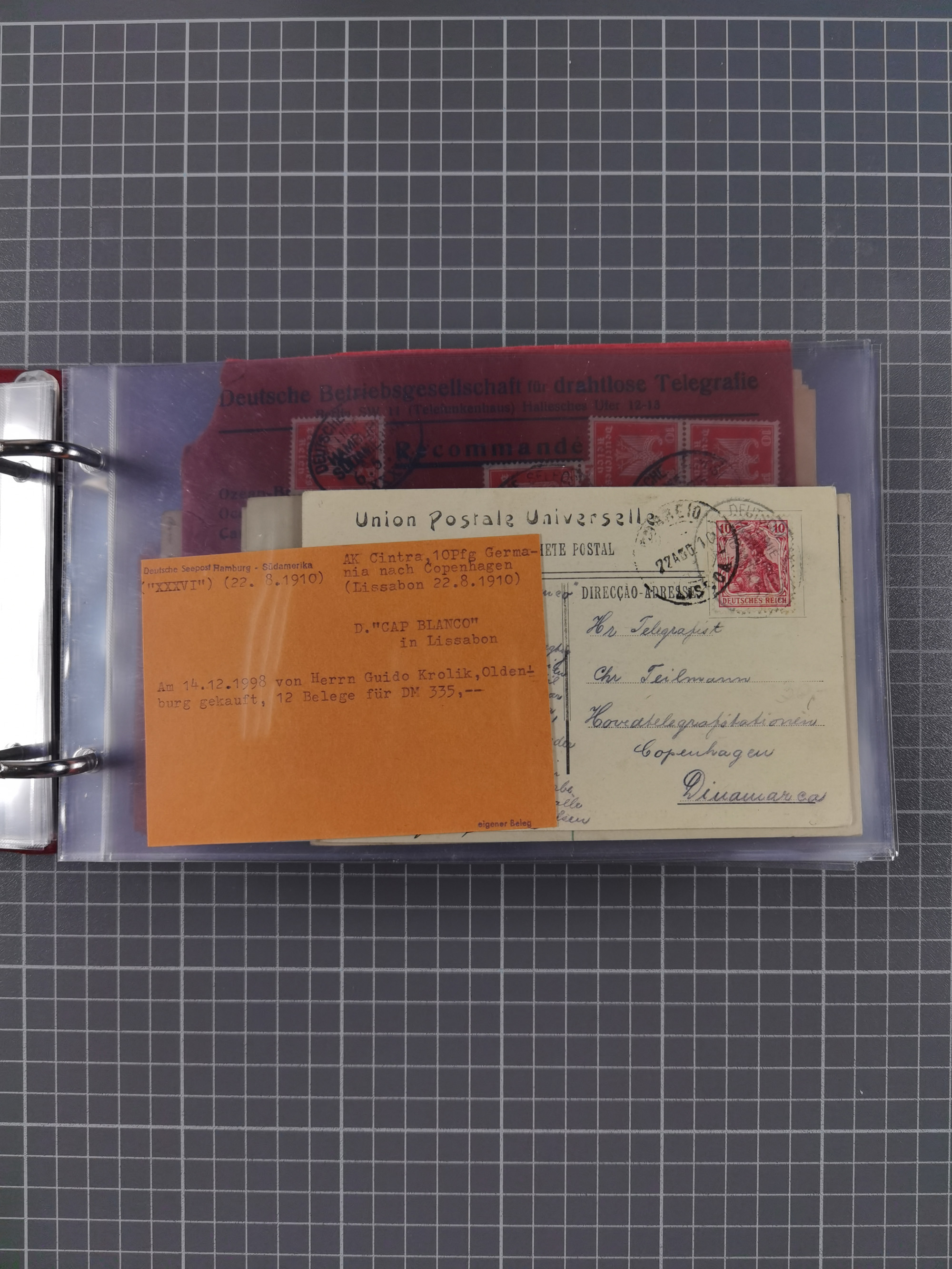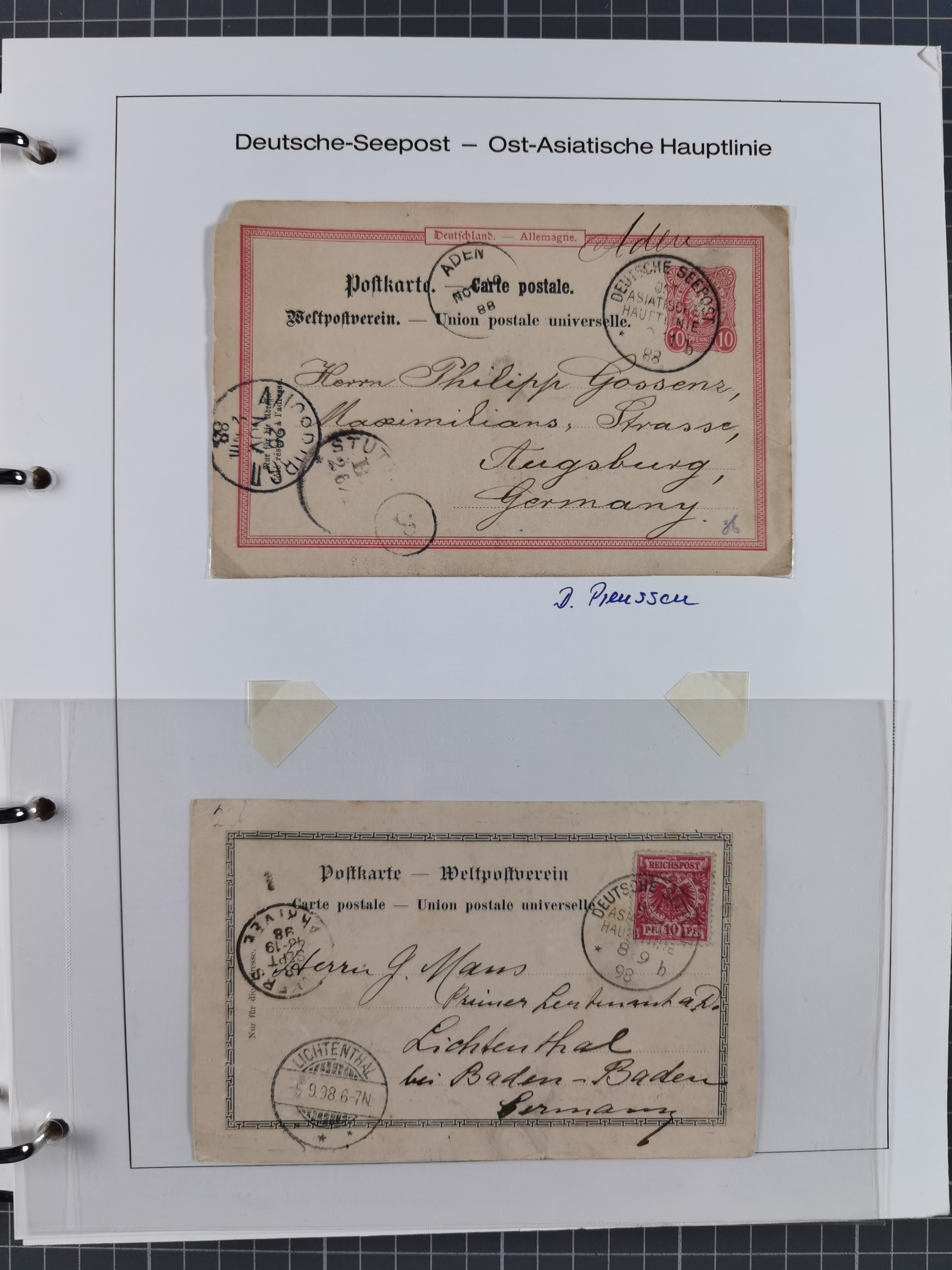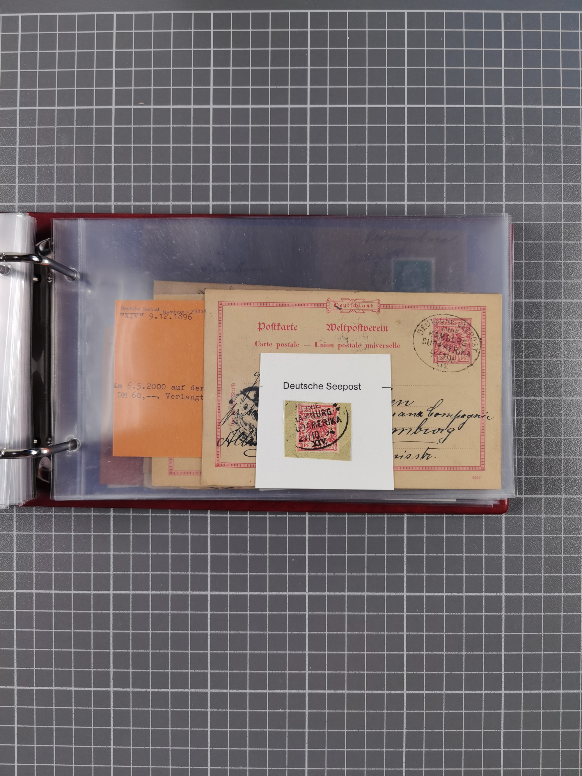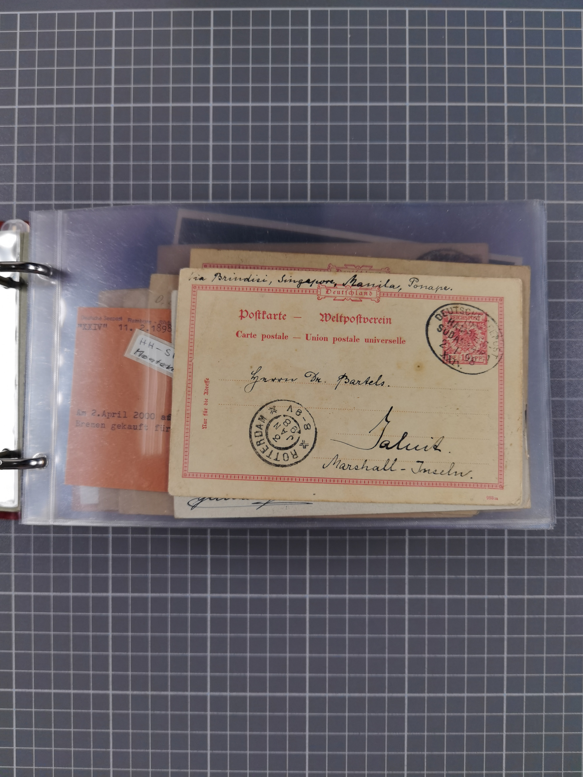 1887/1912, kleine Sammlung “DSP AUSTRALISCHE HAUPTLINIE” mit 35 Briefen, Karten und GSK, dabei frühe Post mit Aufgabe-Vermerken u.a. aus Aden, Port Sauíd und Suez, dazu eine Speisekarte vom Reichspostdampfer Scharnhorst 1905. Zum Teil kleine Spuren, meist in guter Erhaltung, ex Steinmeyer