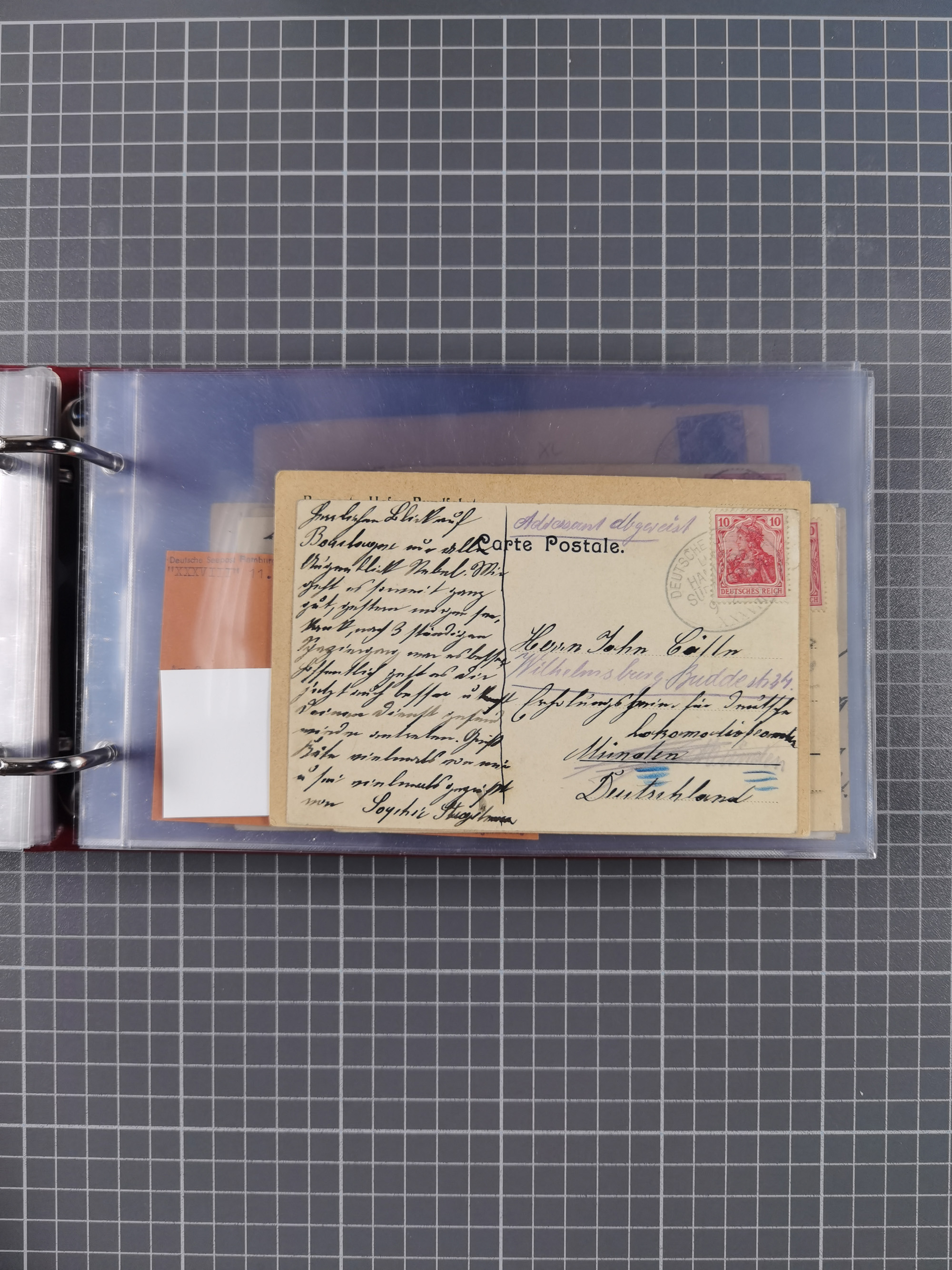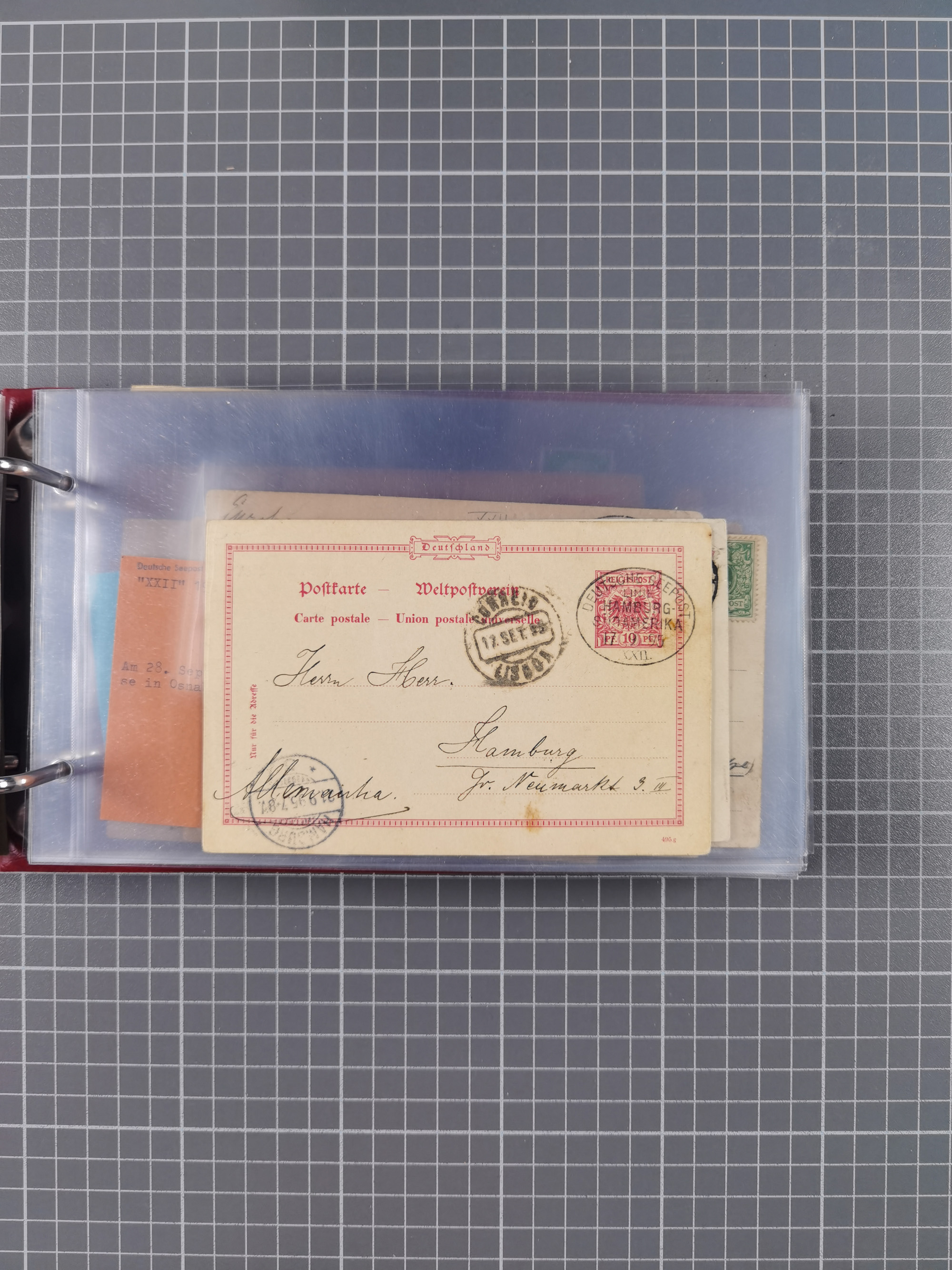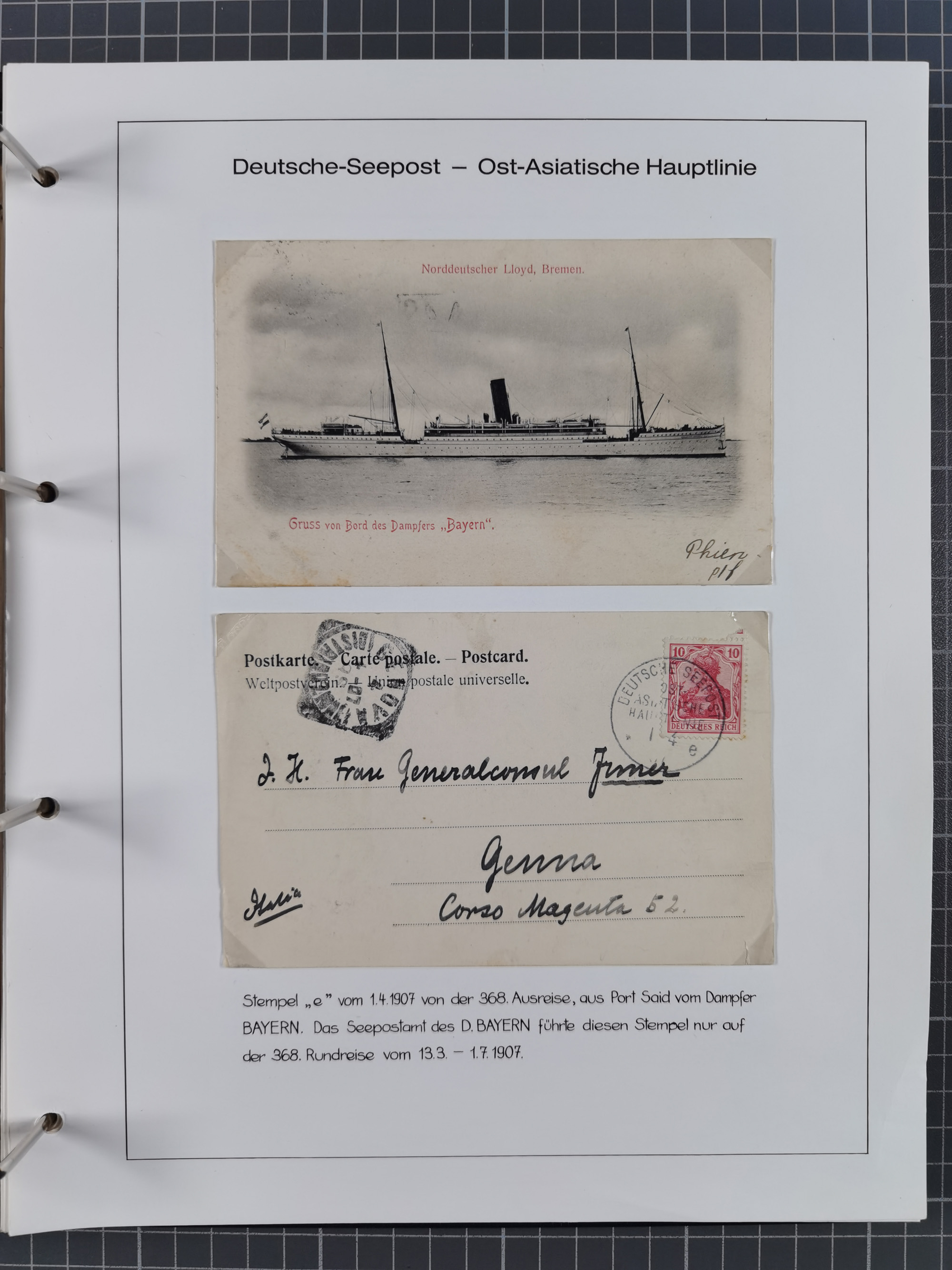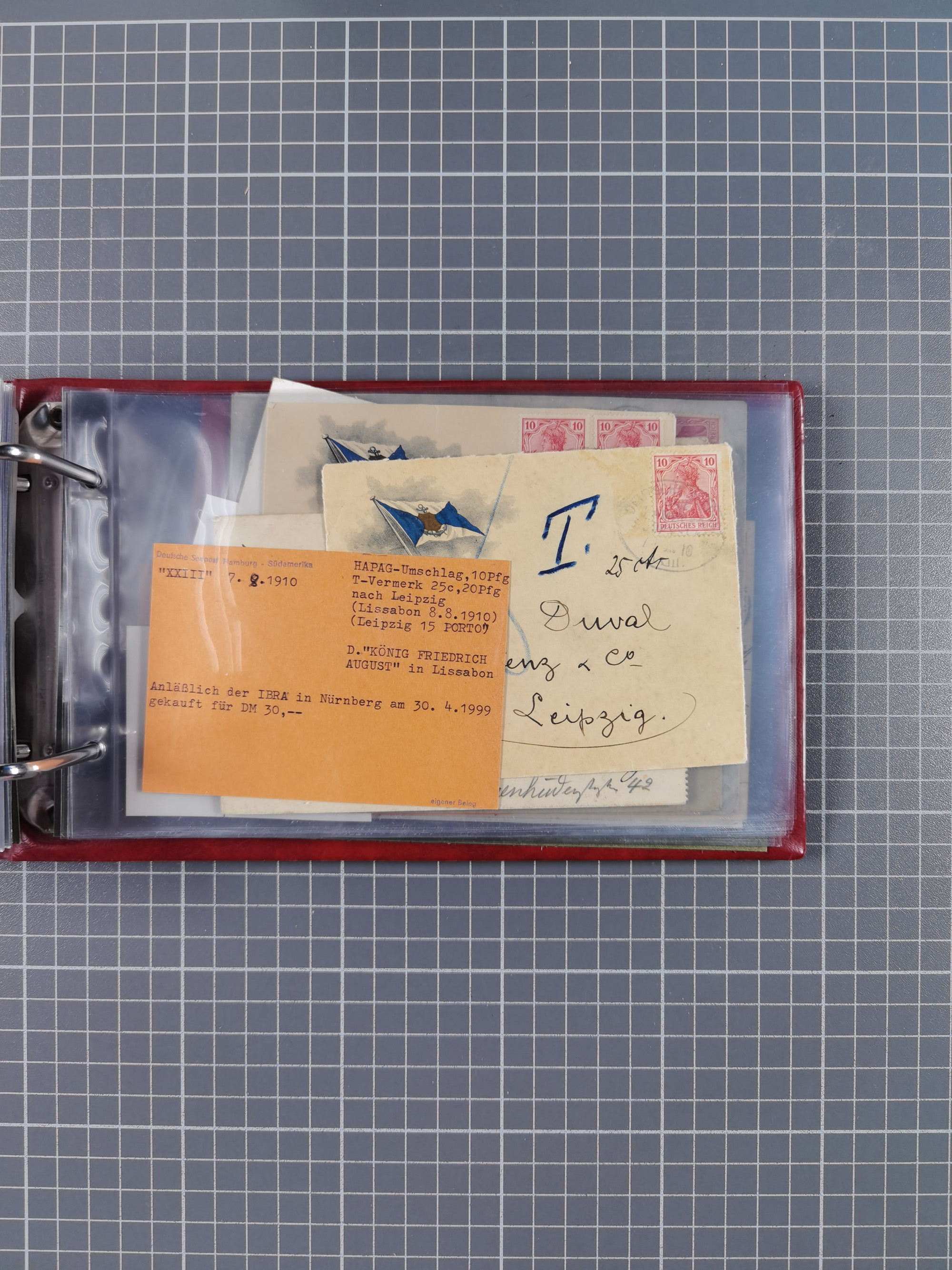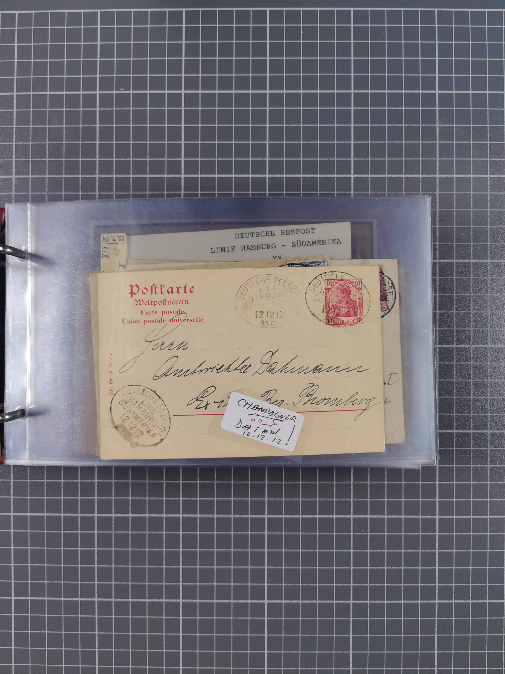 1887/1912, kleine Sammlung “DSP AUSTRALISCHE HAUPTLINIE” mit 35 Briefen, Karten und GSK, dabei frühe Post mit Aufgabe-Vermerken u.a. aus Aden, Port Sauíd und Suez, dazu eine Speisekarte vom Reichspostdampfer Scharnhorst 1905. Zum Teil kleine Spuren, meist in guter Erhaltung, ex Steinmeyer
