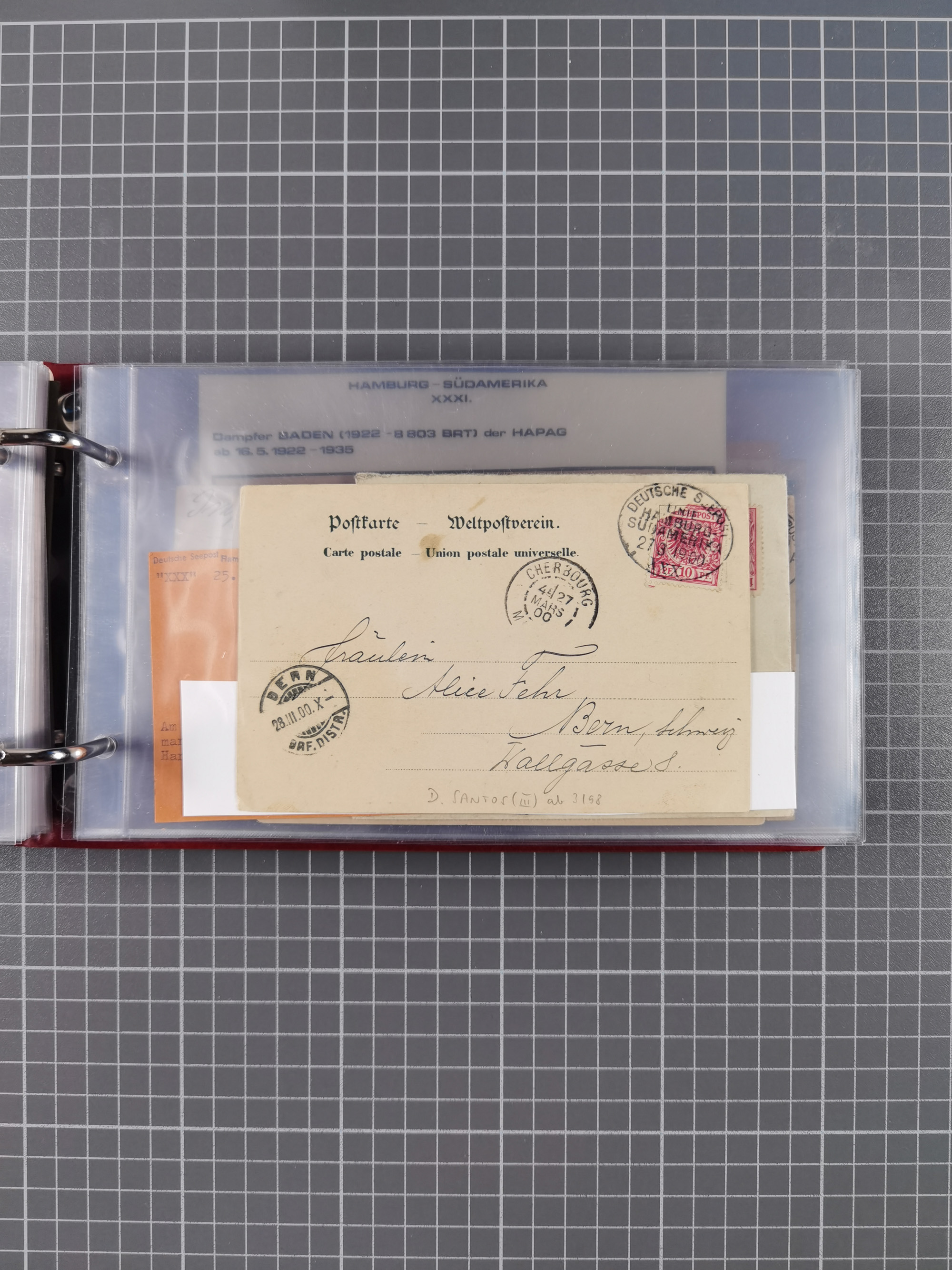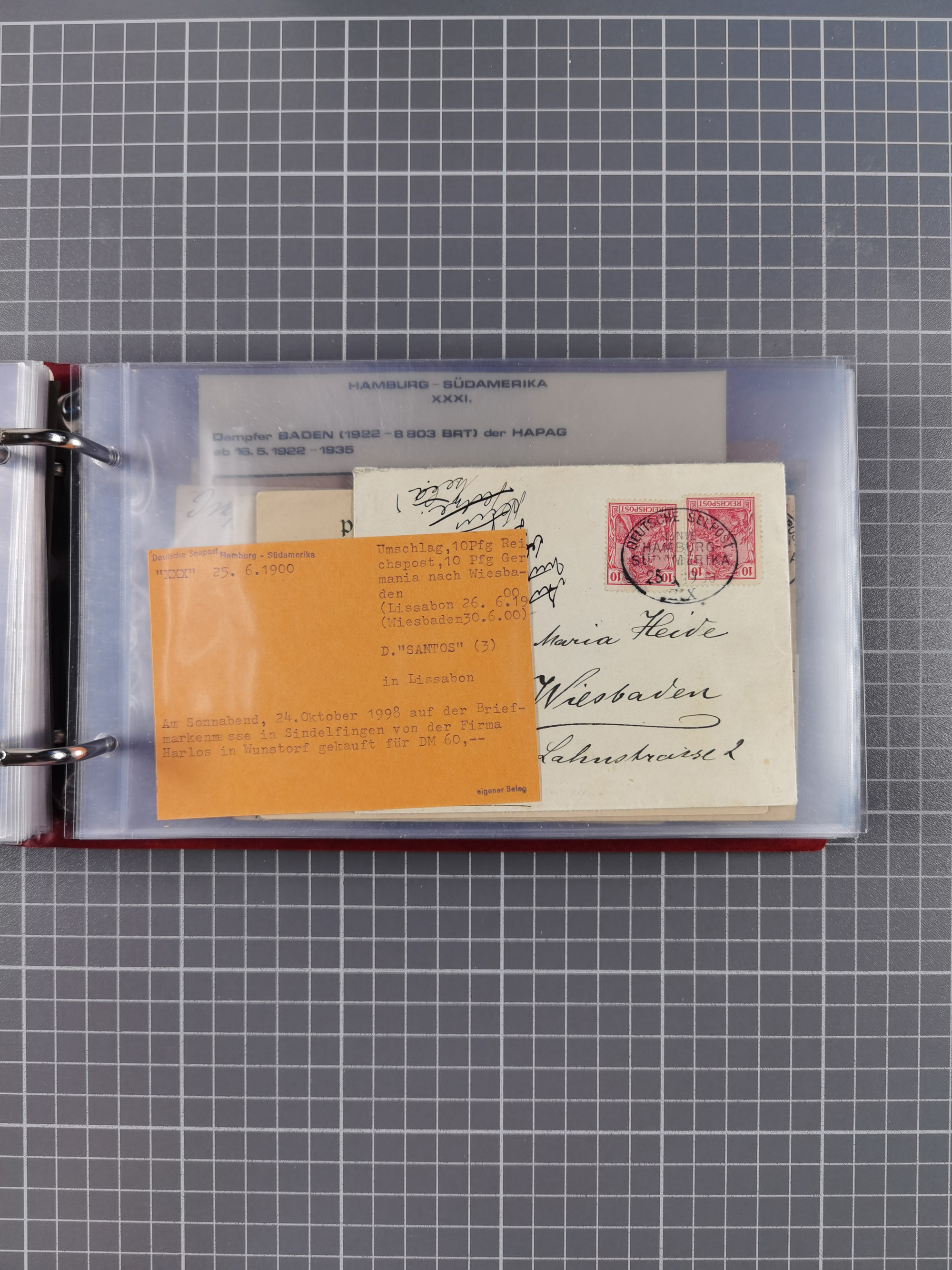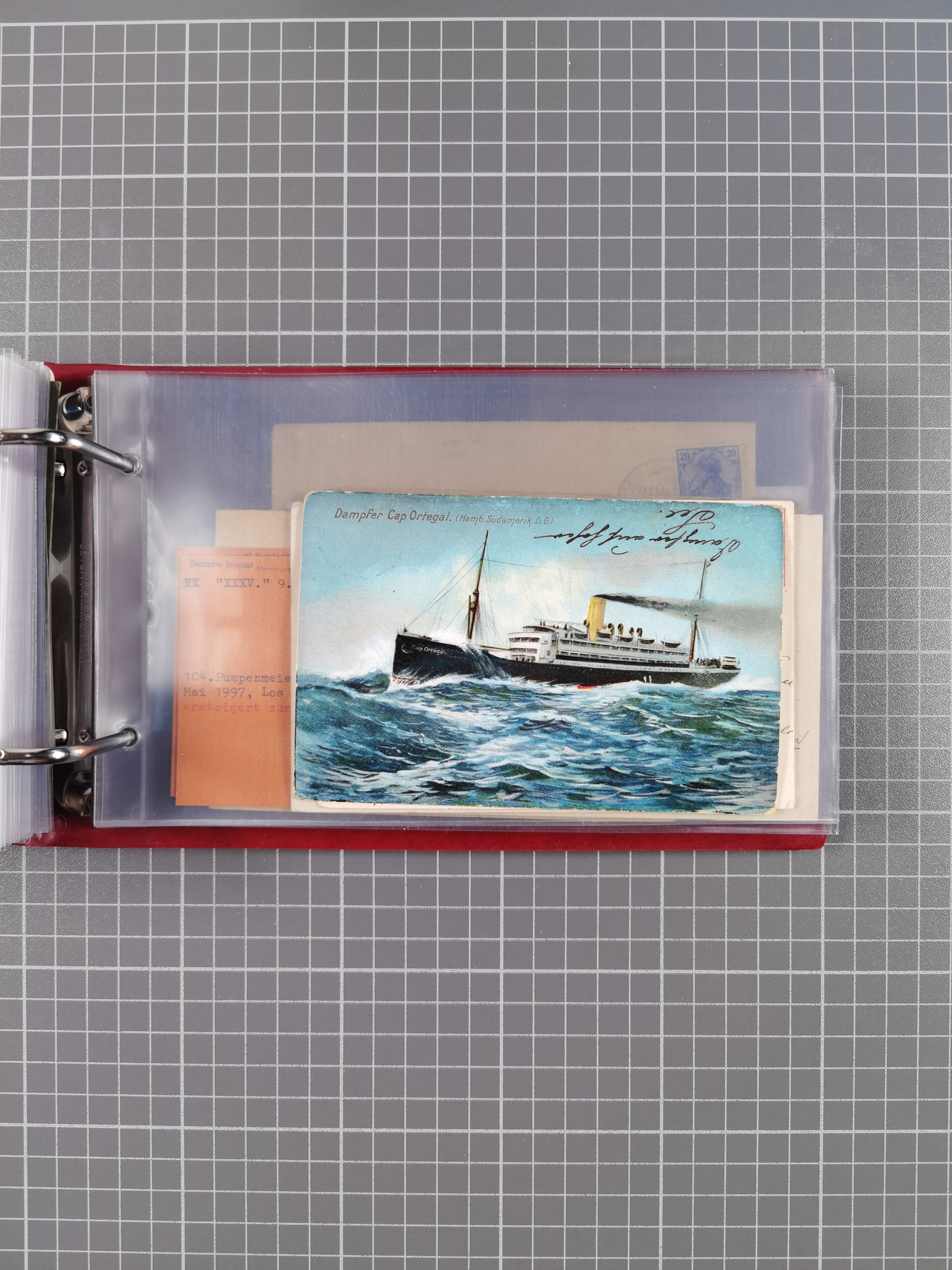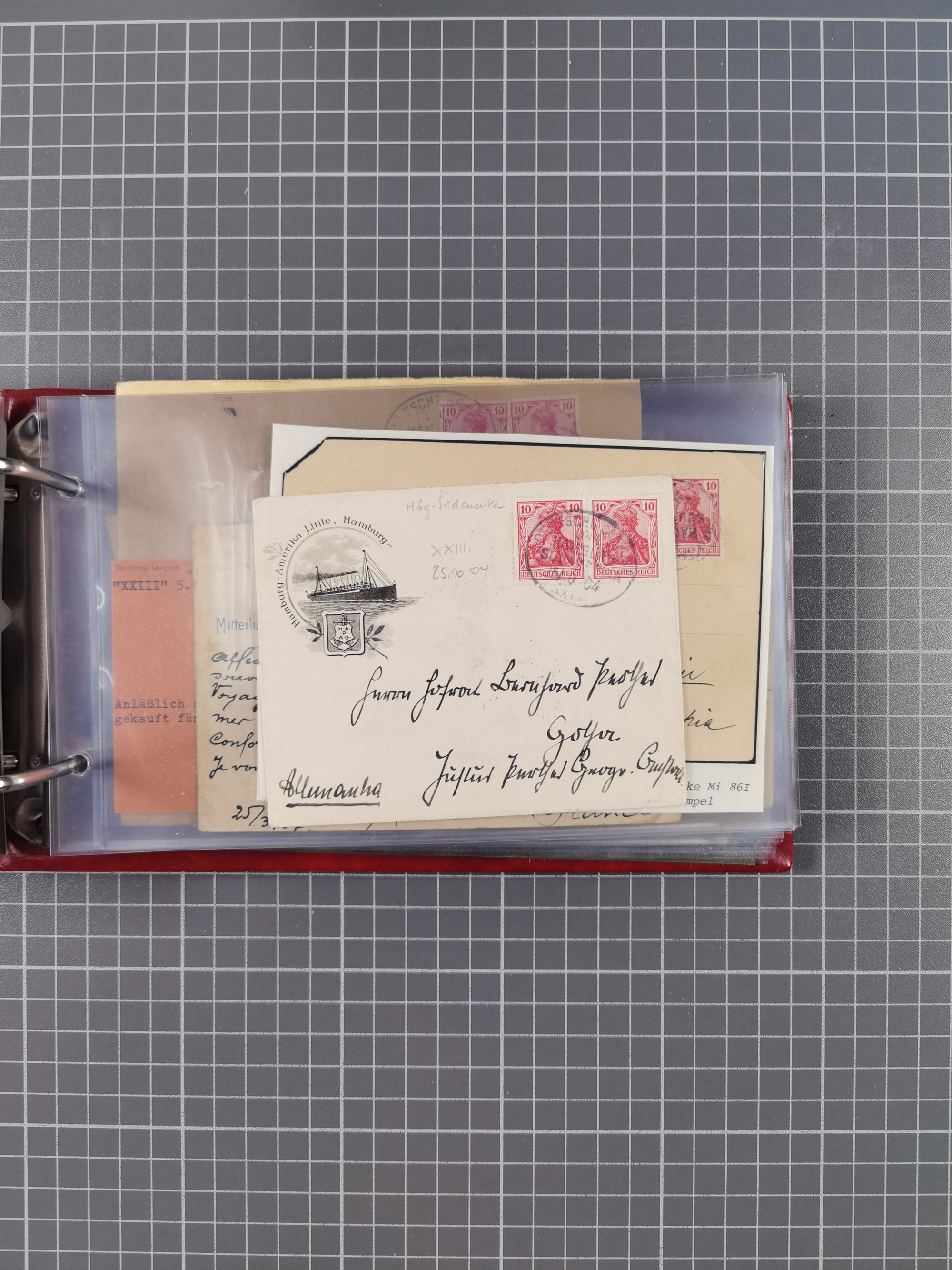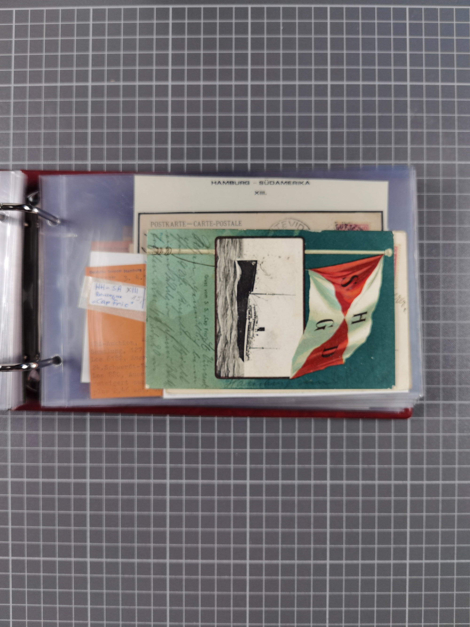 1826/1938, kleine Sammlung “Schiffspost aus Hamburg” mit ca. 35 Briefen, Karten und GSK, dabei u.a. Stempel “HAMBURG SCHIFFS BRIEF-POST” auf Faltbriefhülle 1826, Belege der Monte Oliva mit u.a. 40 Speisekarten und Belege D. Columbus. Dazu weitere Belege diverser Reisen mit u.a. London-Reise, Hamburg-Südamerika und Post der Monte Sarmiento mit über 40 Speisekarten sowie fünf Belege Gauturnfahrt 1935. Meist auf Albenblättern mit Beschriftung, ex Steinmeyer