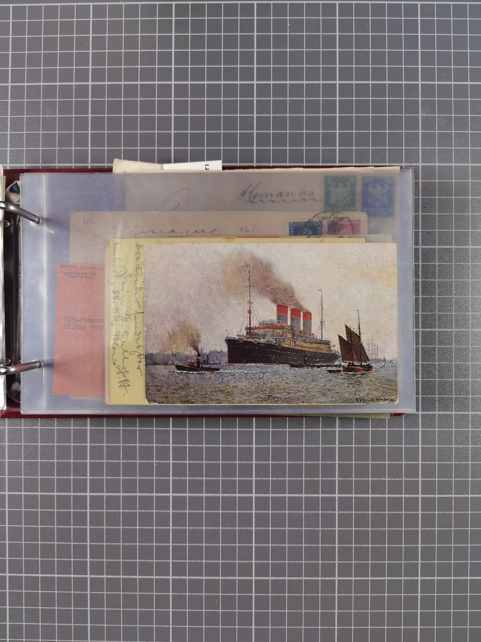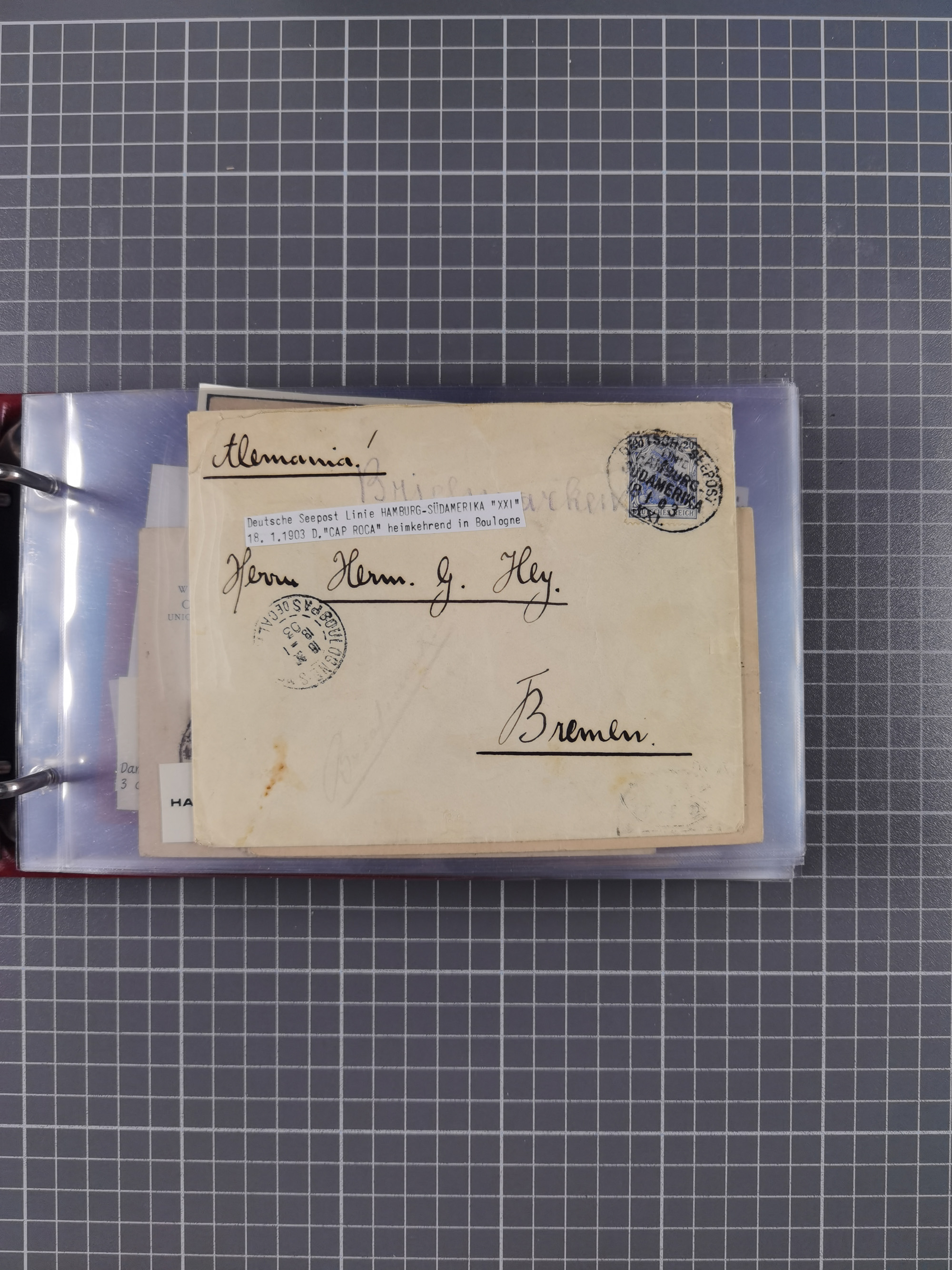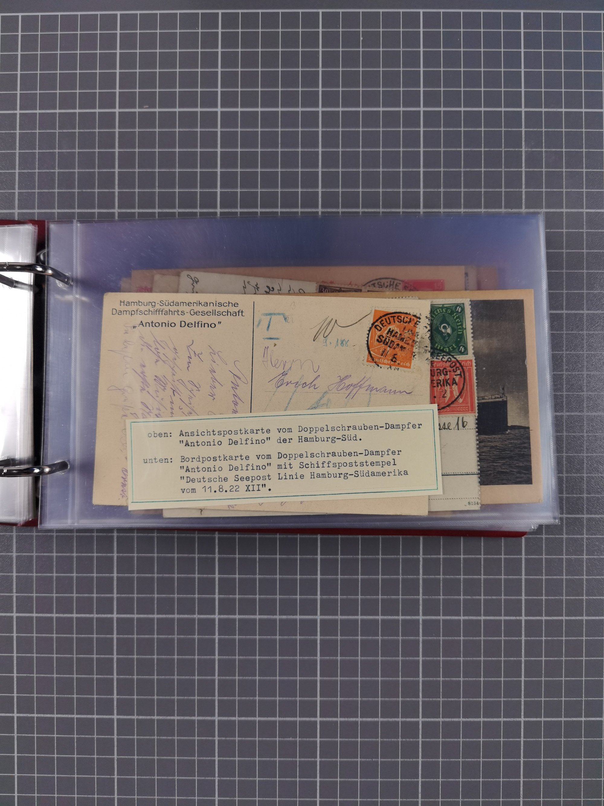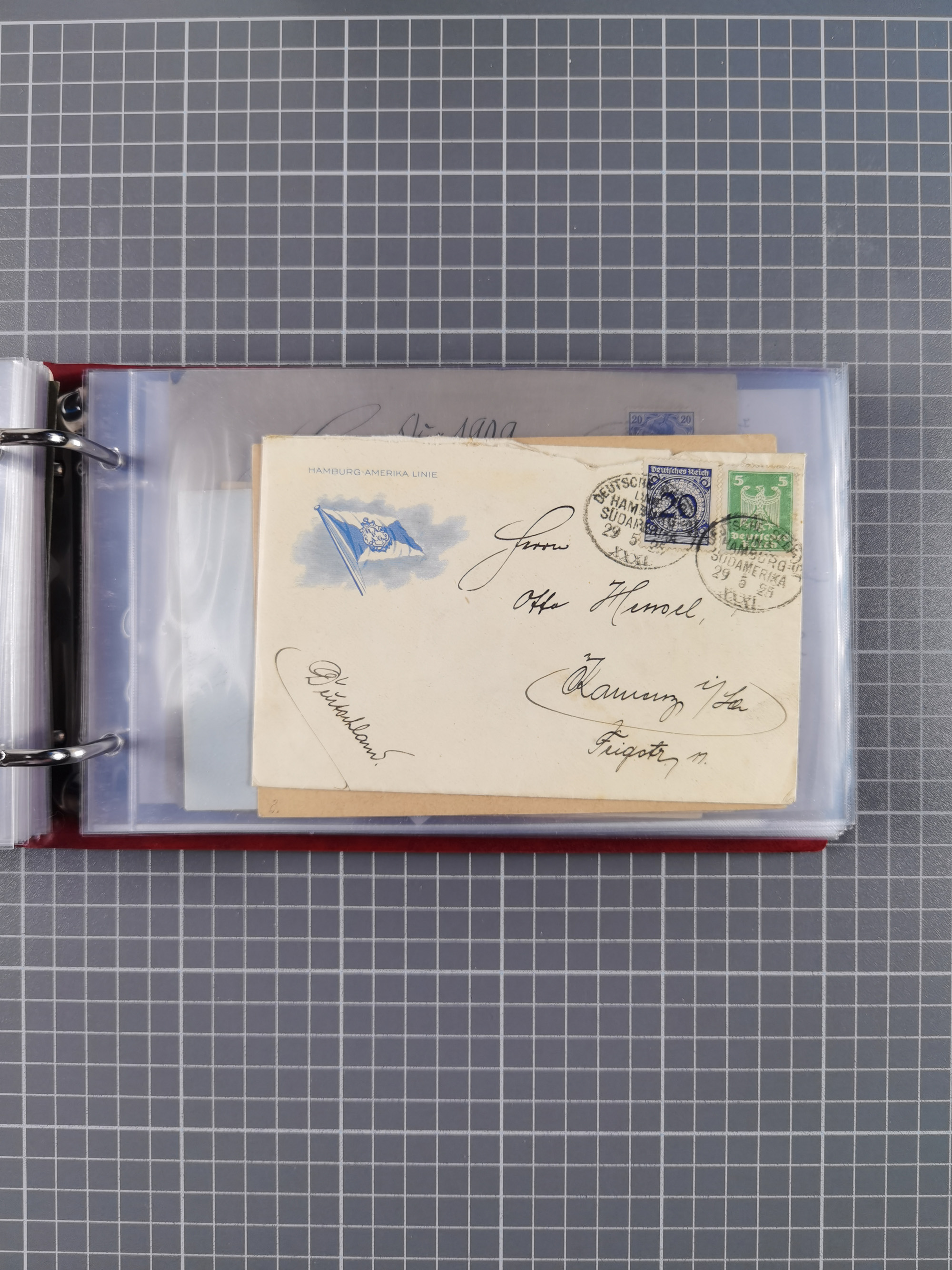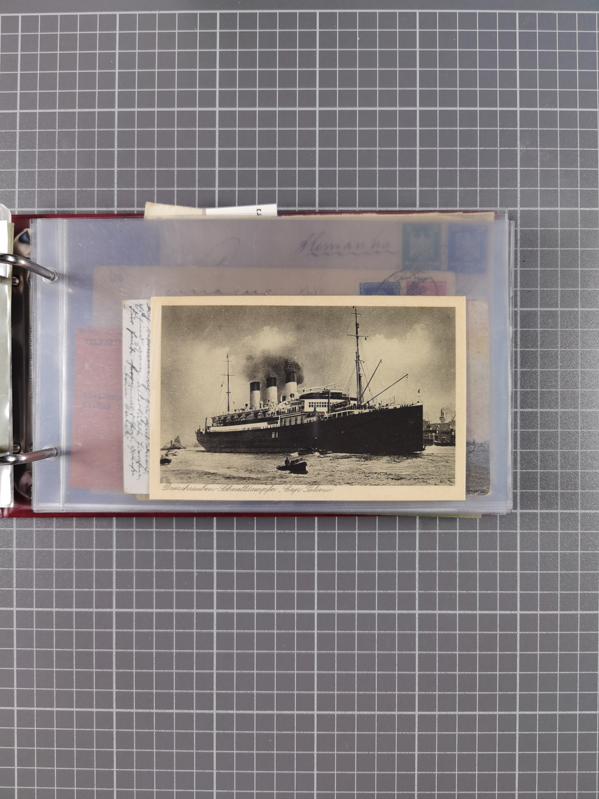 1826/1938, kleine Sammlung “Schiffspost aus Hamburg” mit ca. 35 Briefen, Karten und GSK, dabei u.a. Stempel “HAMBURG SCHIFFS BRIEF-POST” auf Faltbriefhülle 1826, Belege der Monte Oliva mit u.a. 40 Speisekarten und Belege D. Columbus. Dazu weitere Belege diverser Reisen mit u.a. London-Reise, Hamburg-Südamerika und Post der Monte Sarmiento mit über 40 Speisekarten sowie fünf Belege Gauturnfahrt 1935. Meist auf Albenblättern mit Beschriftung, ex Steinmeyer
