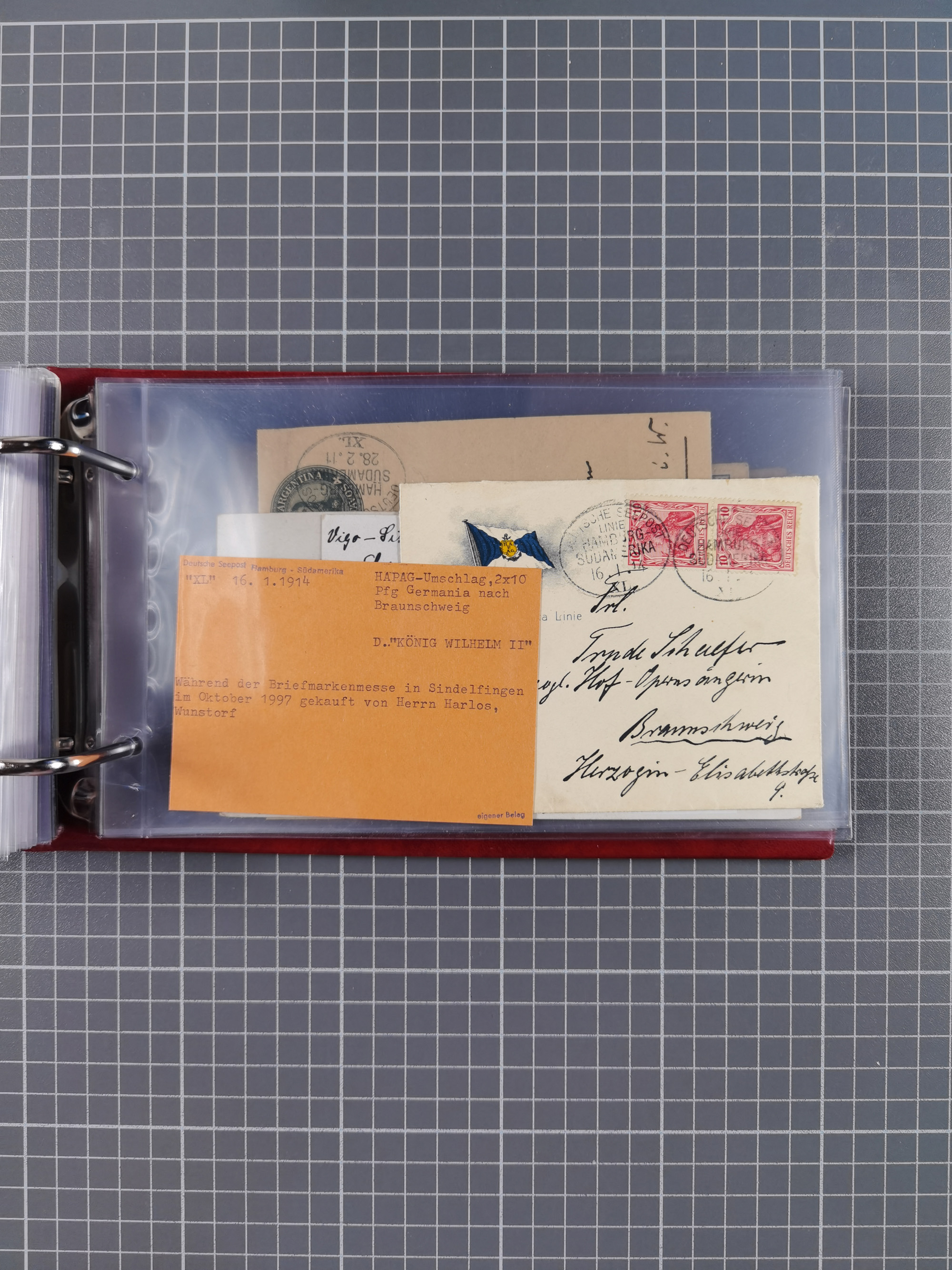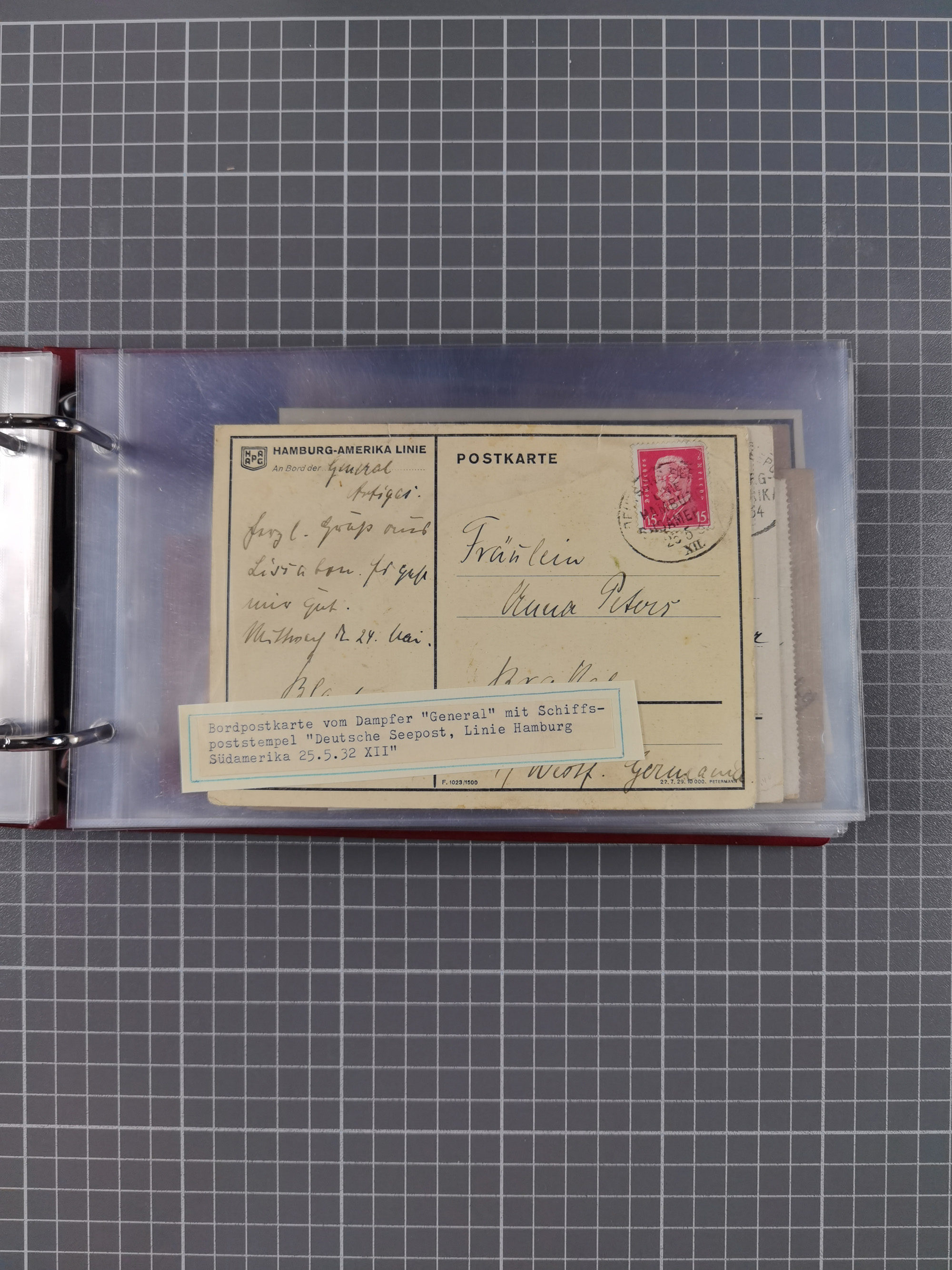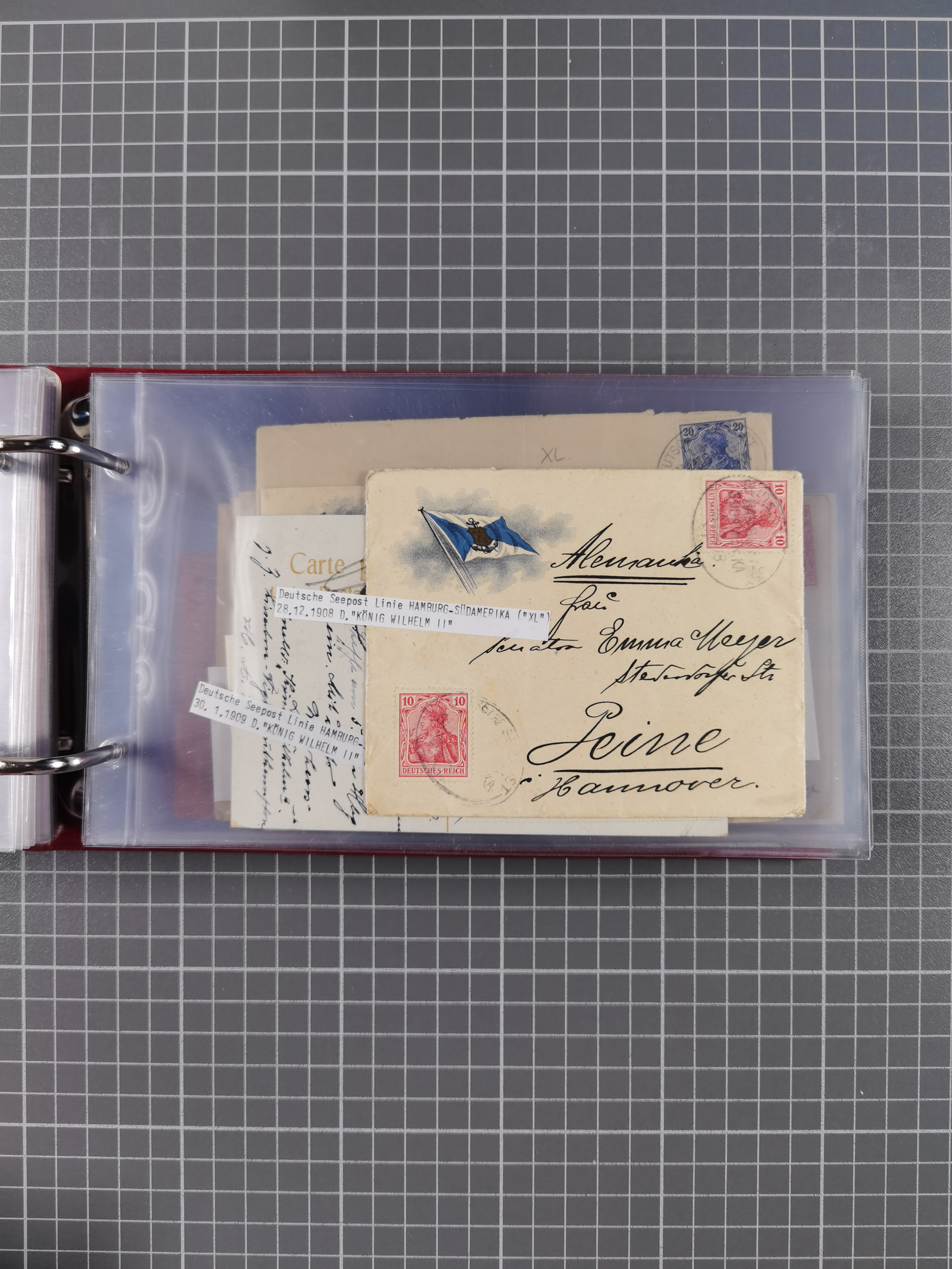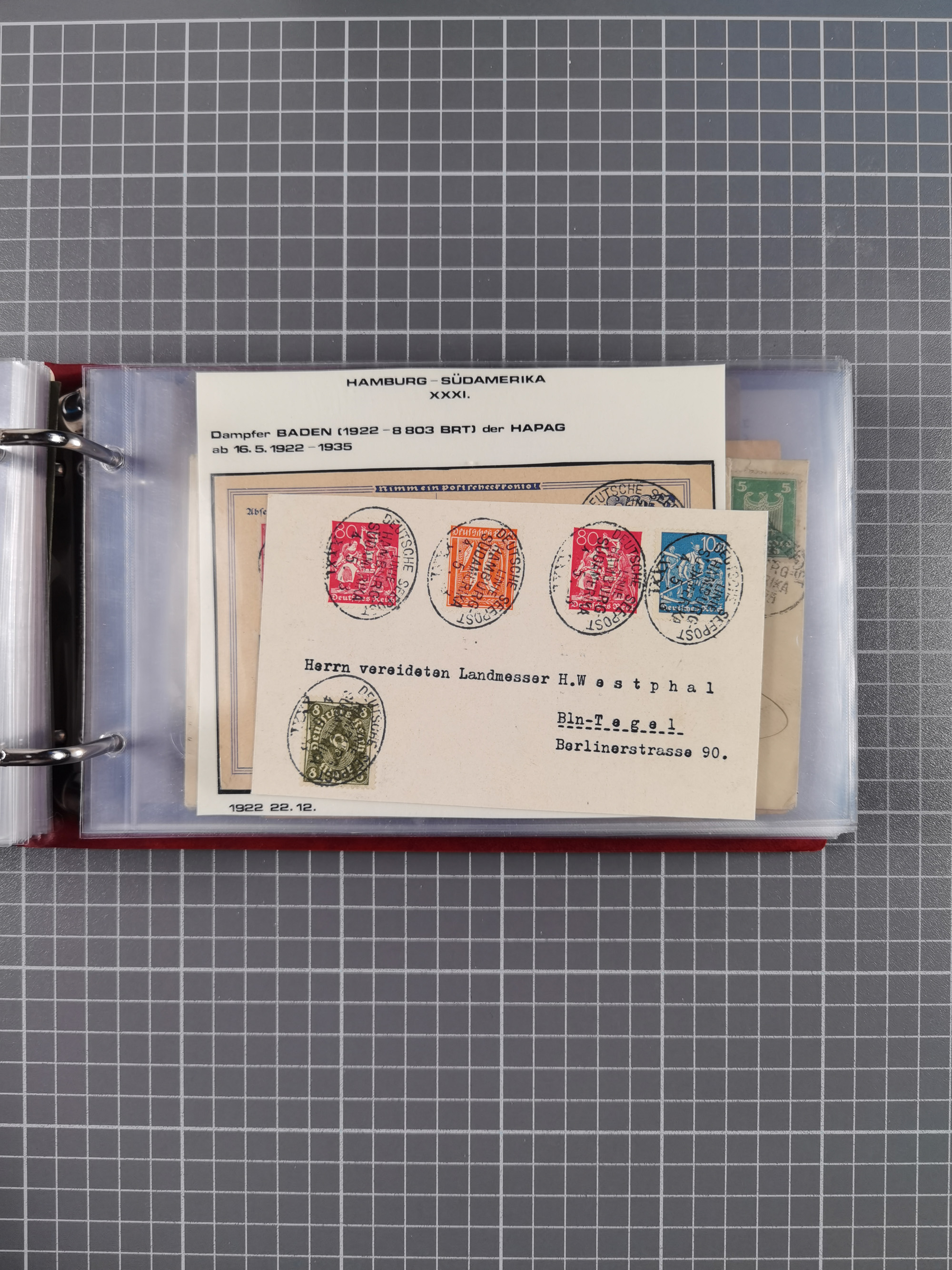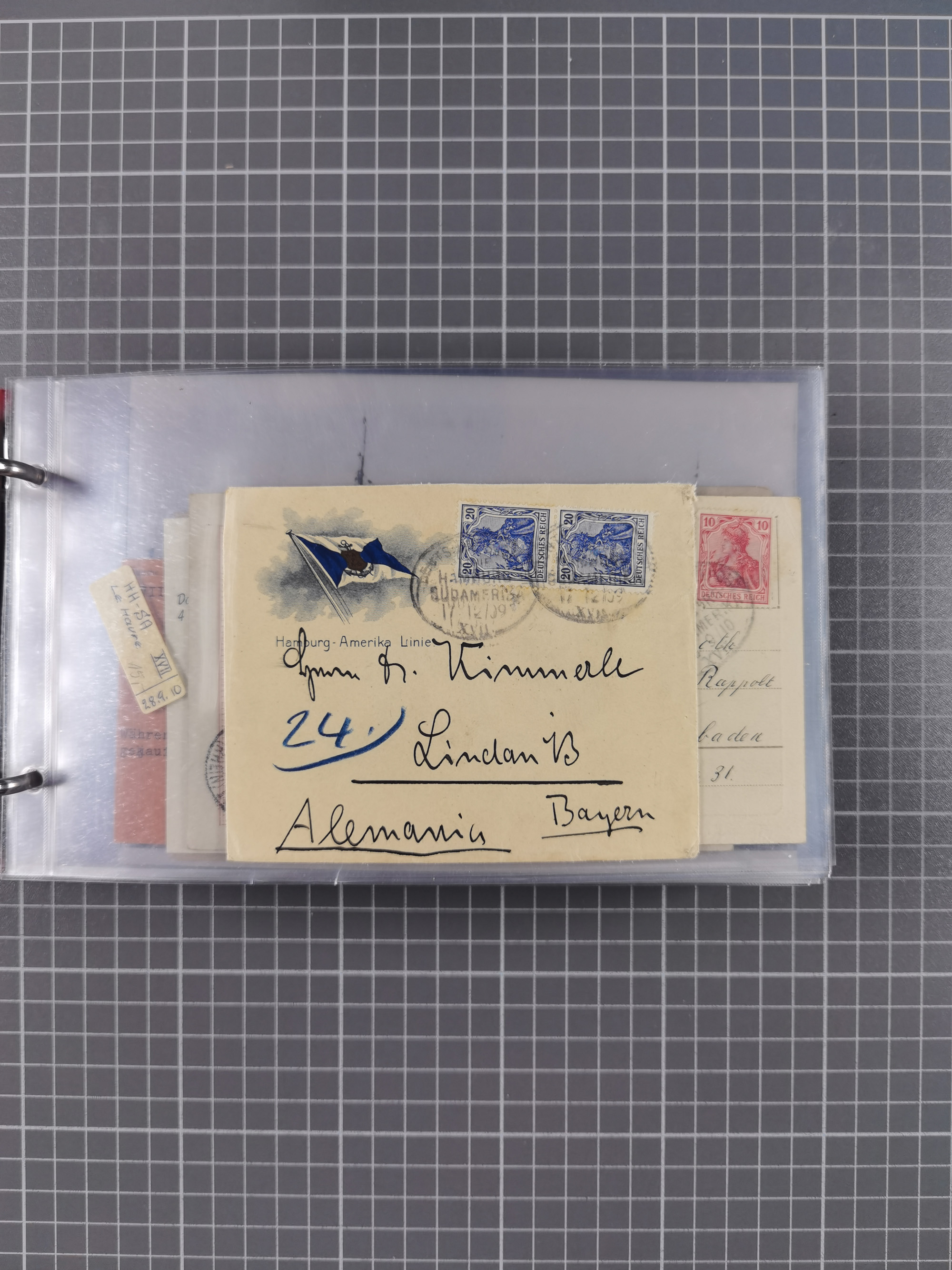 1826/1938, kleine Sammlung “Schiffspost aus Hamburg” mit ca. 35 Briefen, Karten und GSK, dabei u.a. Stempel “HAMBURG SCHIFFS BRIEF-POST” auf Faltbriefhülle 1826, Belege der Monte Oliva mit u.a. 40 Speisekarten und Belege D. Columbus. Dazu weitere Belege diverser Reisen mit u.a. London-Reise, Hamburg-Südamerika und Post der Monte Sarmiento mit über 40 Speisekarten sowie fünf Belege Gauturnfahrt 1935. Meist auf Albenblättern mit Beschriftung, ex Steinmeyer