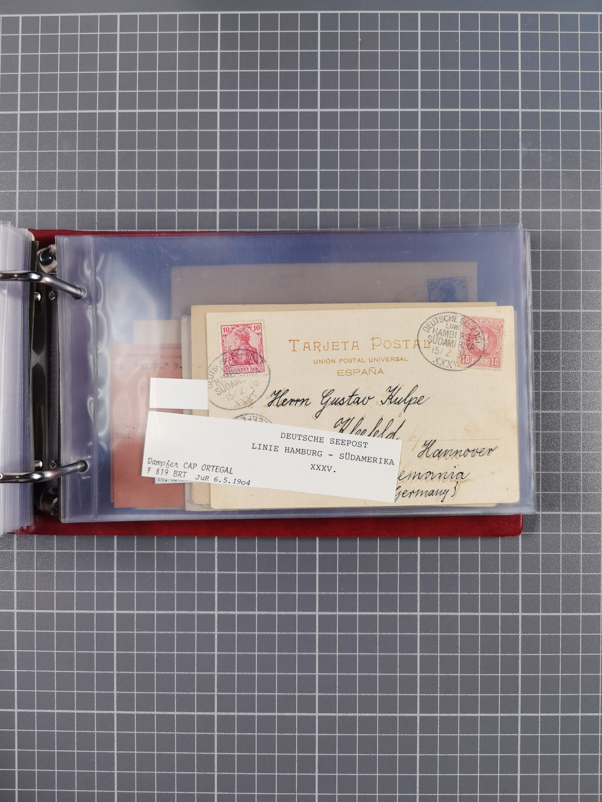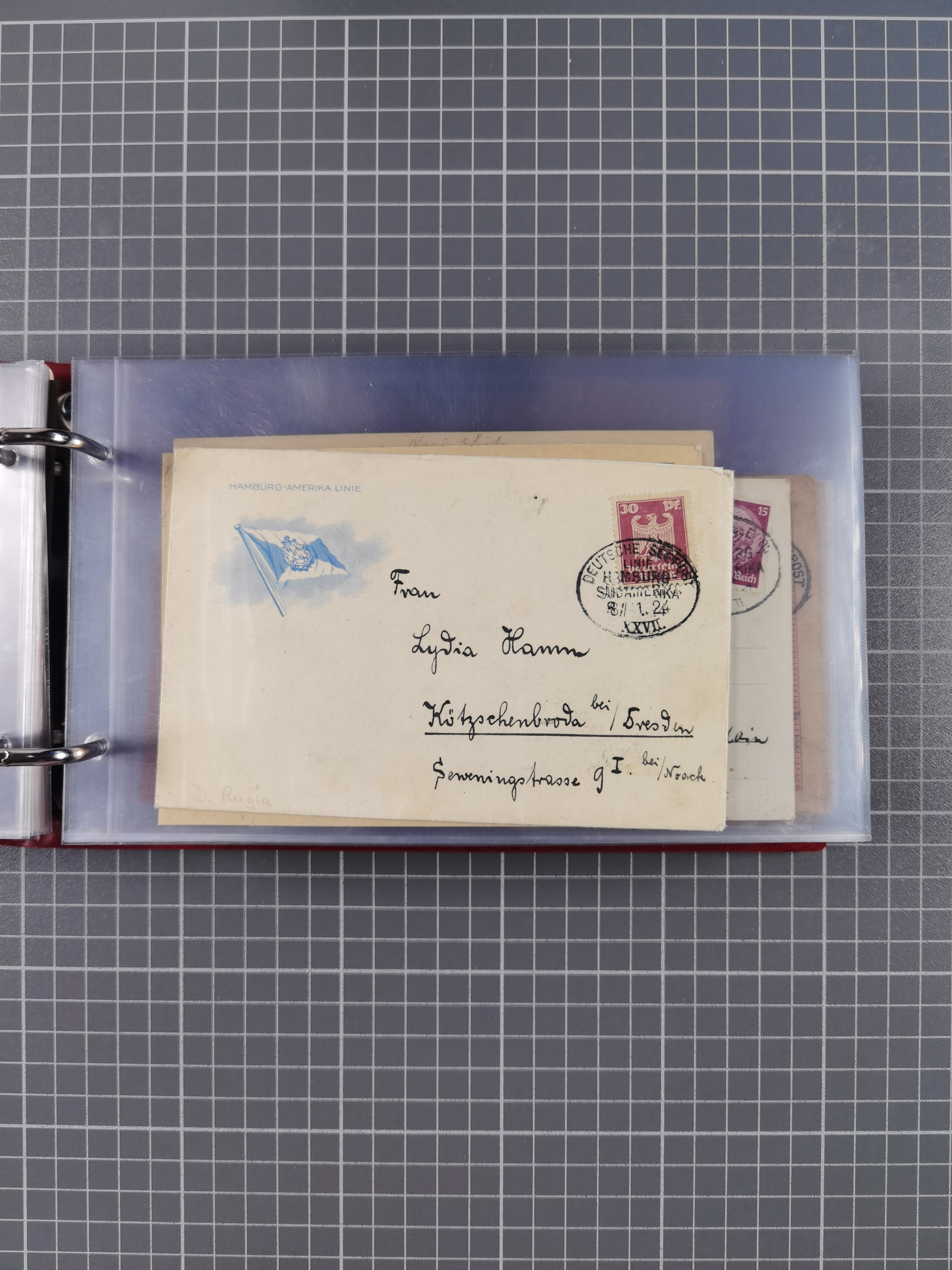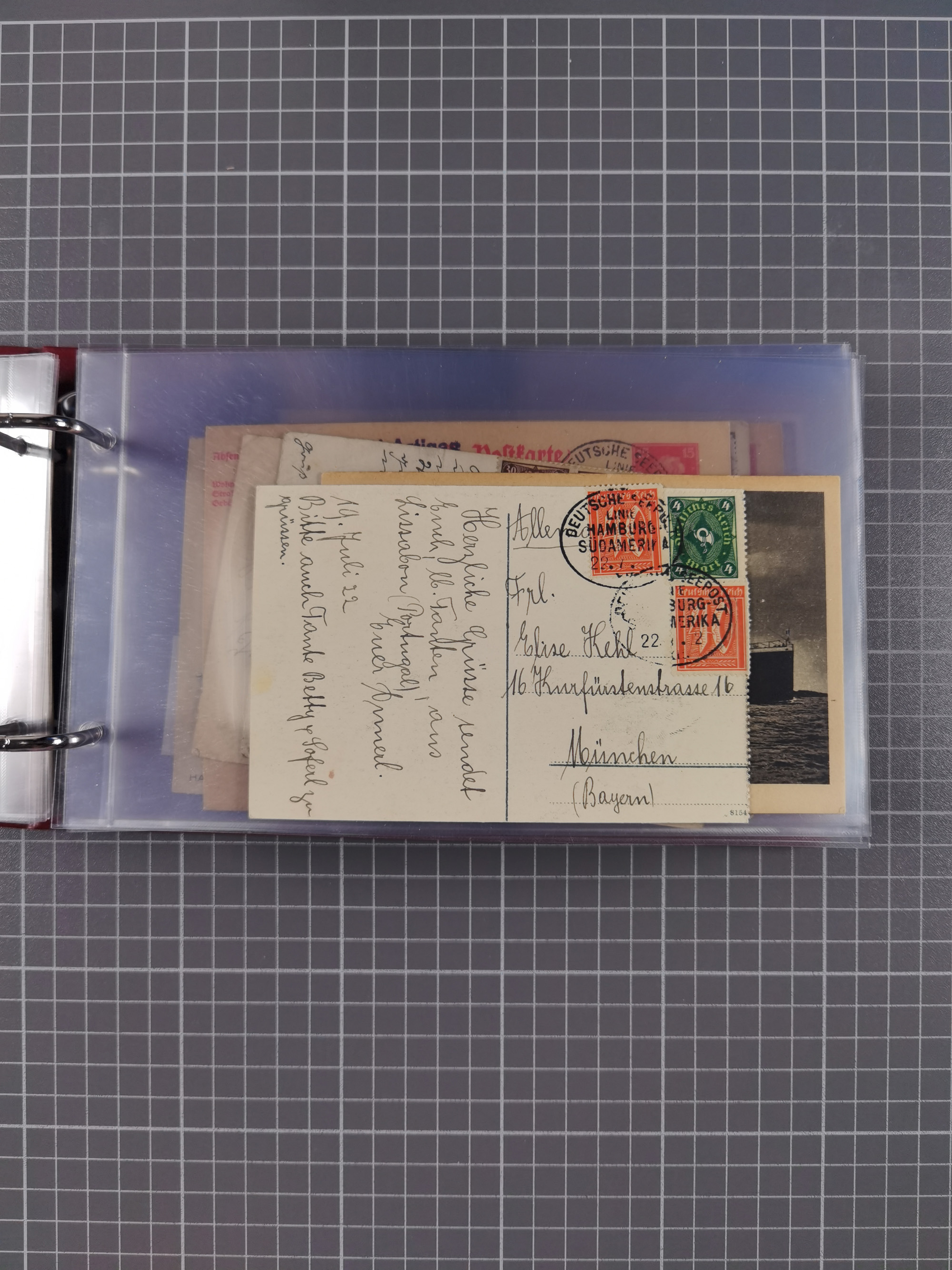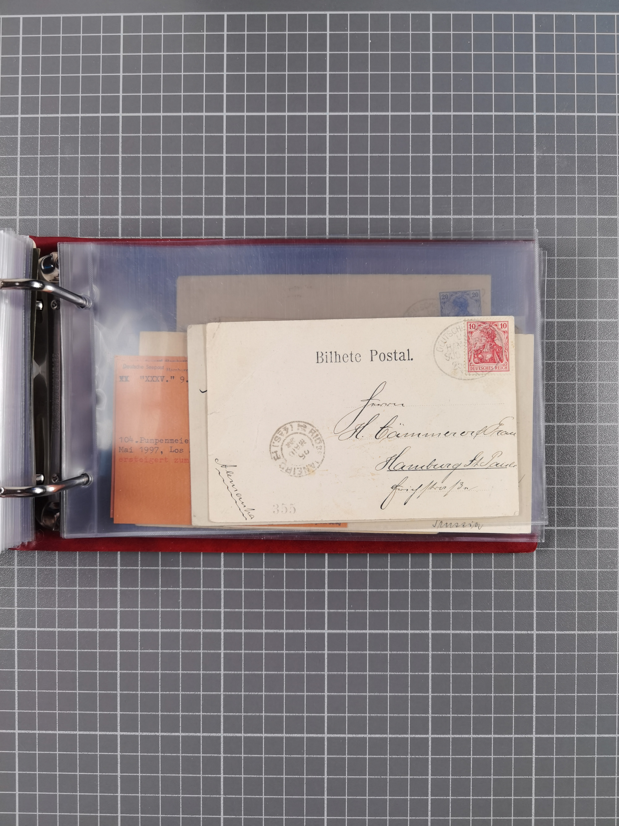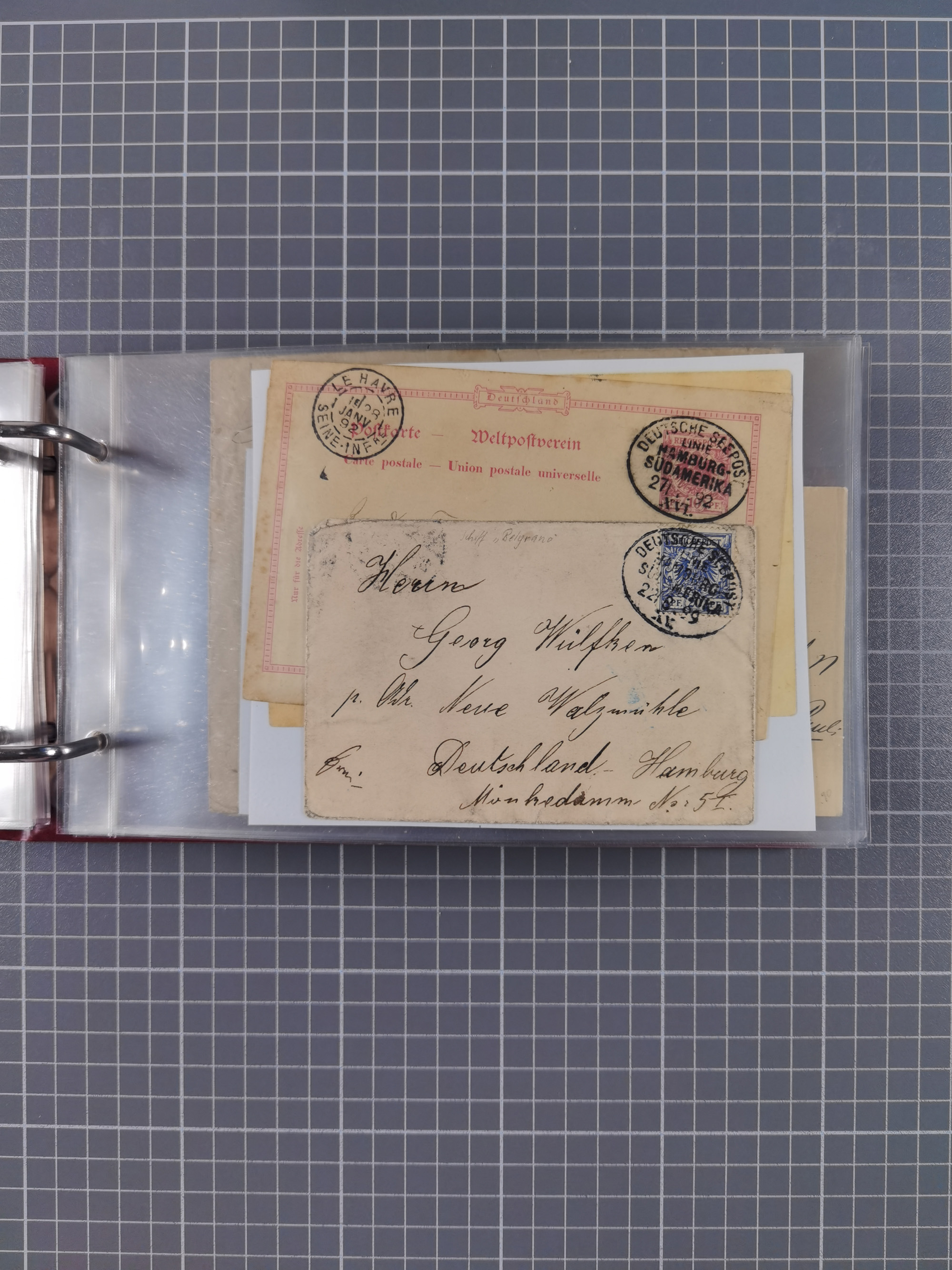 1826/1938, kleine Sammlung “Schiffspost aus Hamburg” mit ca. 35 Briefen, Karten und GSK, dabei u.a. Stempel “HAMBURG SCHIFFS BRIEF-POST” auf Faltbriefhülle 1826, Belege der Monte Oliva mit u.a. 40 Speisekarten und Belege D. Columbus. Dazu weitere Belege diverser Reisen mit u.a. London-Reise, Hamburg-Südamerika und Post der Monte Sarmiento mit über 40 Speisekarten sowie fünf Belege Gauturnfahrt 1935. Meist auf Albenblättern mit Beschriftung, ex Steinmeyer