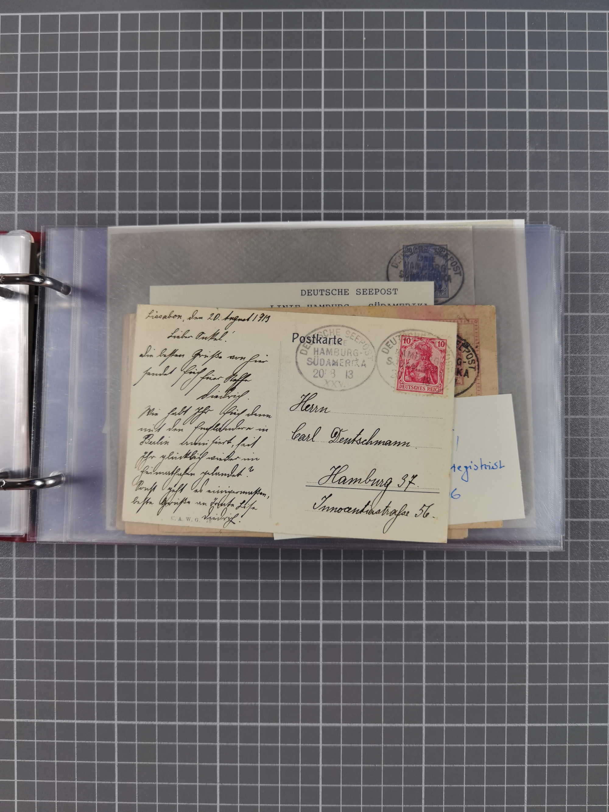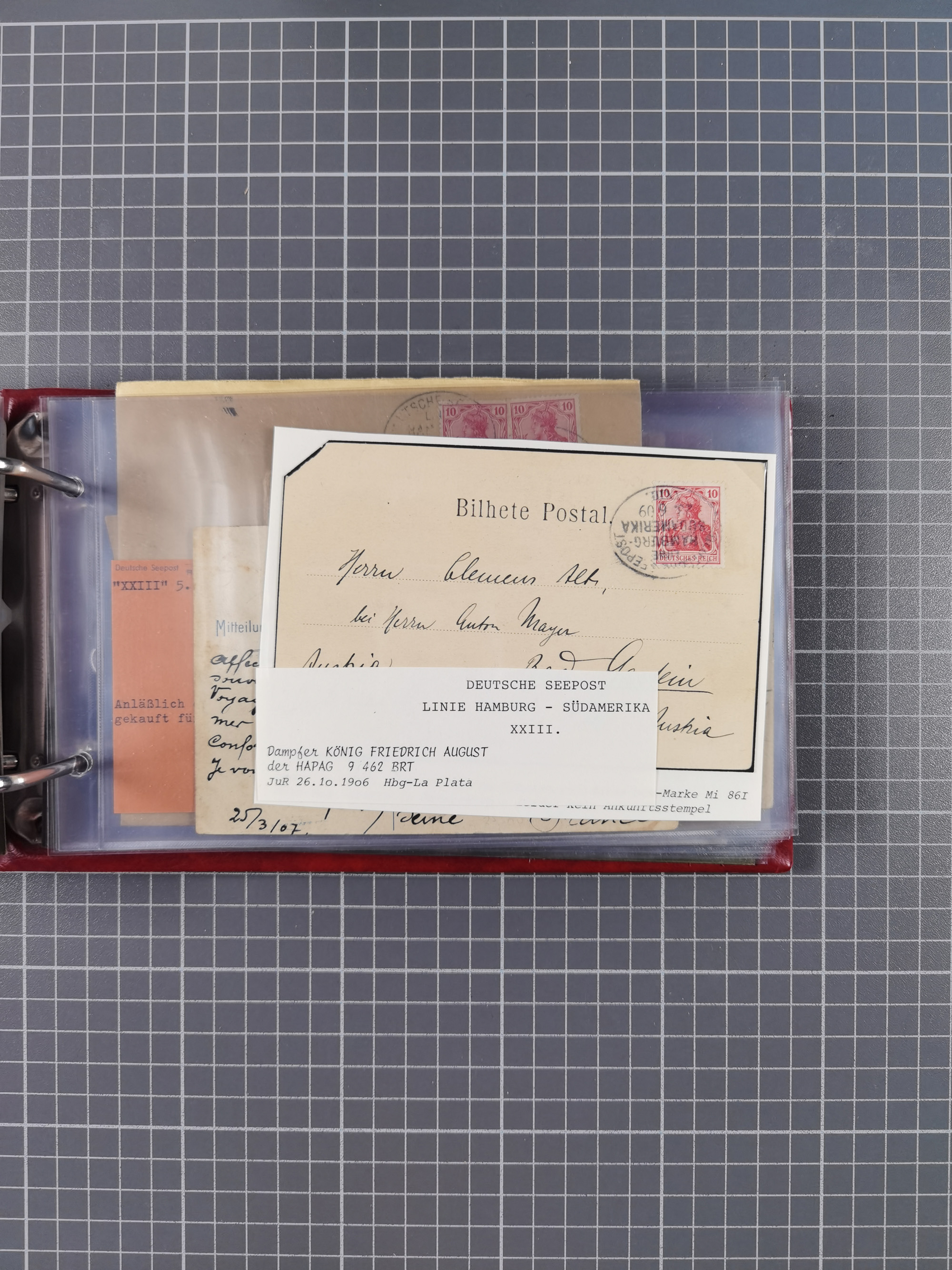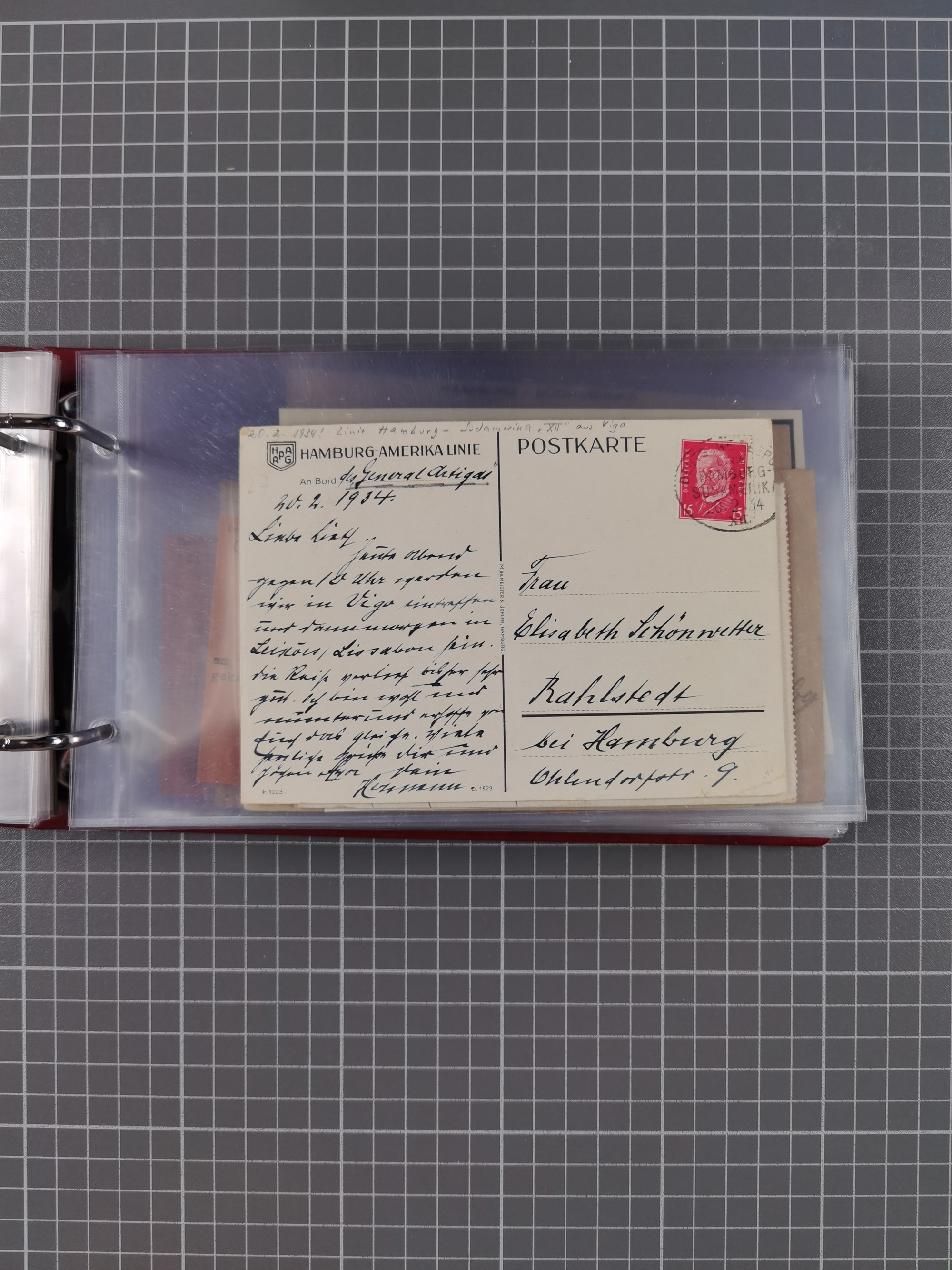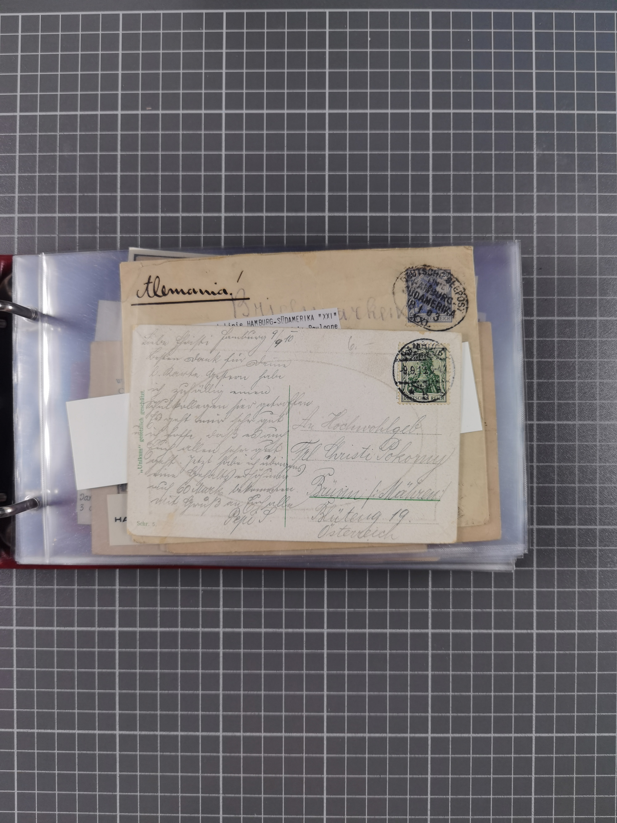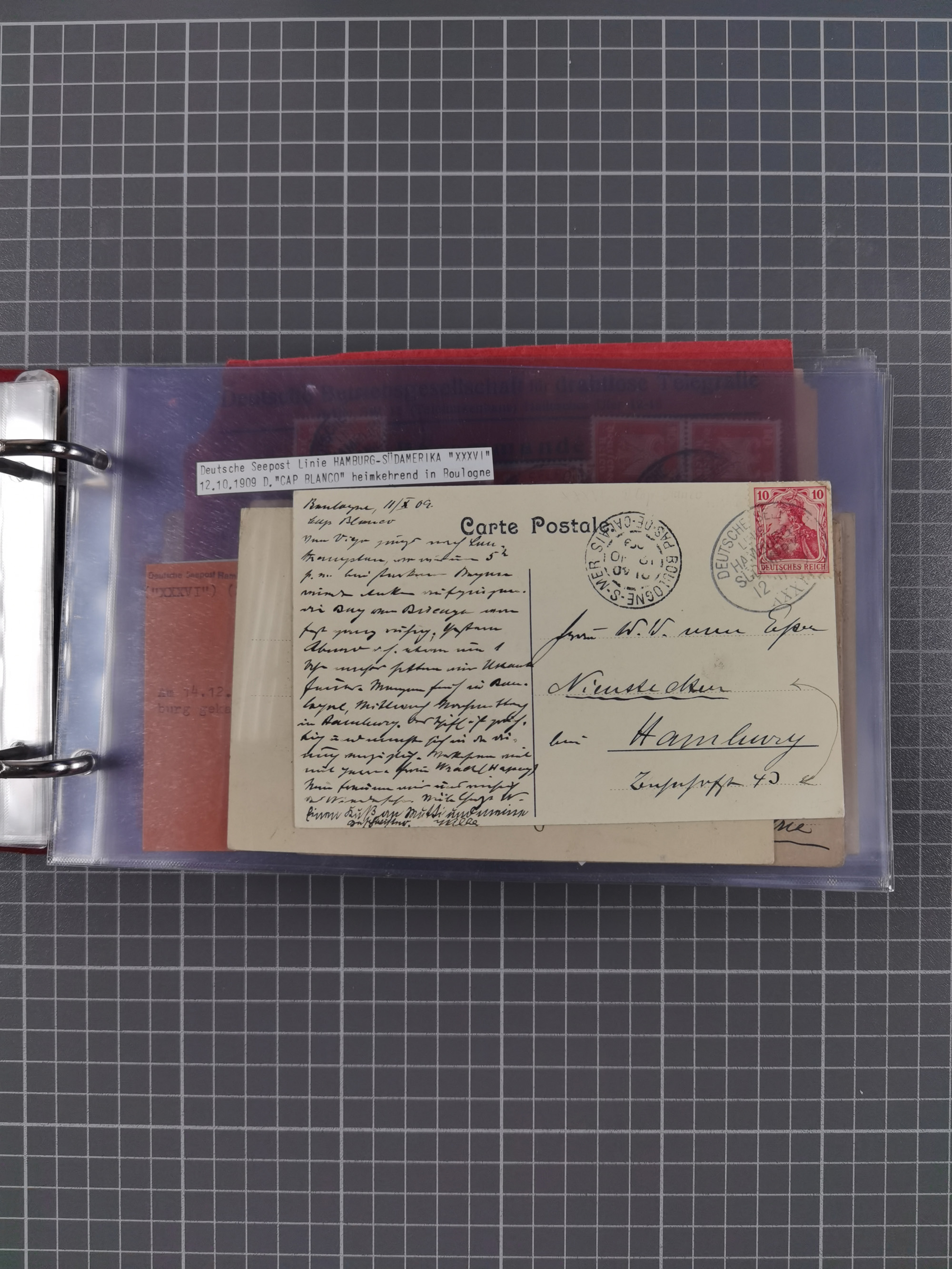 1826/1938, kleine Sammlung “Schiffspost aus Hamburg” mit ca. 35 Briefen, Karten und GSK, dabei u.a. Stempel “HAMBURG SCHIFFS BRIEF-POST” auf Faltbriefhülle 1826, Belege der Monte Oliva mit u.a. 40 Speisekarten und Belege D. Columbus. Dazu weitere Belege diverser Reisen mit u.a. London-Reise, Hamburg-Südamerika und Post der Monte Sarmiento mit über 40 Speisekarten sowie fünf Belege Gauturnfahrt 1935. Meist auf Albenblättern mit Beschriftung, ex Steinmeyer