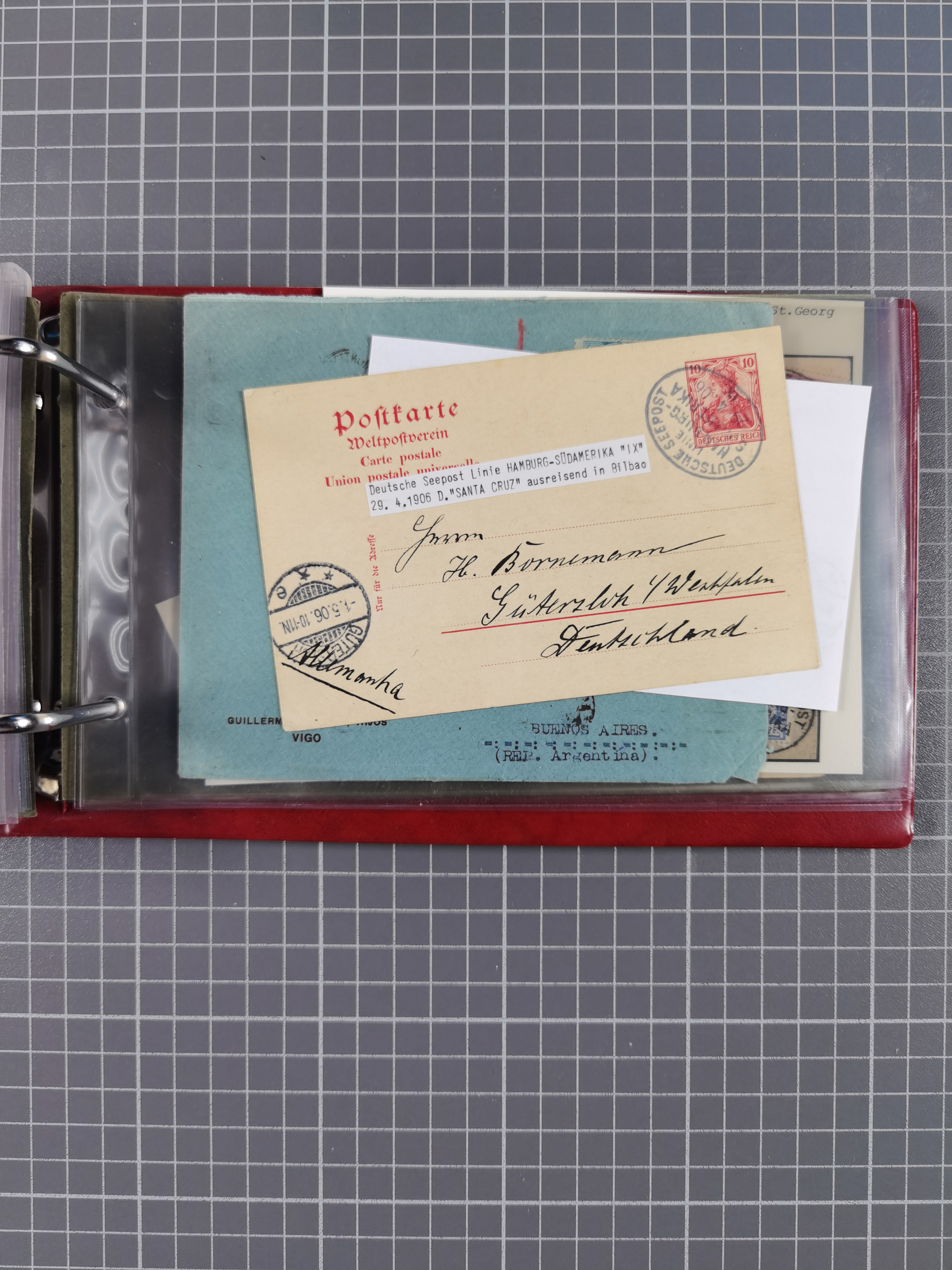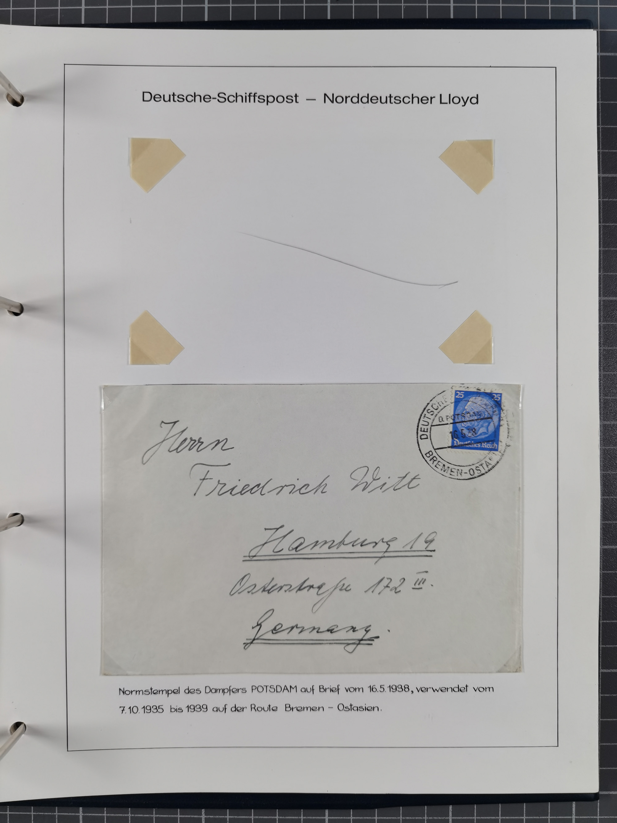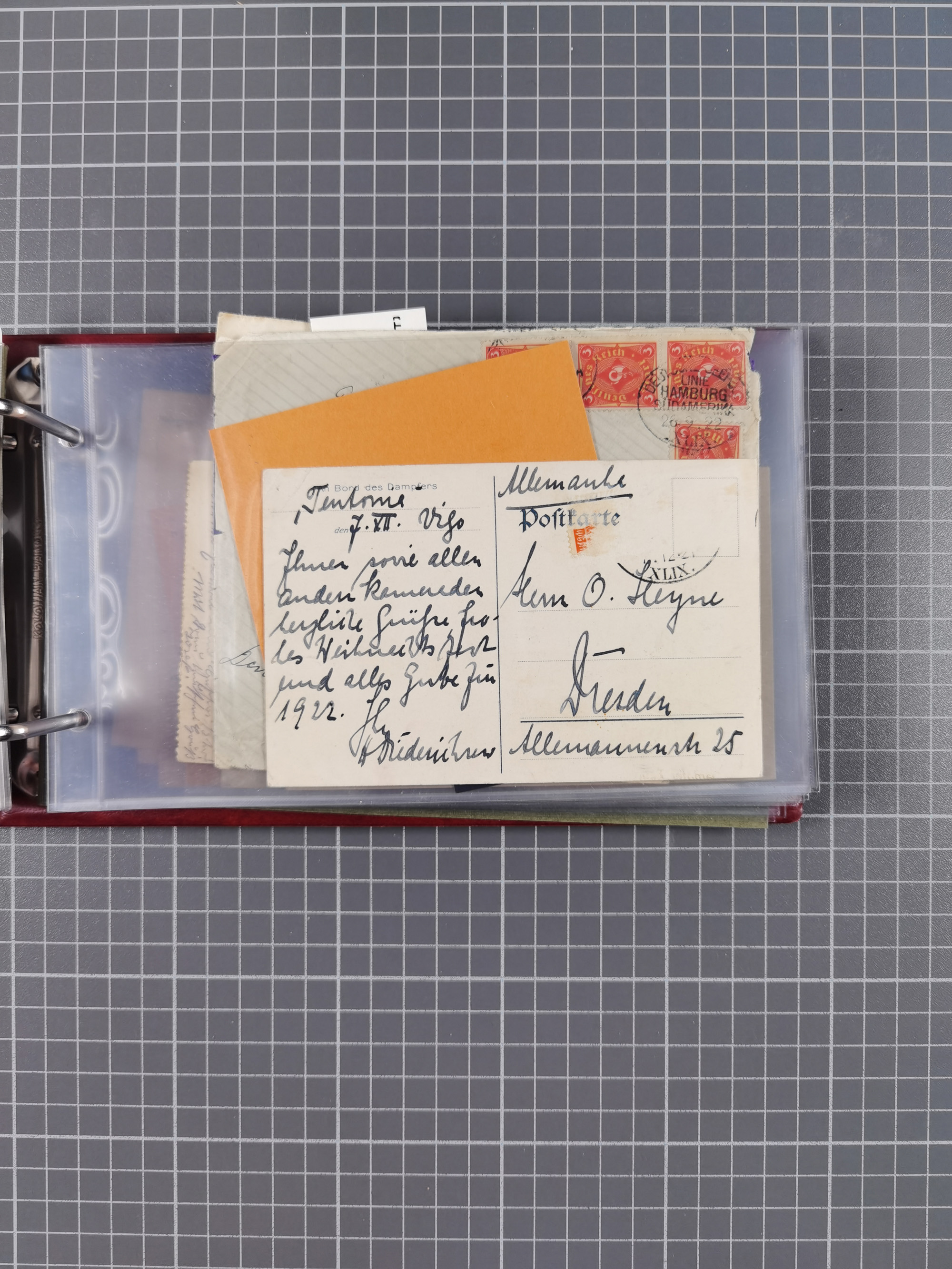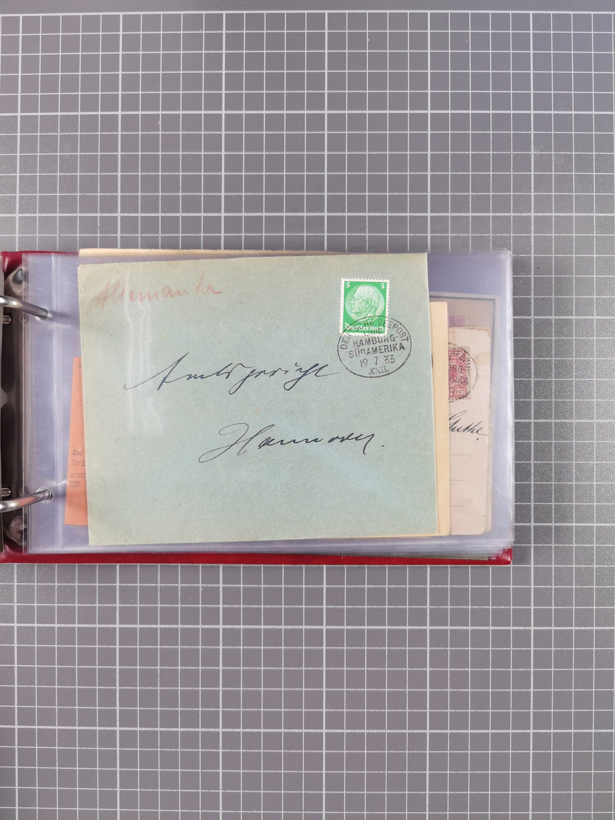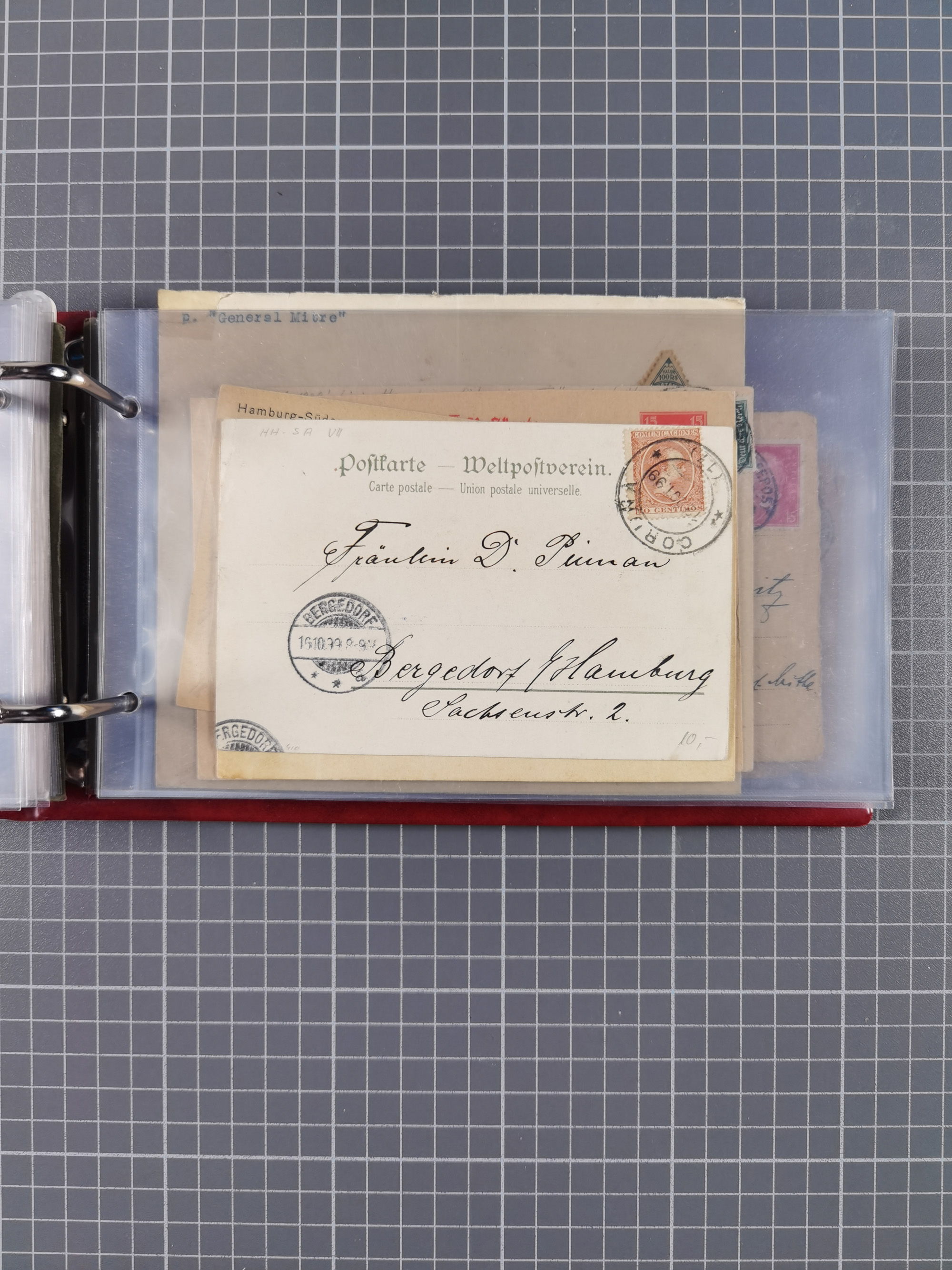 1826/1938, kleine Sammlung “Schiffspost aus Hamburg” mit ca. 35 Briefen, Karten und GSK, dabei u.a. Stempel “HAMBURG SCHIFFS BRIEF-POST” auf Faltbriefhülle 1826, Belege der Monte Oliva mit u.a. 40 Speisekarten und Belege D. Columbus. Dazu weitere Belege diverser Reisen mit u.a. London-Reise, Hamburg-Südamerika und Post der Monte Sarmiento mit über 40 Speisekarten sowie fünf Belege Gauturnfahrt 1935. Meist auf Albenblättern mit Beschriftung, ex Steinmeyer