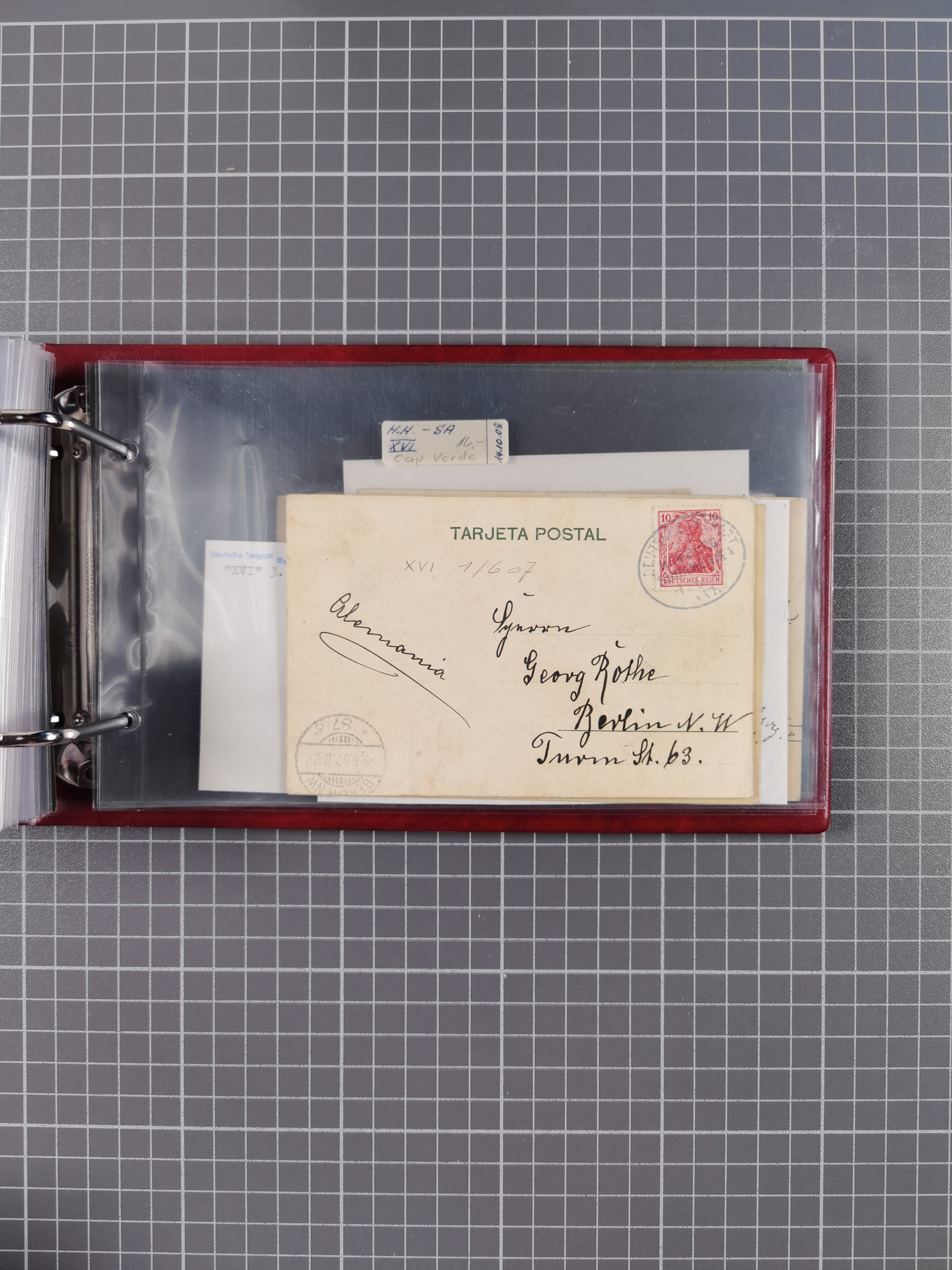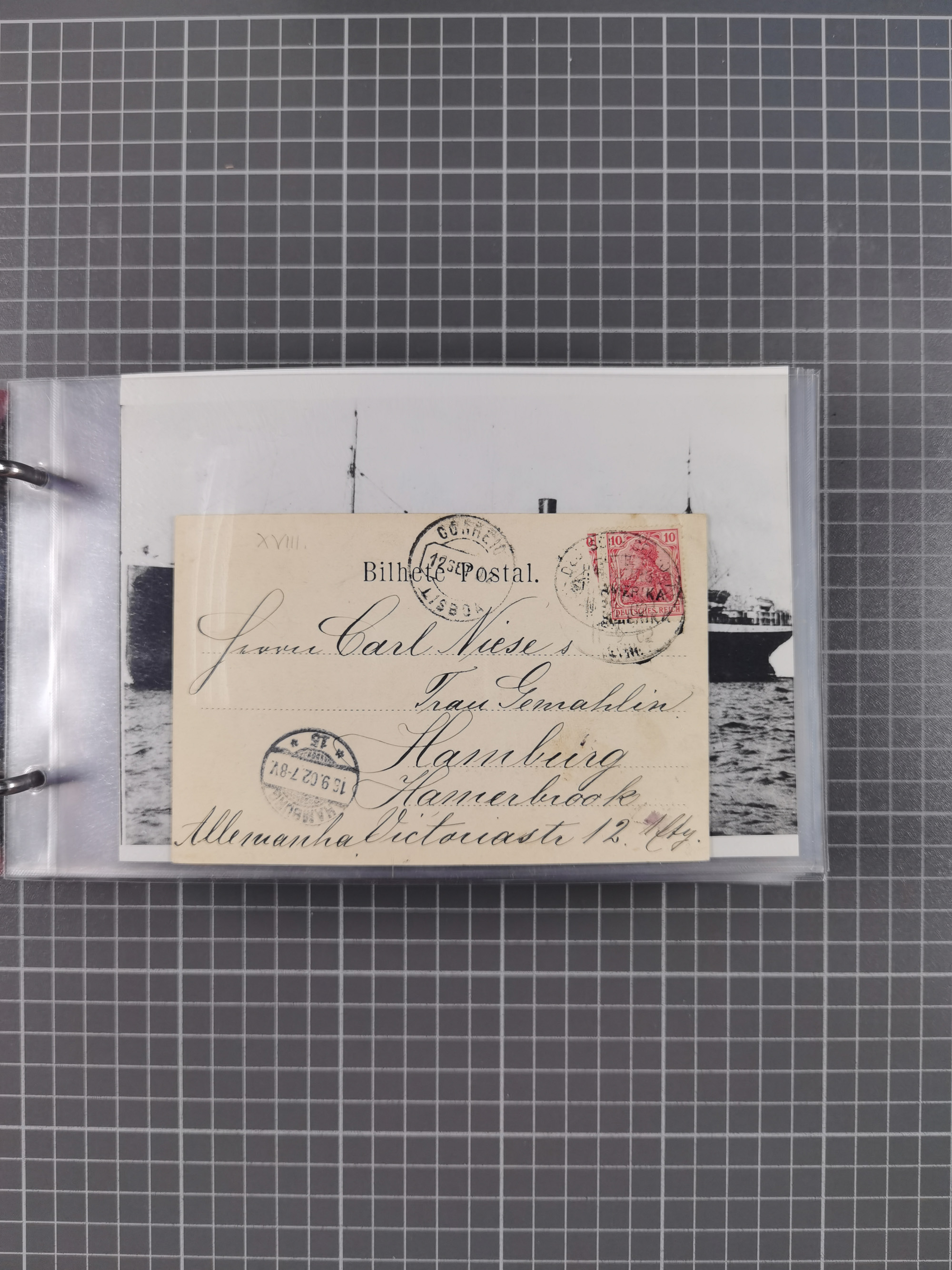 “DSP LINIE HAMBURG-WESTAFRIKA XLII ….10.12.” klar auf Frage-Ganzsachenkarte von “EISLEBEN 1.10.12” über Hamburg per Schiff nach Las Palmas expediert mit Ankunftsstempel vom 10.10.1912. Adressiert an den Schiffsarzt des R.P.D. Tabora, die schon am 9.10. Las Palmas verließ, daher entsprechender Nachsendevermerk “Hamburg”, in guter Erhaltung